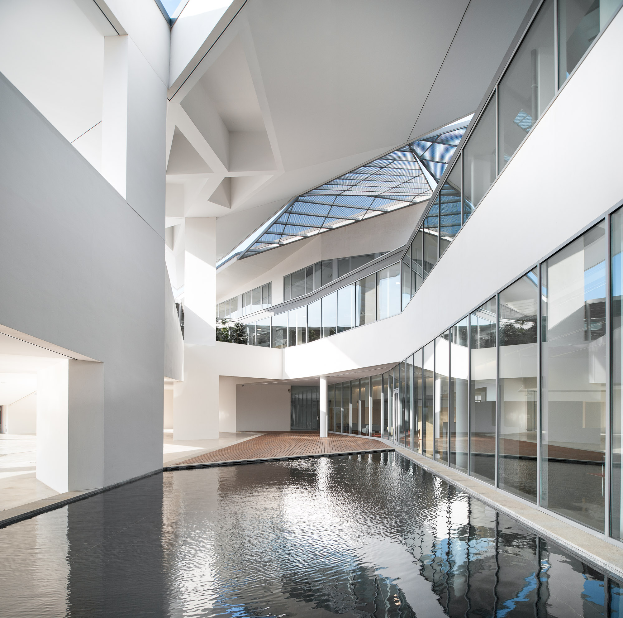 The IMP brief, essentially articulated (as in similar cases) on floors for operating theatres, surgeries and administration or study areas and car parks, was significant in that most of the activities are done without natural light (surgeries and operations), although natural light is very necessary as a counterpoint in the waiting, rest and private work areas.