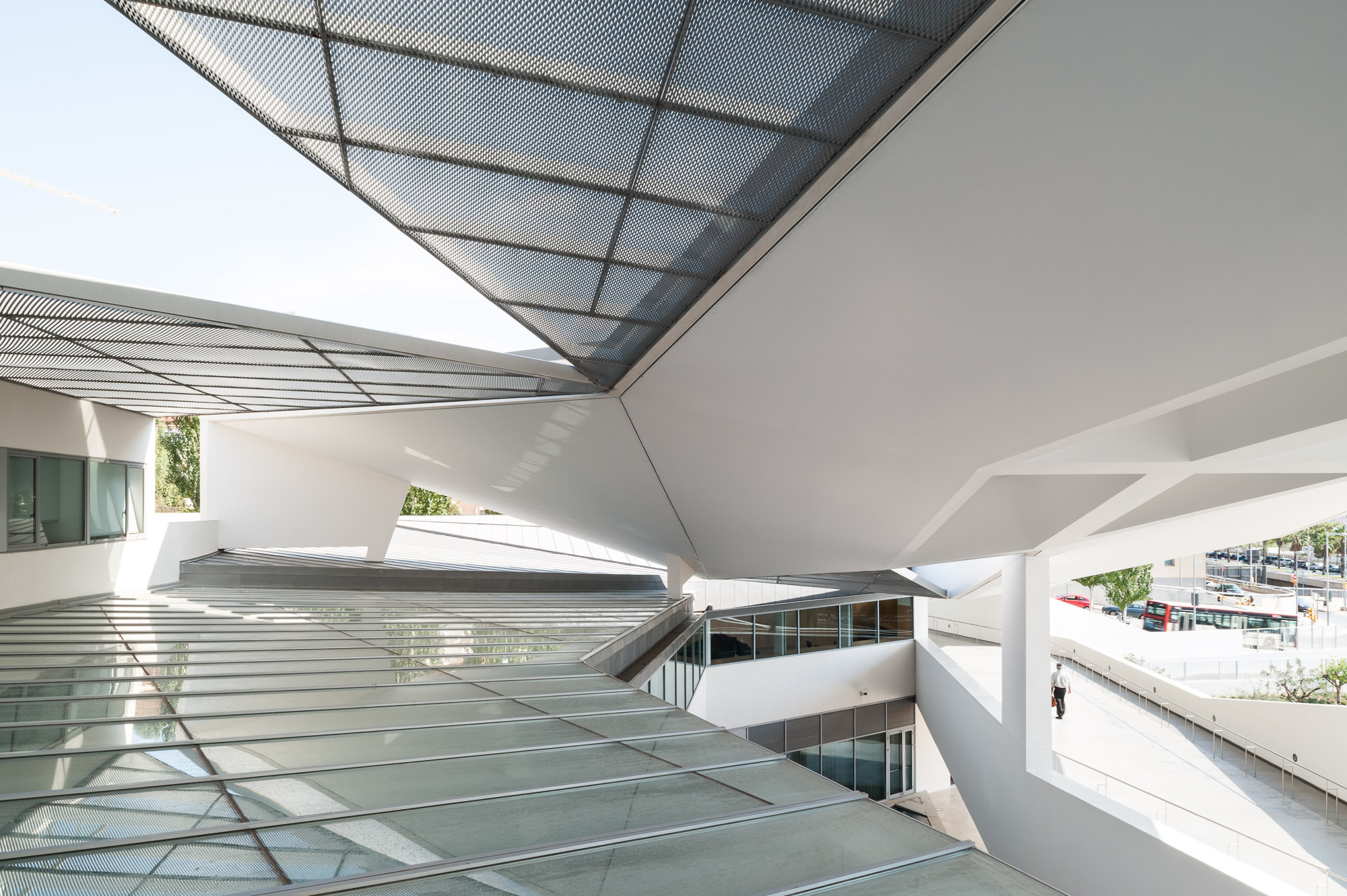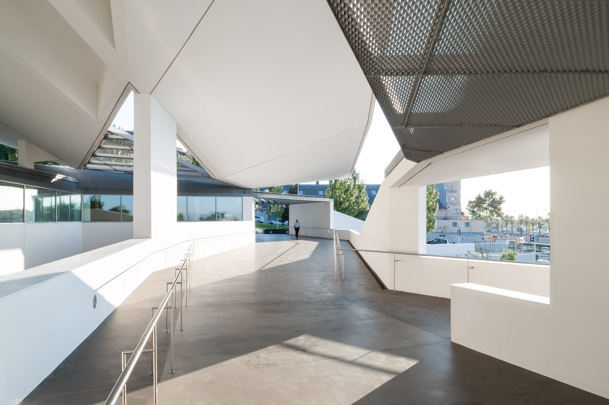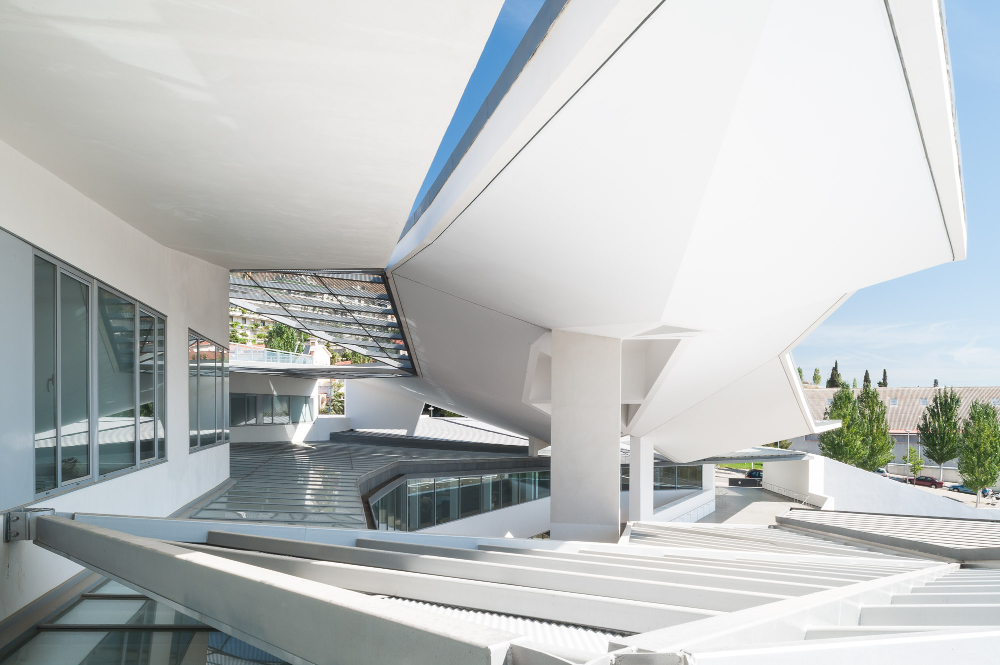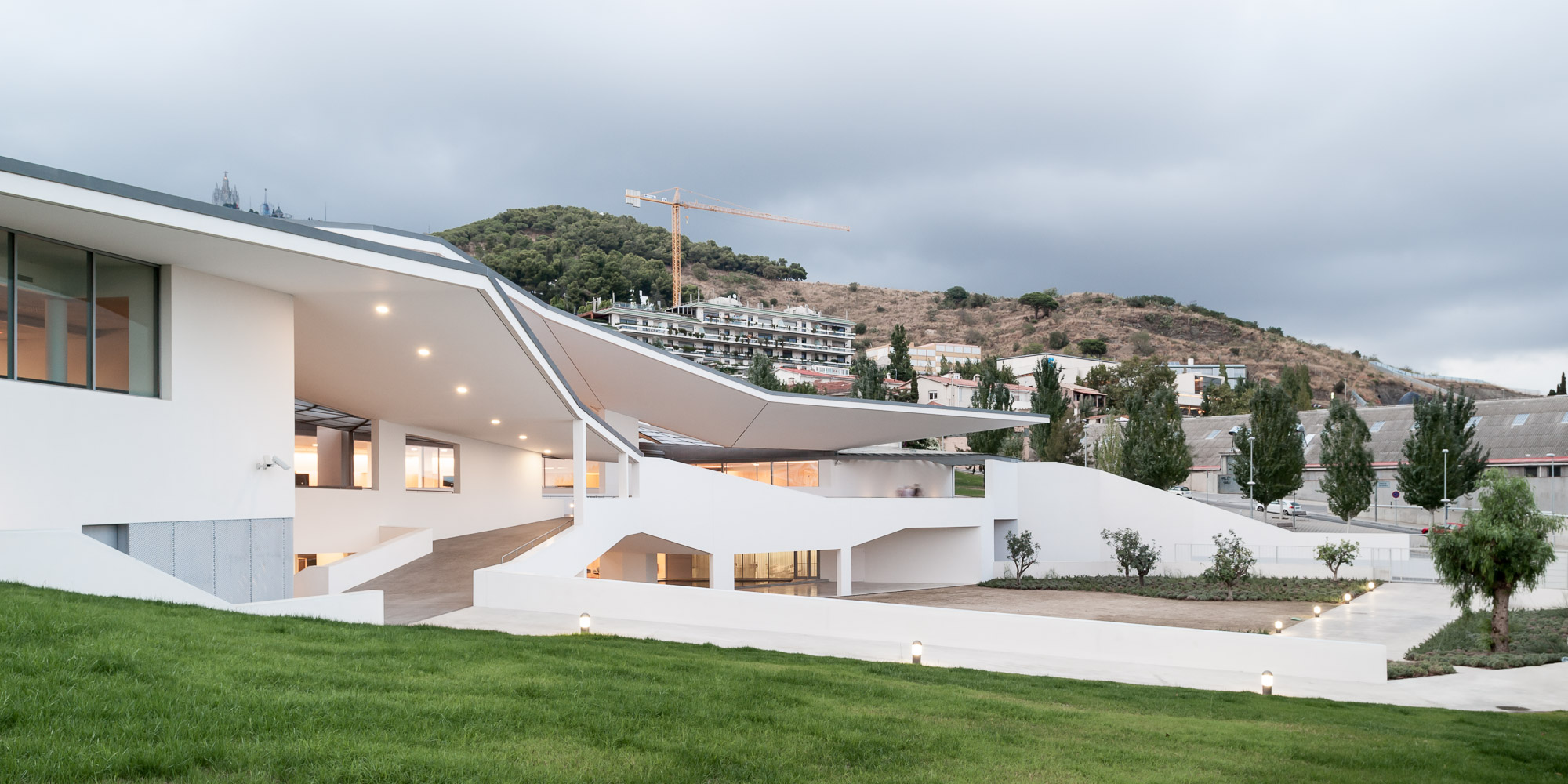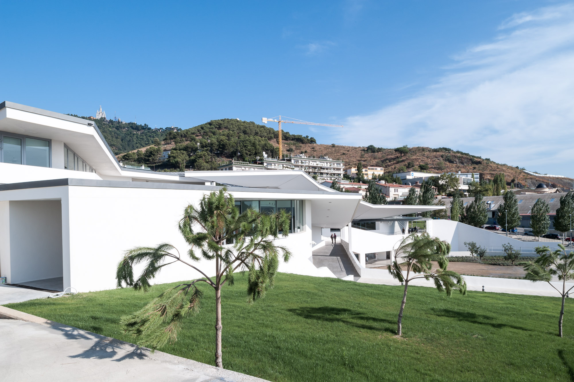 The building looks away from Ronda de Dalt and penetrates a small forest linked to the Collserola vegetation that distances the building from the city and submerges it in the surrounding natural environment. Particular care is taken with the street access to the hall to ensure that it manifests the Institute’s aims; attention, care and comfort for vision and the tool that makes this possible, the eye. Hence the addition of a semi-open/semi-closed space to the entrance, waiting rooms etc., in some way an umbraculum that feeds shade and darkness into the outward facing spaces, like dark glasses, visors or even our own hands, reducing the frequently annoying (in climates like ours) and glaring light and sunshine.