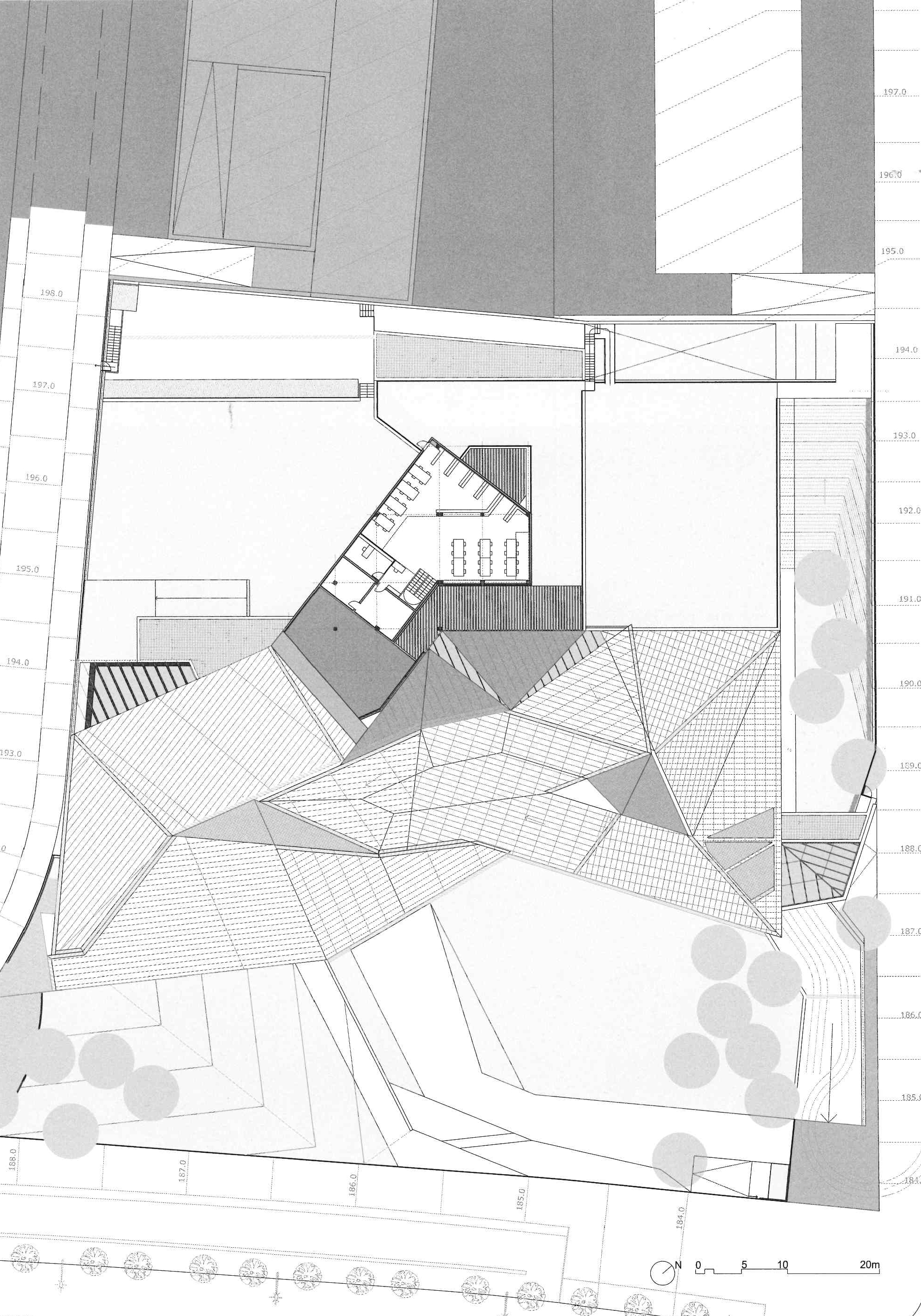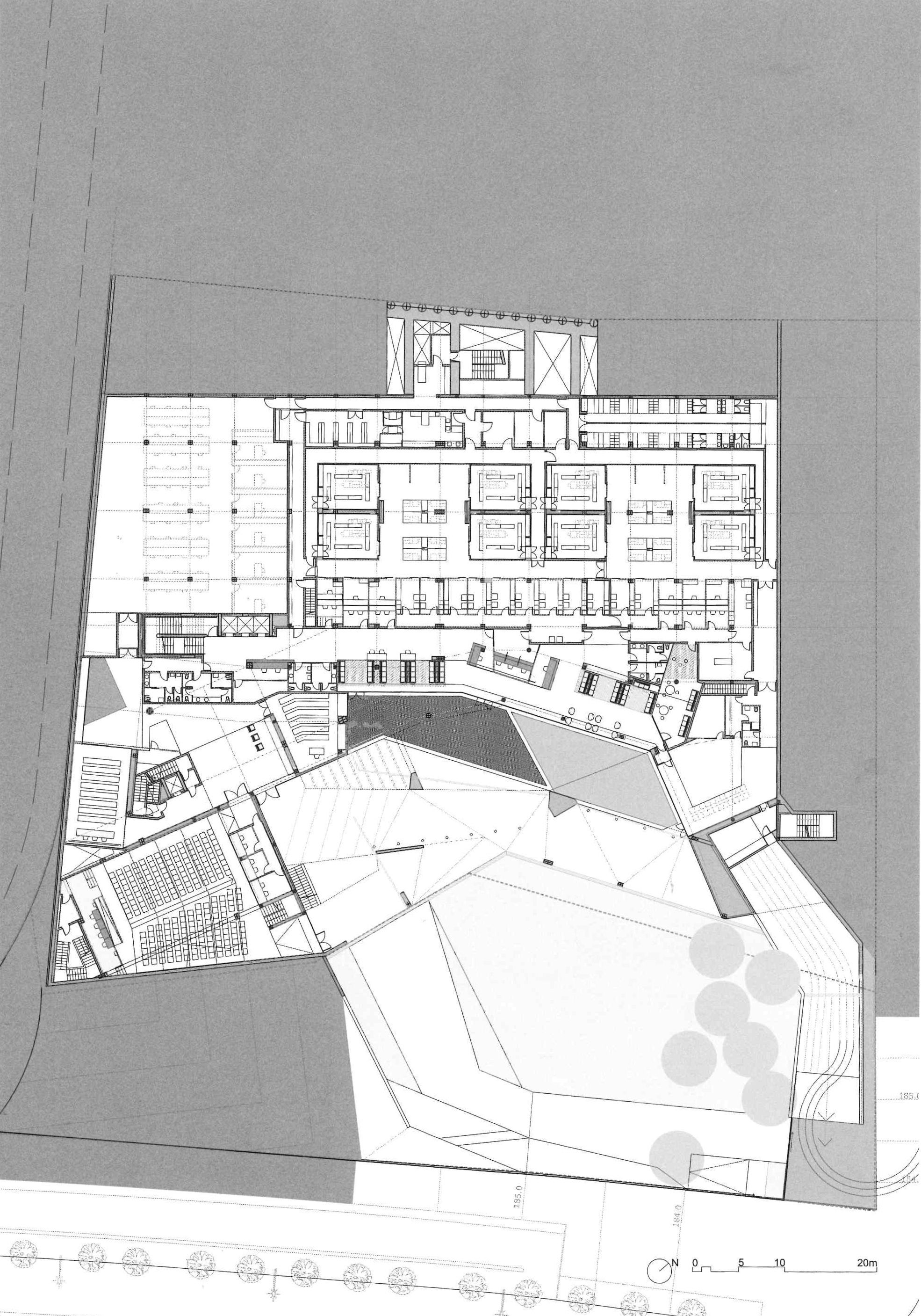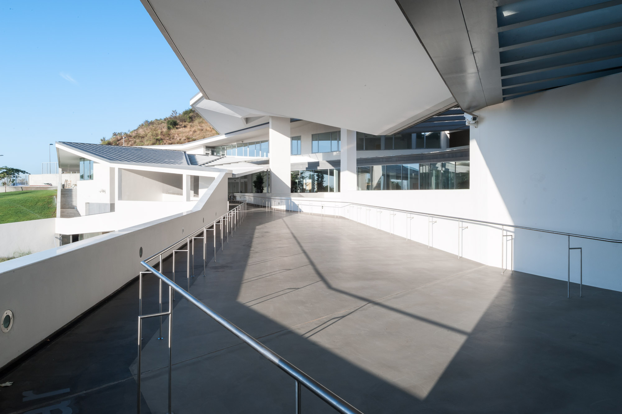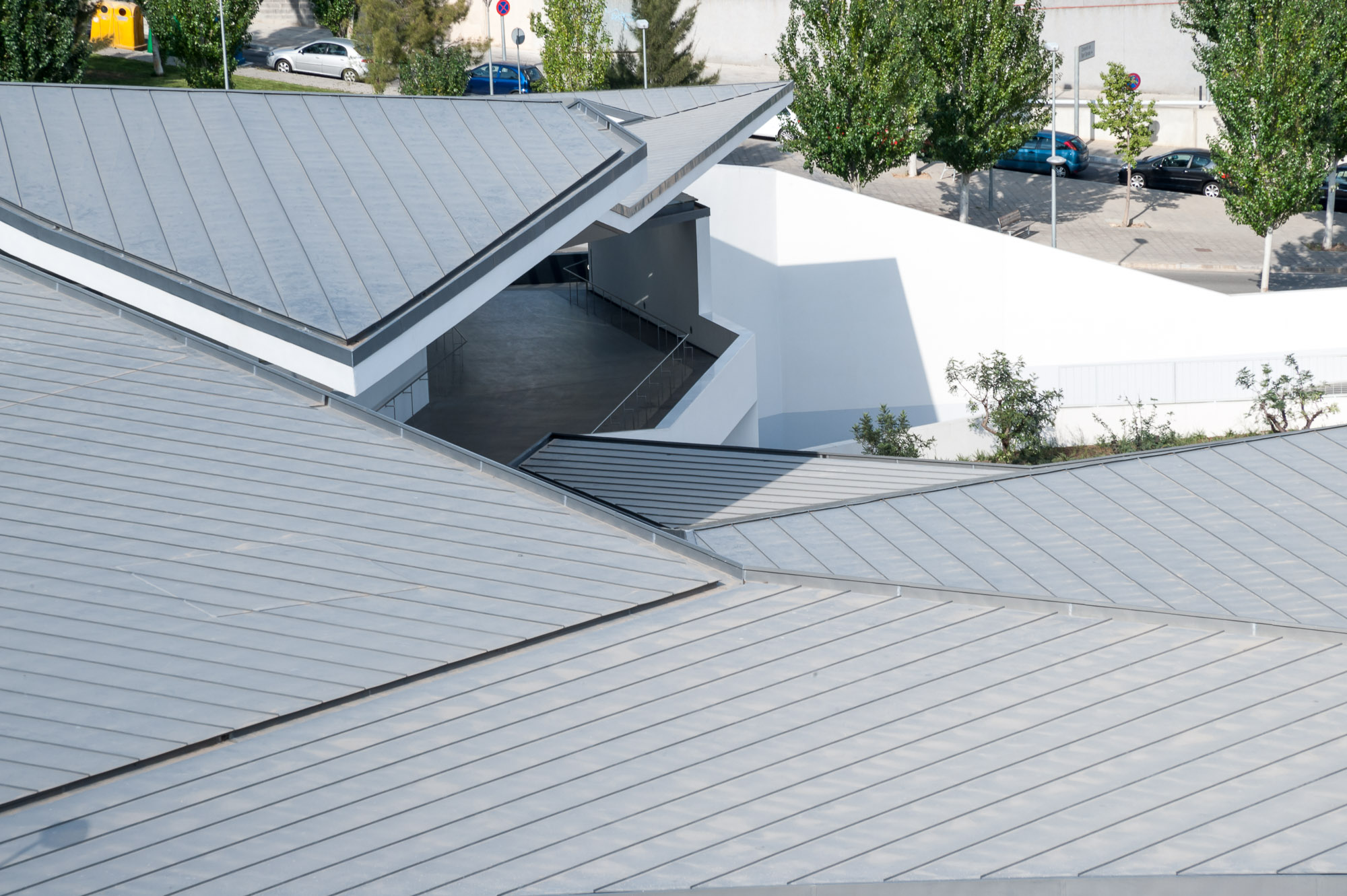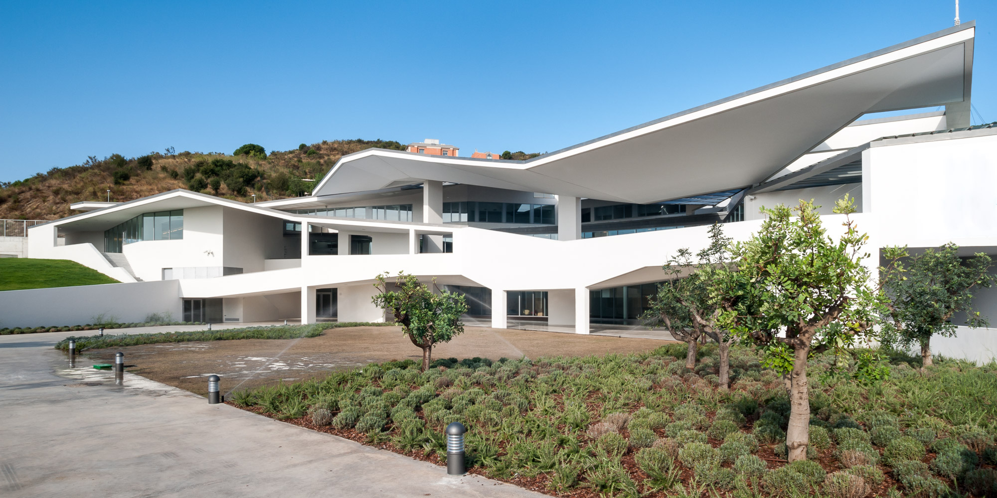 The building looks away from Ronda de Dalt and penetrates a small forest linked to the Collserola vegetation that distances the building from the city and submerges it in the surrounding natural environment. Particular care is taken with the street access to the hall to ensure that it manifests the Institute’s aims; attention, care and comfort for vision and the tool that makes this possible, the eye. Hence the addition of a semi-open/semi-closed space to the entrance, waiting rooms etc., in some way an umbraculum that feeds shade and darkness into the outward facing spaces, like dark glasses, visors or even our own hands, reducing the frequently annoying (in climates like ours) and glaring light and sunshine.