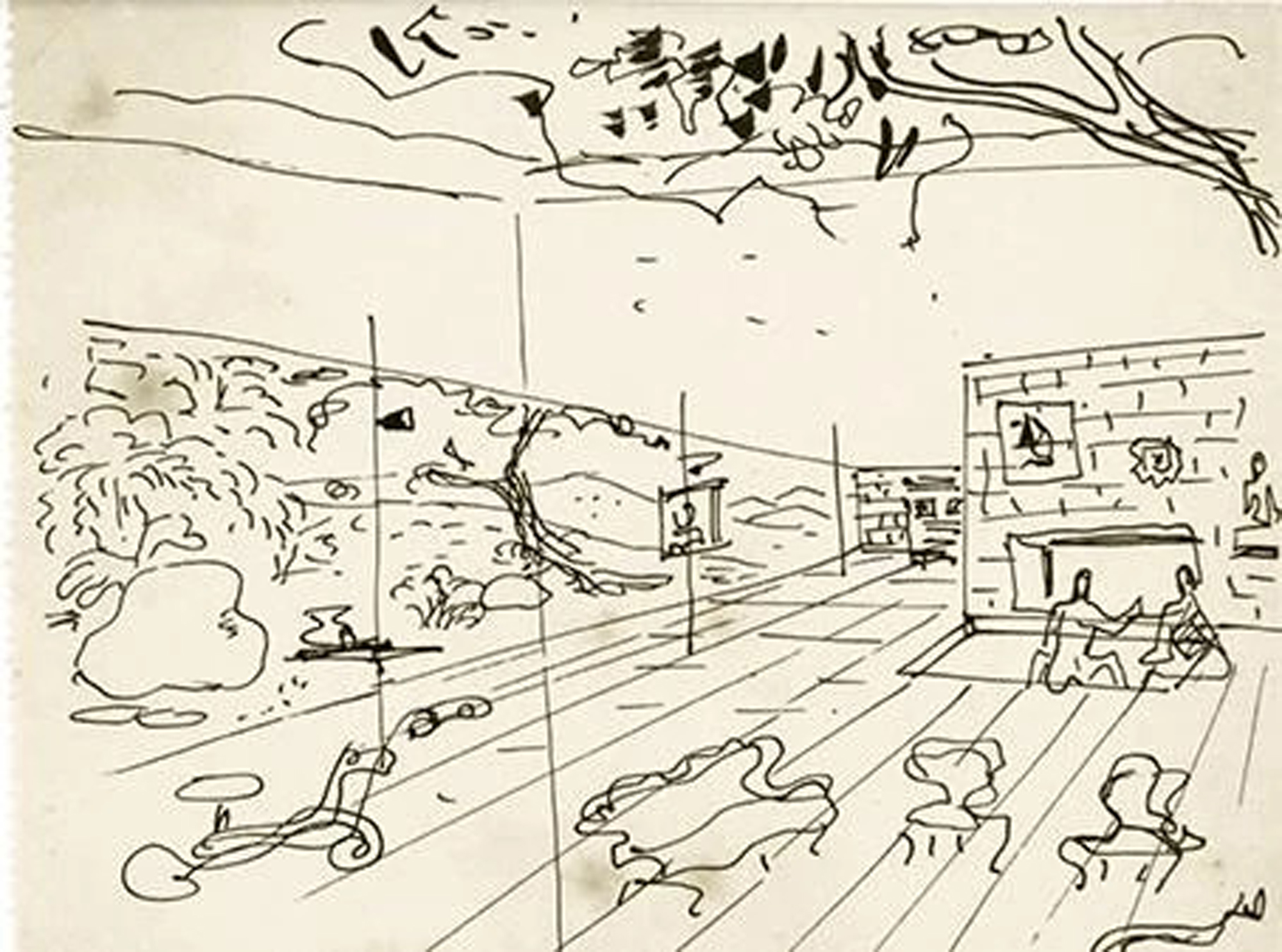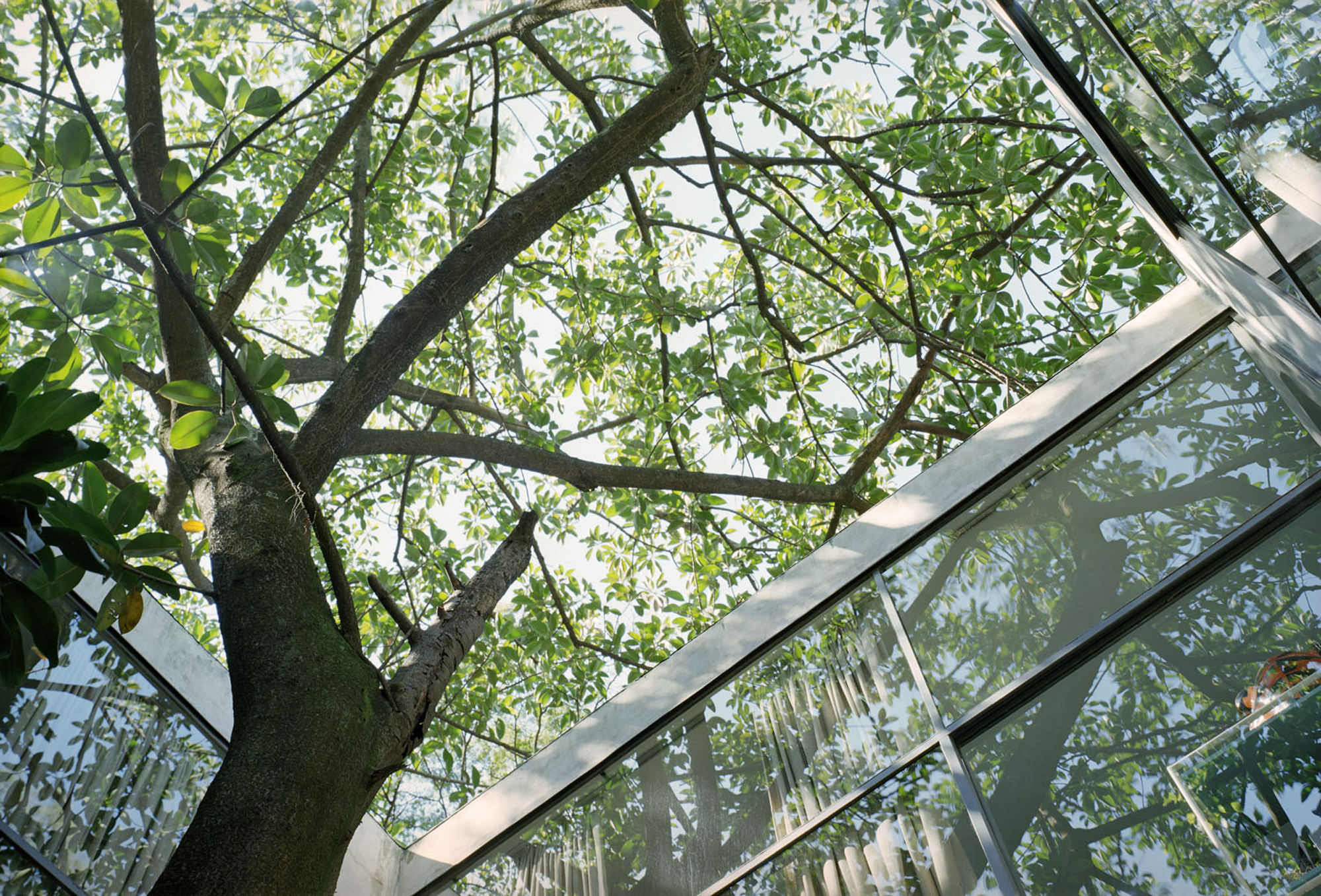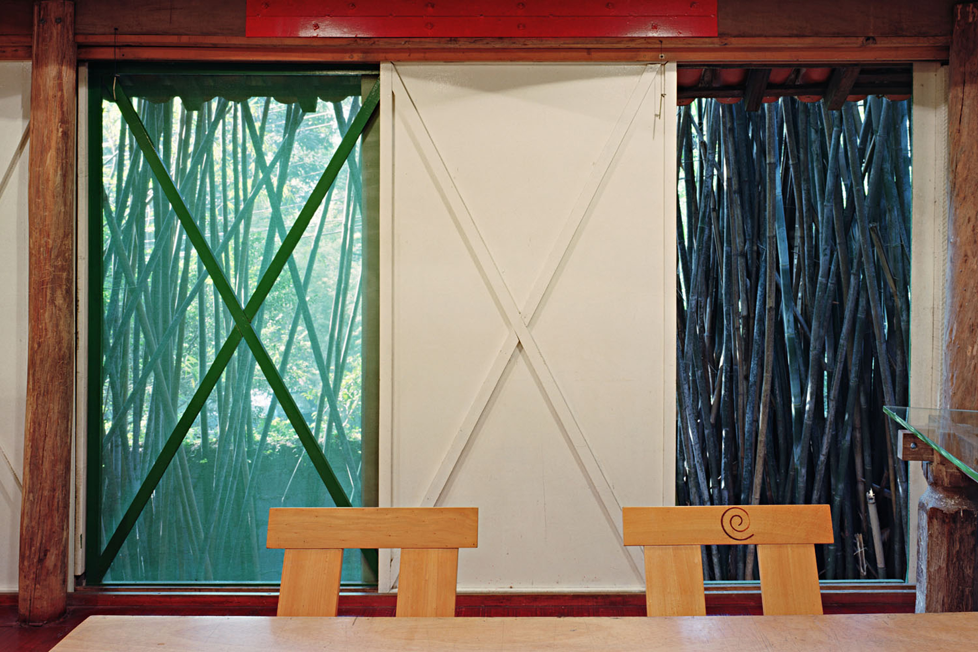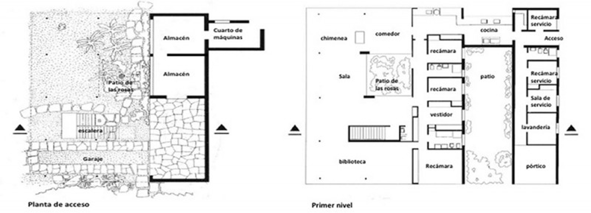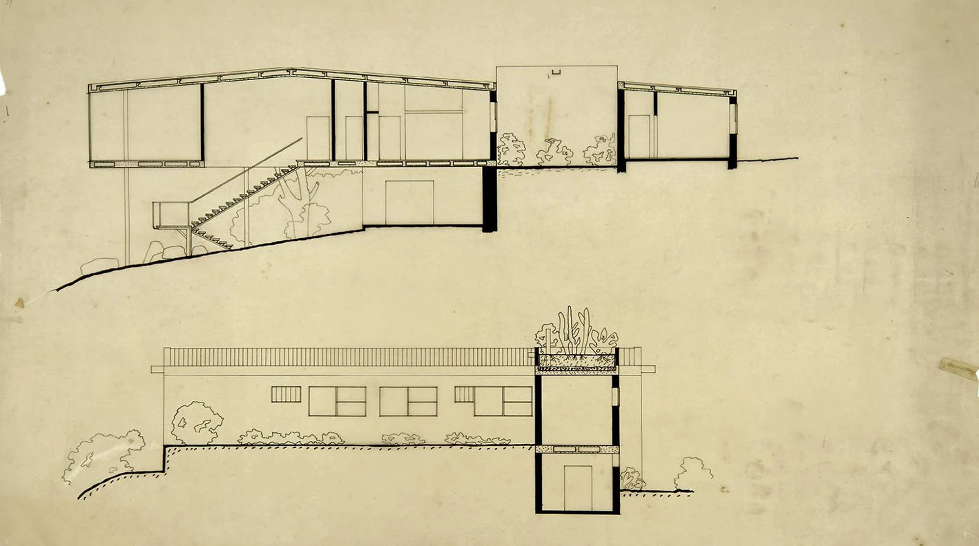 Se respetó un árbol existente mediante la construcción de un patio interior en medio de la gran sala de estar, permitiendo a su vez una ventilación cruzada en los días más calurosos. Interiormente la vivienda se distribuye en dos zonas, la parte pública de la casa es esta enorme sala, completamente diáfana y rodeada por ventanales en contacto con el paisaje; y la parte más íntima de la vivienda que eran como los espacios más resguardados y protegidos en la parte posterior de la casa.