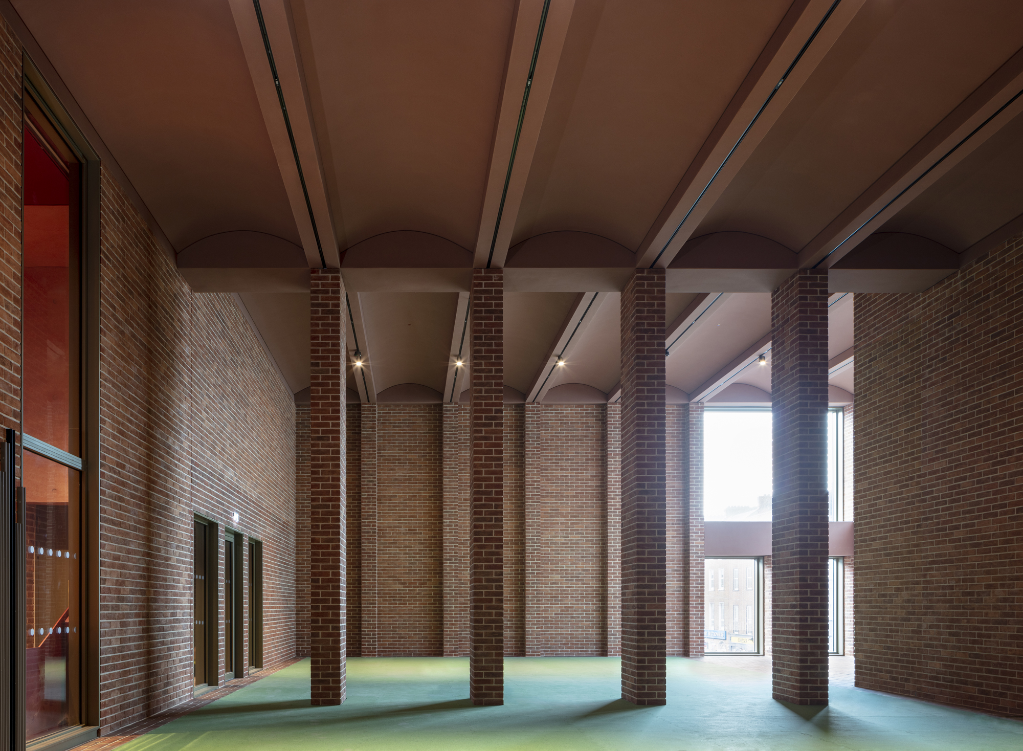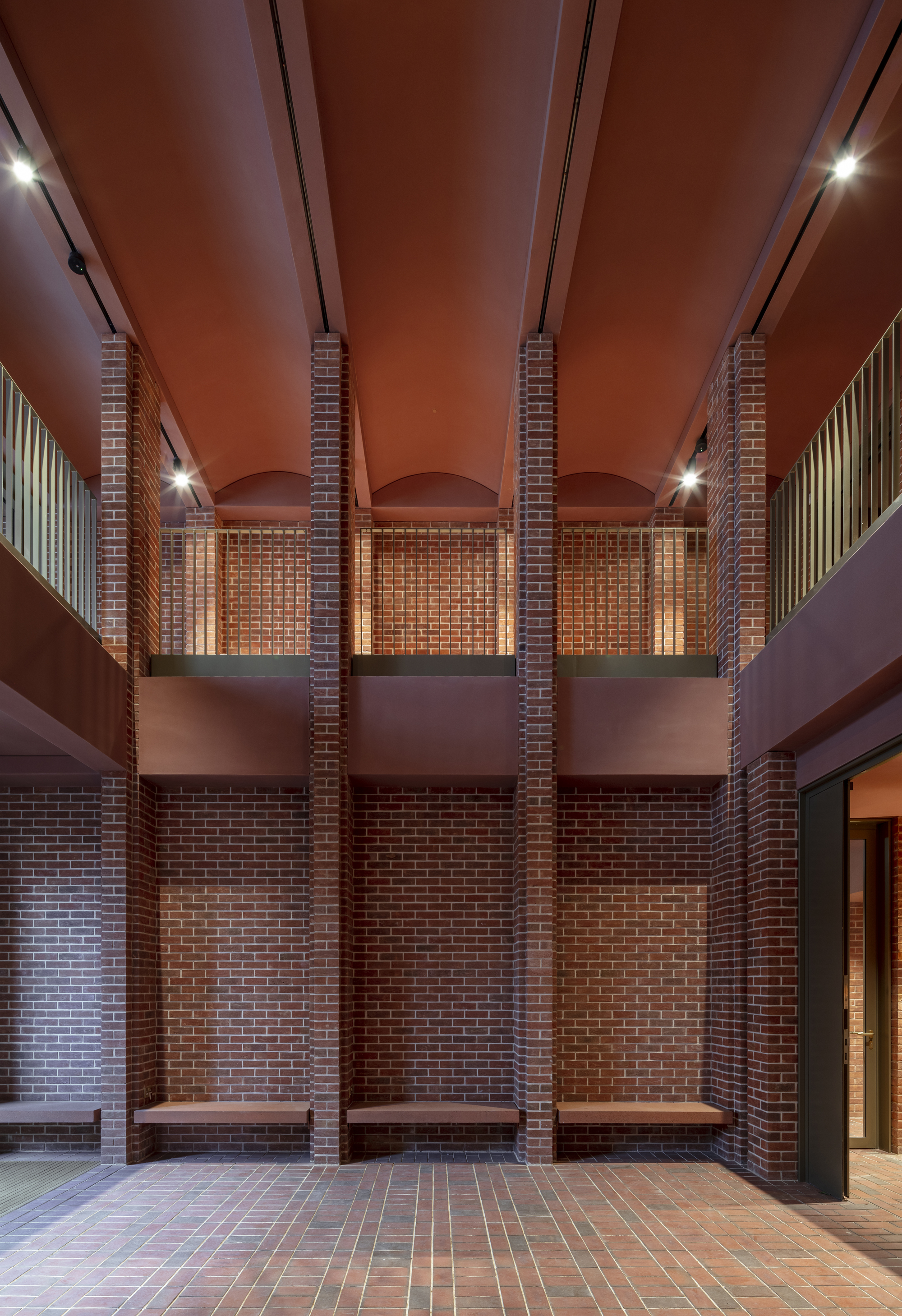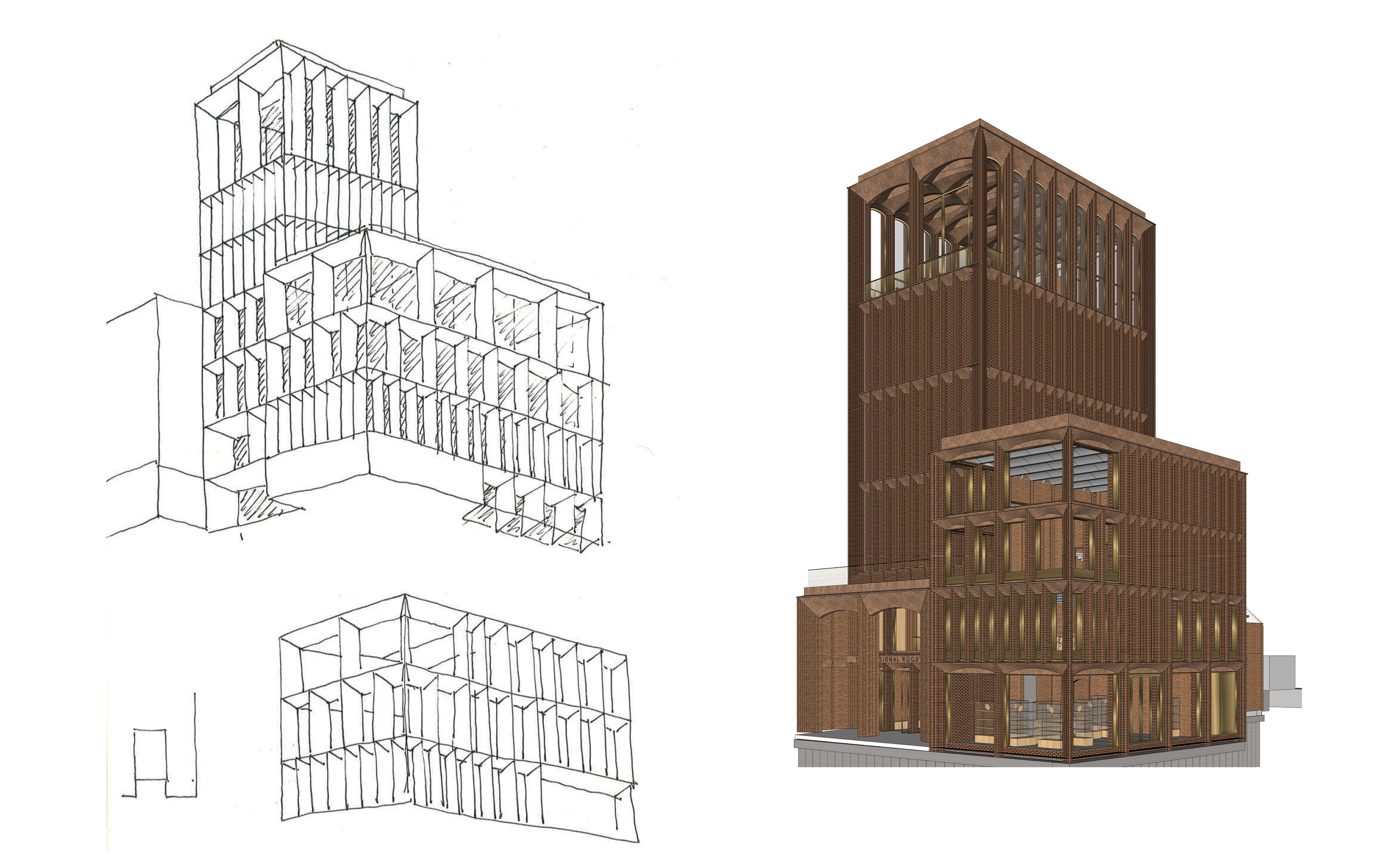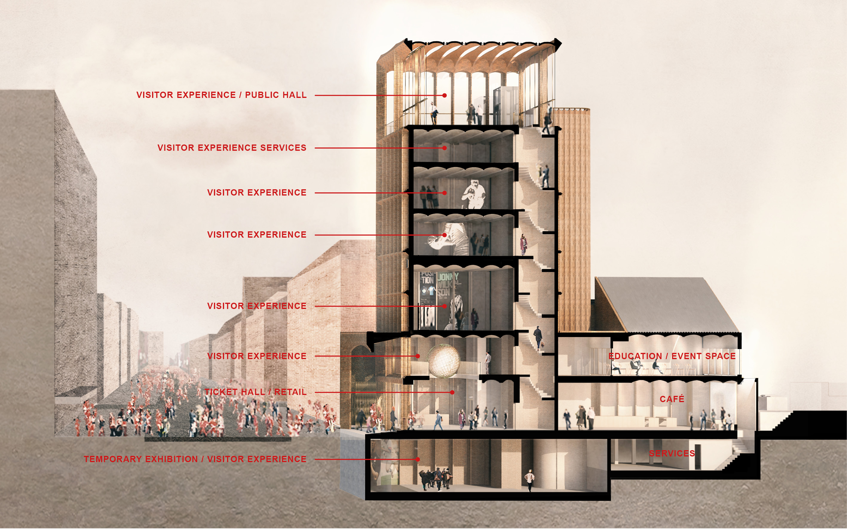 The building is crowned with a public hall at the top. A grand entrance portico addresses the main street, providing shelter and creating a public space below where visitors gather and fans can meet on match days. Both inside and out, structural forces will be expressed through brick and concrete detailing to create a building that reflects some of the forces found in the game of rugby. The structure and brick expression should provide a tangible link to the building’s function and will be key to the visitor experience.