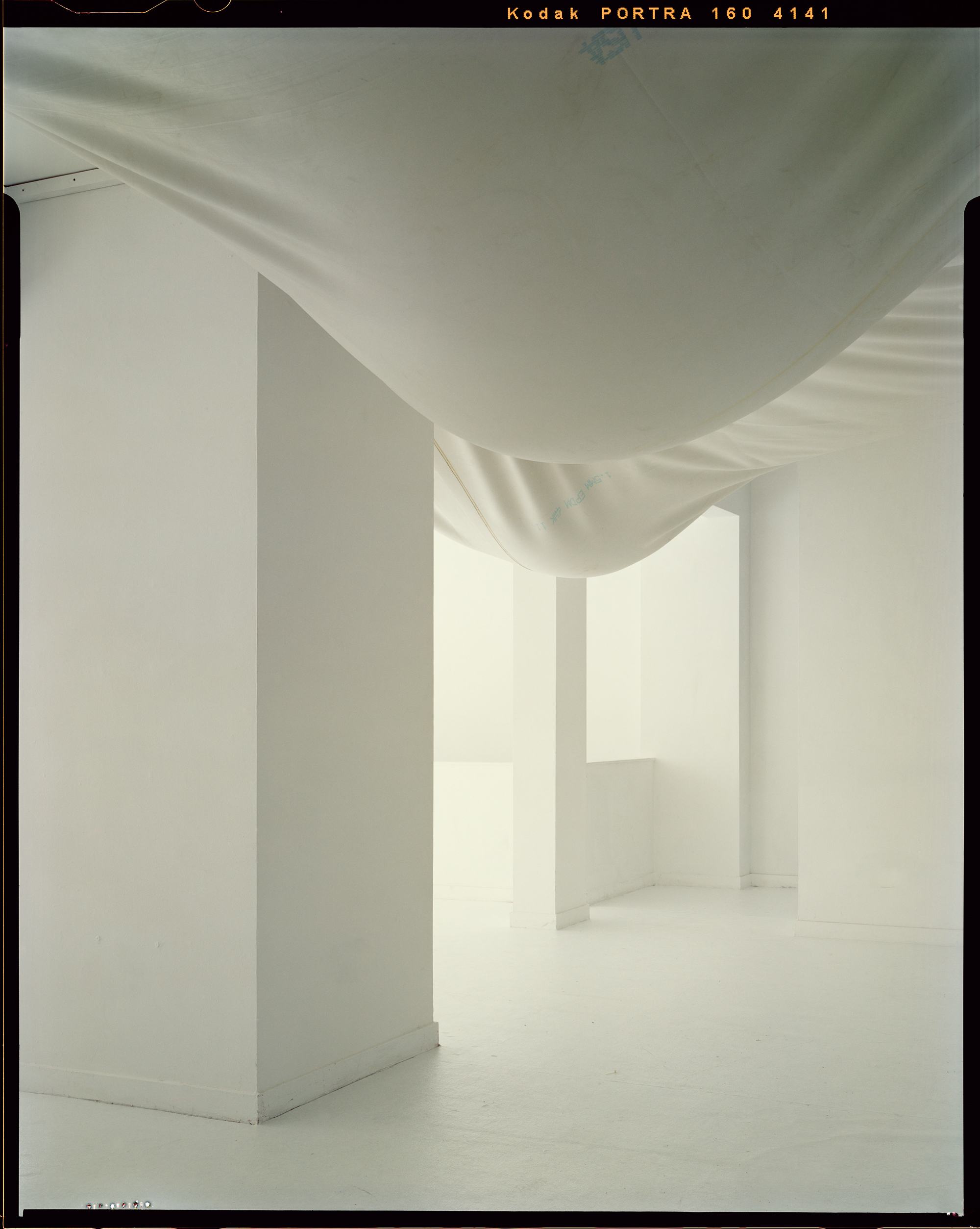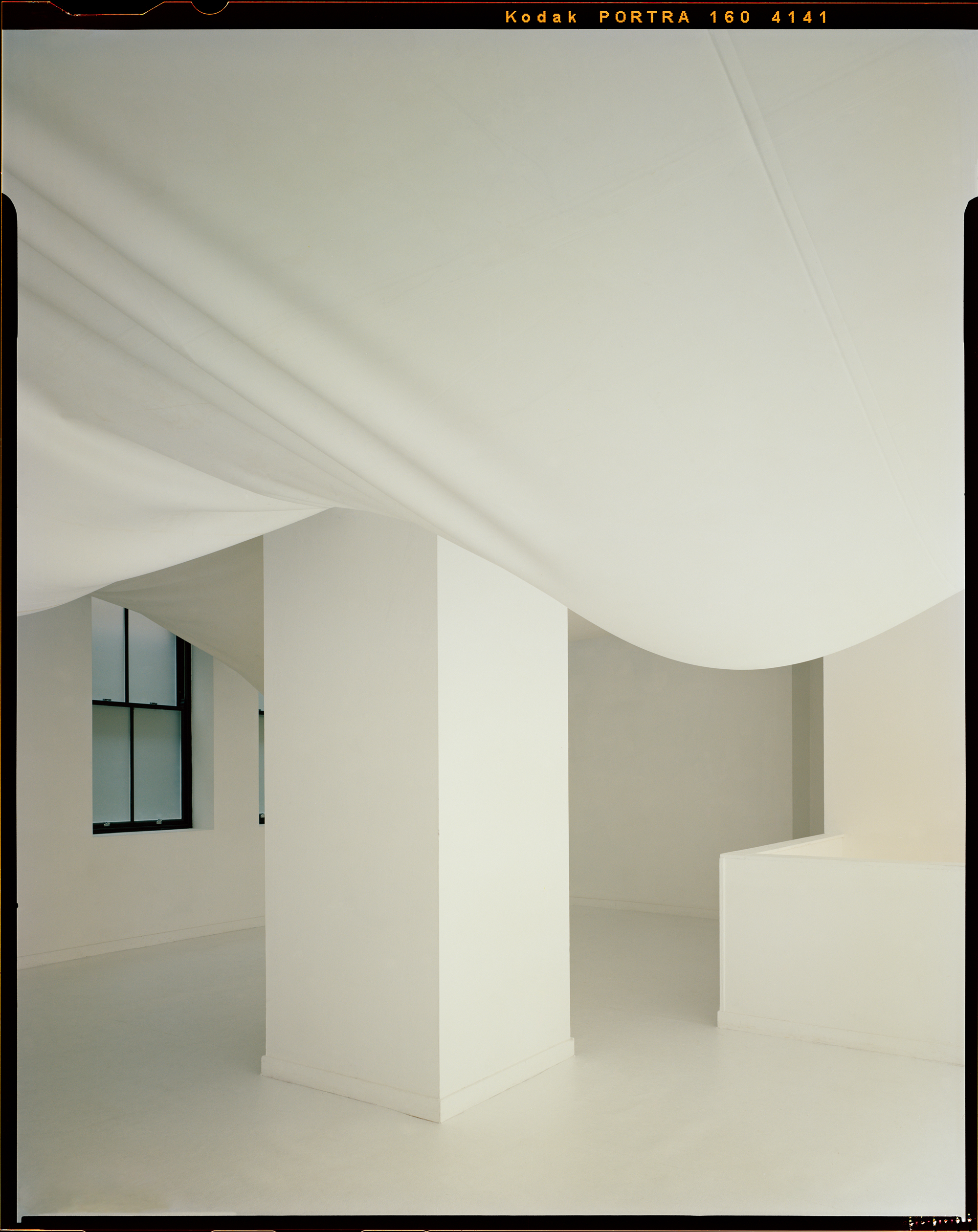 Primera de una serie de intervenciones efímeras realizada en un local en Londres (Greek Street, Soho). Definimos un perímetro para colgar una manta (EPDM) tensada que va deformándose por el peso del agua para dar forma al espacio, que es el negativo de una piscina invisible.