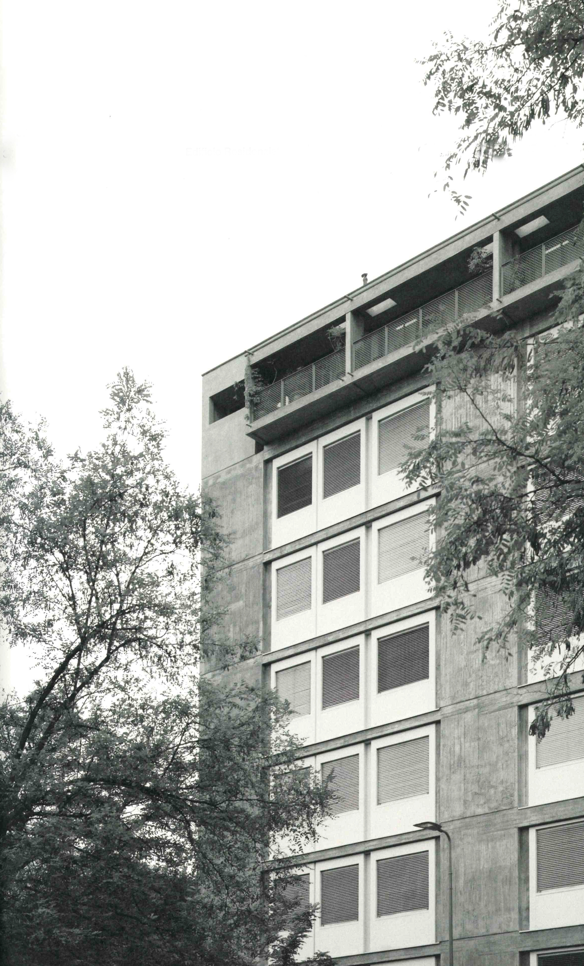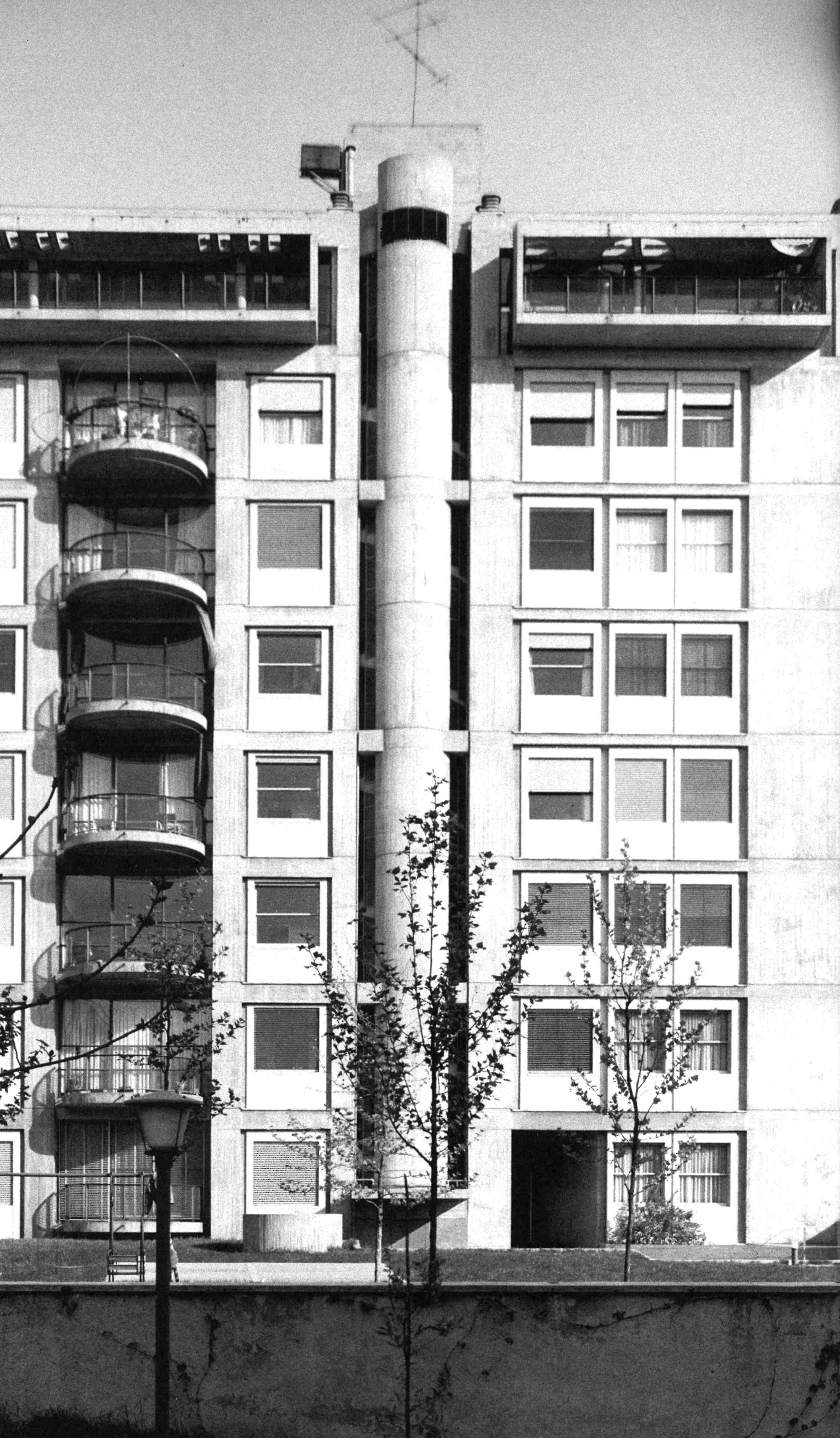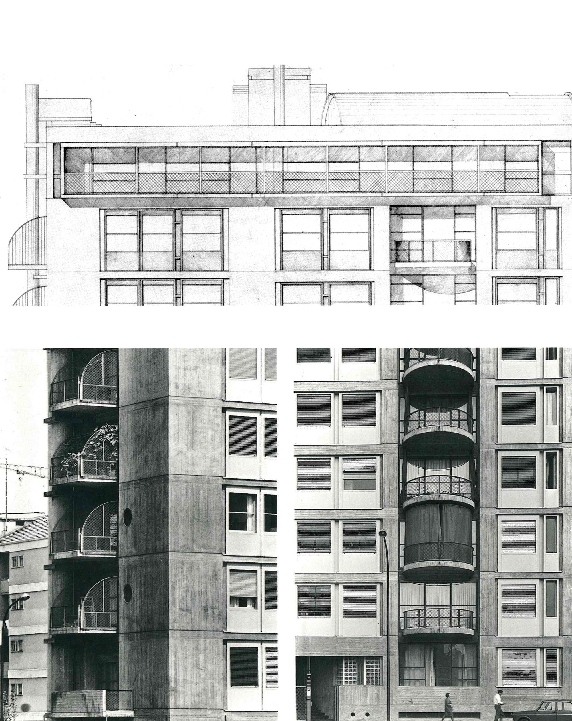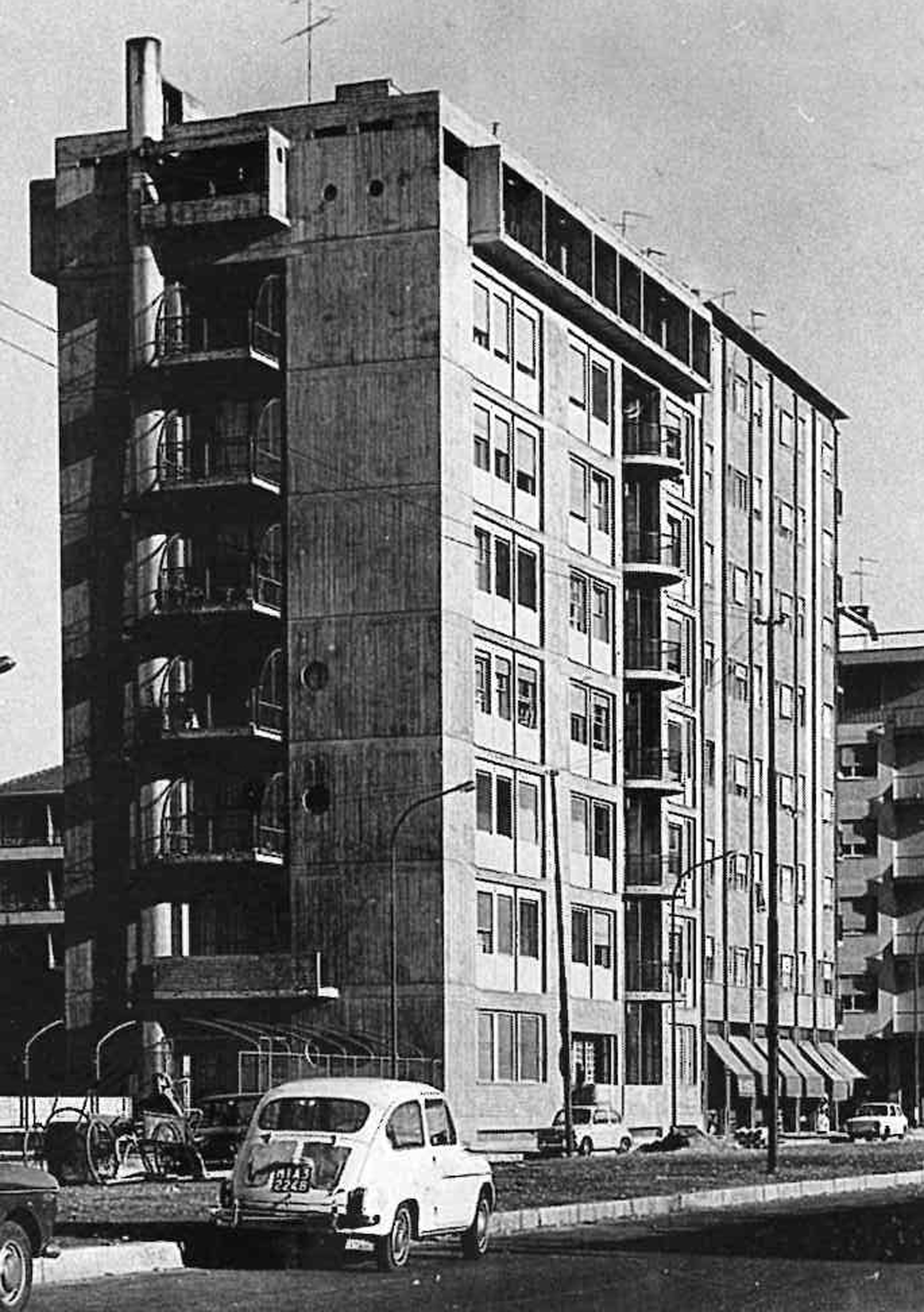 A significant example of Riva’s attention to construction technologies, the building in via Paravia – designed for a cooperative with little economic means – proves to be a brilliant exercise of ingenuity, which resorts to the use of prefabricated exposed concrete panels to close a skeleton composed of reinforced concrete partitions, exploiting its intrinsic characteristics of economy and expressive capacity. These principles inspired the unusual choice of aluminum windows and doors with painted sheet metal frames, which at the time were still little used in domestic contexts. The building is entirely intended for apartments, two for each of the standard floors, which provide different distributions: the apartments located in the northern section have views facing the garden and the street, with pass-through living rooms that occupy the entire depth of the building. building and which are equipped with two large balconies, with a semicircular plan; those to the south have windows open on three sides, but a corner living room and a single terrace.