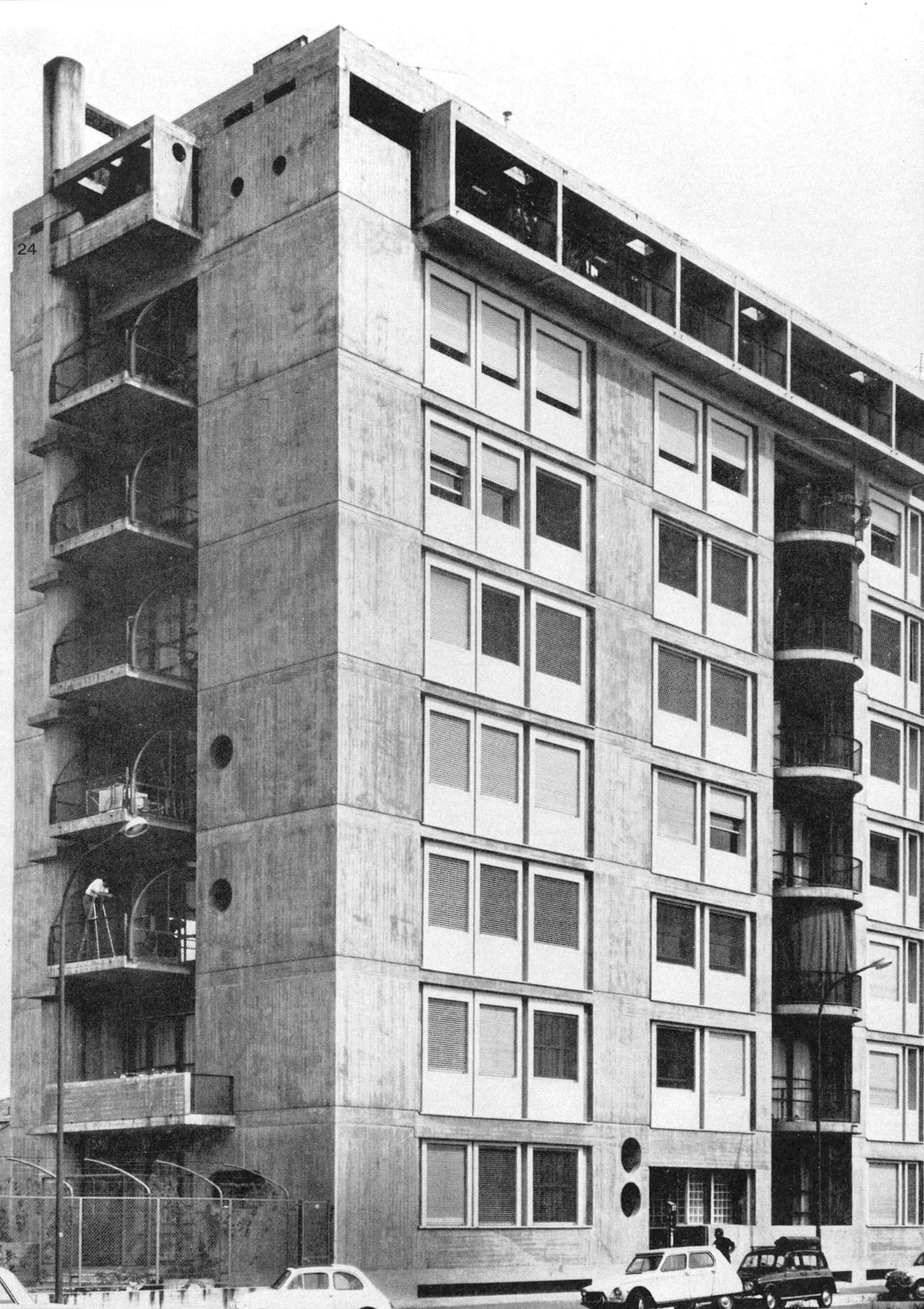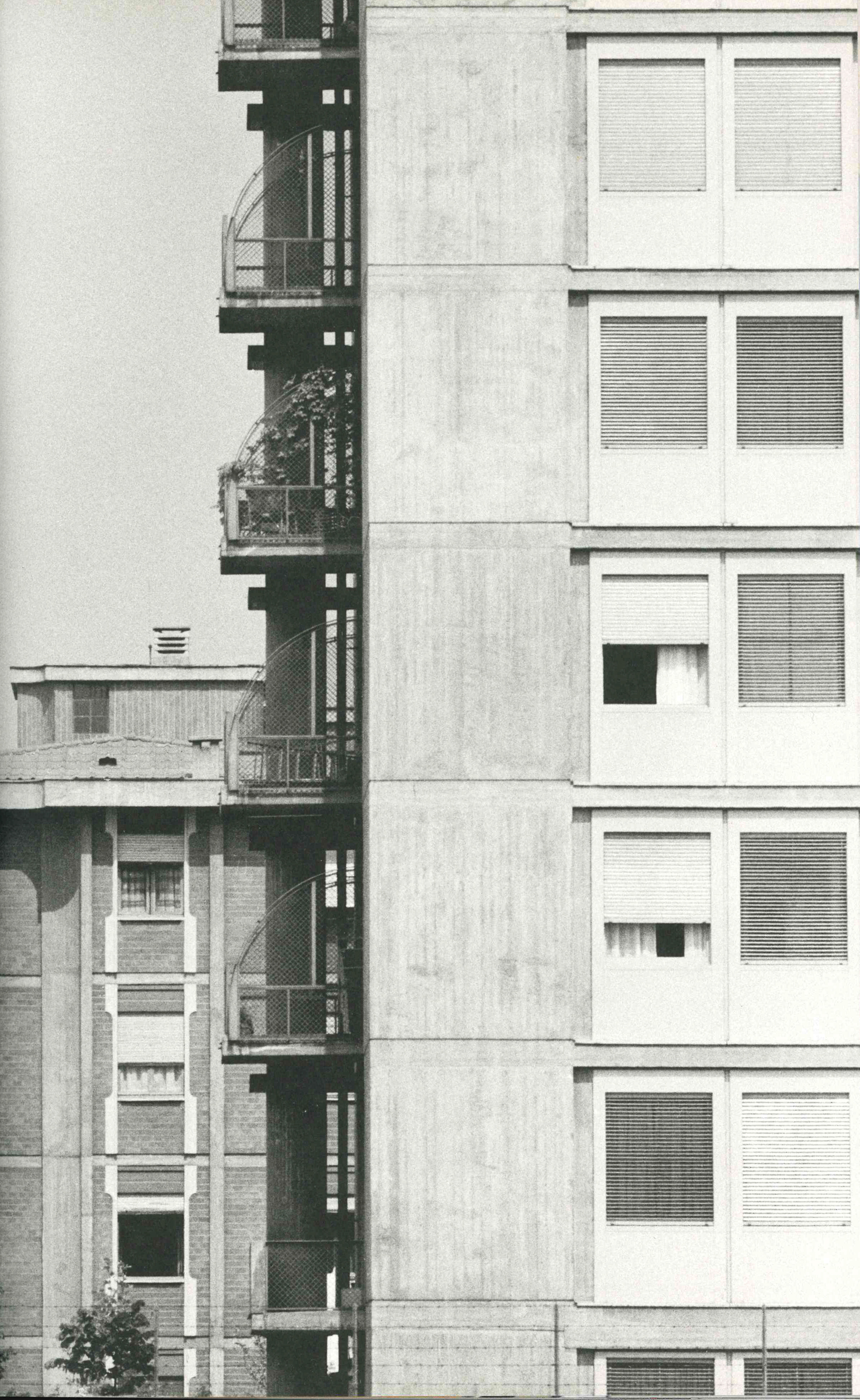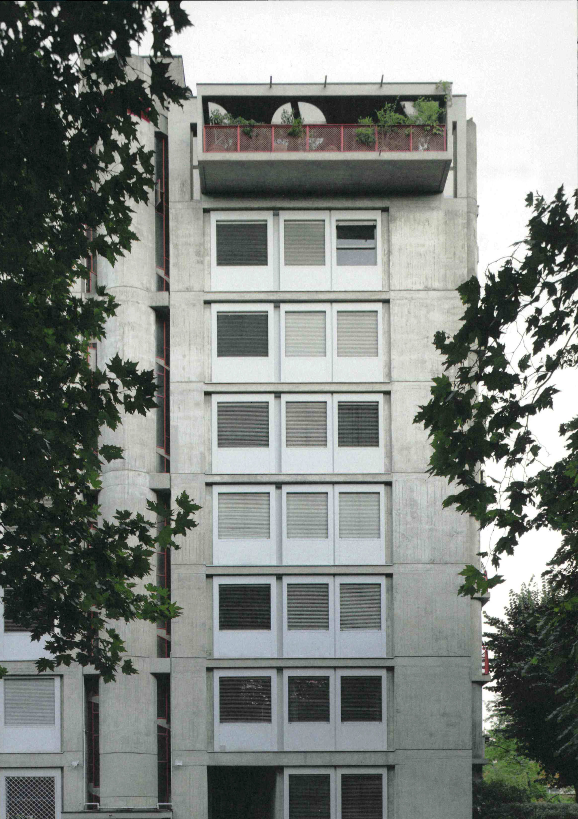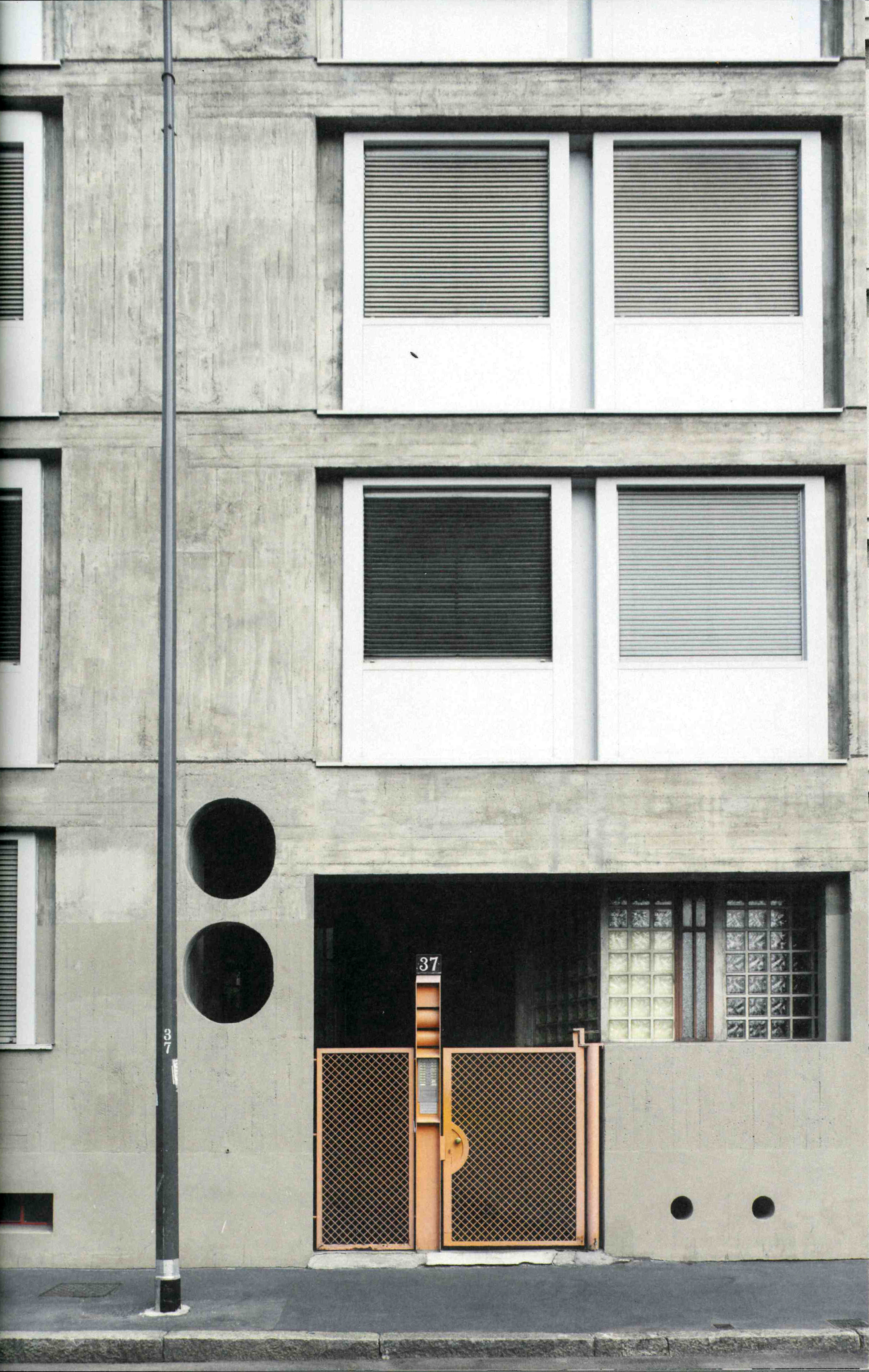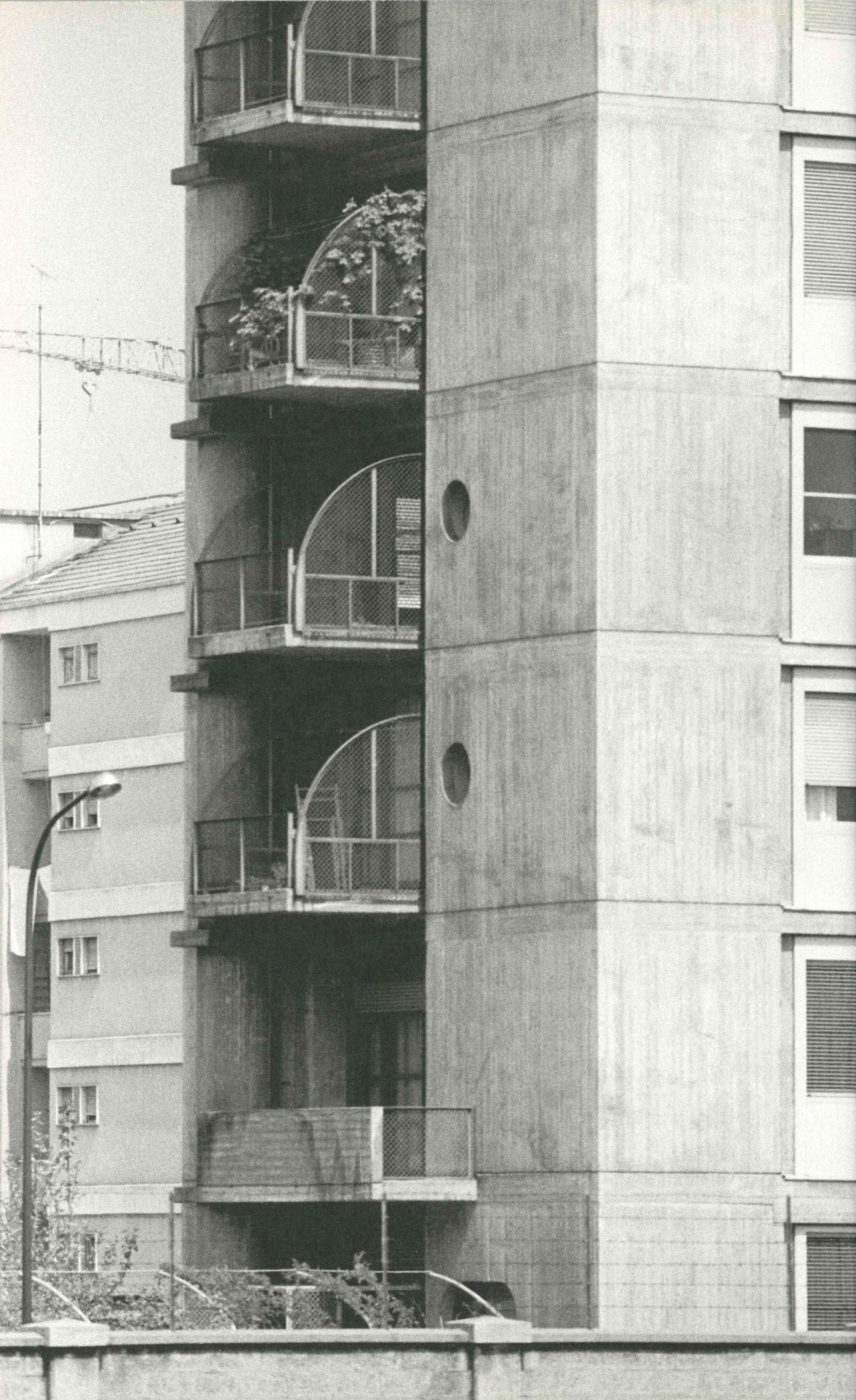 A significant example of Riva’s attention to construction technologies, the building in via Paravia – designed for a cooperative with little economic means – proves to be a brilliant exercise of ingenuity, which resorts to the use of prefabricated exposed concrete panels to close a skeleton composed of reinforced concrete partitions, exploiting its intrinsic characteristics of economy and expressive capacity. These principles inspired the unusual choice of aluminum windows and doors with painted sheet metal frames, which at the time were still little used in domestic contexts. The building is entirely intended for apartments, two for each of the standard floors, which provide different distributions: the apartments located in the northern section have views facing the garden and the street, with pass-through living rooms that occupy the entire depth of the building. building and which are equipped with two large balconies, with a semicircular plan; those to the south have windows open on three sides, but a corner living room and a single terrace.