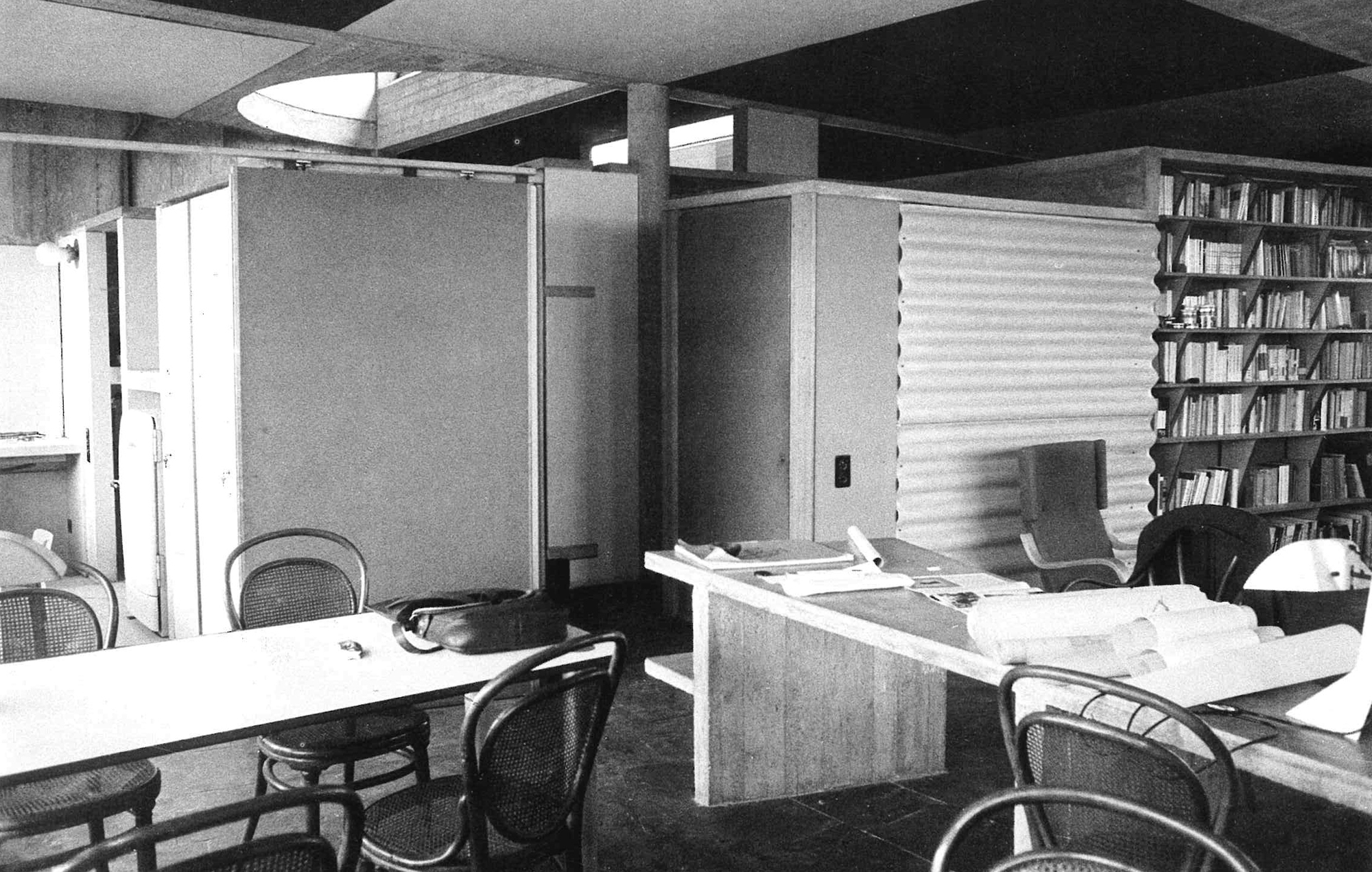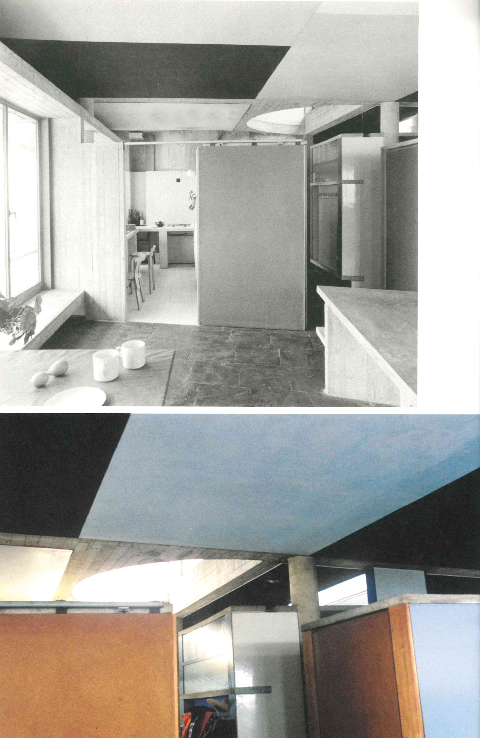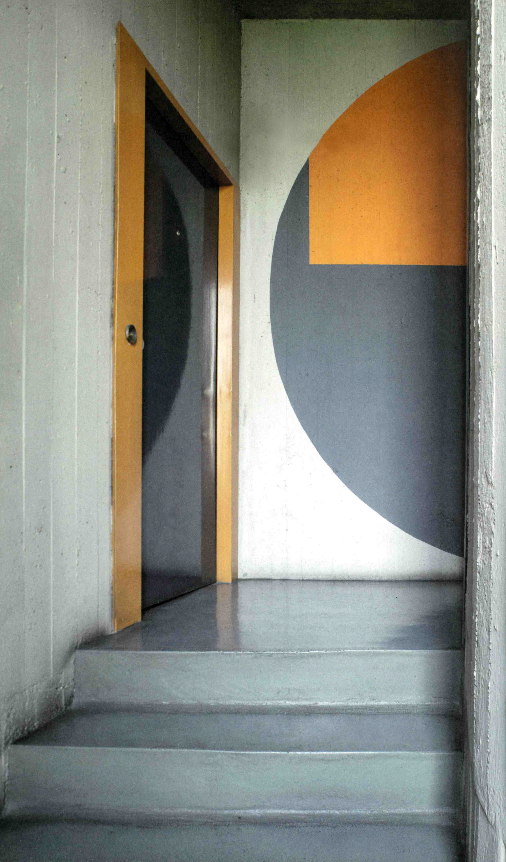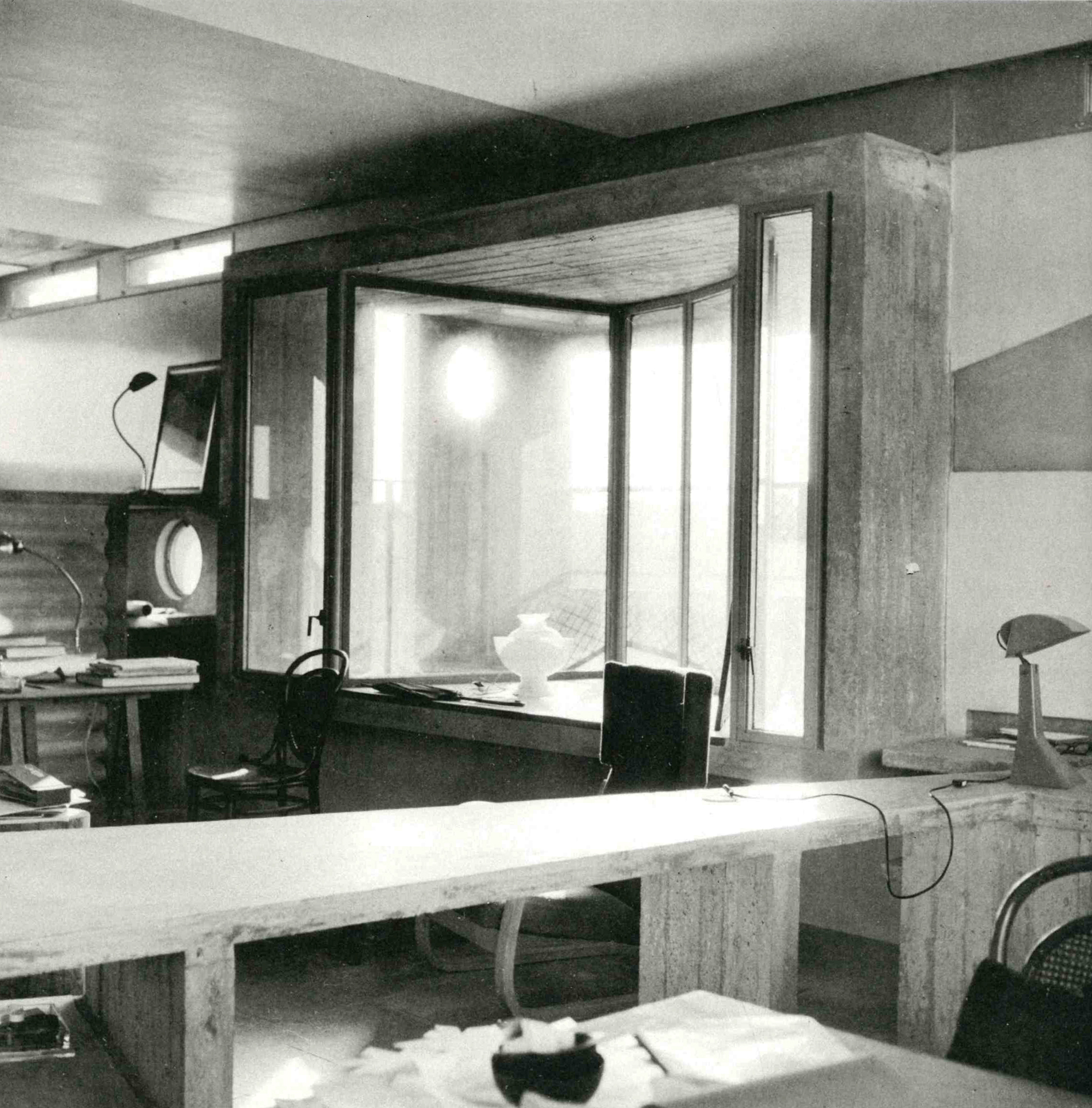 They are distributed by a semicircular staircase, reachable from an atrium on the ground floor – whose volume is punctuated by circular columns – which also allows access to the cellar floor and directly to the garden, partly created on the roof of an underground garage. An exception to this scheme is the attic floor, whose main fronts are marked by the projecting volume of continuous balconies, which also act as a sunshade element, onto which the domestic spaces overlook through continuous glass windows with iron window profiles. On this level, the southern apartment has been the subject of an accurate interior design which has modified its layout and distribution: it has three bedrooms and two bathrooms, with the living room partially shielded from the study by a fixed bookcase in cement, eternit and shelves in pitch-pine and walnut. Other fixed furnishings are the wardrobes with Masonite doors (profiled again in pitch-pine) and the dining table in the living room, made of concrete. The uniformity of the floor, in split porphyroid in shades of gray and black throughout the house, is counterbalanced by the ceiling: continuous throughout the accommodation thanks to the reduction in the heights of the internal planks (which, when necessary, are concluded with upper glass bands capable of guaranteeing privacy to the rooms without generating visual interruptions), is painted with squares in glossy white, matt white, light blue and black.