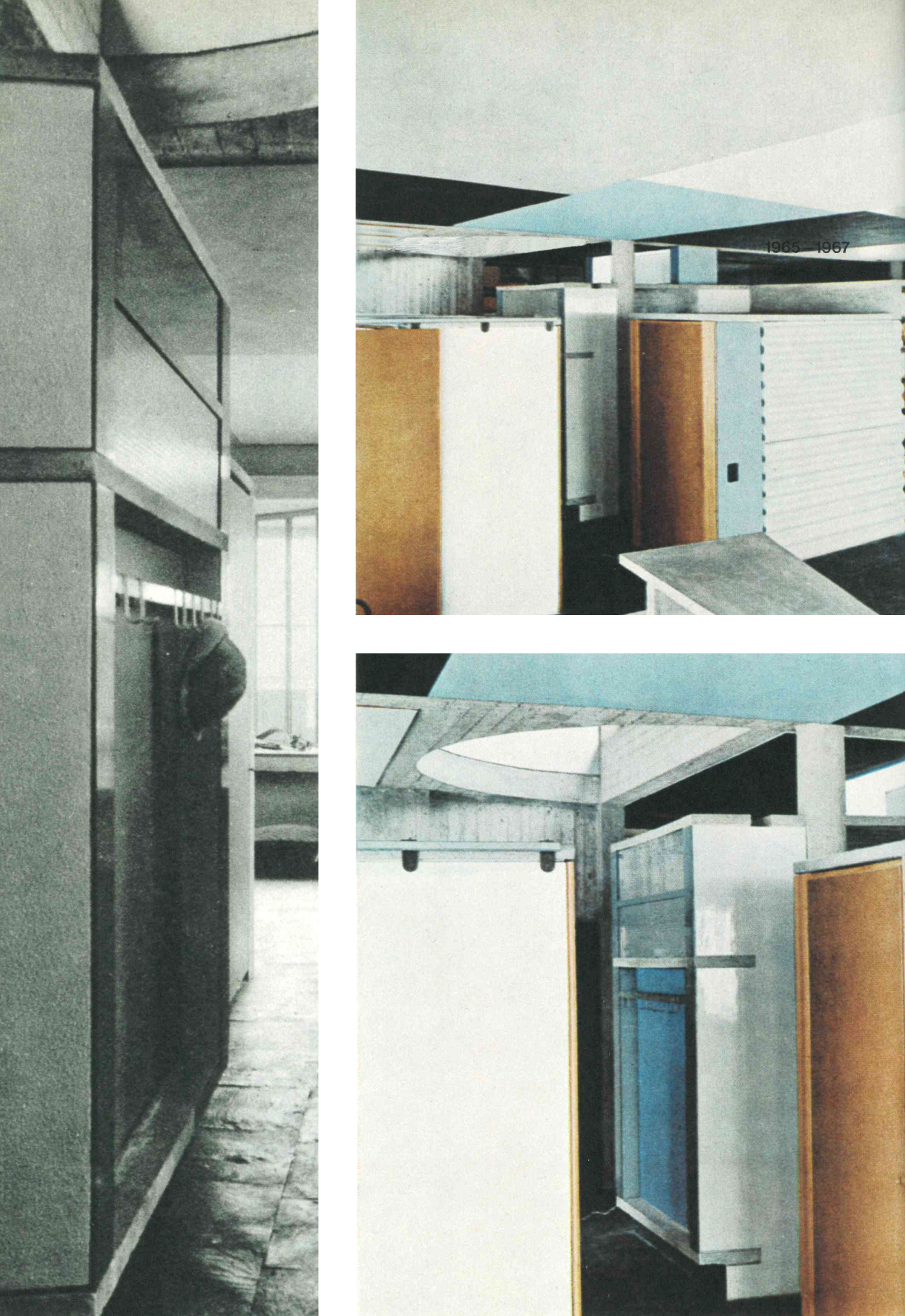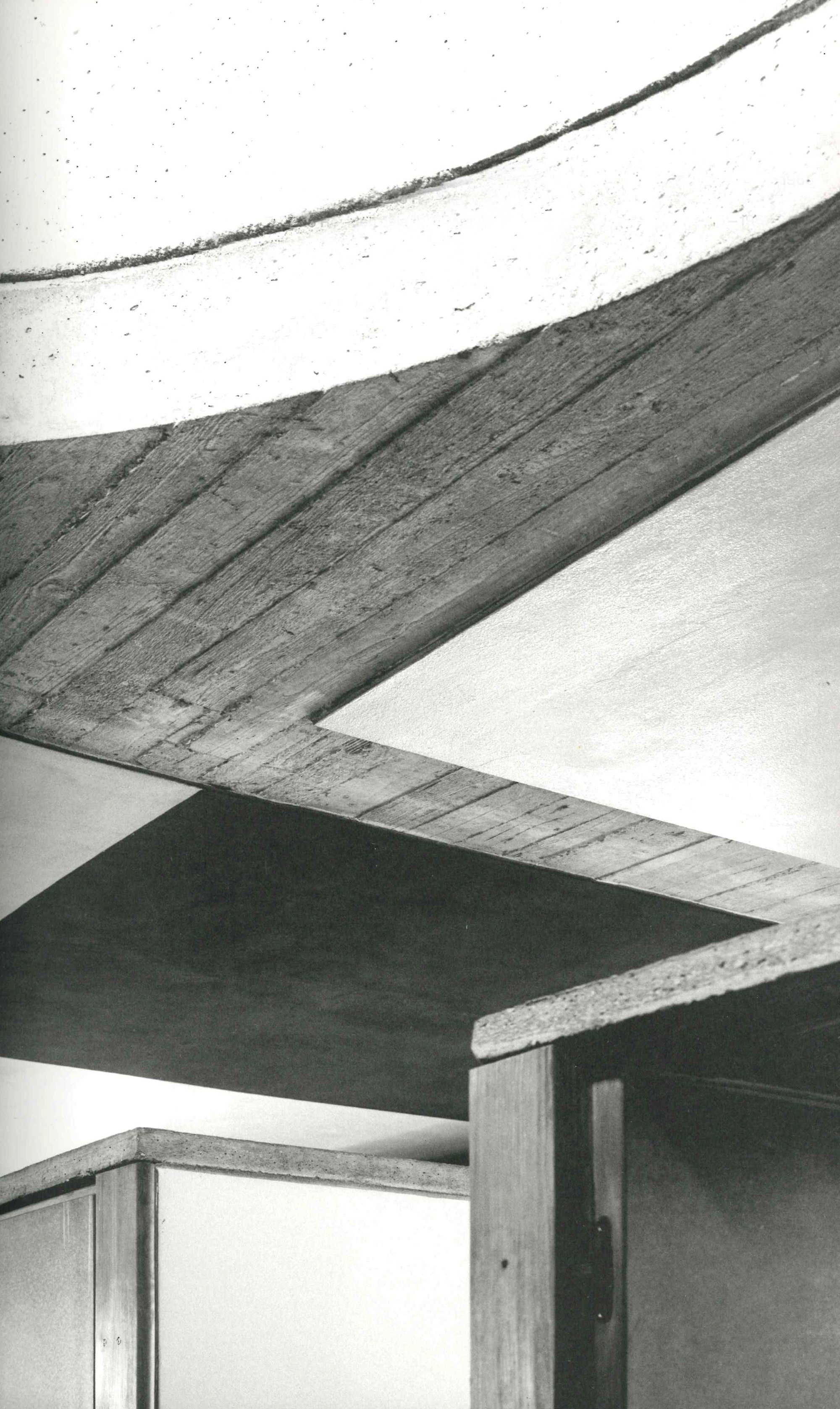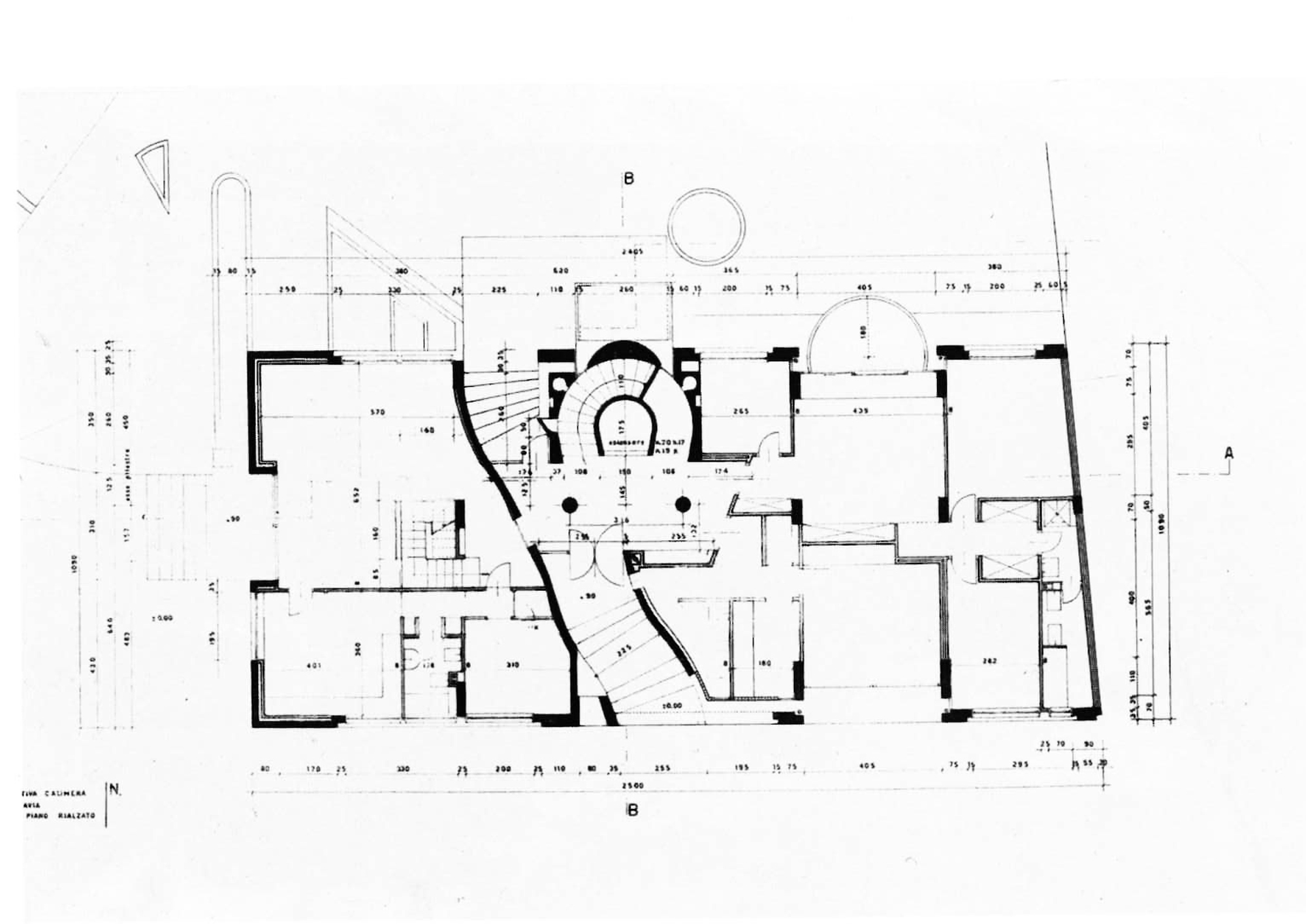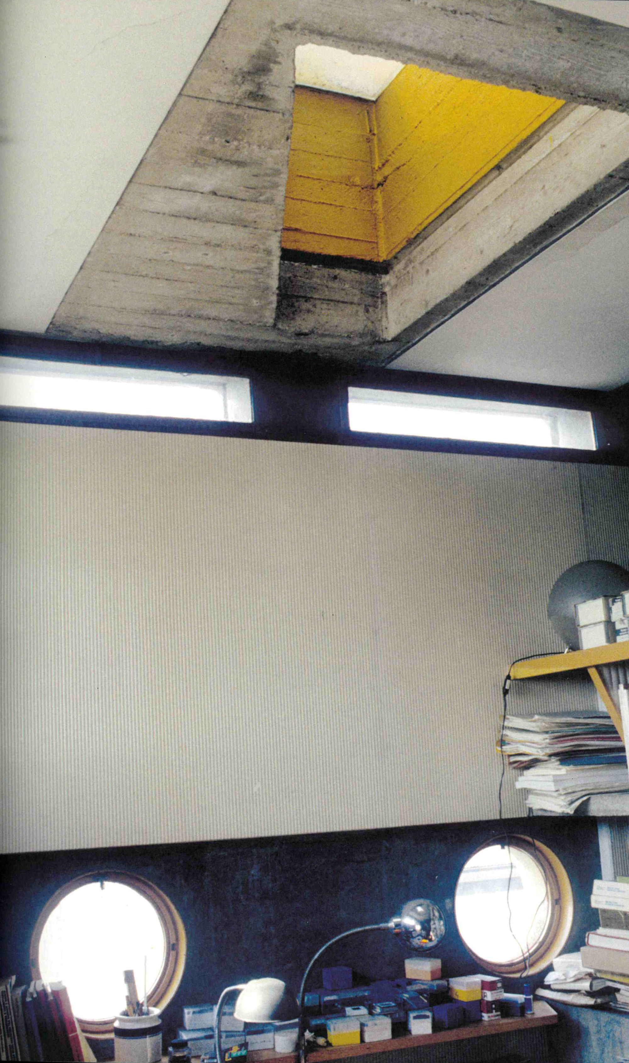 They are distributed by a semicircular staircase, reachable from an atrium on the ground floor – whose volume is punctuated by circular columns – which also allows access to the cellar floor and directly to the garden, partly created on the roof of an underground garage. An exception to this scheme is the attic floor, whose main fronts are marked by the projecting volume of continuous balconies, which also act as a sunshade element, onto which the domestic spaces overlook through continuous glass windows with iron window profiles. On this level, the southern apartment has been the subject of an accurate interior design which has modified its layout and distribution: it has three bedrooms and two bathrooms, with the living room partially shielded from the study by a fixed bookcase in cement, eternit and shelves in pitch-pine and walnut. Other fixed furnishings are the wardrobes with Masonite doors (profiled again in pitch-pine) and the dining table in the living room, made of concrete. The uniformity of the floor, in split porphyroid in shades of gray and black throughout the house, is counterbalanced by the ceiling: continuous throughout the accommodation thanks to the reduction in the heights of the internal planks (which, when necessary, are concluded with upper glass bands capable of guaranteeing privacy to the rooms without generating visual interruptions), is painted with squares in glossy white, matt white, light blue and black.
