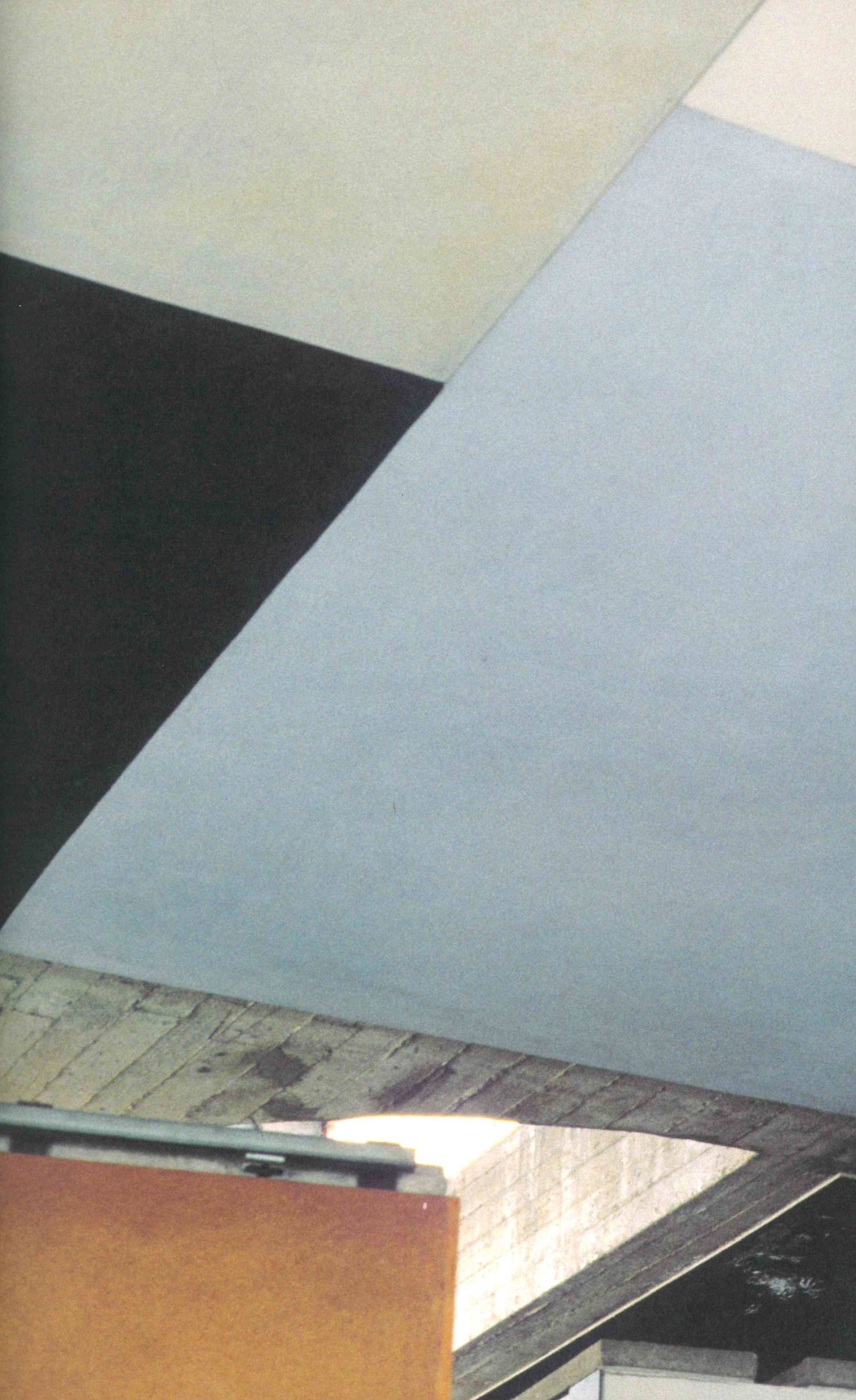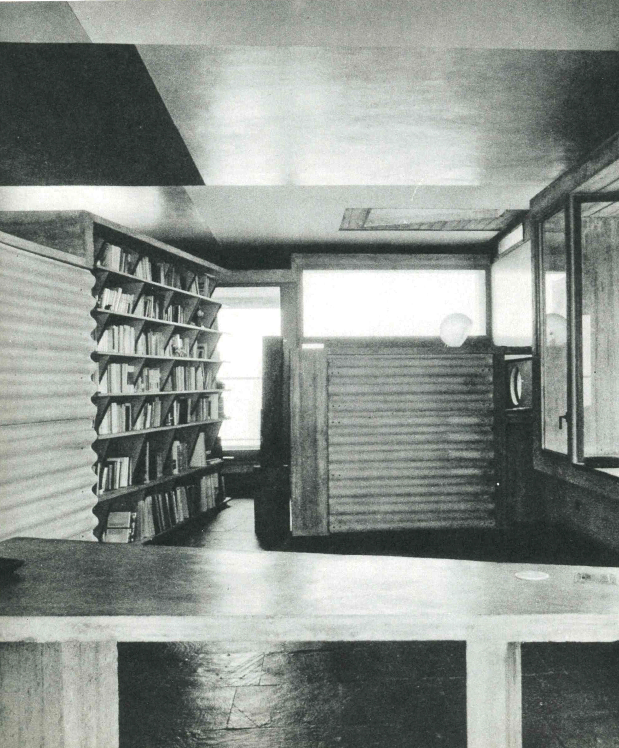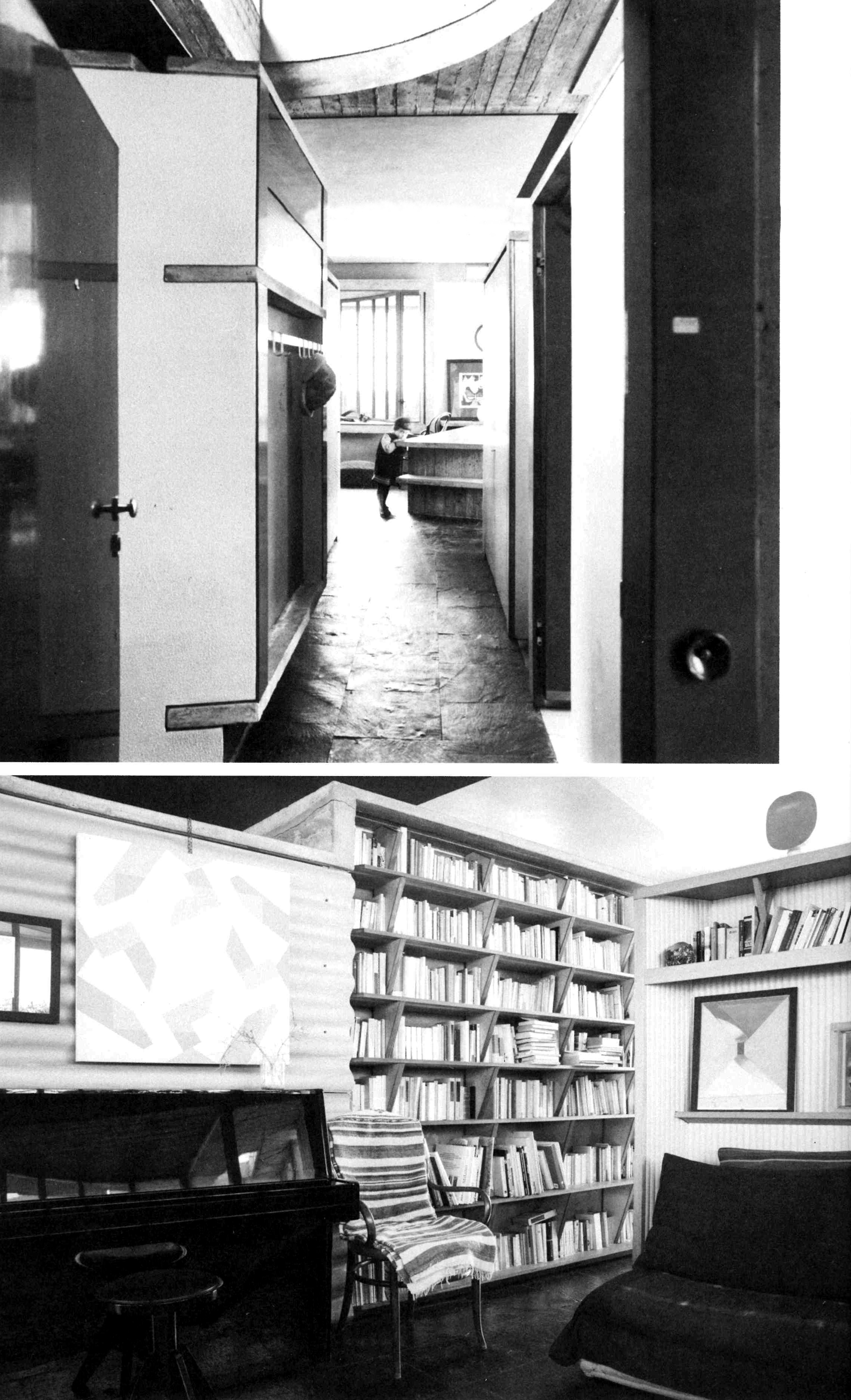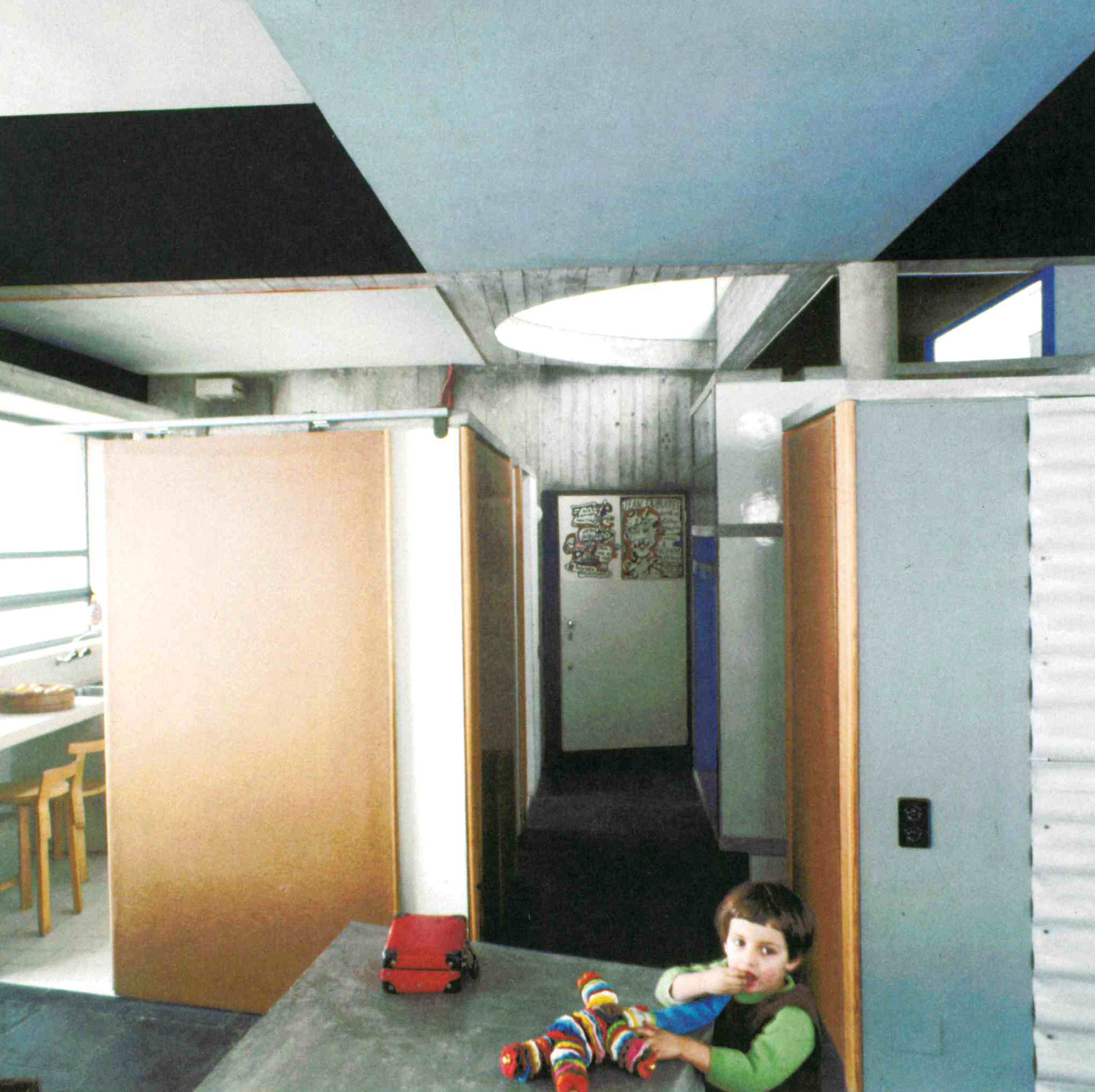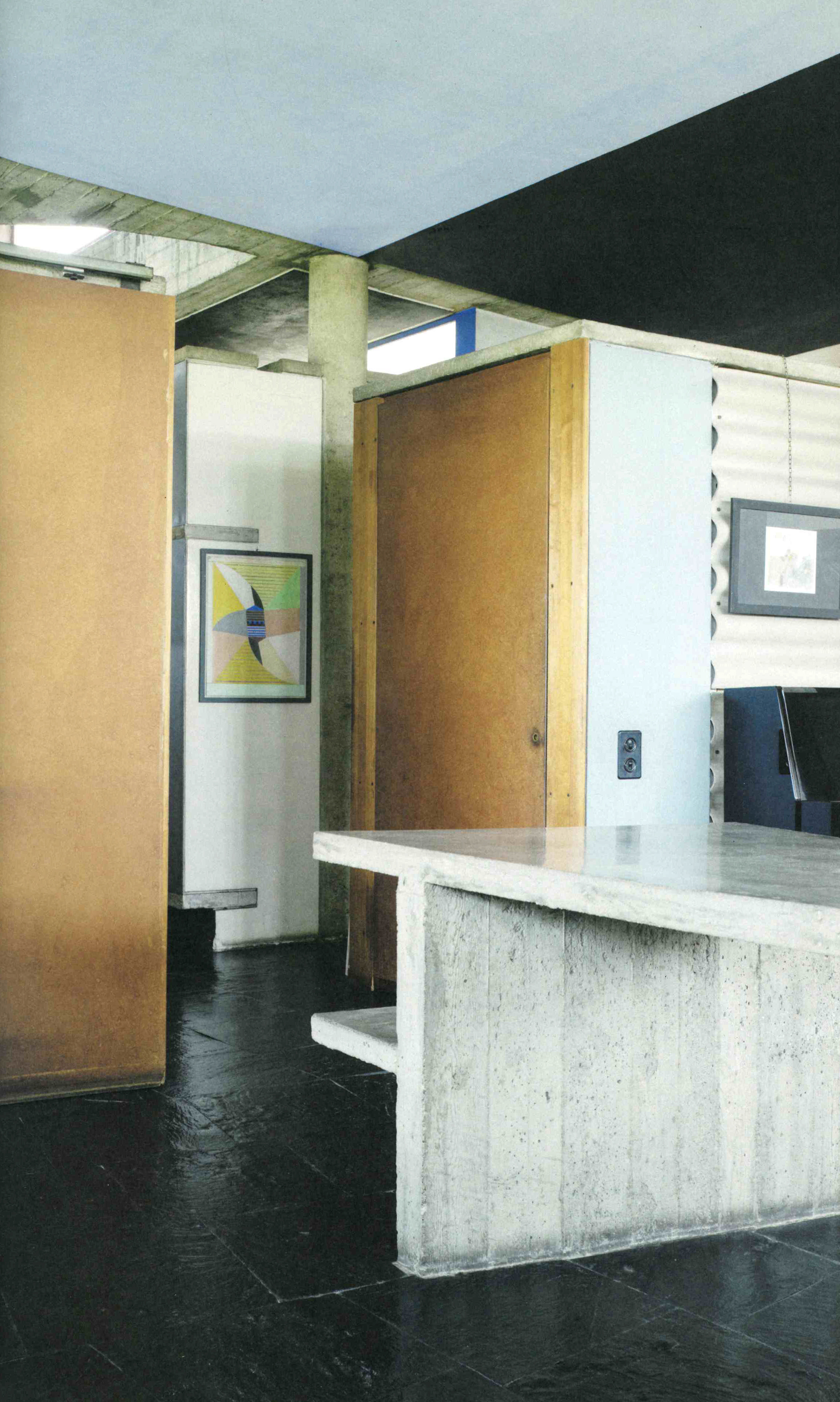 They are distributed by a semicircular staircase, reachable from an atrium on the ground floor – whose volume is punctuated by circular columns – which also allows access to the cellar floor and directly to the garden, partly created on the roof of an underground garage. An exception to this scheme is the attic floor, whose main fronts are marked by the projecting volume of continuous balconies, which also act as a sunshade element, onto which the domestic spaces overlook through continuous glass windows with iron window profiles. On this level, the southern apartment has been the subject of an accurate interior design which has modified its layout and distribution: it has three bedrooms and two bathrooms, with the living room partially shielded from the study by a fixed bookcase in cement, eternit and shelves in pitch-pine and walnut. Other fixed furnishings are the wardrobes with Masonite doors (profiled again in pitch-pine) and the dining table in the living room, made of concrete. The uniformity of the floor, in split porphyroid in shades of gray and black throughout the house, is counterbalanced by the ceiling: continuous throughout the accommodation thanks to the reduction in the heights of the internal planks (which, when necessary, are concluded with upper glass bands capable of guaranteeing privacy to the rooms without generating visual interruptions), is painted with squares in glossy white, matt white, light blue and black.