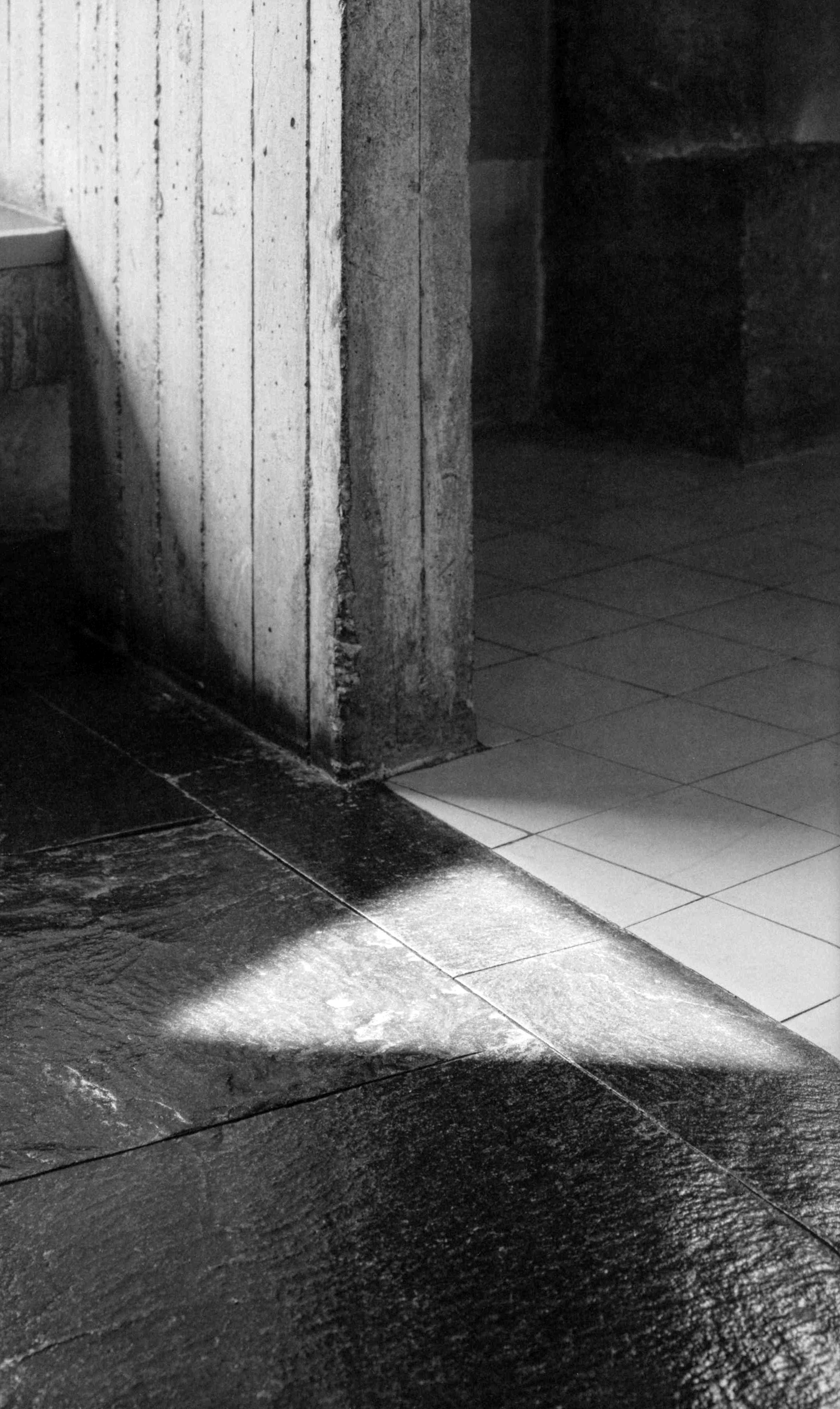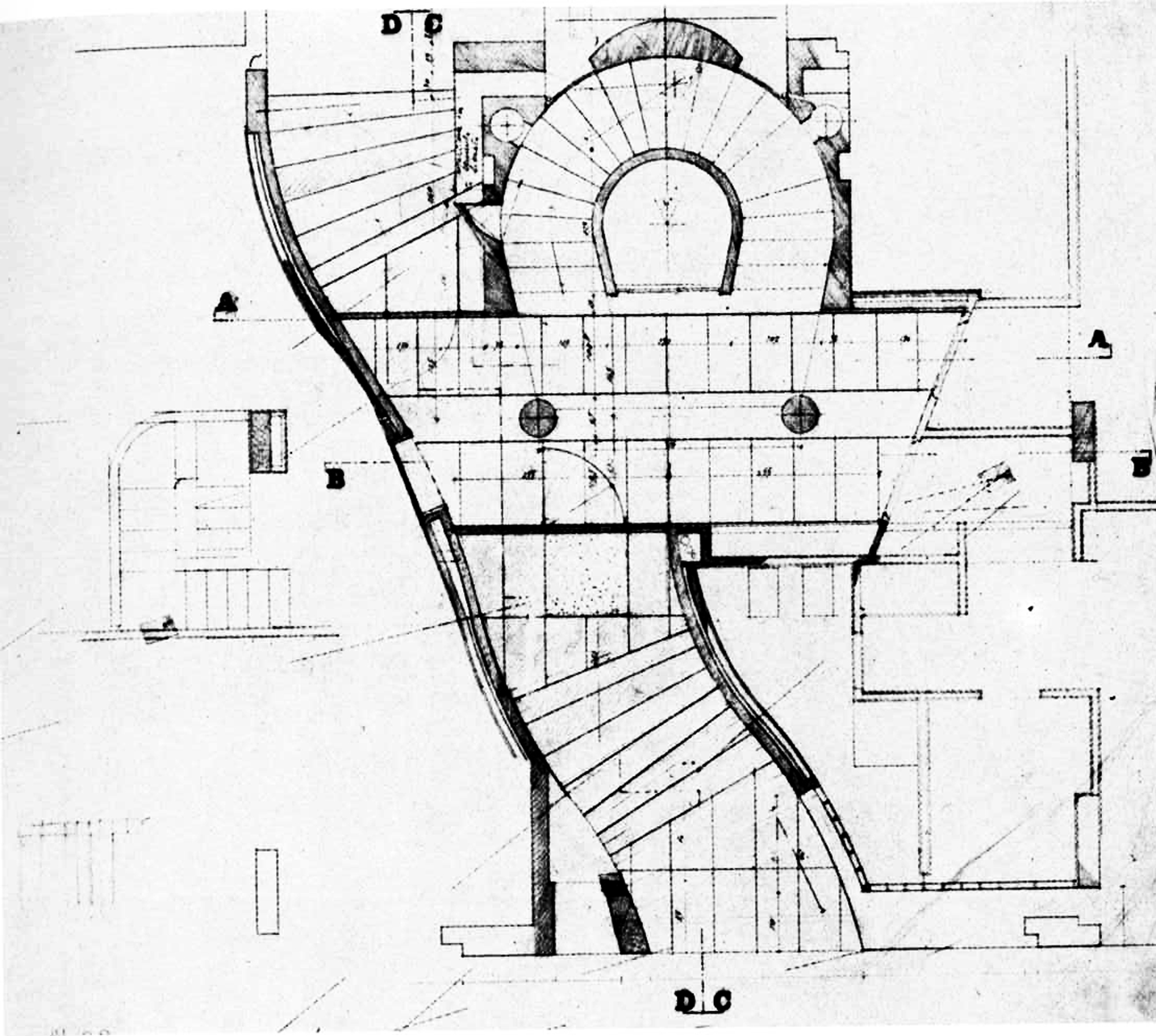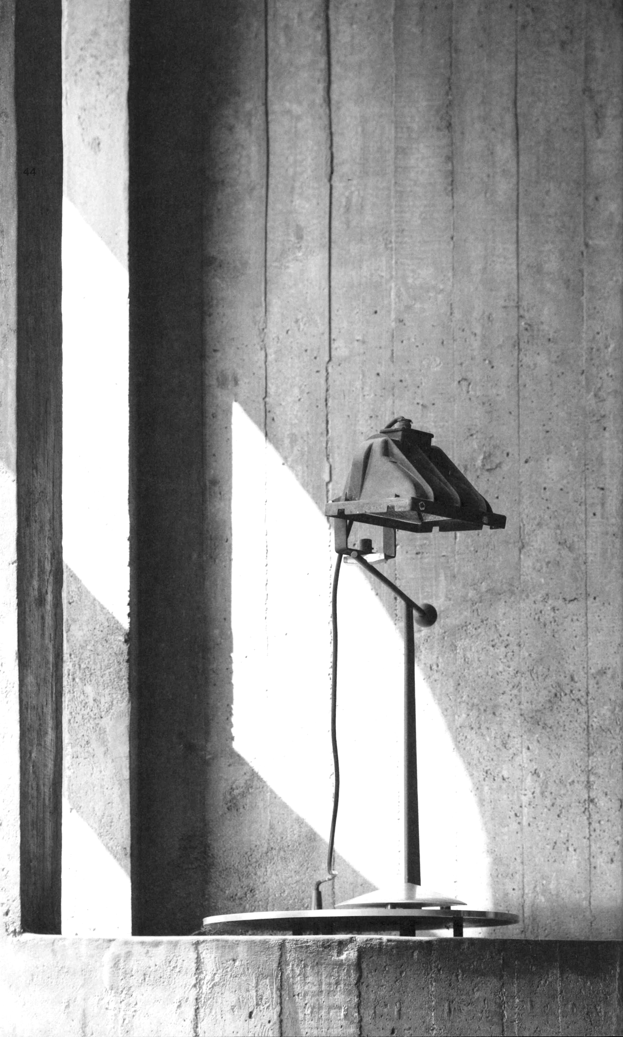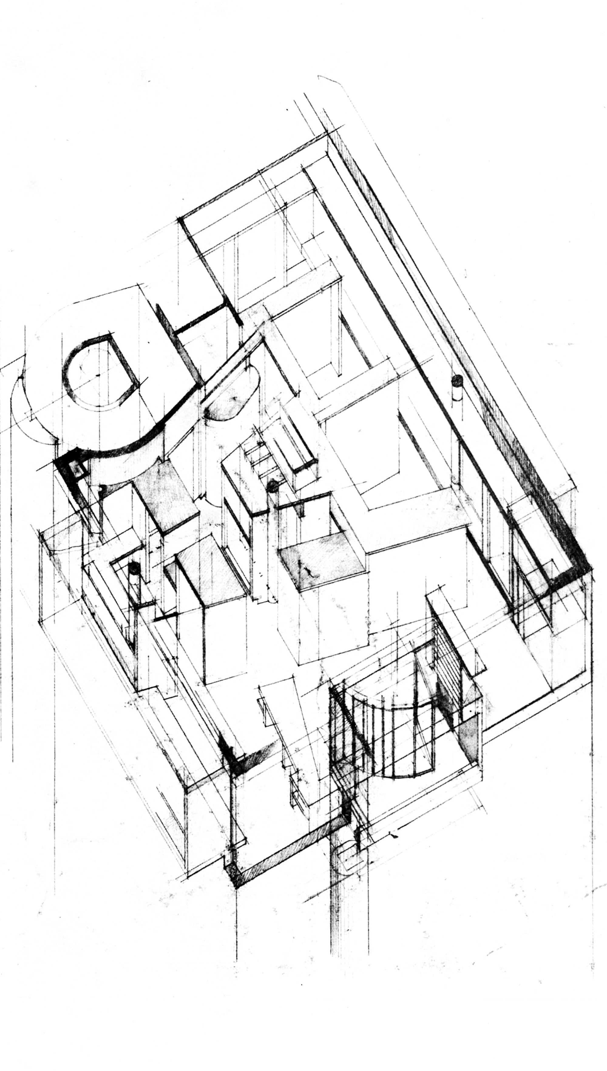 They are distributed by a semicircular staircase, reachable from an atrium on the ground floor – whose volume is punctuated by circular columns – which also allows access to the cellar floor and directly to the garden, partly created on the roof of an underground garage. An exception to this scheme is the attic floor, whose main fronts are marked by the projecting volume of continuous balconies, which also act as a sunshade element, onto which the domestic spaces overlook through continuous glass windows with iron window profiles. On this level, the southern apartment has been the subject of an accurate interior design which has modified its layout and distribution: it has three bedrooms and two bathrooms, with the living room partially shielded from the study by a fixed bookcase in cement, eternit and shelves in pitch-pine and walnut. Other fixed furnishings are the wardrobes with Masonite doors (profiled again in pitch-pine) and the dining table in the living room, made of concrete. The uniformity of the floor, in split porphyroid in shades of gray and black throughout the house, is counterbalanced by the ceiling: continuous throughout the accommodation thanks to the reduction in the heights of the internal planks (which, when necessary, are concluded with upper glass bands capable of guaranteeing privacy to the rooms without generating visual interruptions), is painted with squares in glossy white, matt white, light blue and black.