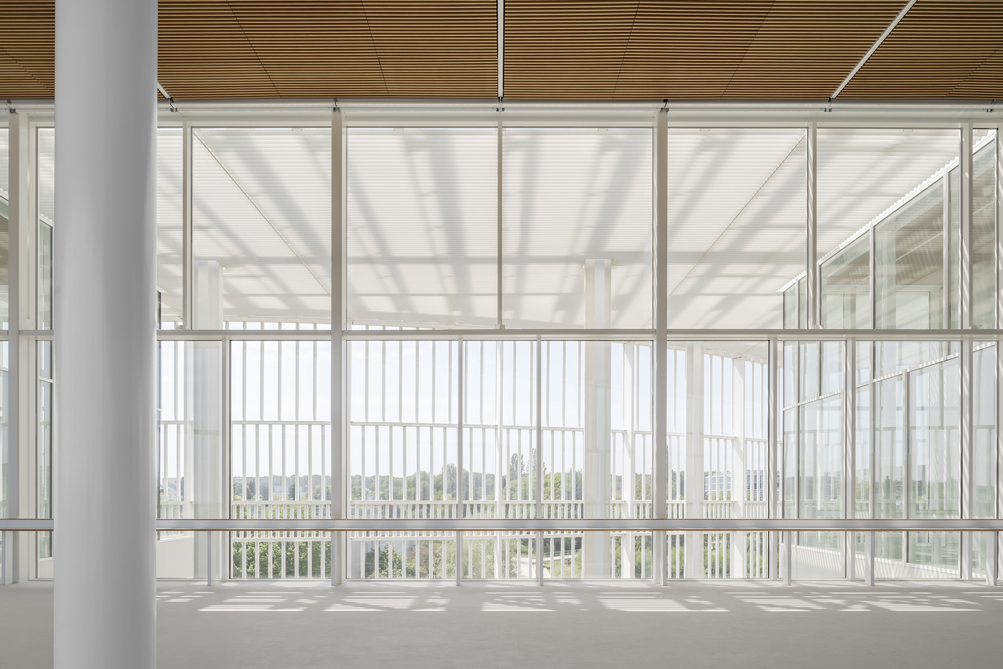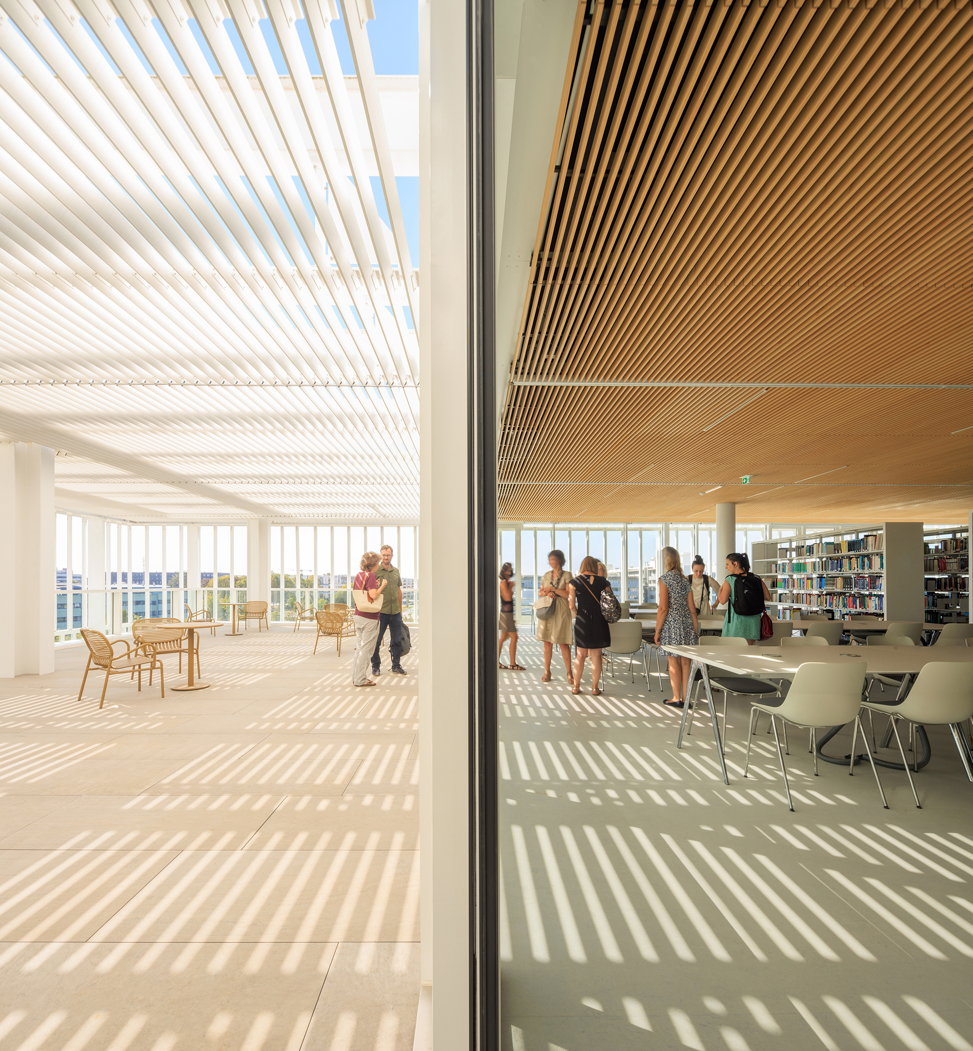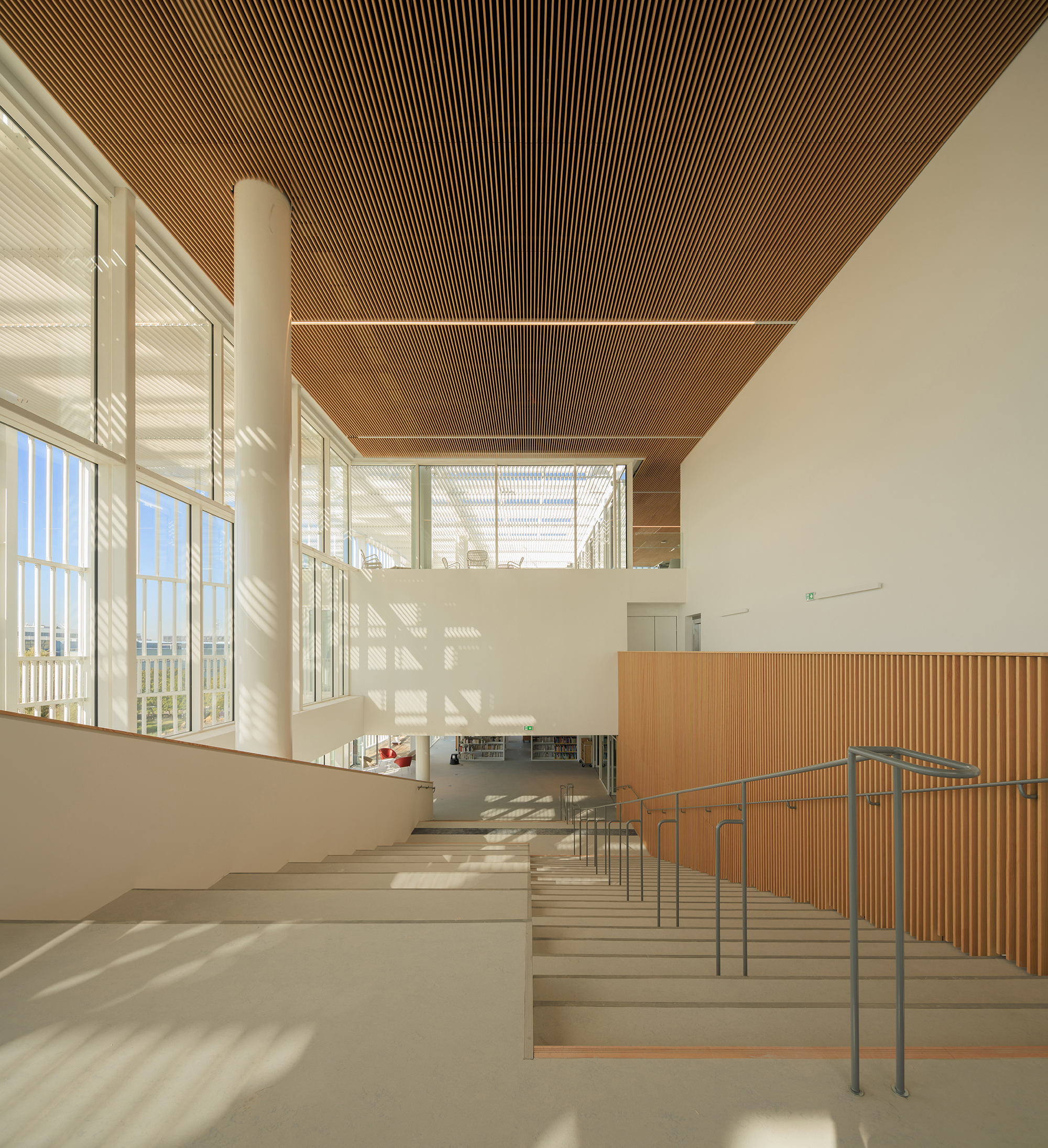 The “Lumen”, a learning center at the University of Paris Saclay, is based on a sober and expressive design due to its unifying program.The curved lines of the project soften the angular geometry of the site and accompany the arc traced by the aerial metro. The building is largely open to the outside and seeks lightness. The use of white metal columns, to filter the light, makes it possible to install an intermediate space between the public domain and the interior of the library. The steel structure is a tree structure protecting the interior by allowing a softened and changing light to filter through. The intermediate space serves as an extension of the park facing the building. The Lumen is formed of a single space rising in a spiral around an atrium. The space is fluid, it offers a slow drift among the collections and suggests the sharing of knowledge. The atmosphere of the building is bright, calm and serene, to convey the pleasure of reading and research. The building takes this flexibility into account, reducing the presence and size of the structures. The spaces are discovered in a succession of perspectives open from one place to another, where each function is easily identifiable. A belvedere terrace on the last level is the culmination of this interior journey.