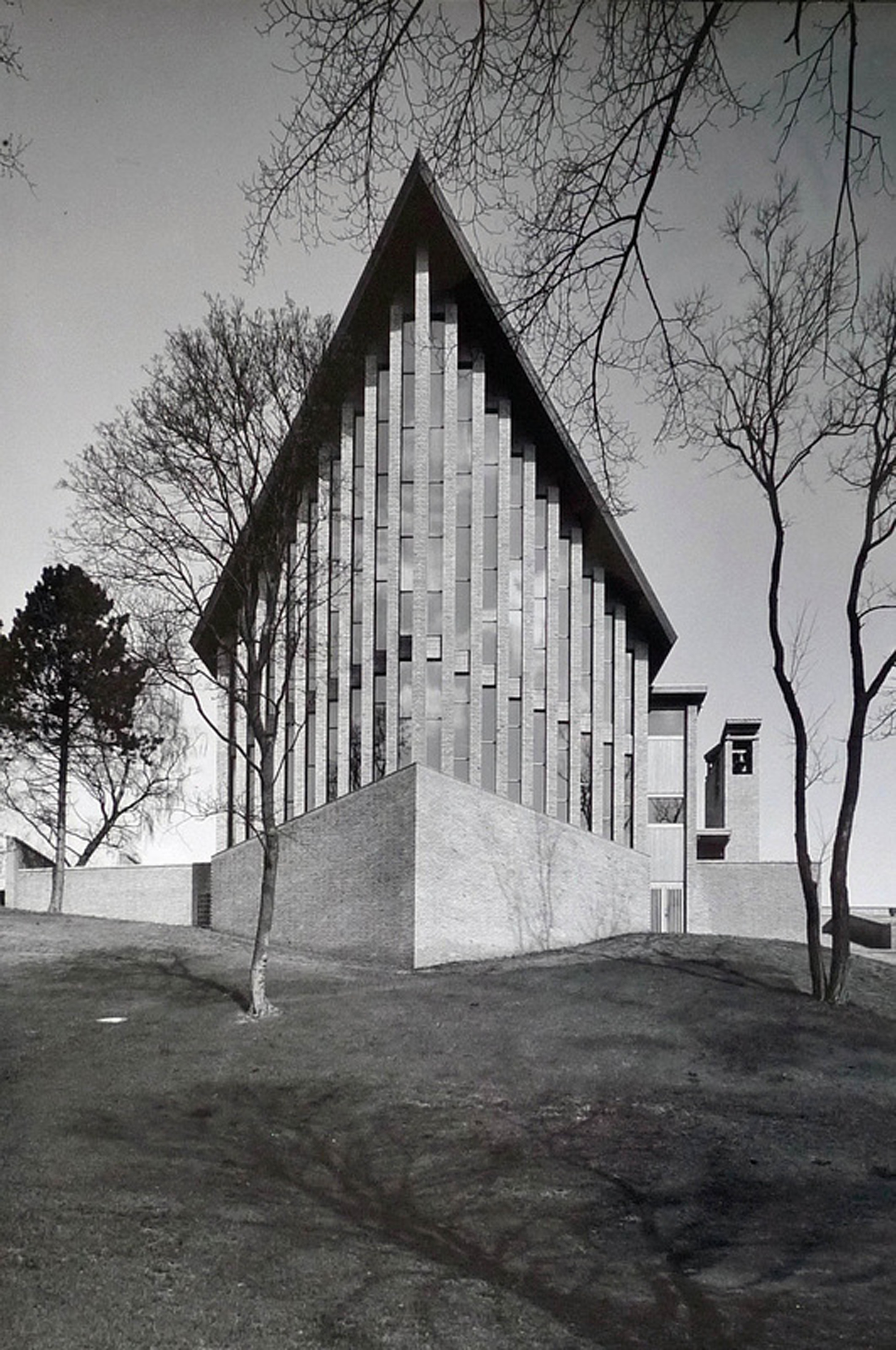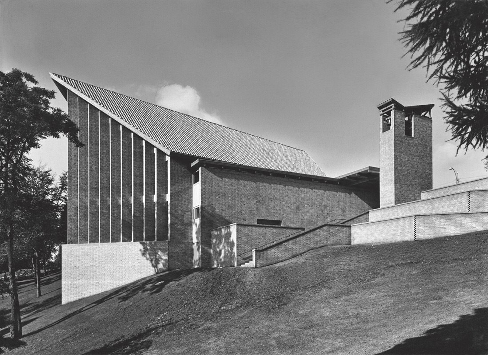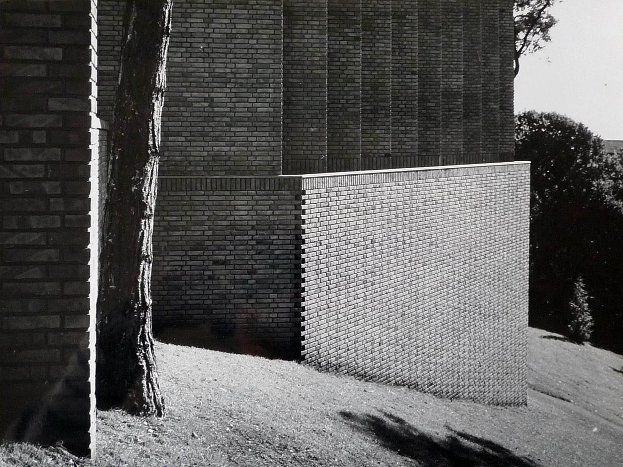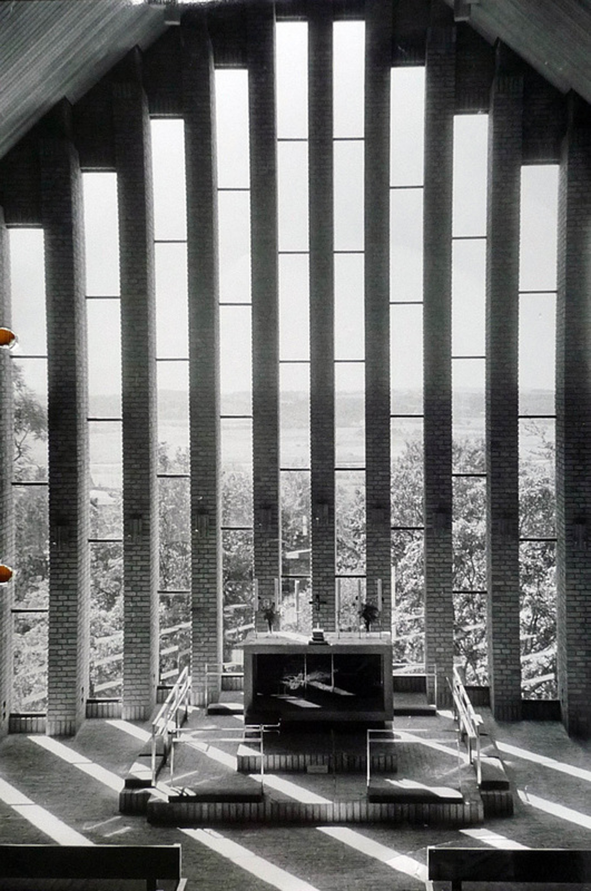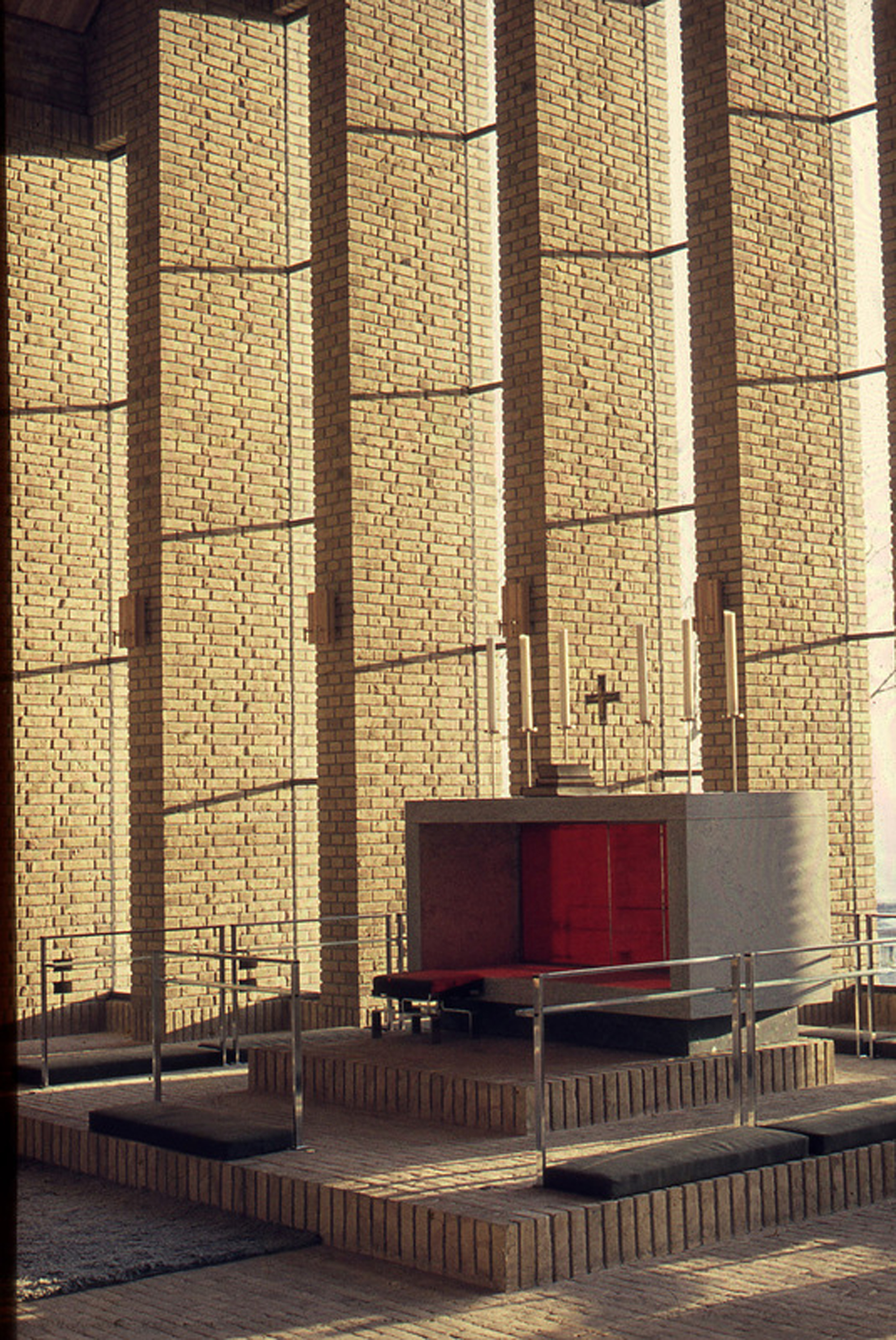 The pentagonal church space opens behind the altar towards a magnificent view. Yellow brick is used everywhere, for walls, floors, benches, the lower part of the organ and the altar elevation. Likewise, the priest’s door between the sacristy and the church room.“