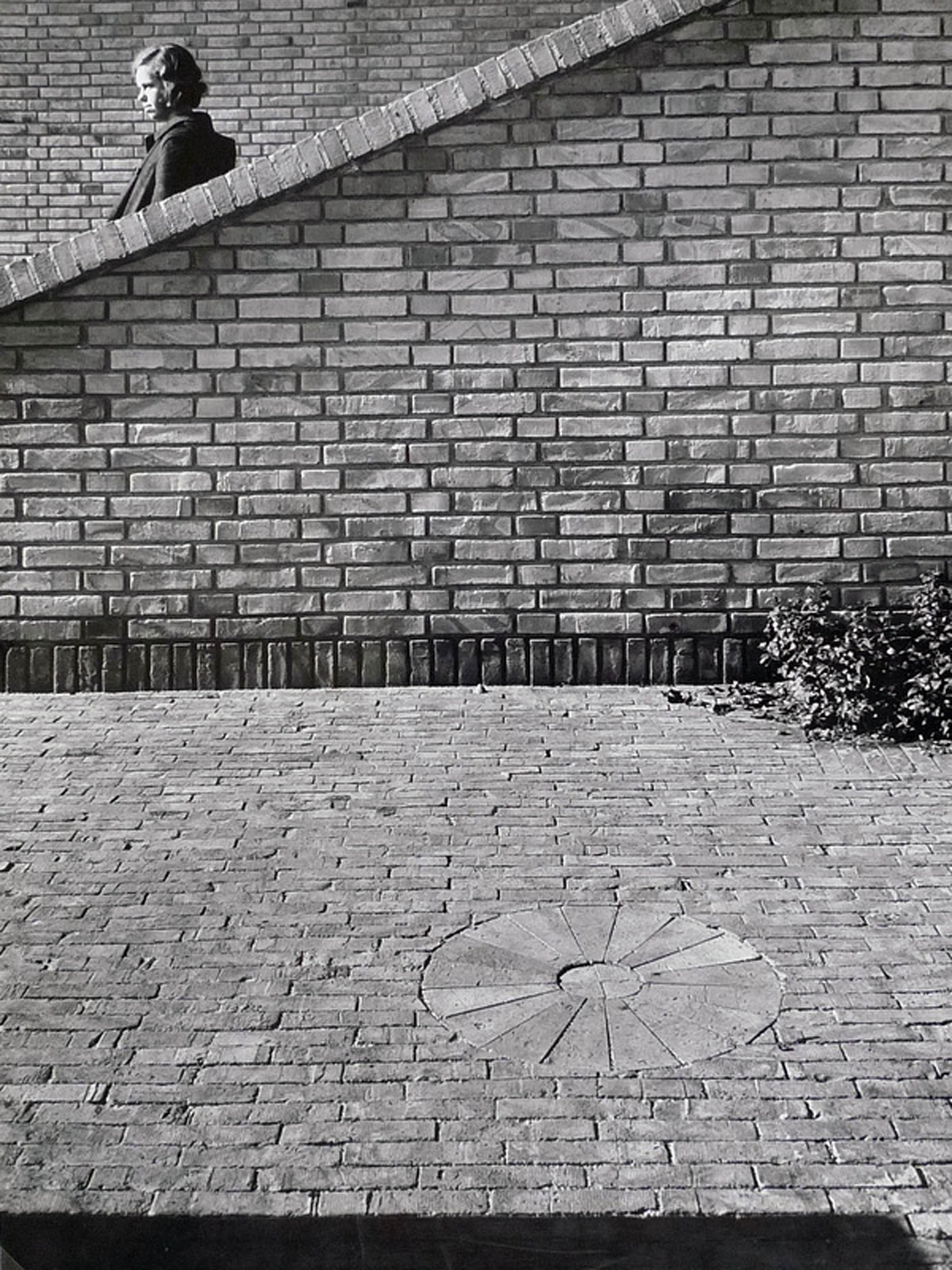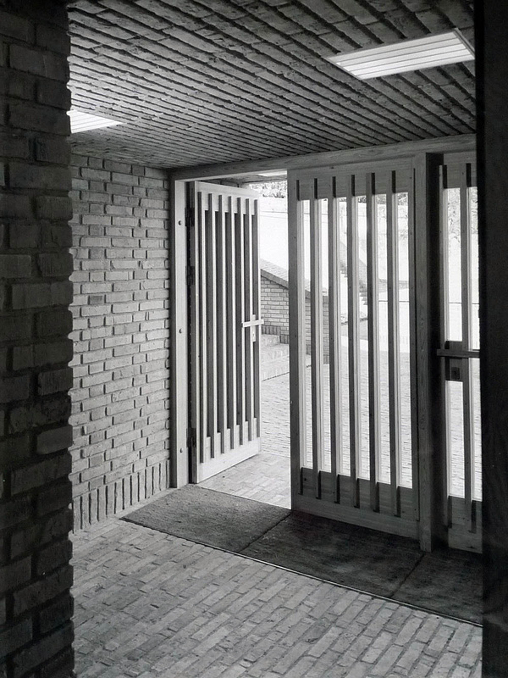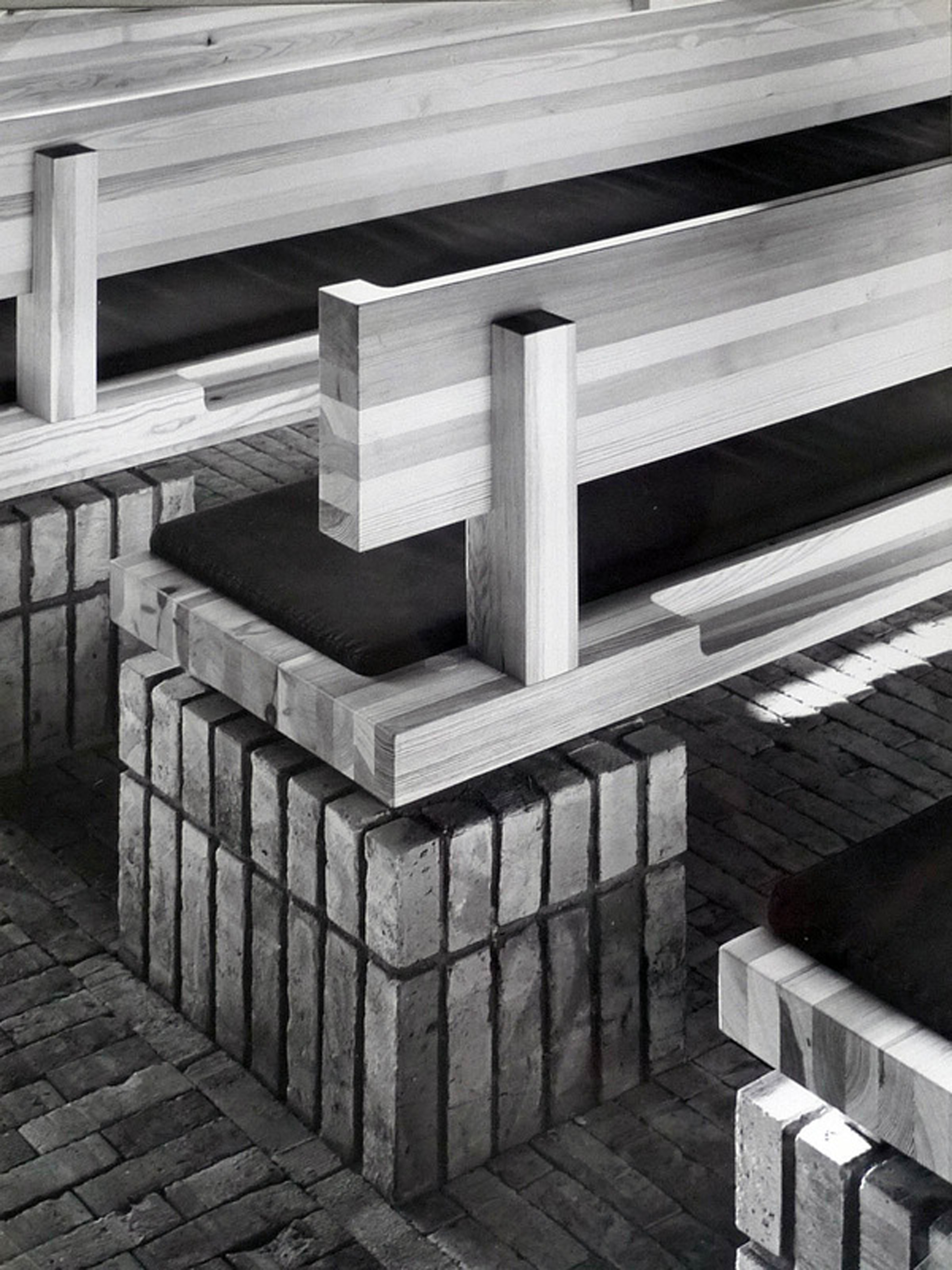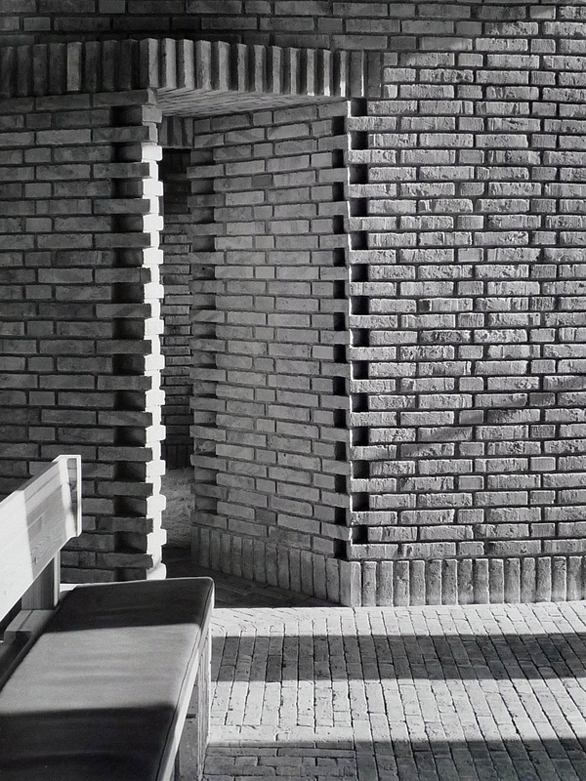 The pentagonal church space opens behind the altar towards a magnificent view. Yellow brick is used everywhere, for walls, floors, benches, the lower part of the organ and the altar elevation. Likewise, the priest’s door between the sacristy and the church room.“