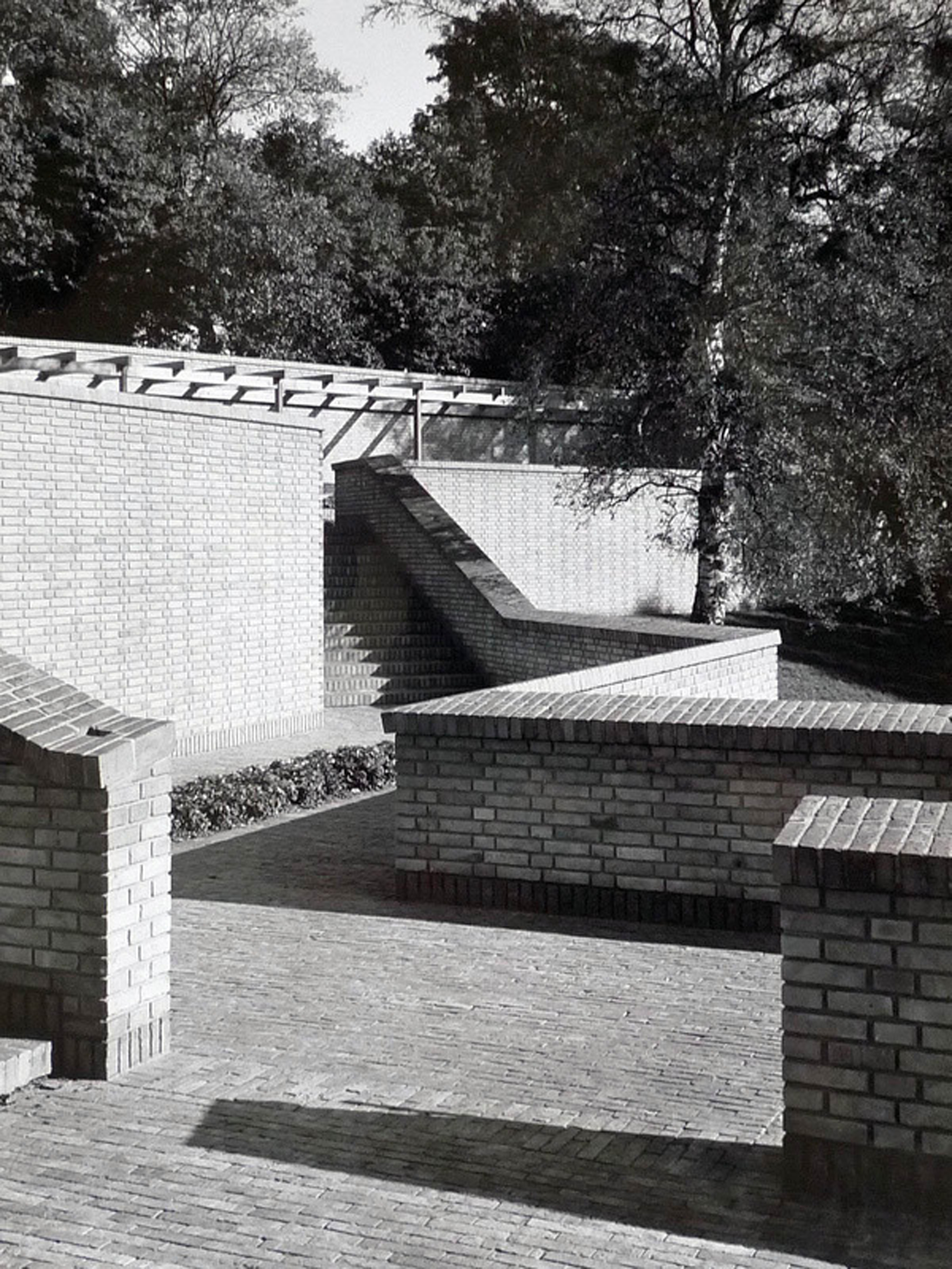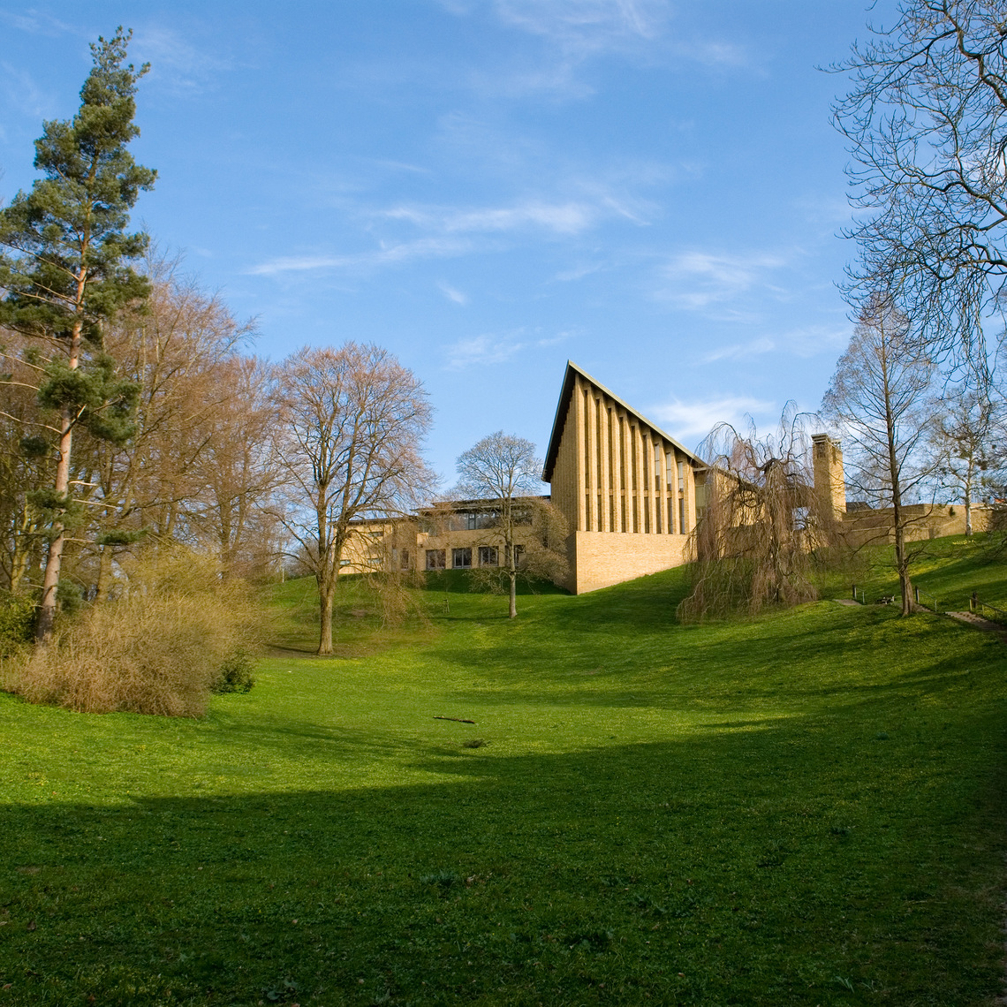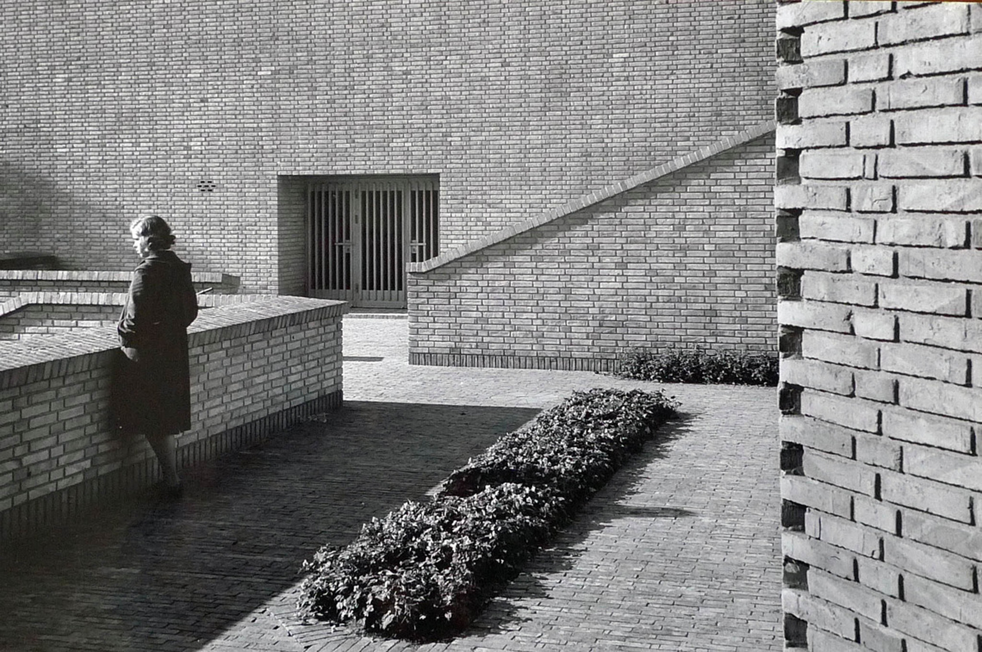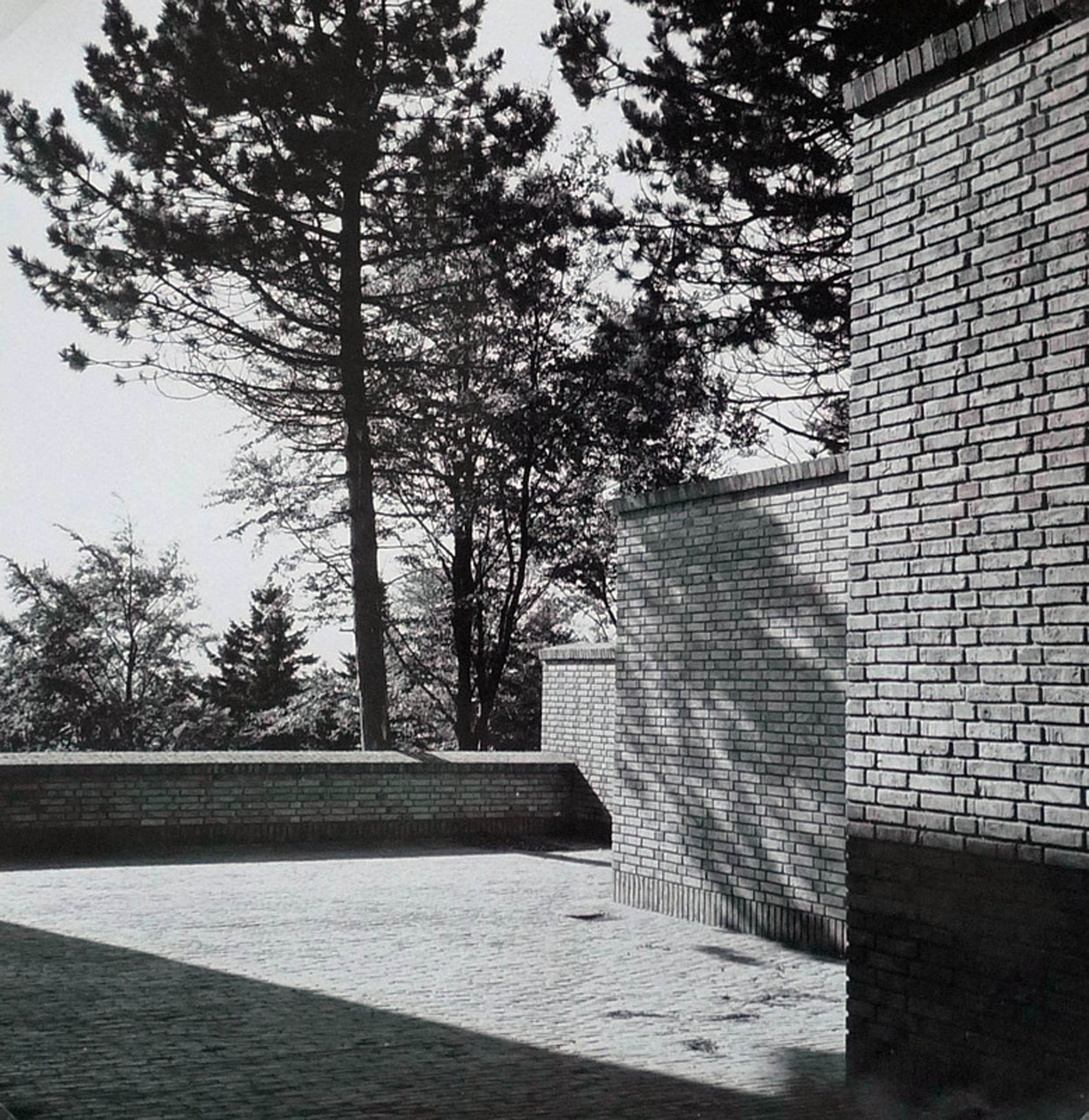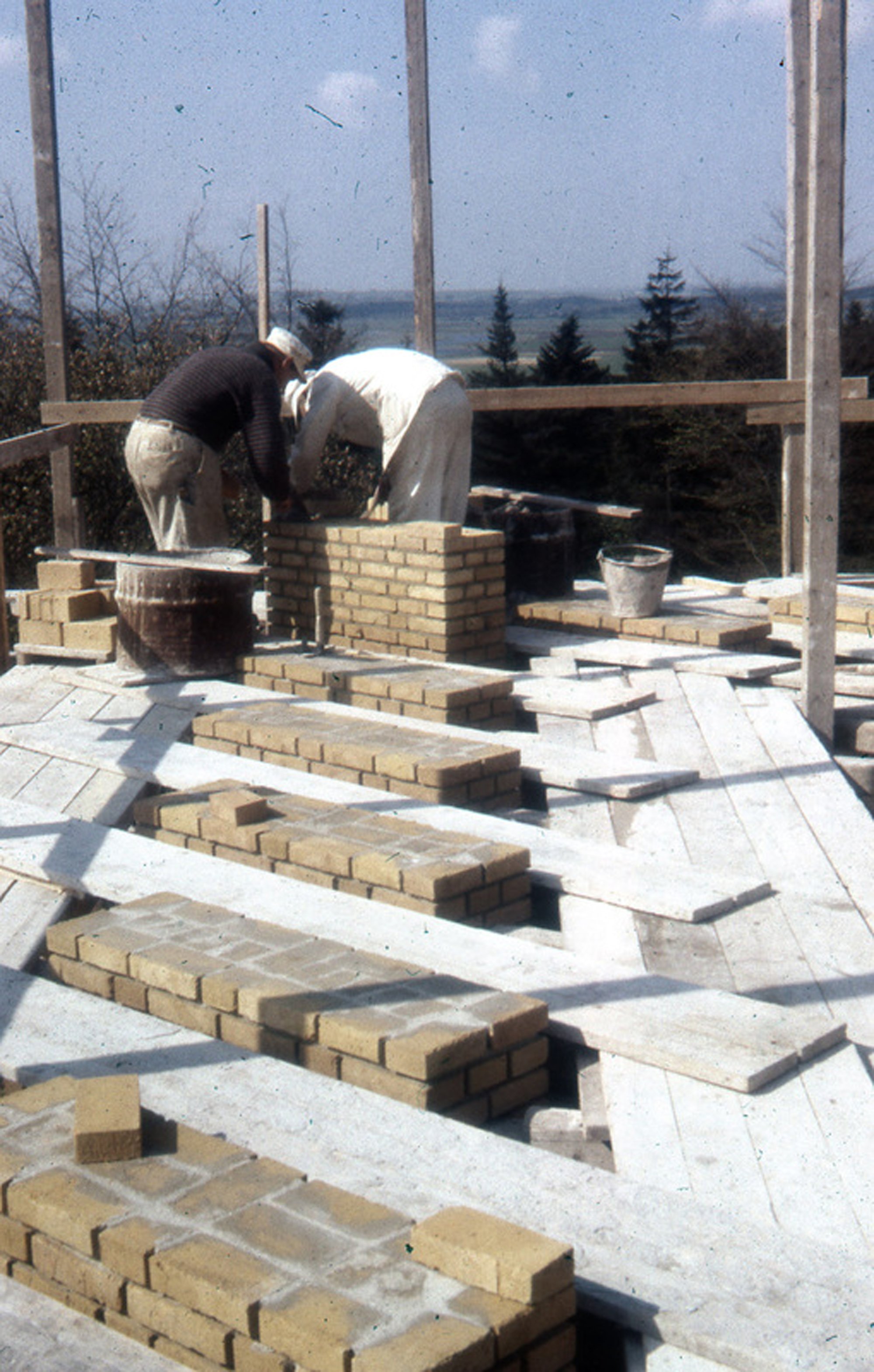 The pentagonal church space opens behind the altar towards a magnificent view. Yellow brick is used everywhere, for walls, floors, benches, the lower part of the organ and the altar elevation. Likewise, the priest’s door between the sacristy and the church room.“