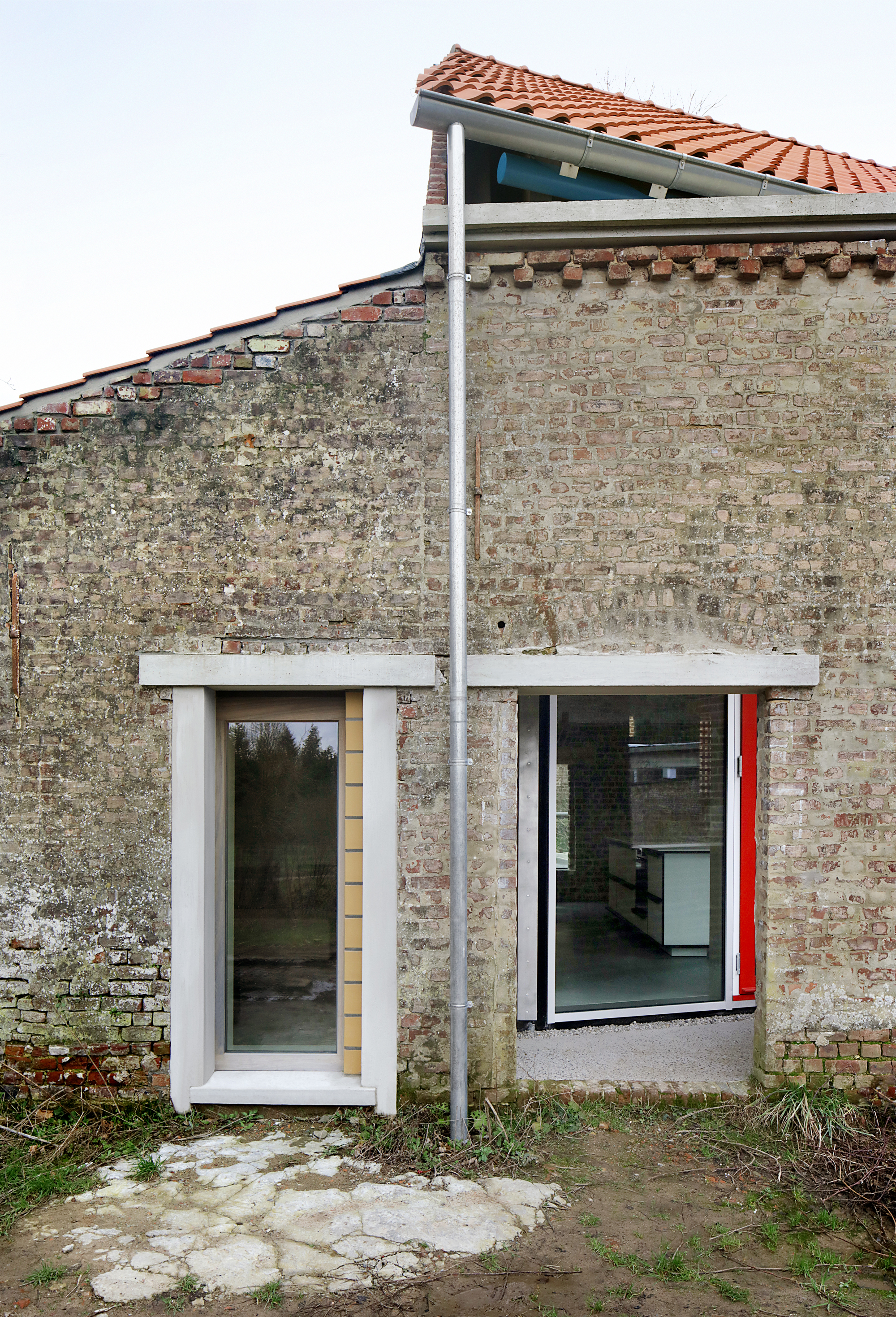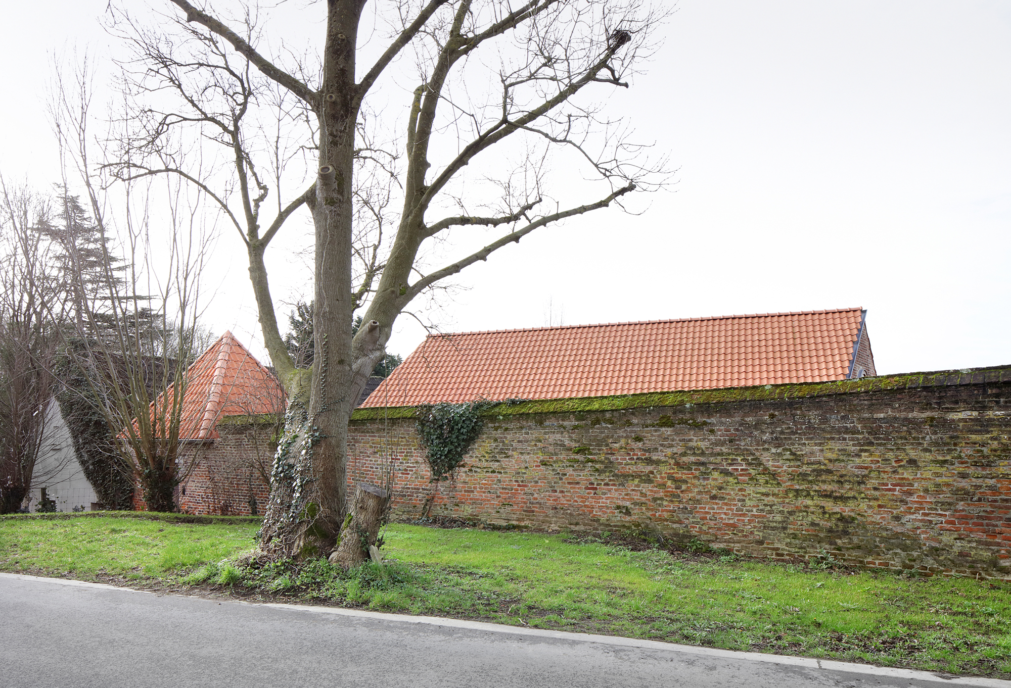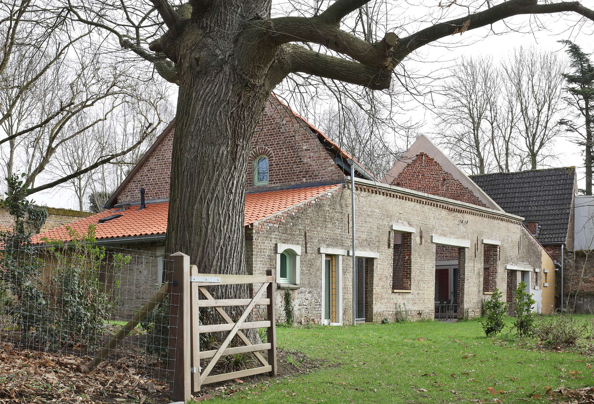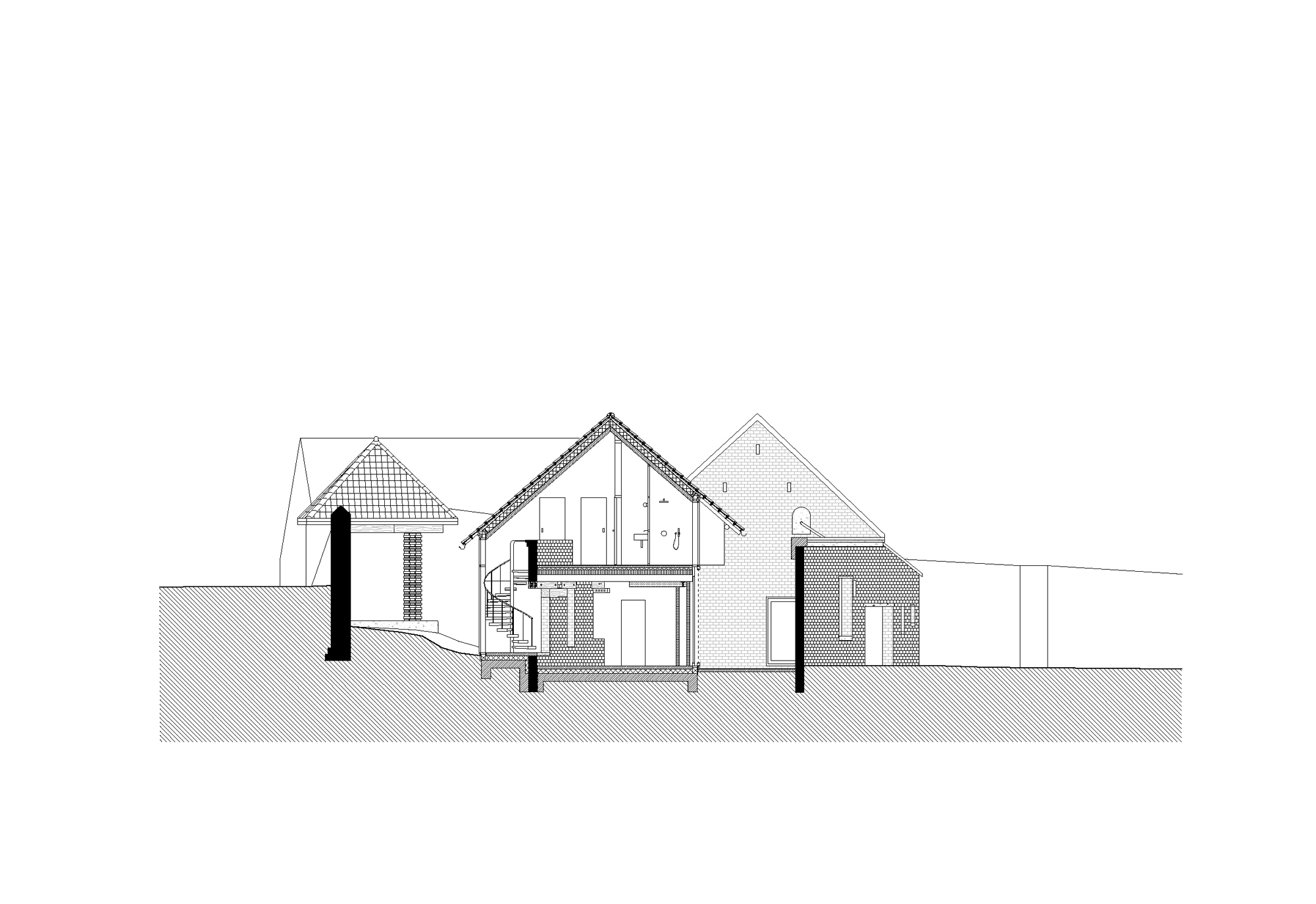 On the site of the former Wivina monastery in Groot-Bijgaarden, on the border of the walled property, stood a dilapidated tenant house. A single story house with a gable roof and small outbuildings. An accompanying entrance pavilion allowed for private access through the monastery wall. The whole is part of the protected heritage site of the monastery, which had to remain intact during the renovation. At the same time, there was a need to create a distance from the walkers in the public monastery garden. The design departs from a simple gesture: the four walls of the house were preserved and restored, while one of the ends of the gable roof has been moved halfway outside the volume. In that way, a patio was created within the existing walls of the house, which created the desired distance to the public domain, and a new room was created on the other side of the house amidst the surrounding greenery.