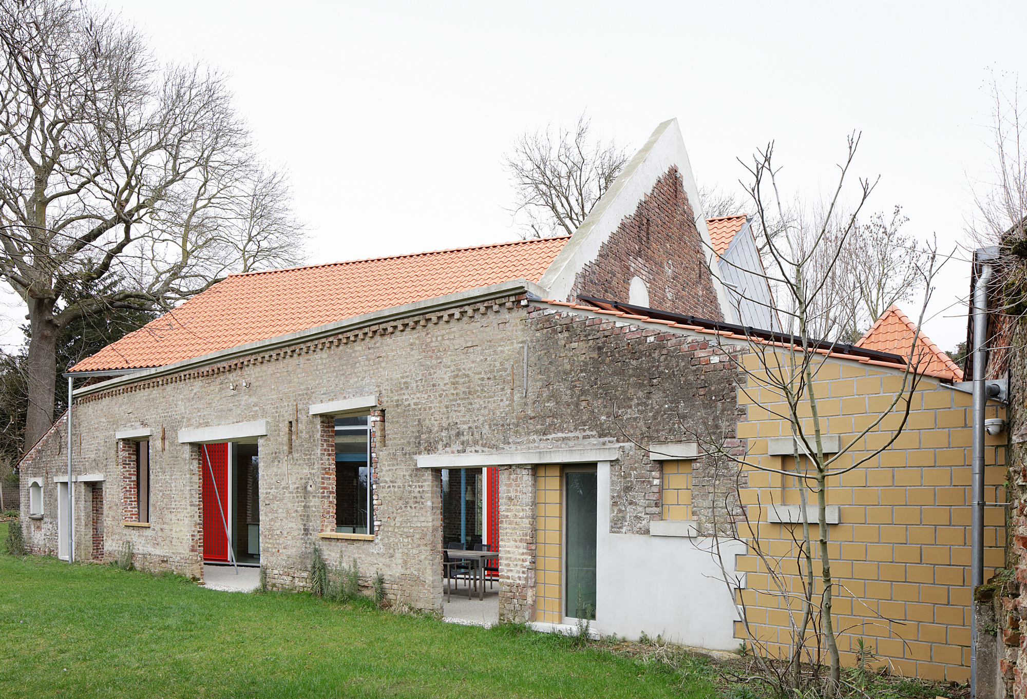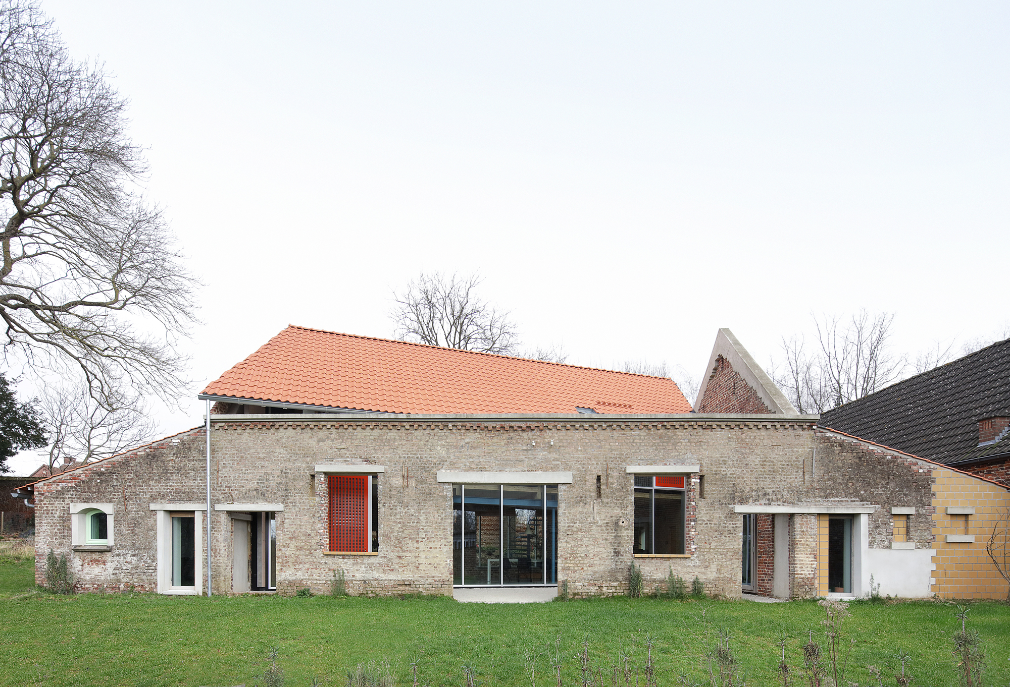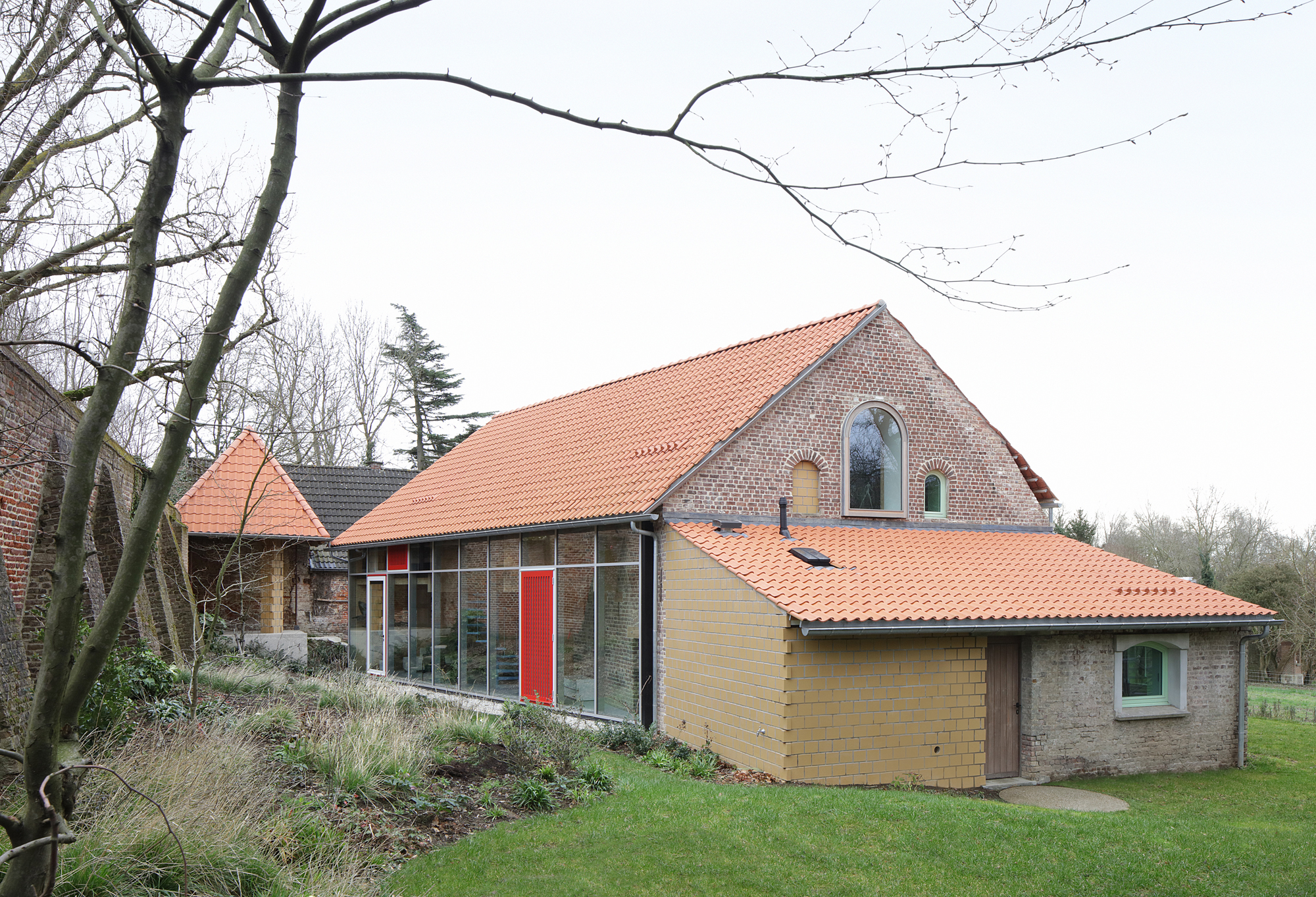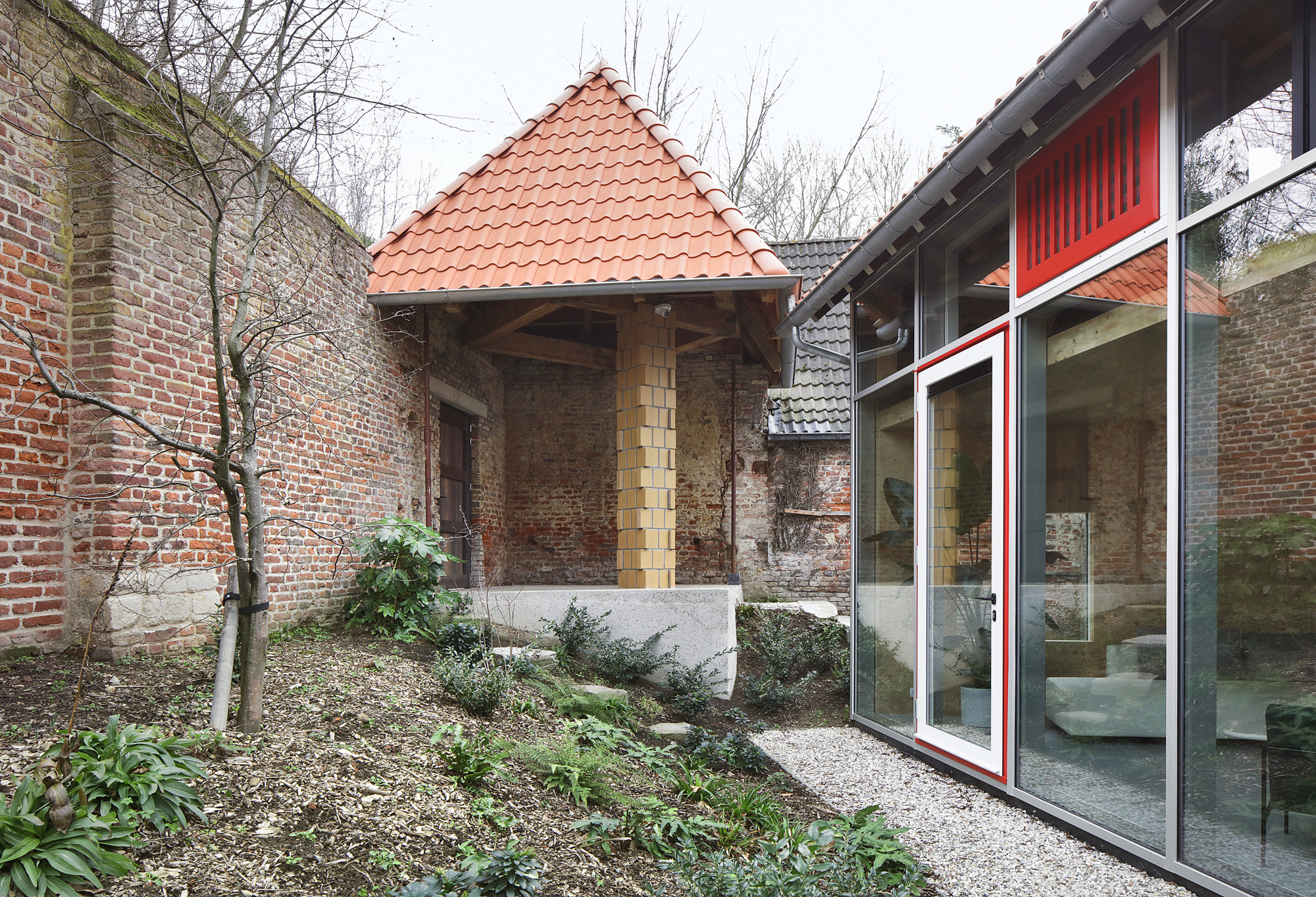 On the site of the former Wivina monastery in Groot-Bijgaarden, on the border of the walled property, stood a dilapidated tenant house. A single story house with a gable roof and small outbuildings. An accompanying entrance pavilion allowed for private access through the monastery wall. The whole is part of the protected heritage site of the monastery, which had to remain intact during the renovation. At the same time, there was a need to create a distance from the walkers in the public monastery garden. The design departs from a simple gesture: the four walls of the house were preserved and restored, while one of the ends of the gable roof has been moved halfway outside the volume. In that way, a patio was created within the existing walls of the house, which created the desired distance to the public domain, and a new room was created on the other side of the house amidst the surrounding greenery.