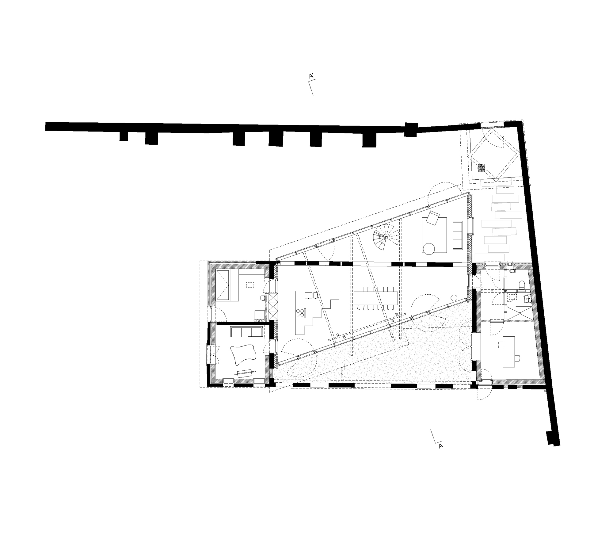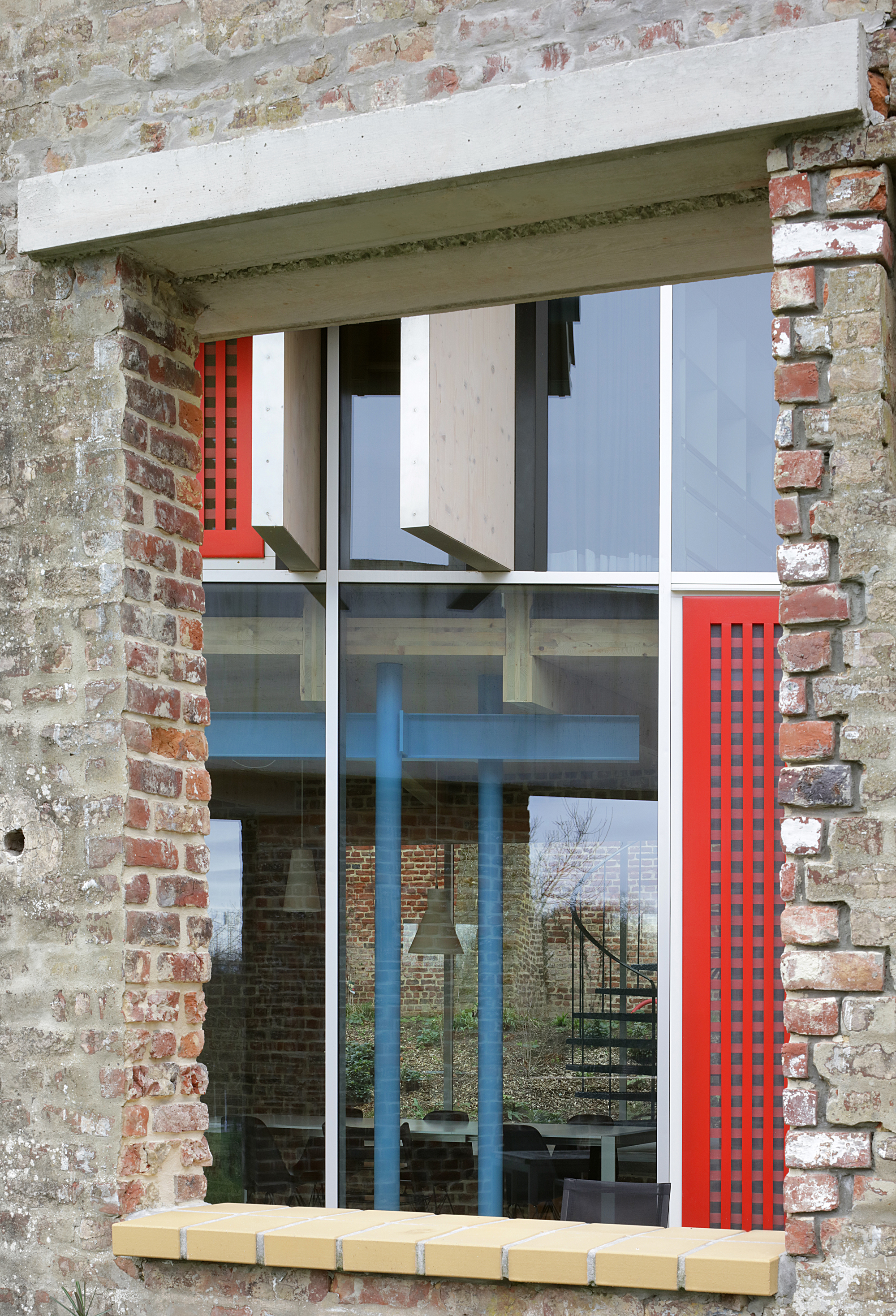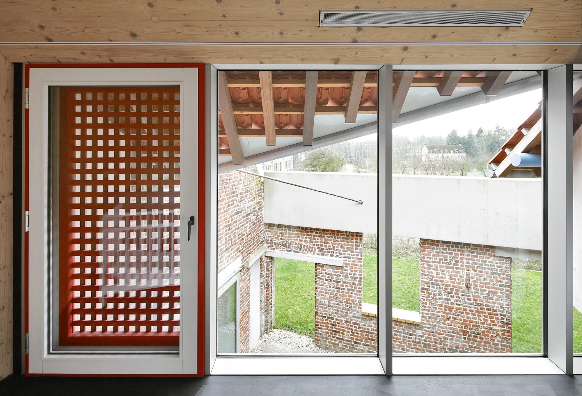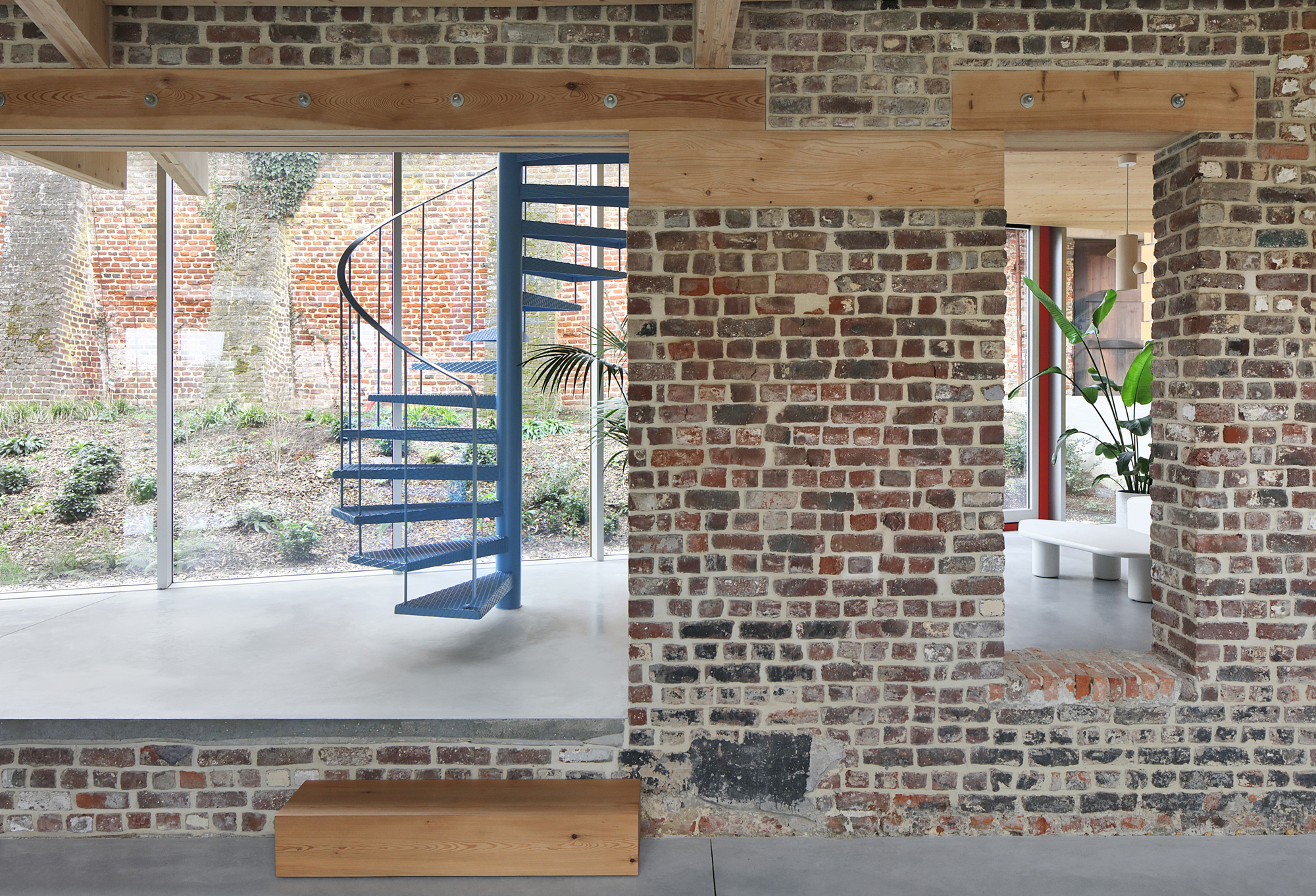 On the site of the former Wivina monastery in Groot-Bijgaarden, on the border of the walled property, stood a dilapidated tenant house. A single story house with a gable roof and small outbuildings. An accompanying entrance pavilion allowed for private access through the monastery wall. The whole is part of the protected heritage site of the monastery, which had to remain intact during the renovation. At the same time, there was a need to create a distance from the walkers in the public monastery garden. The design departs from a simple gesture: the four walls of the house were preserved and restored, while one of the ends of the gable roof has been moved halfway outside the volume. In that way, a patio was created within the existing walls of the house, which created the desired distance to the public domain, and a new room was created on the other side of the house amidst the surrounding greenery.
