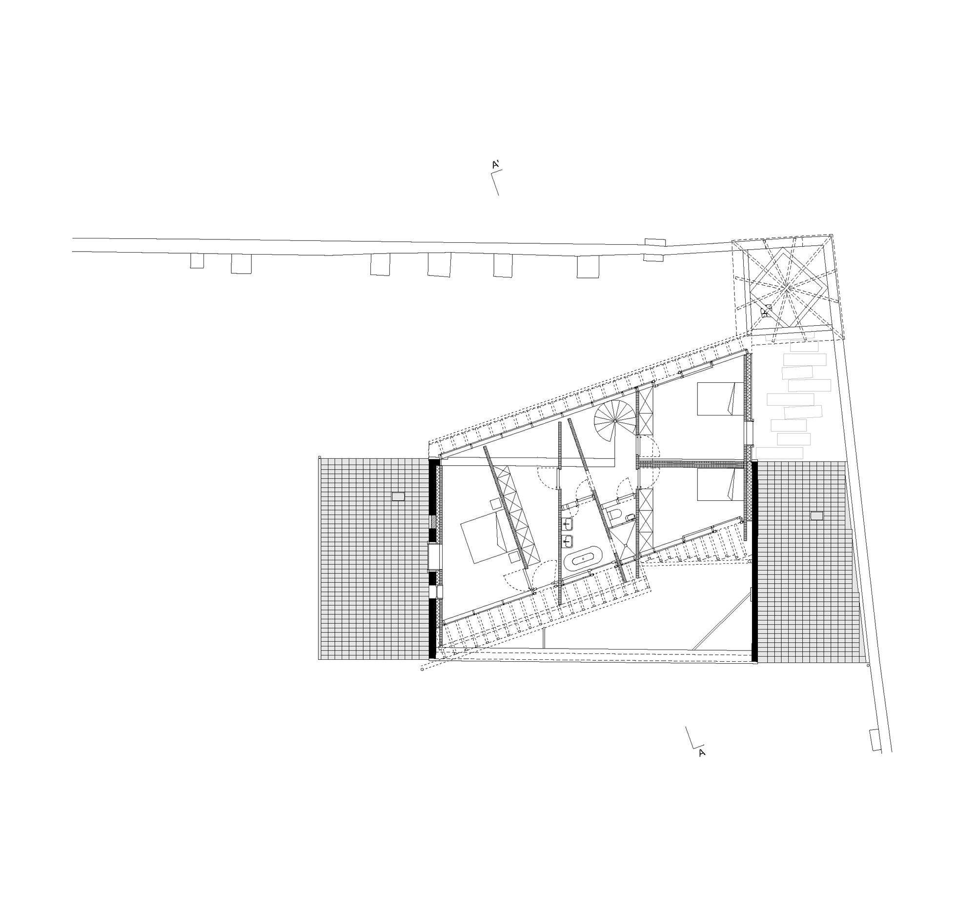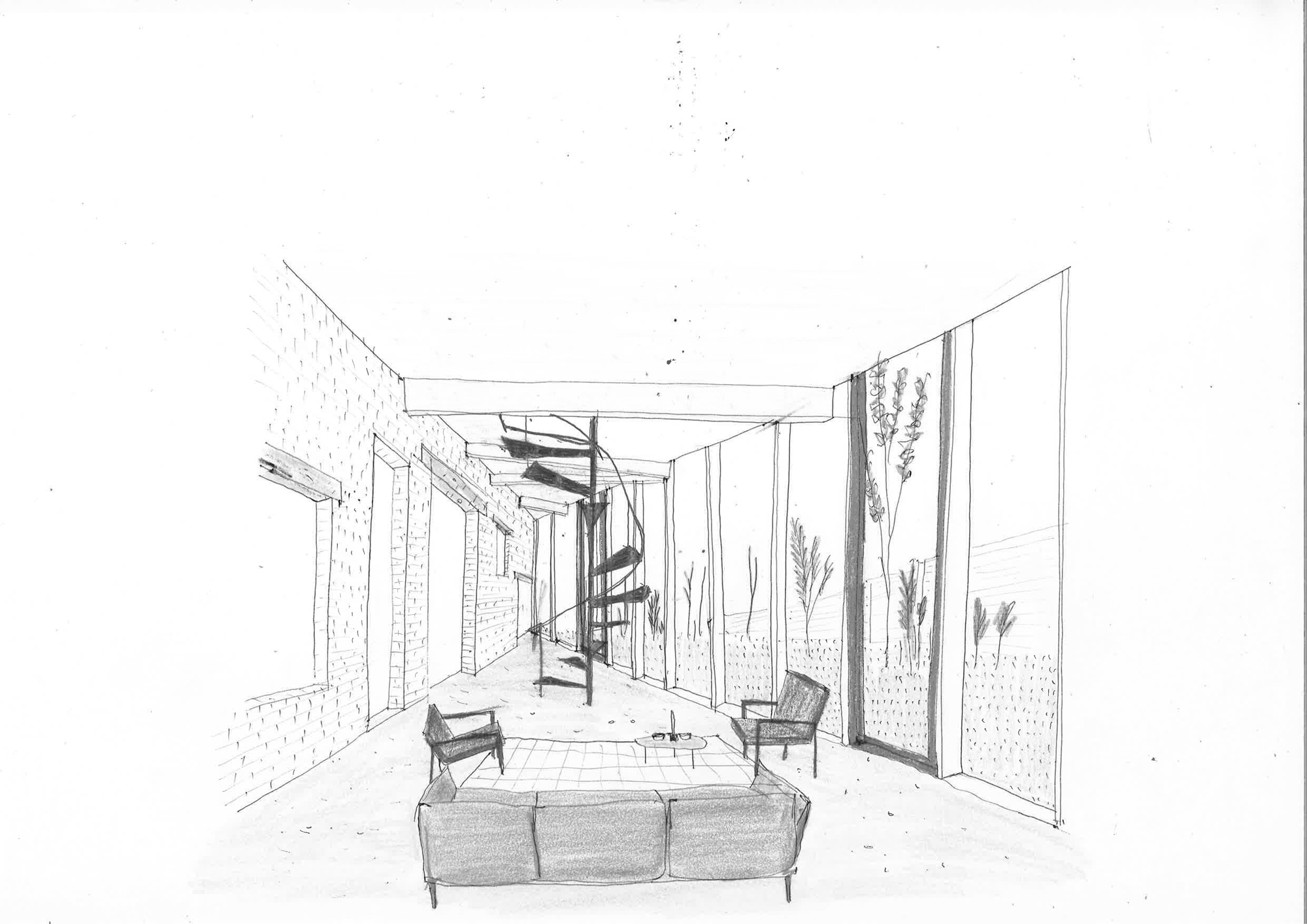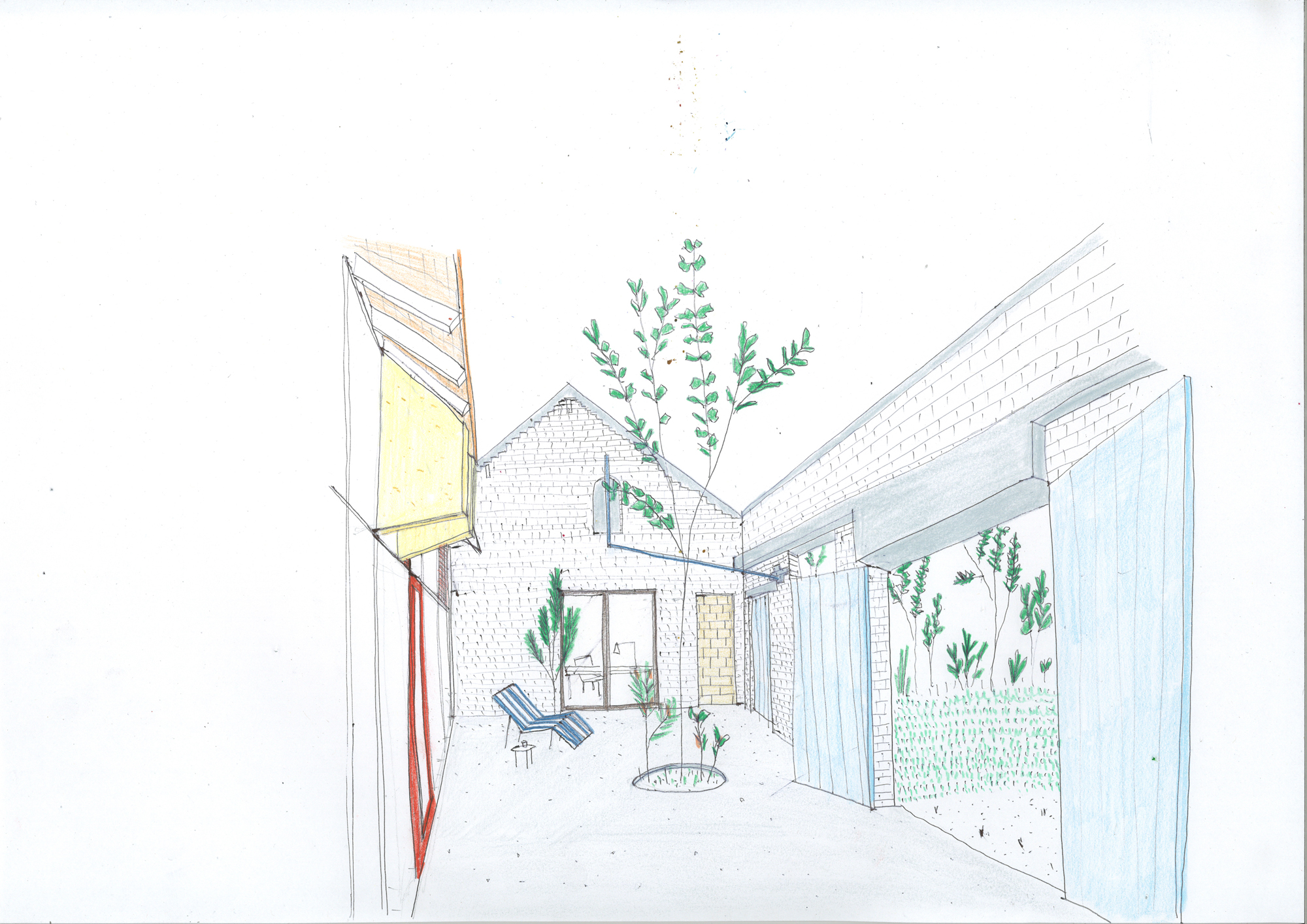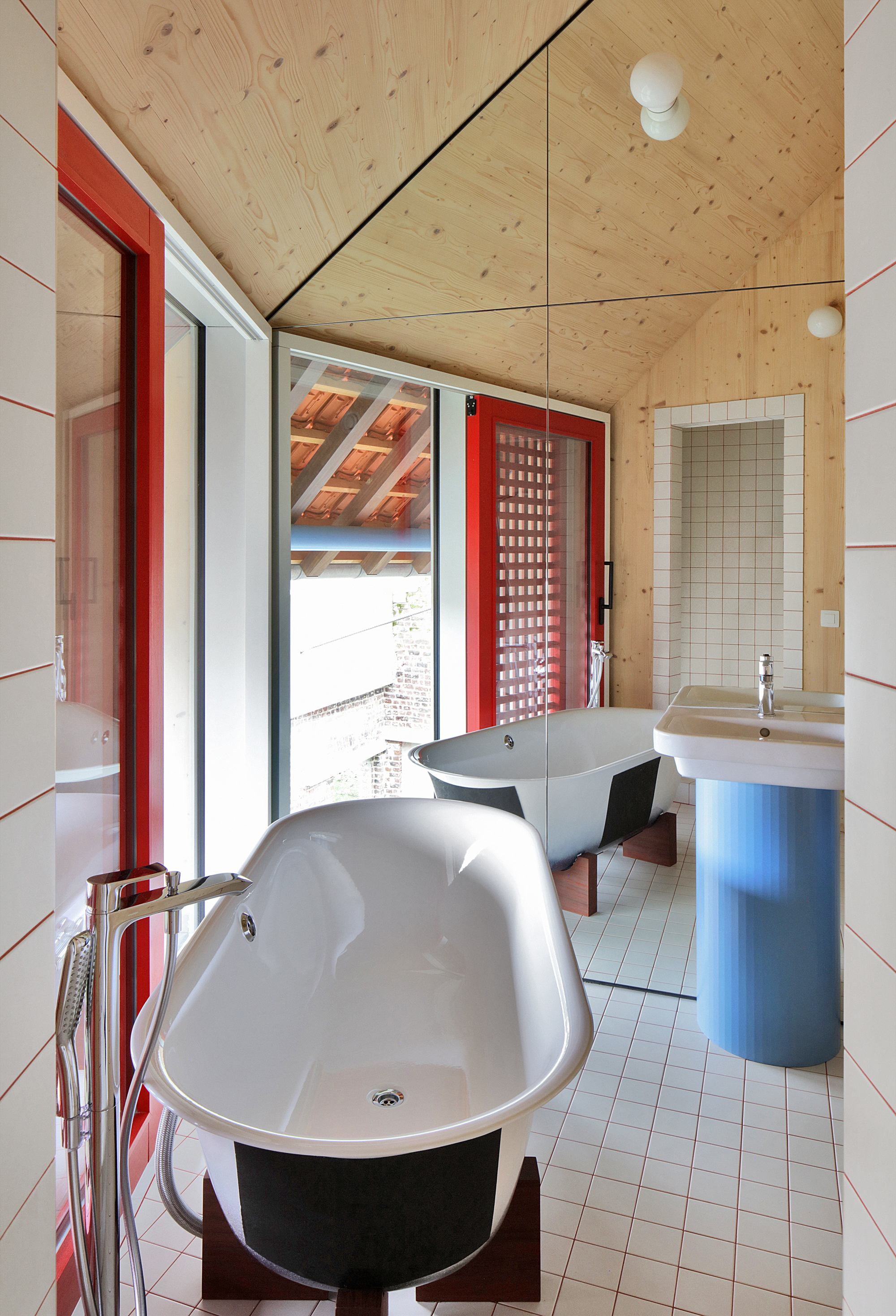 On the site of the former Wivina monastery in Groot-Bijgaarden, on the border of the walled property, stood a dilapidated tenant house. A single story house with a gable roof and small outbuildings. An accompanying entrance pavilion allowed for private access through the monastery wall. The whole is part of the protected heritage site of the monastery, which had to remain intact during the renovation. At the same time, there was a need to create a distance from the walkers in the public monastery garden. The design departs from a simple gesture: the four walls of the house were preserved and restored, while one of the ends of the gable roof has been moved halfway outside the volume. In that way, a patio was created within the existing walls of the house, which created the desired distance to the public domain, and a new room was created on the other side of the house amidst the surrounding greenery.