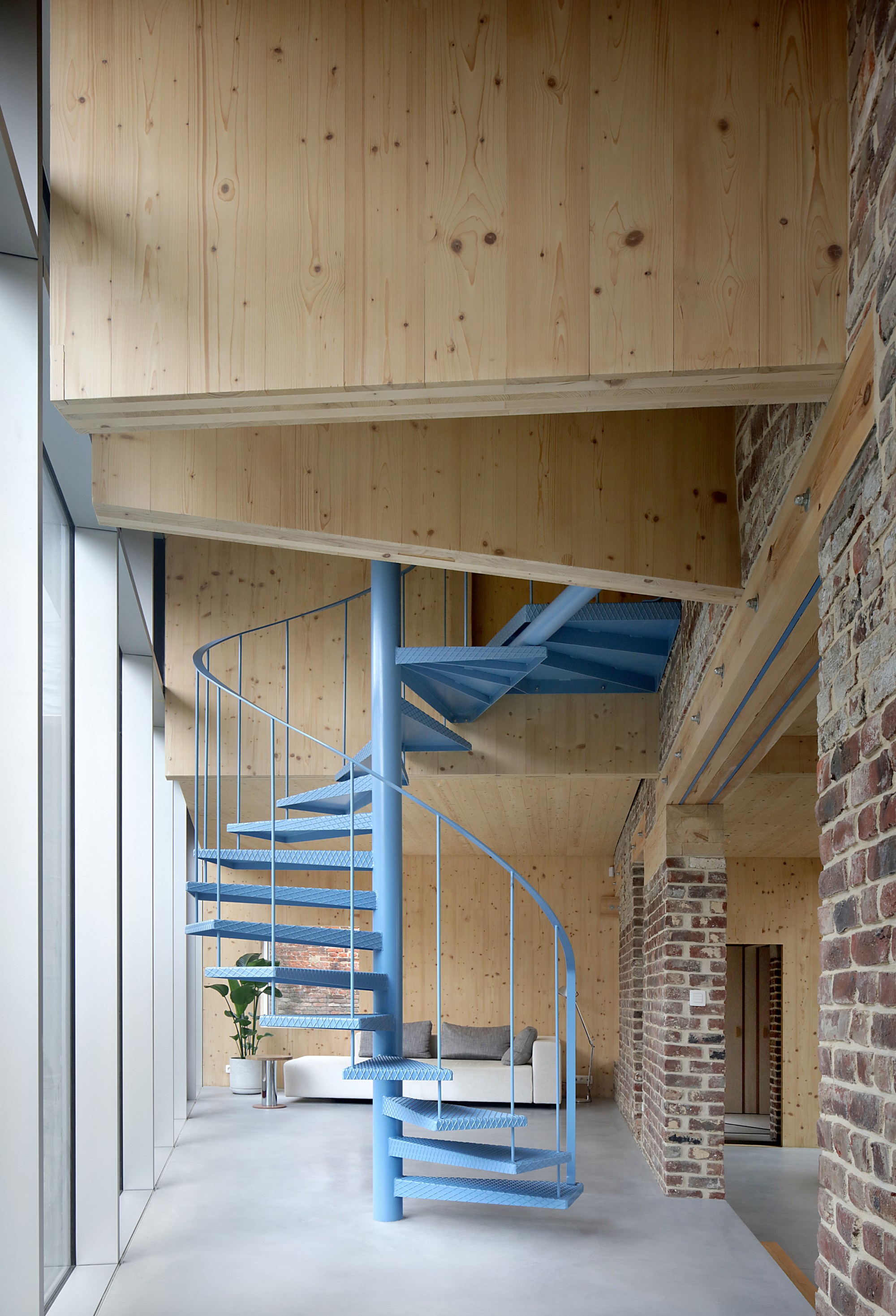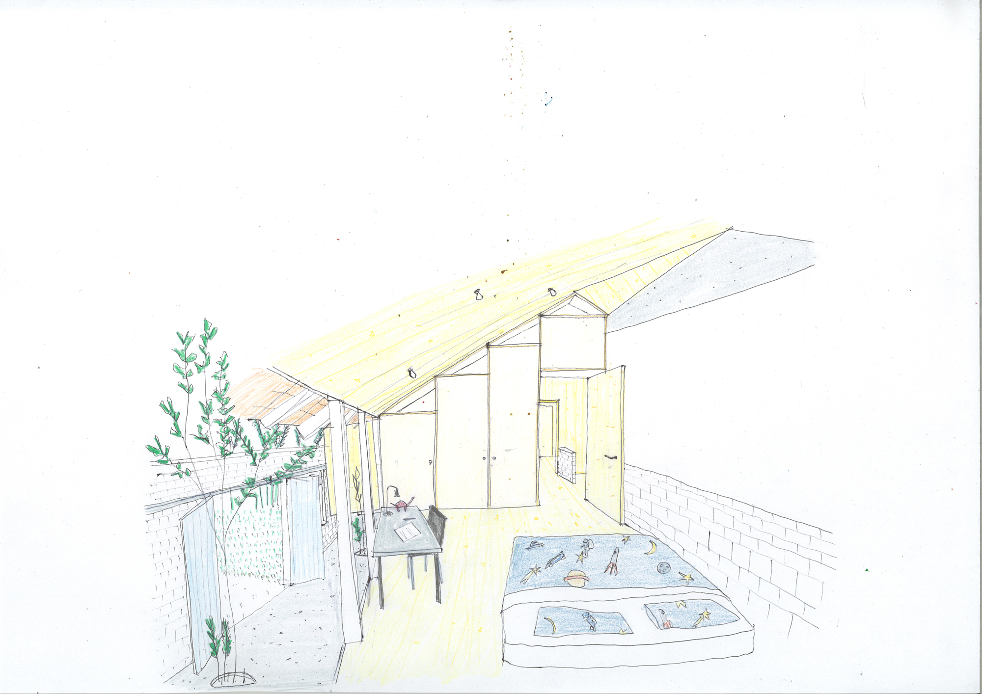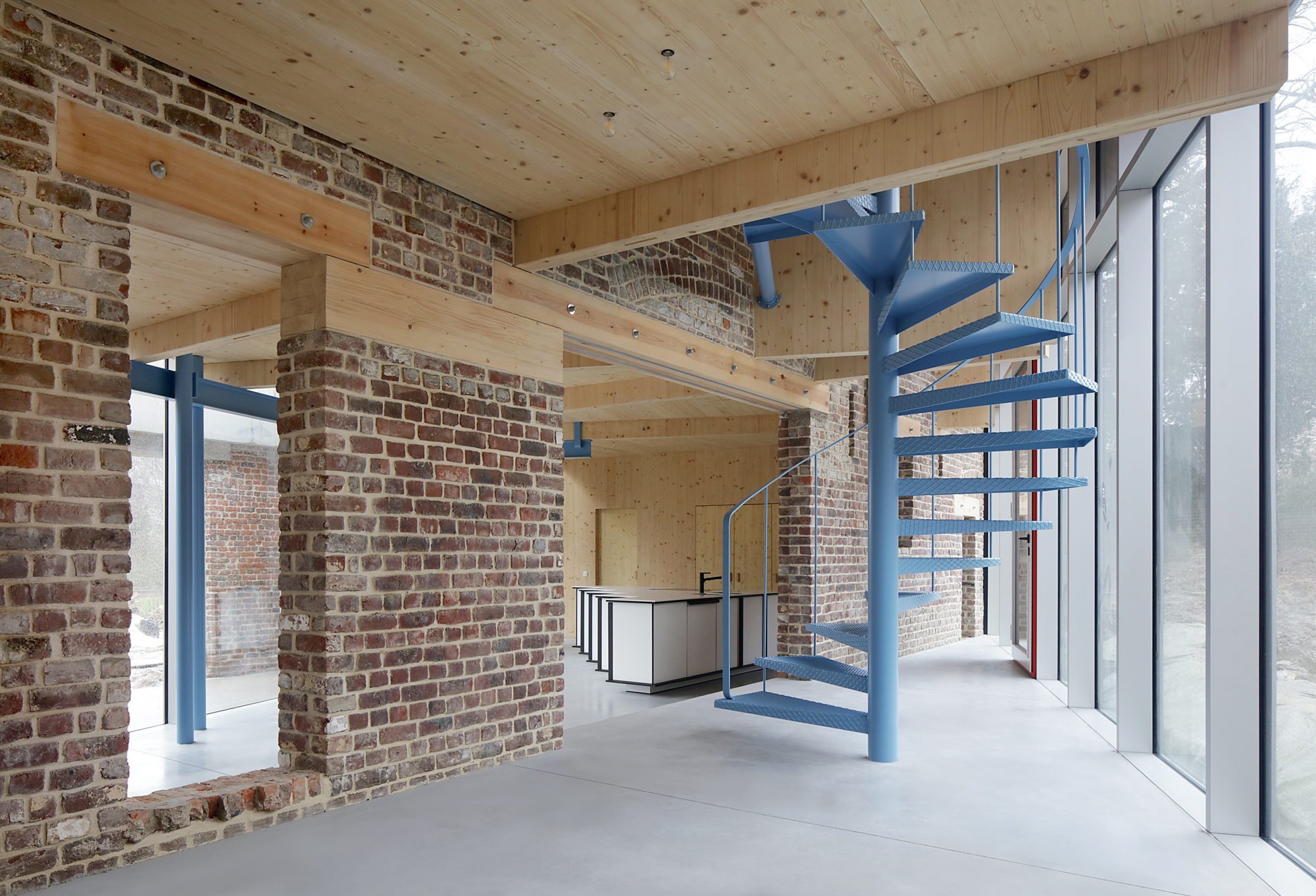 Whereas the starting point of the renovation is a seemingly simple gesture, it simultaneously results in a nuanced weiterbauen on the existing tenant house. The new plan of the house is marked by the old wall that became an inner wall and in that way becomes a defining element for the arrangement of rooms on the ground floor, with on the one side a kitchen, and a living room on the other. The new roof structure is made of wooden clt-panels, which also divide the spaces on the first floor. The finishing of the roof consists of conventional roof tiles, which, however, are placed diagonally as a result of the shift. On the other hand, the entrance pavilion and the outbuildings have been adapted with yellow bricks, which are only recognizable as new materials up close. The gesture with which the house was given a new life thus remains virtually invisible to passers-by: the gable roof remains a gable roof, on top of the old walls.