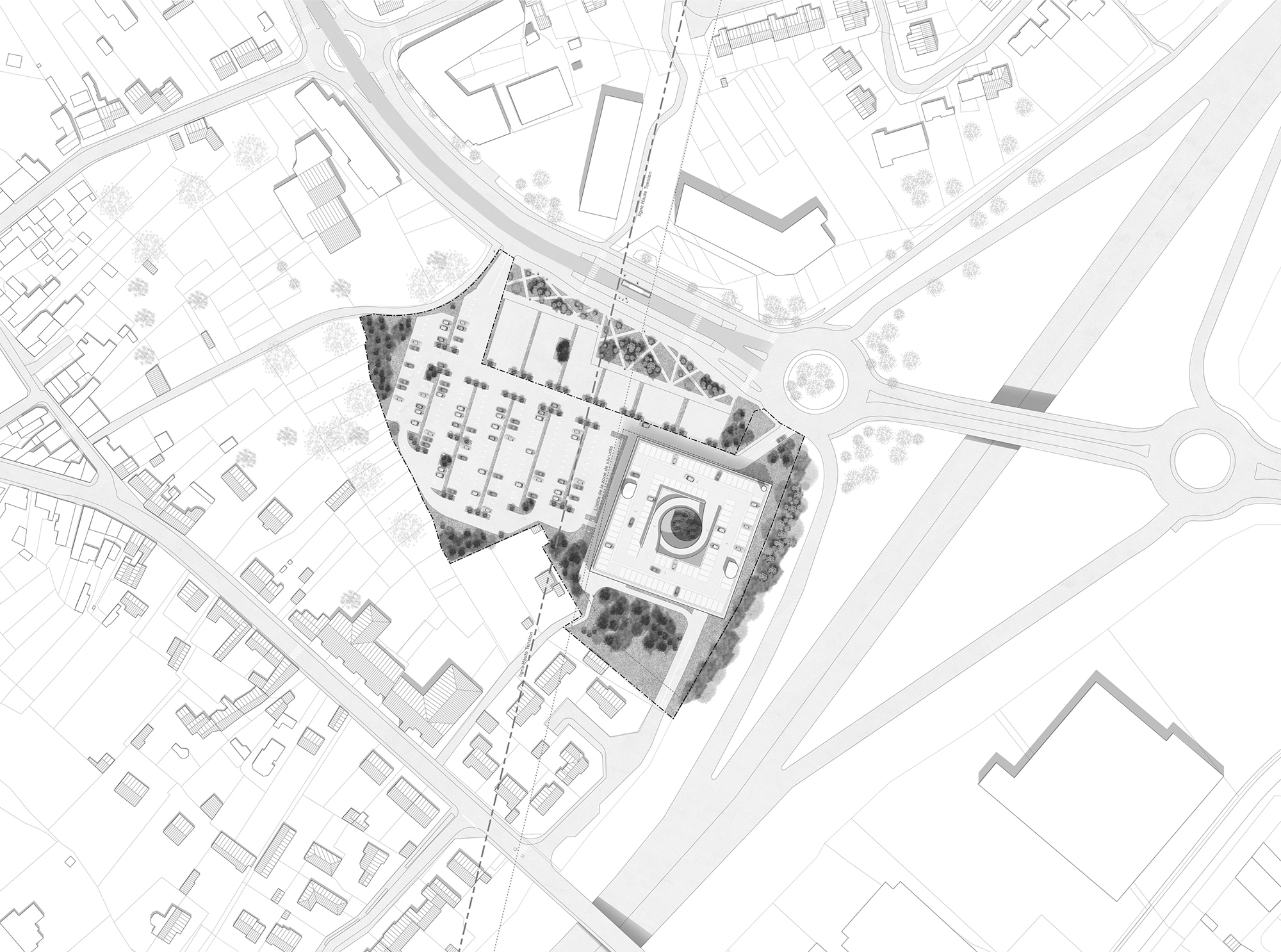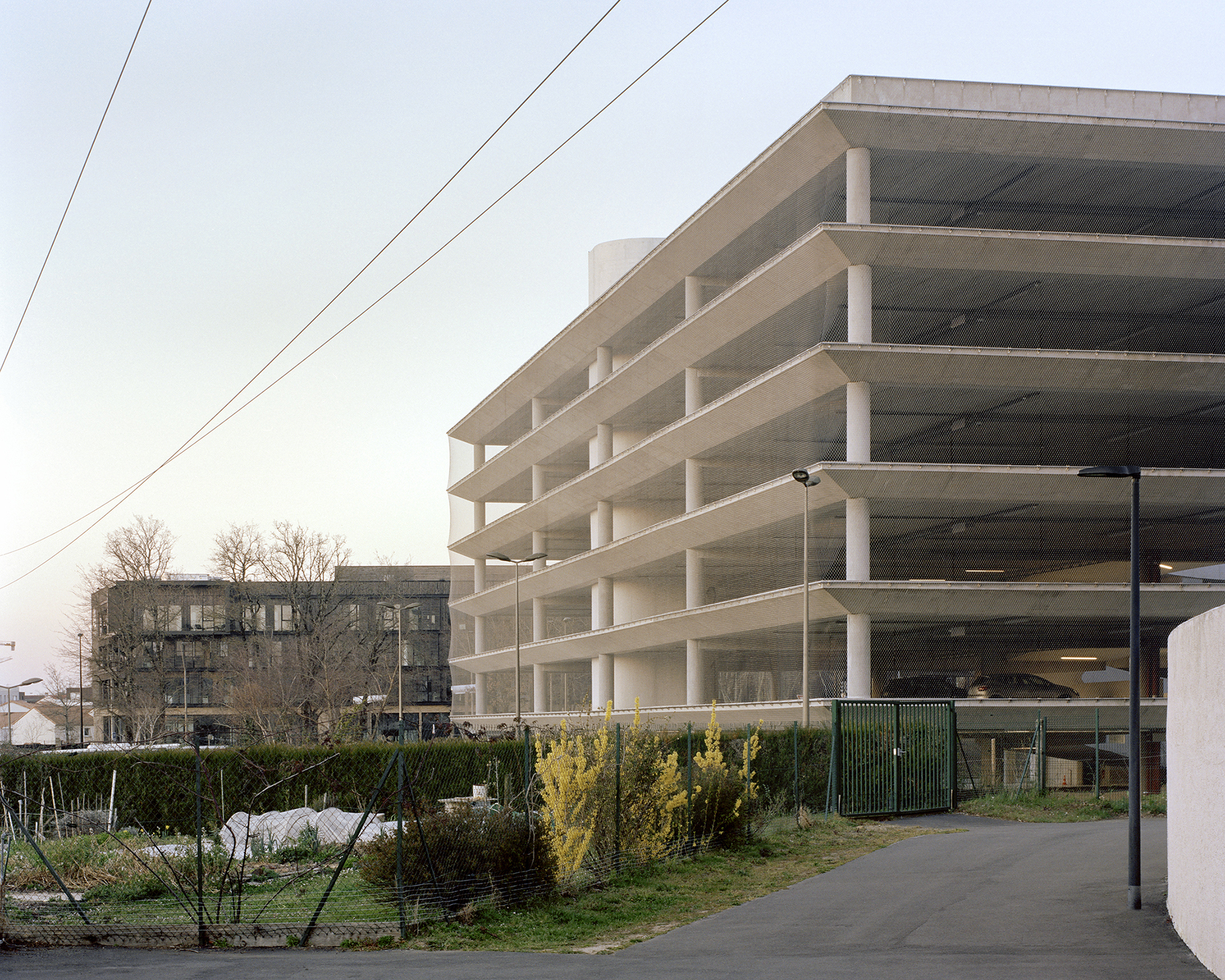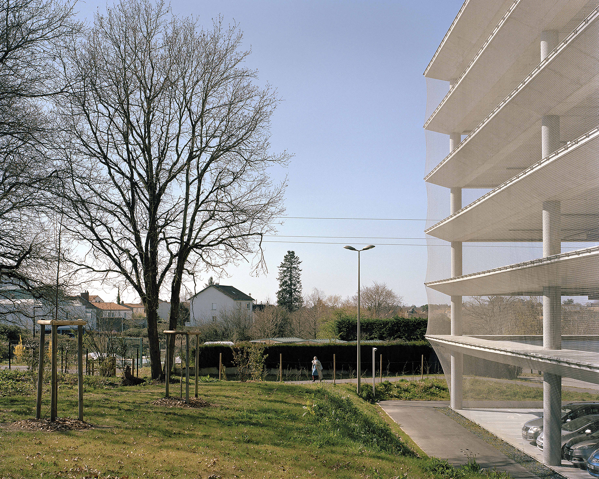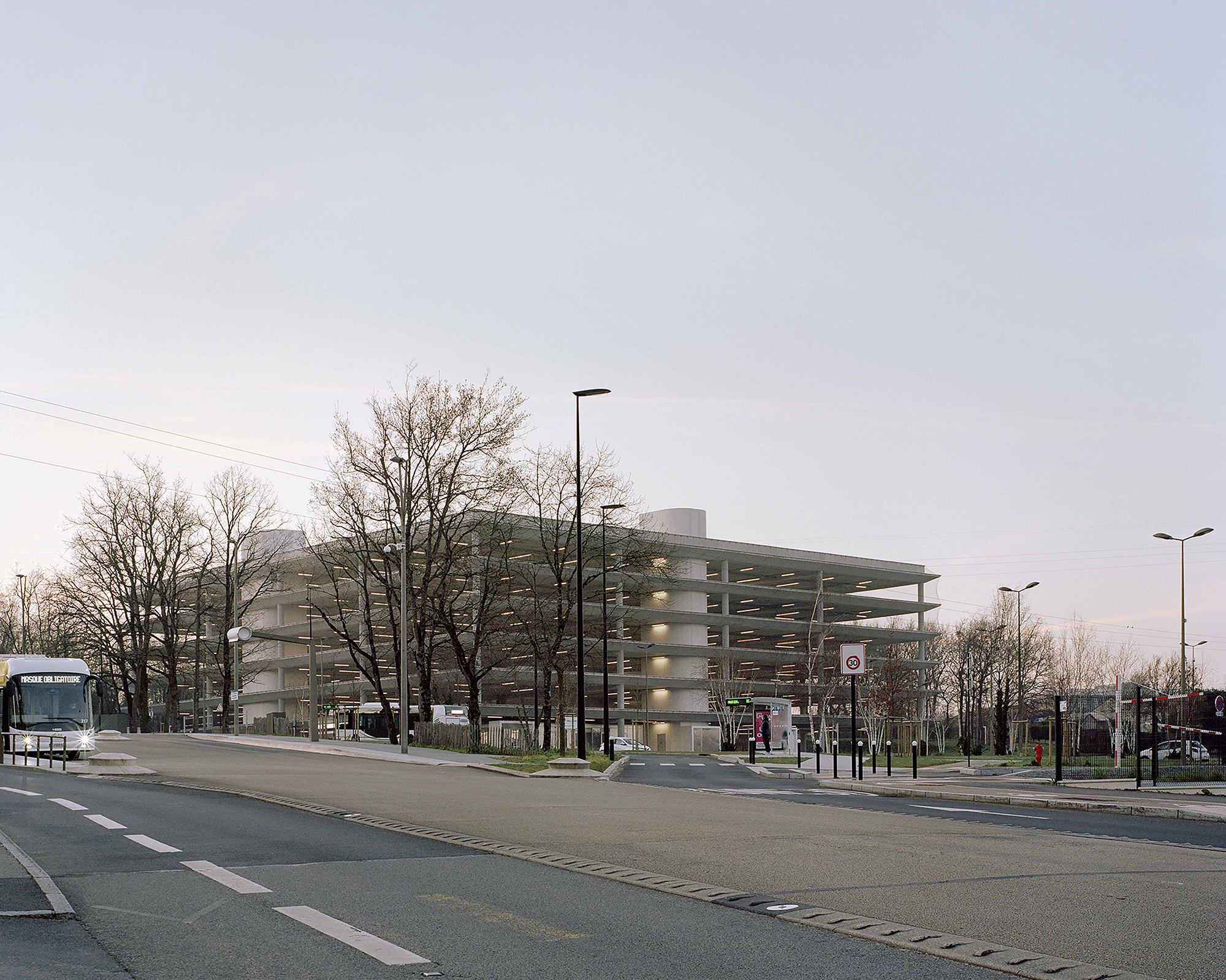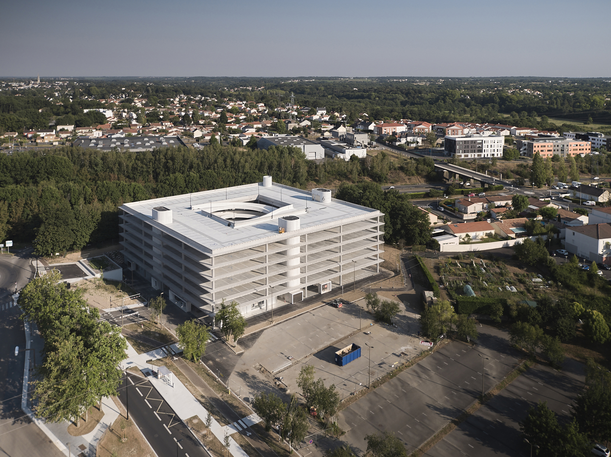 Six overlapping 62-meter-wide squares, wrapped in a light and sleek metal mesh, form the park-and-ride facility of the Porte de Vertou, the south-eastern entrance to the city of Nantes.