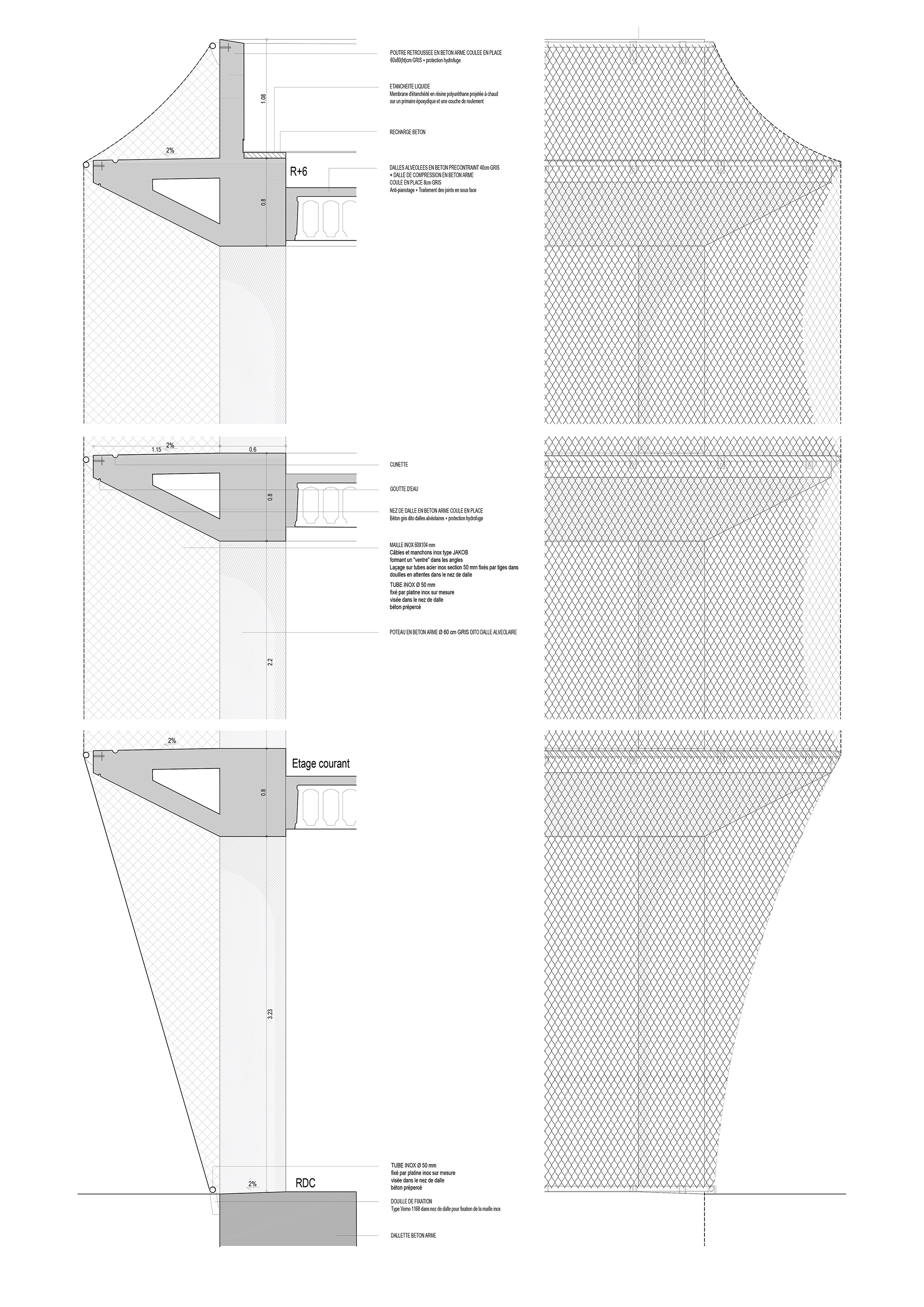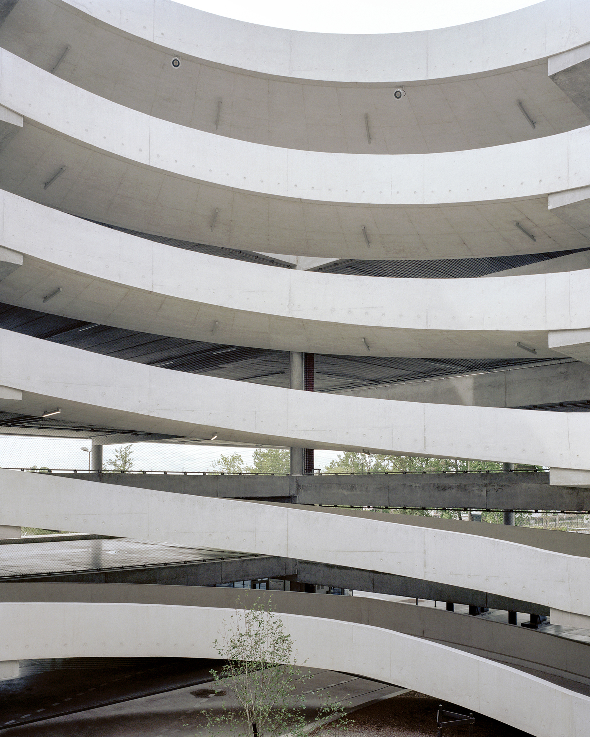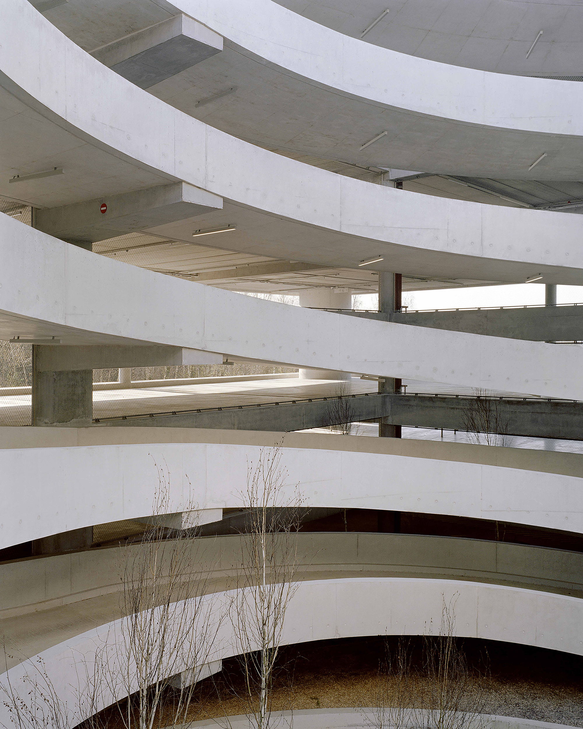 A circular hollow space at the core of the building rises along the six floors. Two Chambord-style spiral ramps wind their way from the ground floor up to the top, creating an efficient and elegant means managing the different types of flows.