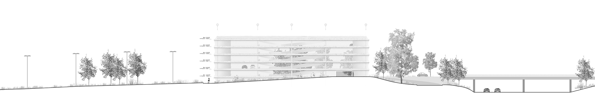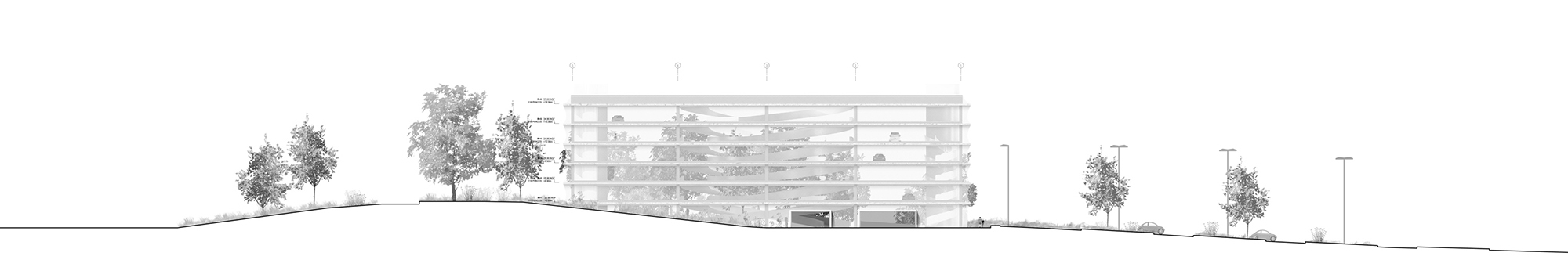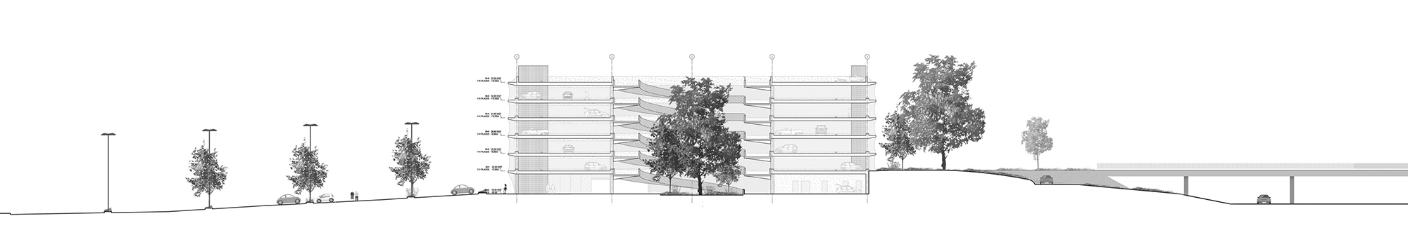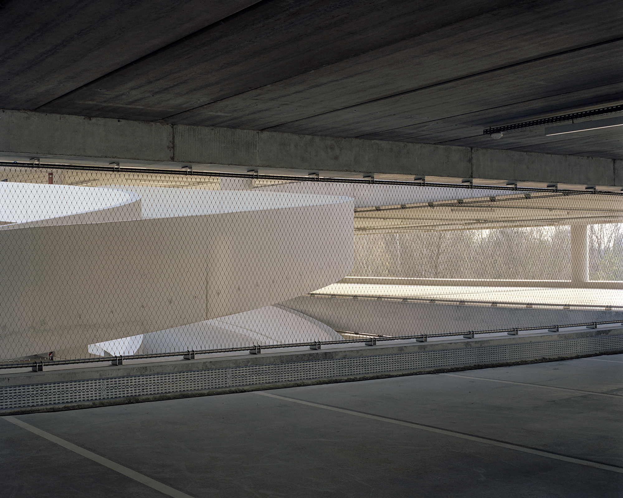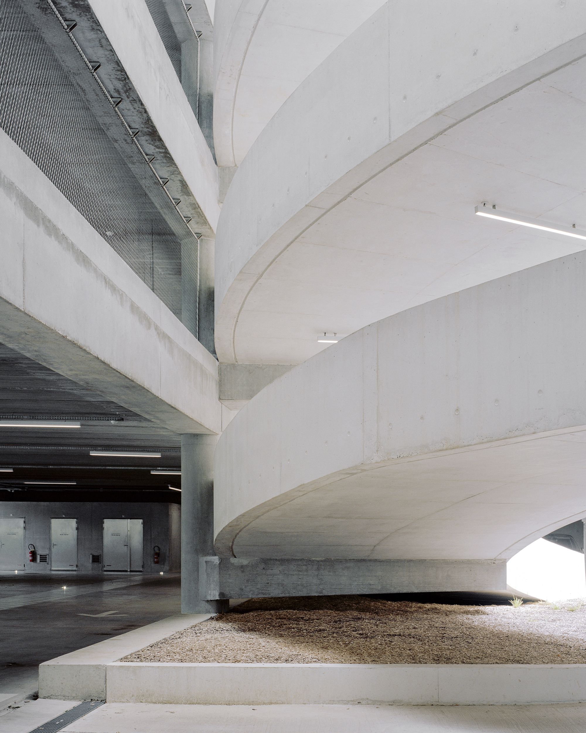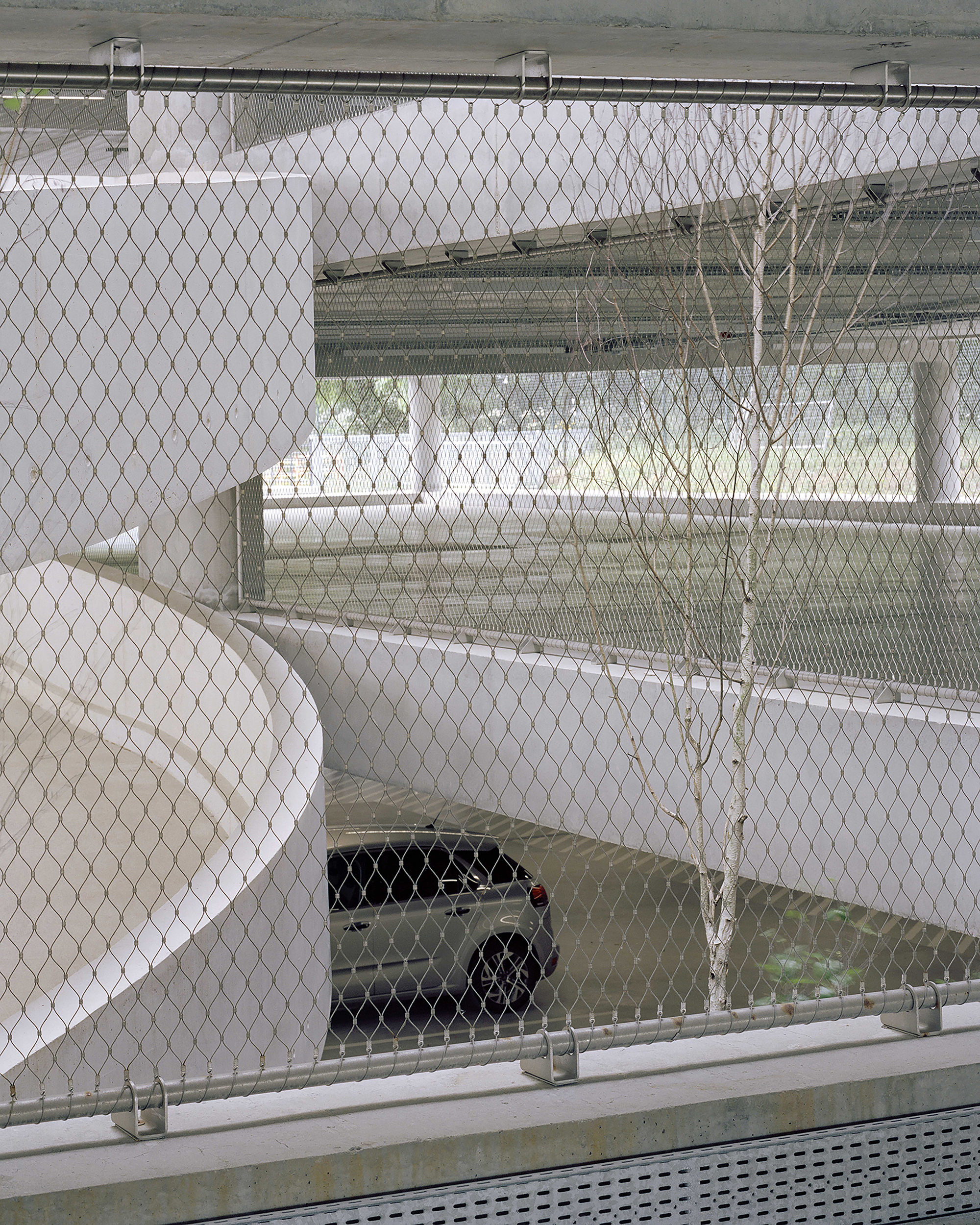 These ramps were designed to maximize parking efficiency, facilitate access to parking spaces and optimize traffic flow and minimize congestion. They also highlight the intrinsic beauty of the concrete structure in stark contrast to the exterior metal mesh.