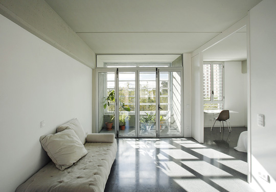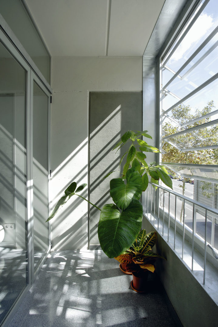 Funcionando como amortiguador entre la calle y el estar y recuperando una tradición Barcelonesa, colocamos una pequeña galería en el extremo sur del estar. Ésta galería se genera entre dos superficies vidriadas y funciona como captador solar pasivo en el invierno. En verano, debido a la verticalidad de la incidencia solar, abriendo las lamas vidriadas exteriores y cerrando las puertas plegables interiores, la galería se transforma en un balcón.
