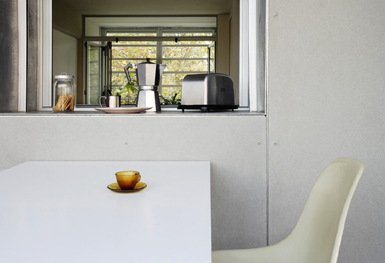 El muro que separa la cocina de la calle pública, alberga todas las conducciones verticales del edificio con el fin de ser fácilmente accesibles para mantenimiento, pero también para dar una profundidad exagerada a la ventana que comunica el interior con el exterior. El alfeizar de esta ventana de guillotina se convierte en una bandeja de acero galvanizado de 60cm de ancho, pudiéndose usar para pasar y colocar comida o bebidas directamente de la cocina a una mesa en el exterior.