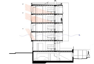 La cocina y el lavabo se colocan adyacentes a esta fachada, mientras que la zona principal de estar se encuentra en la fachada sur-este opuesta, con el fin de cumplir con el decreto local de eco-eficiencia. Este decreto pide que el 80% de las viviendas dispongan de al menos una hora de sol directo en la sala de estar de 10:00 a 14:00 en el solsticio de invierno.