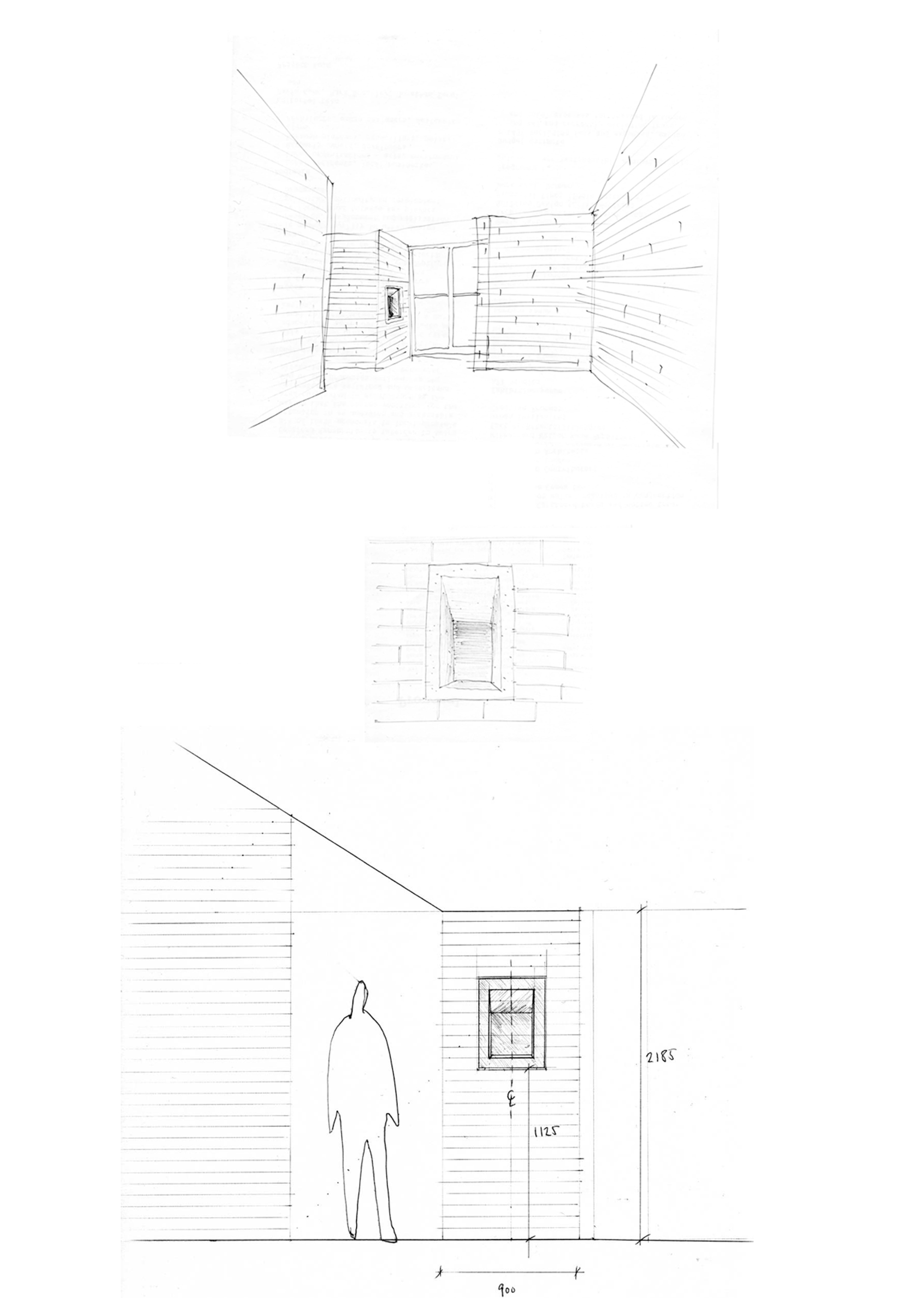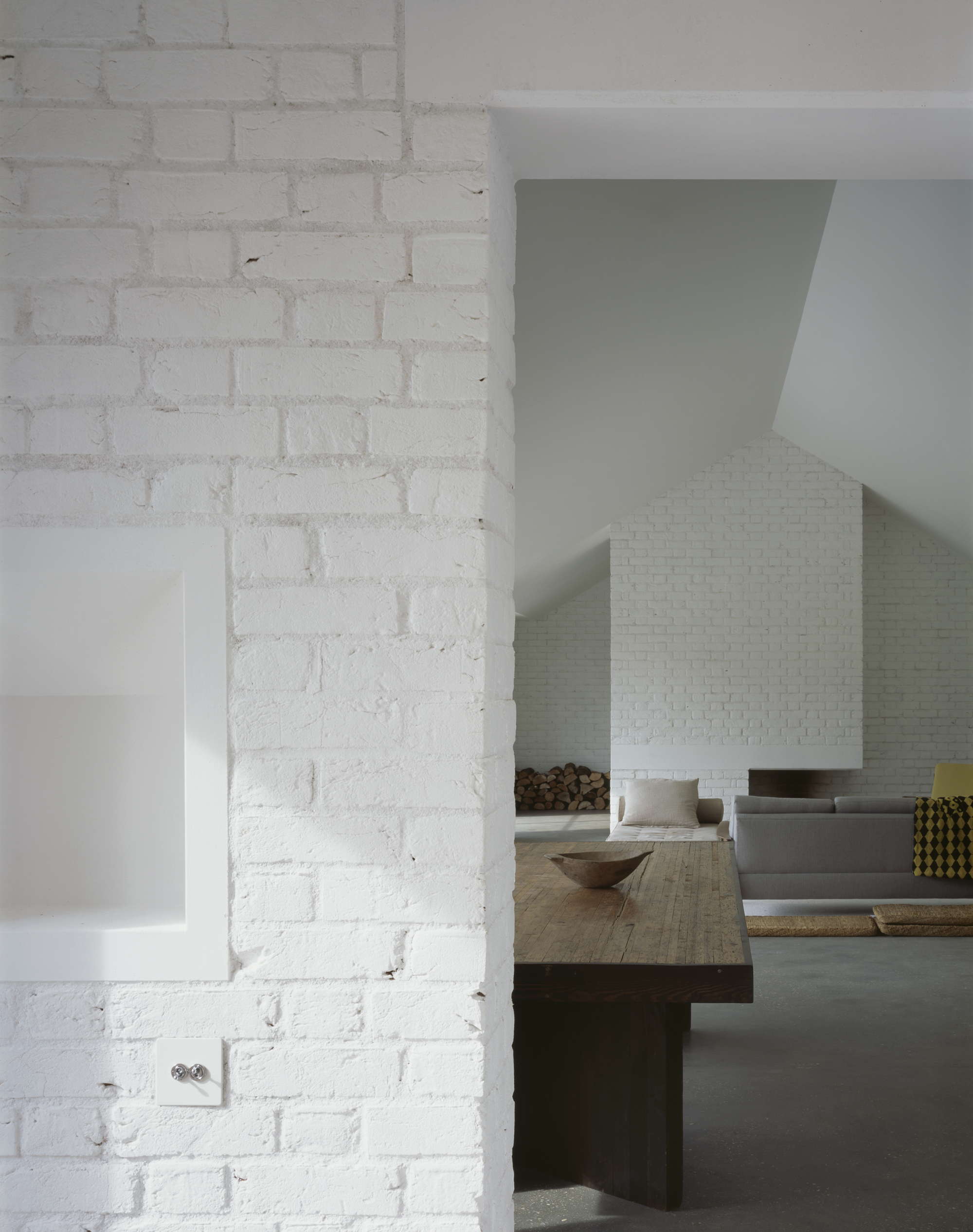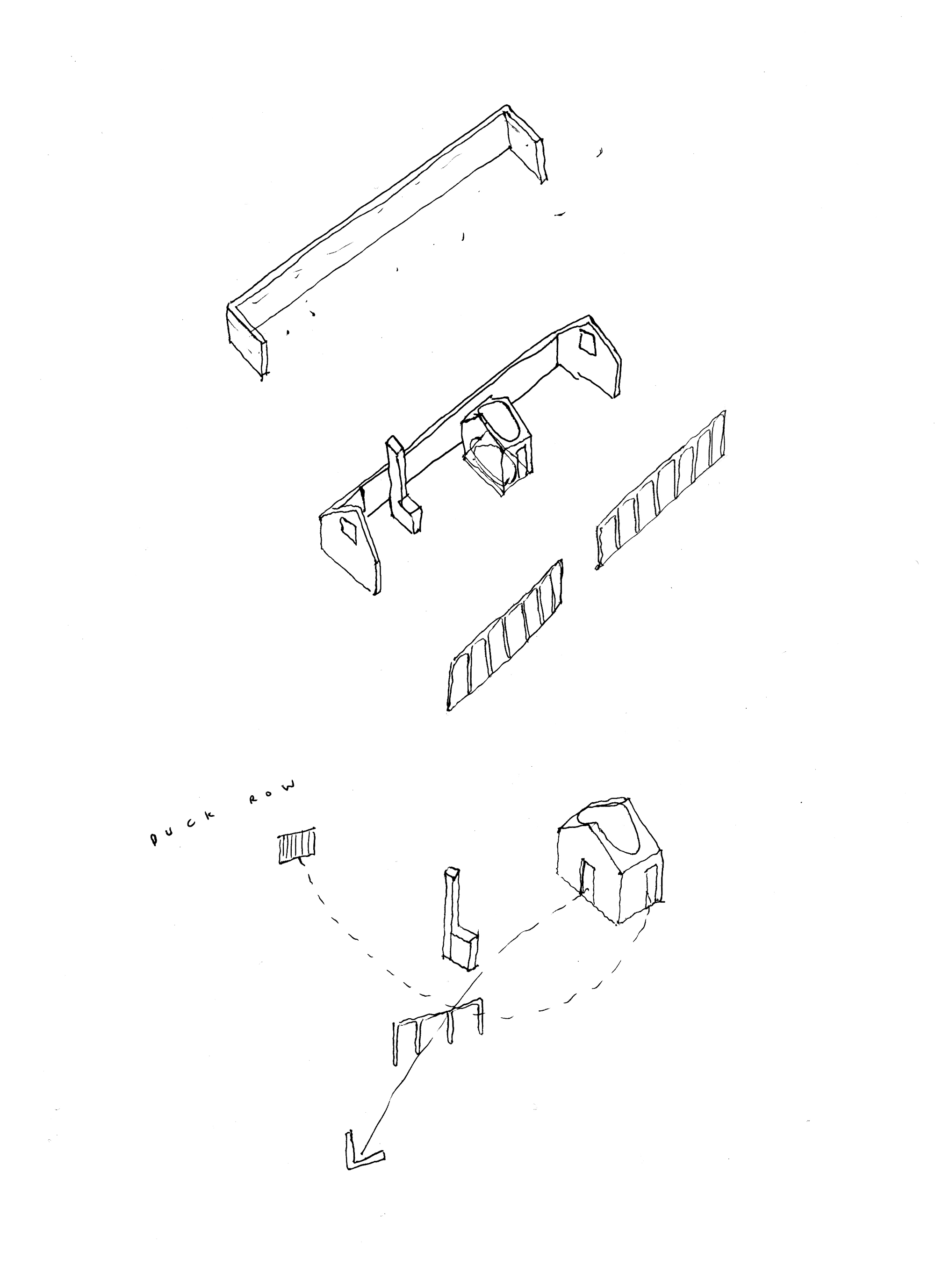 There are two entrances to the house, one in the centre and one at the end, into the kitchen. At each there is a cast concrete aedicule set into the adjacent brick walls. A section through the aedicule is a scaled version of the whole house. They recall shrines for Roman household gods but are now usually home to keys.