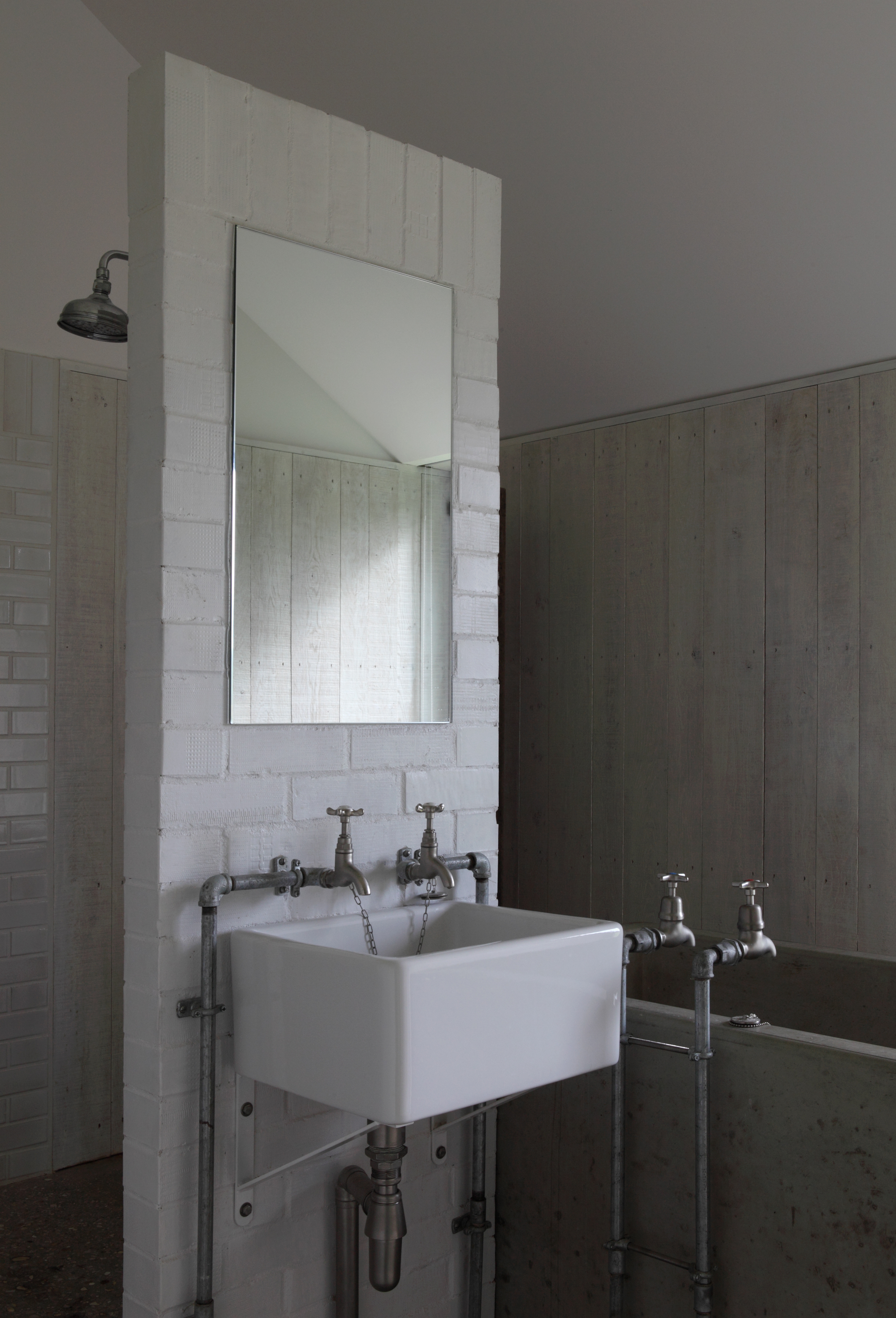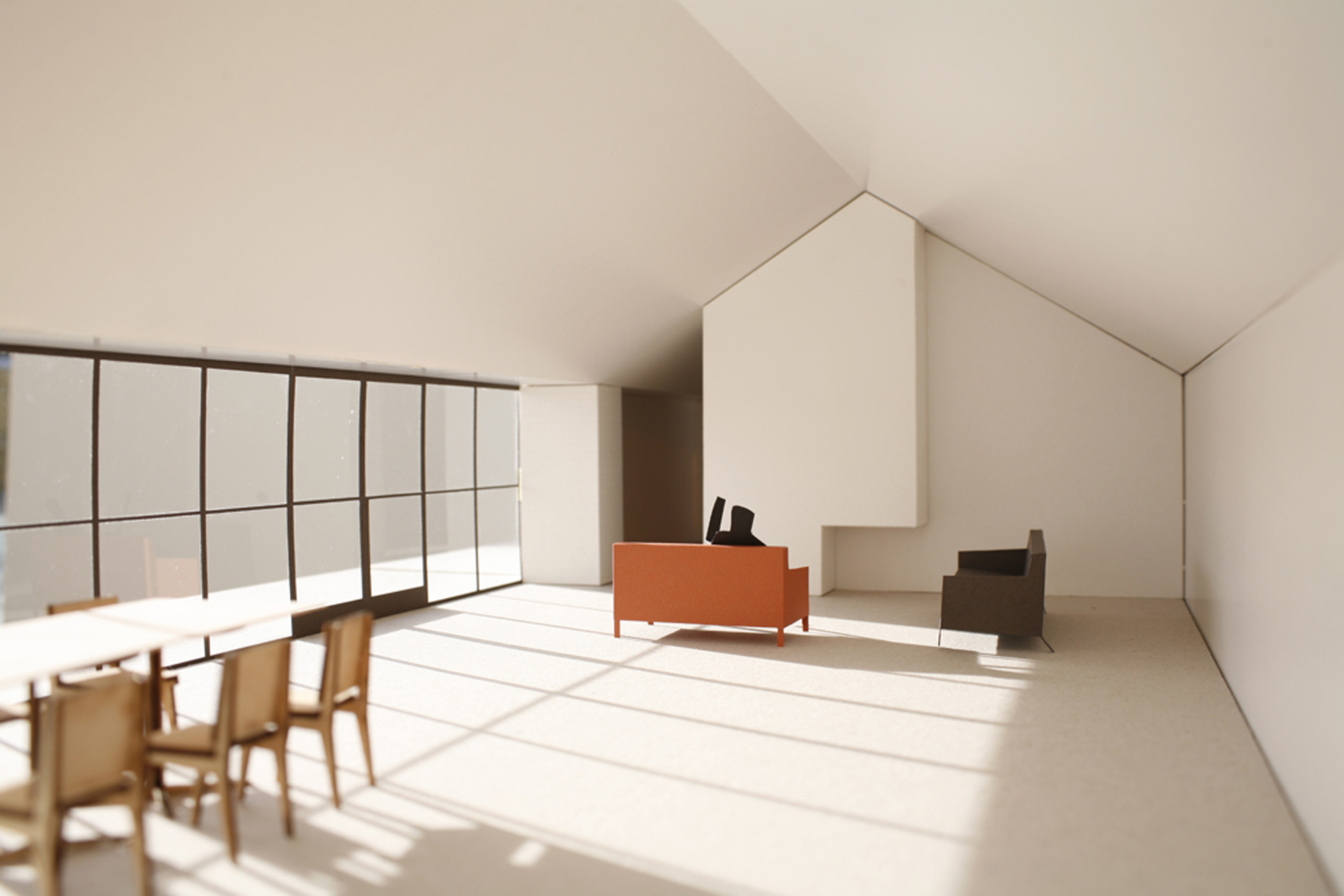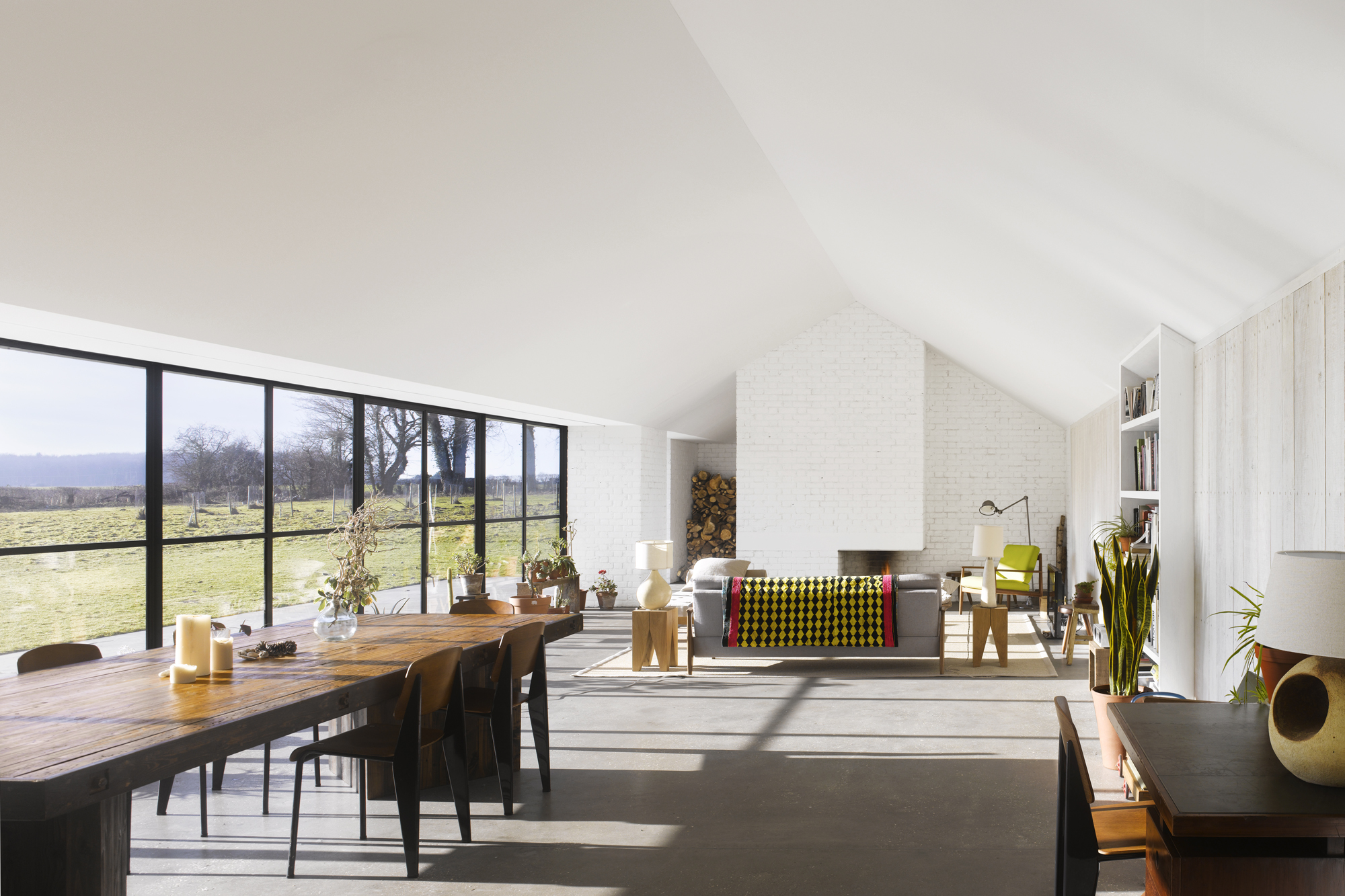 The focus of the house is a large tent-like living room with continuous Crittall glazing to the garden and distant view. A large fireplace and entrance hall bookend the room and support the pitched roof structure. The glazing and entrance hall can be completely opened up in good weather, allowing the house to feel more like a pavilion.