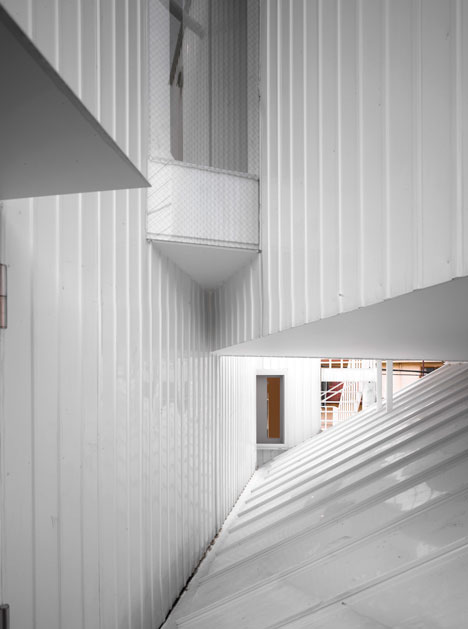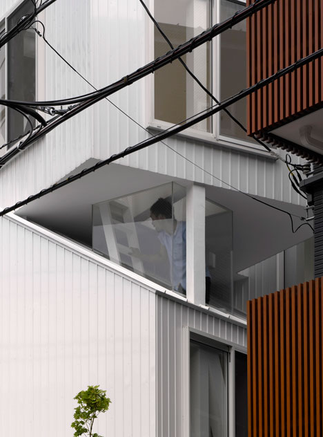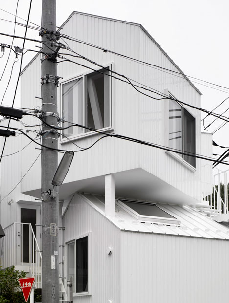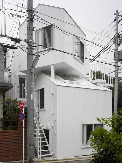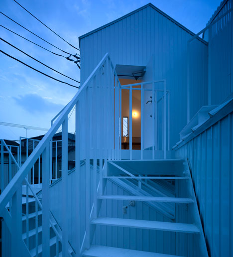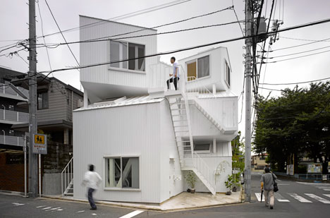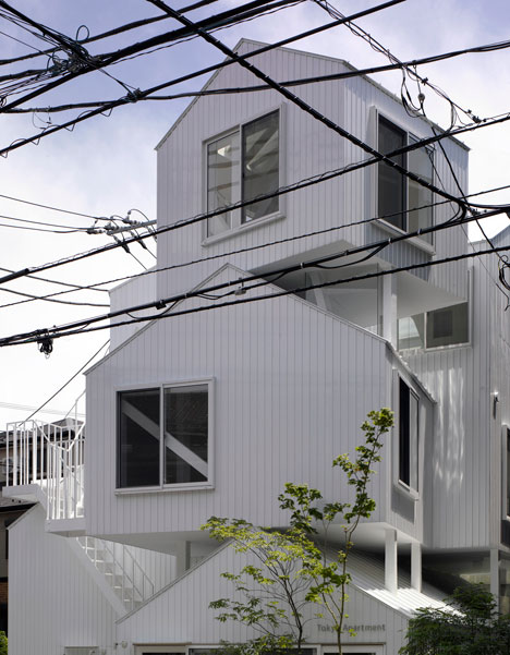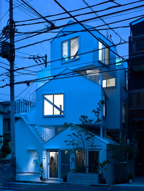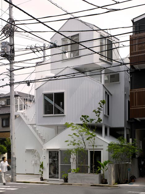 Collective housing built in the residential section of the center of Tokyo. It consists of four dwelling units including owner’s dwelling unit. Each dwelling unit is made with two or three independent rooms of prototypical “house” shapes. And the two rooms exist, separated like combination of the room of the first floor, and the room of the third floor and they are connected by outside stairs.