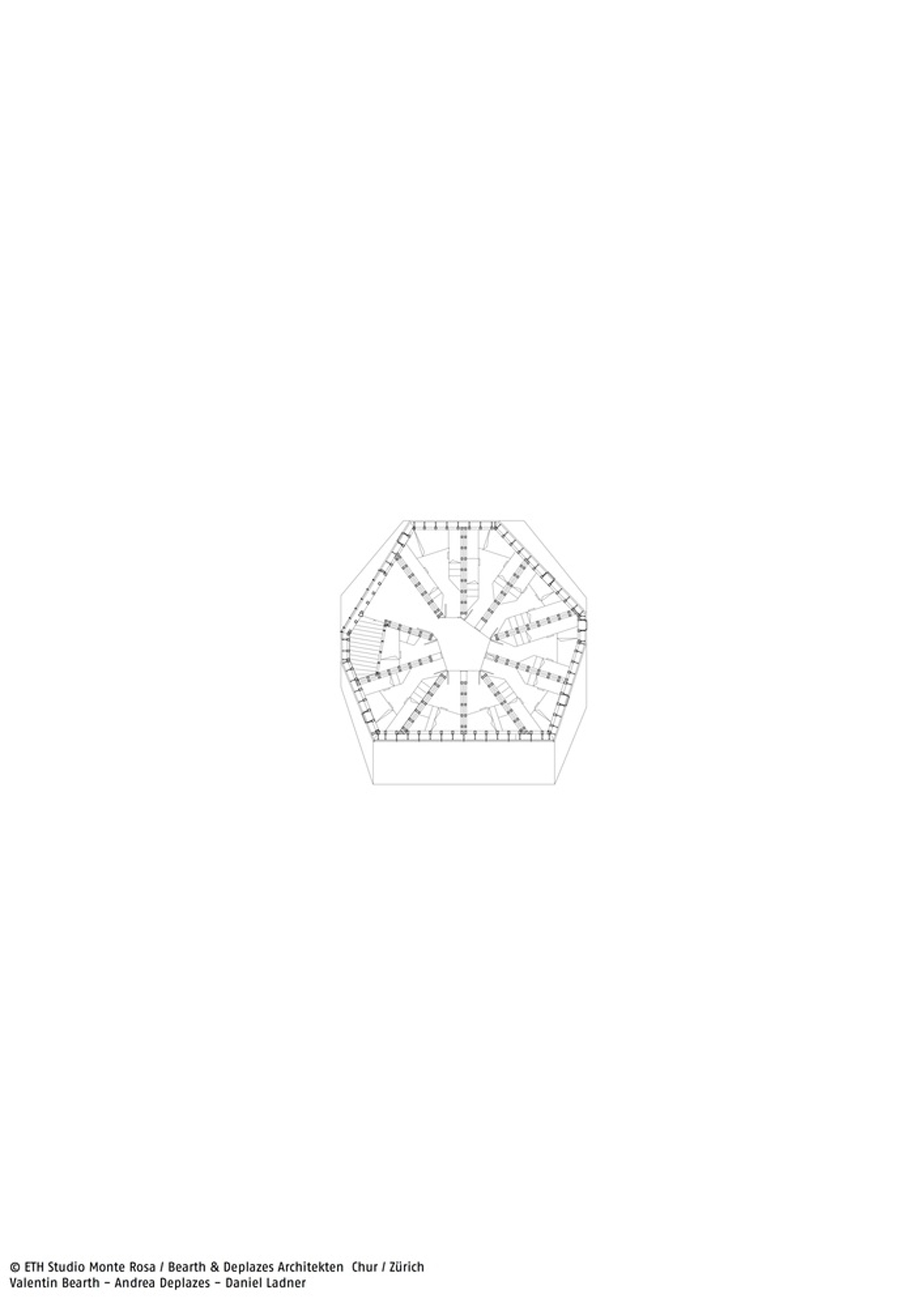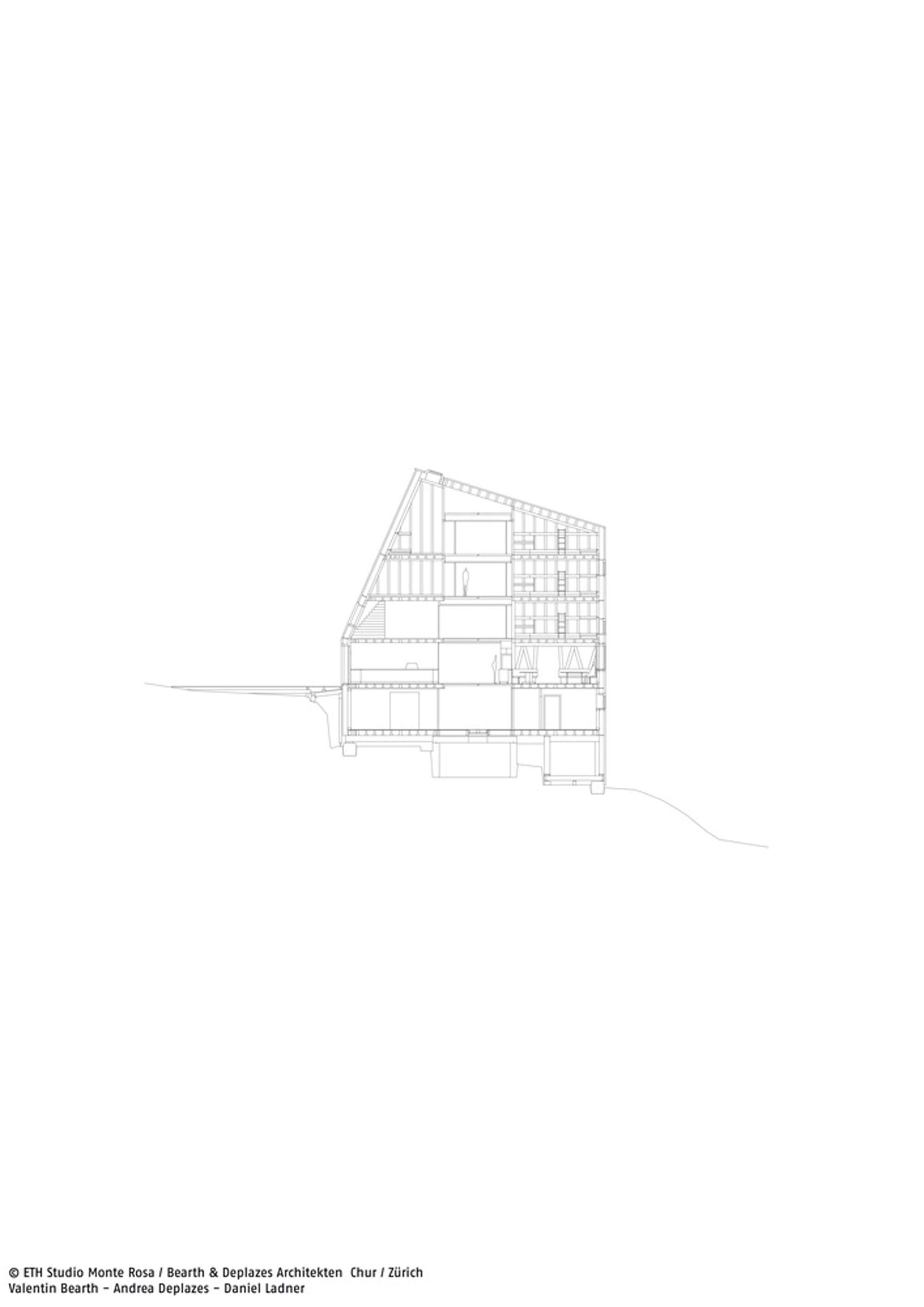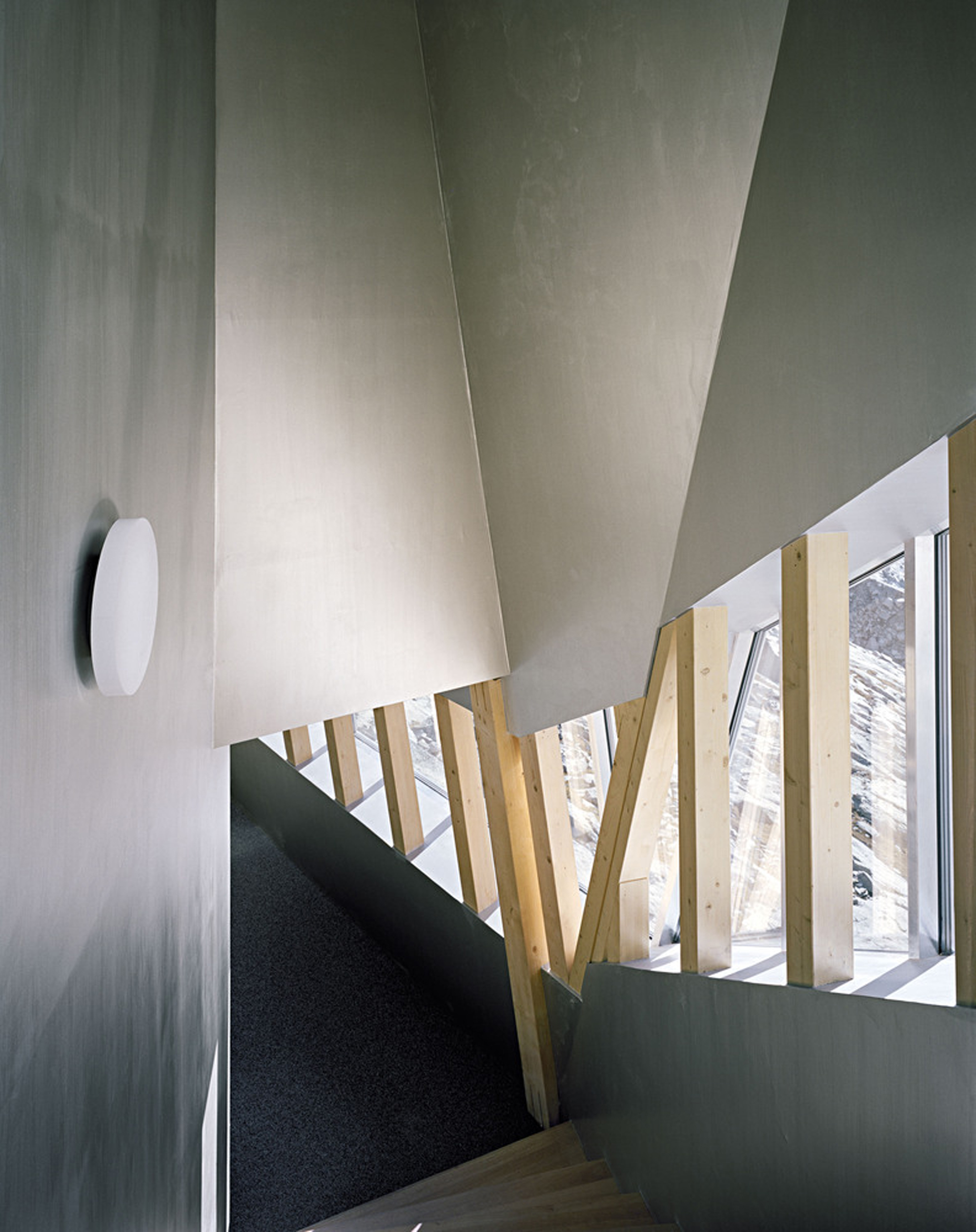 Contemporary version of a medieval donjon: Five-story wood construction made from prefabricated frame elements. The isolated mountain location mandates the greatest possible self-sufficiency. The ambivalence between a sense of security and being exposed defines the building’s structure: below are the communal areas with surrounding ribbon glazing, above the closed sleeping quarters. The cascading spiral stairway opens panorama views when ascending, follows the course of the sun, captures the solar irradiation, and distributes the warmth of the sun throughout the entire house.