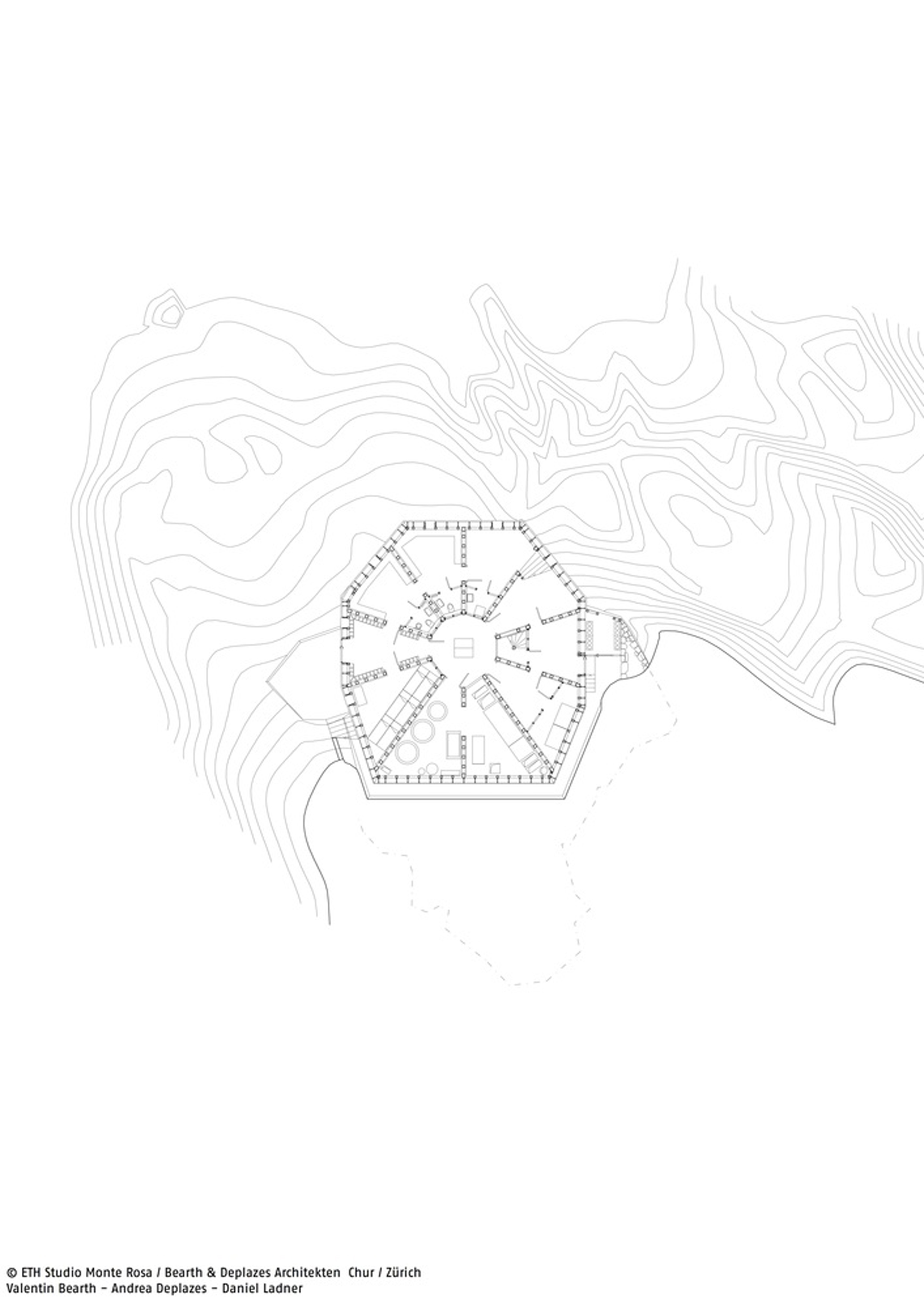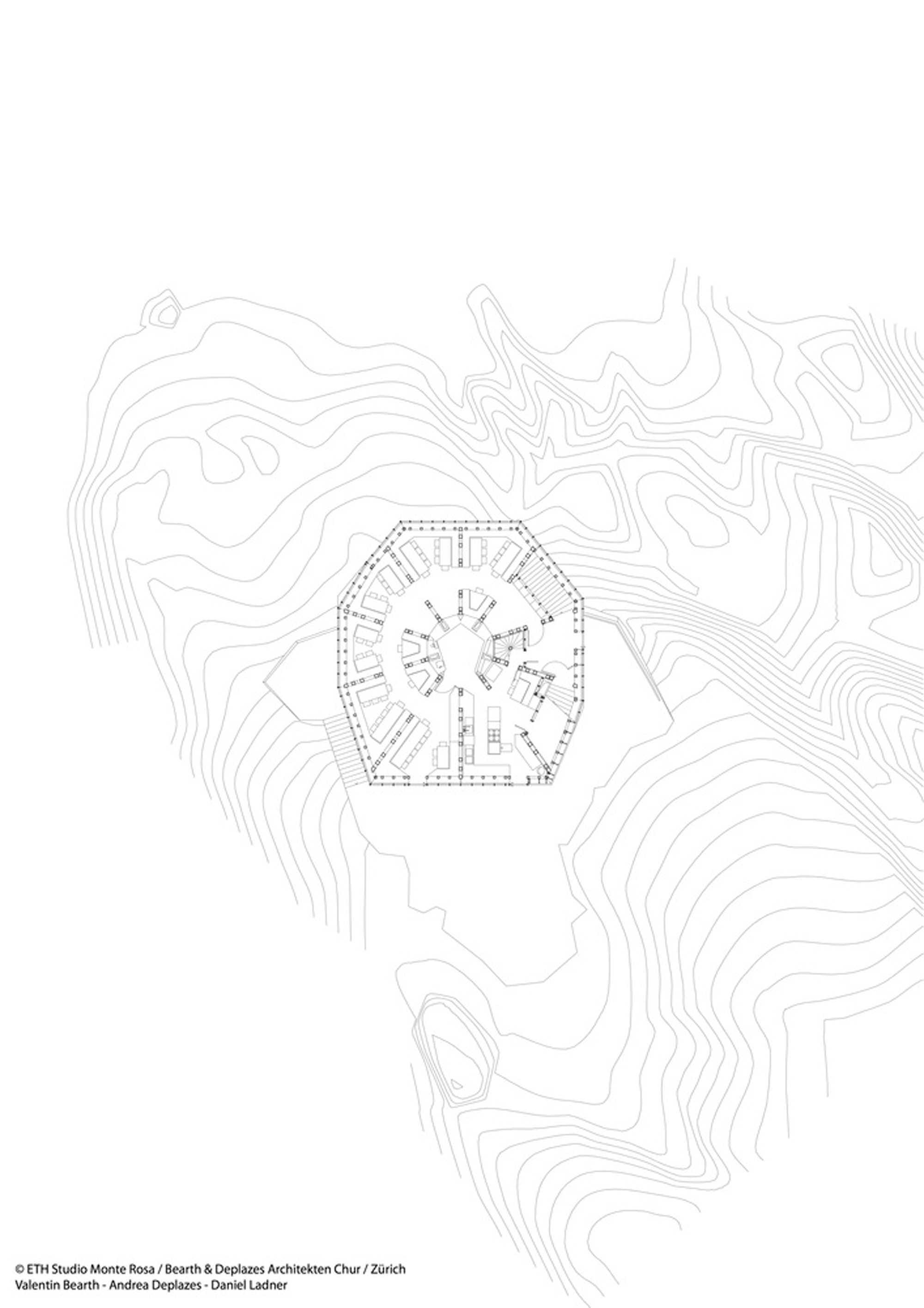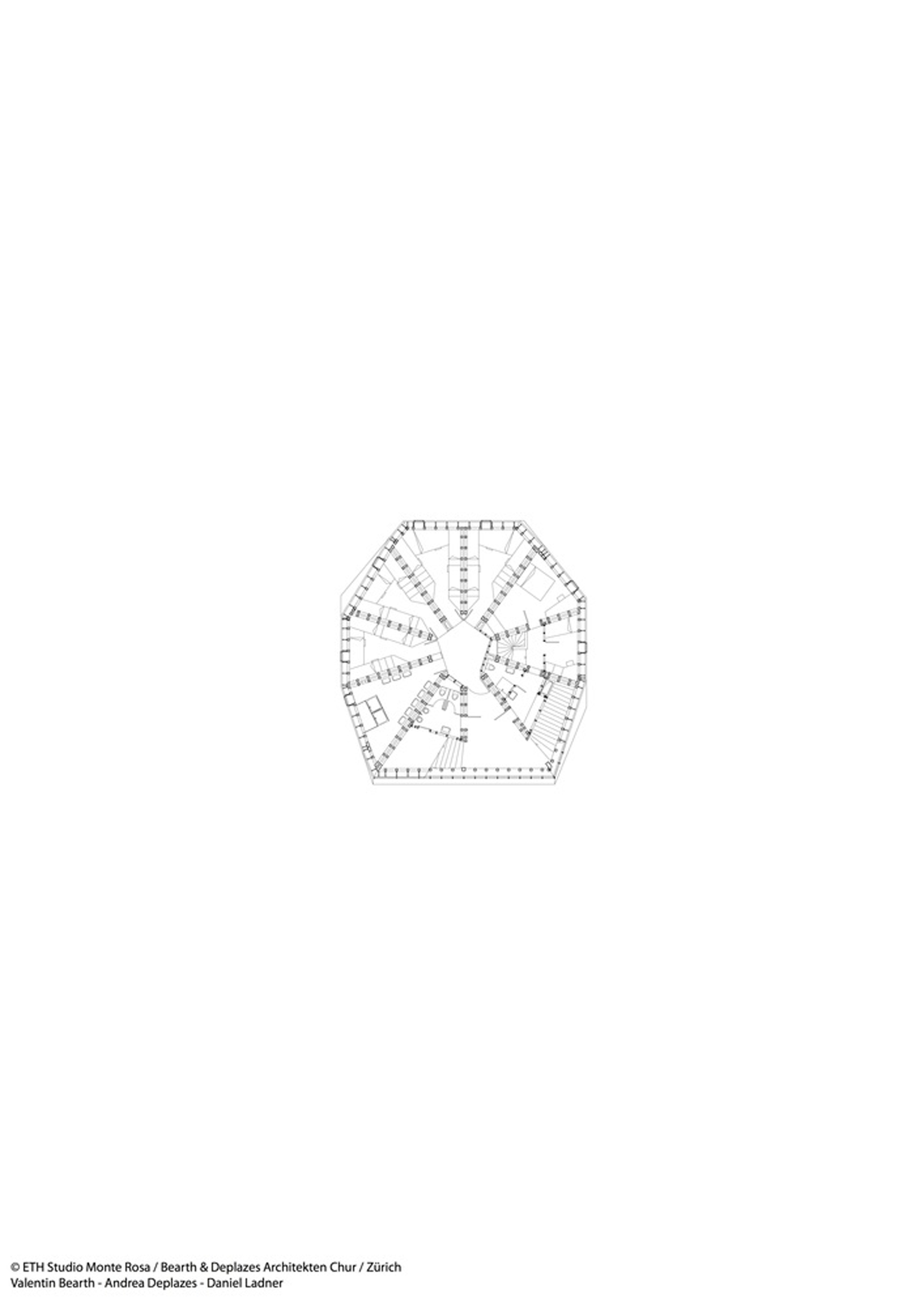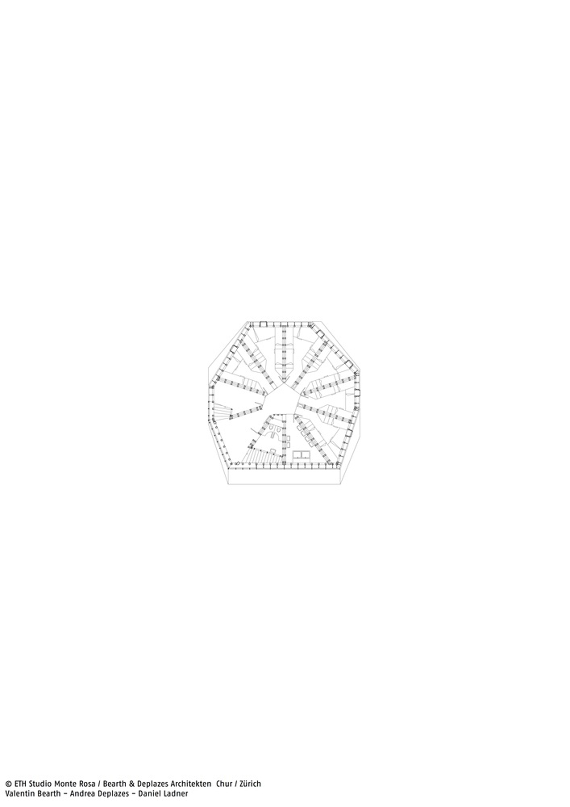 Contemporary version of a medieval donjon: Five-story wood construction made from prefabricated frame elements. The isolated mountain location mandates the greatest possible self-sufficiency. The ambivalence between a sense of security and being exposed defines the building’s structure: below are the communal areas with surrounding ribbon glazing, above the closed sleeping quarters. The cascading spiral stairway opens panorama views when ascending, follows the course of the sun, captures the solar irradiation, and distributes the warmth of the sun throughout the entire house.