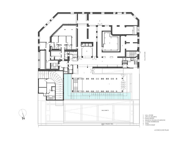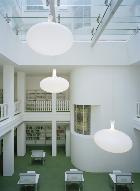 El Palacio, un edificio ecléctico construido en el año 1929, ha sido reformado íntegramente y reconstruido parcialmente para ubicar las salas de lectura e investigación en relación directa con los fondos bibliográficos de libre acceso, que representan el 25% del total de los archivos. Los interiores han sido aligerados de todo elemento no estructural hasta conformar espacios diáfanos continuos.