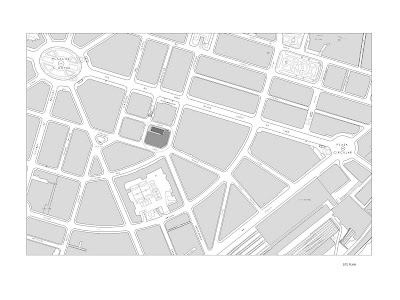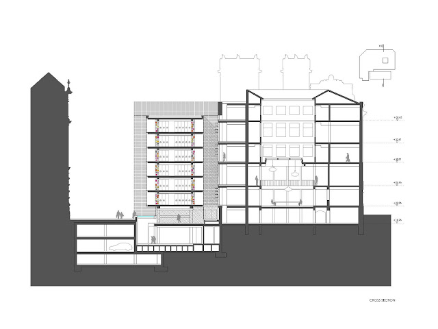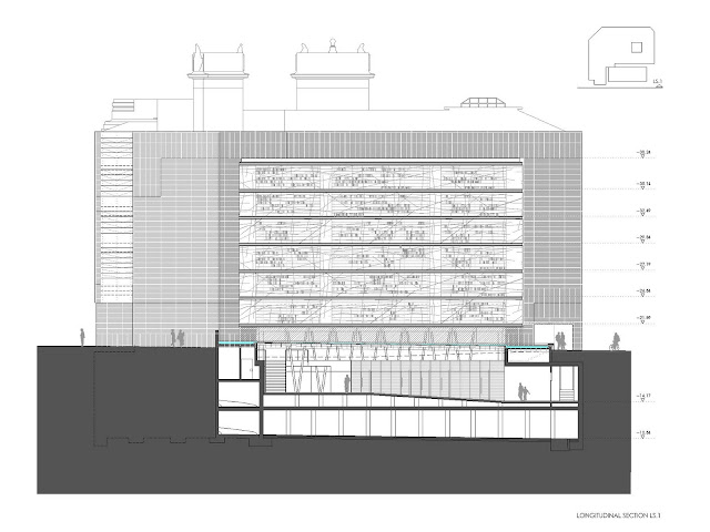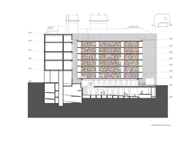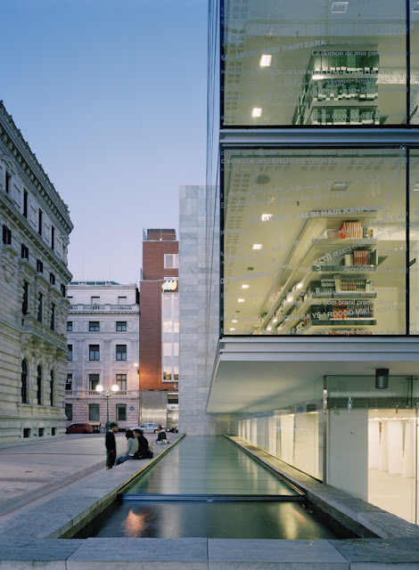 Los tres edificios se articulan alrededor de un patio longitudinal que dibuja una gran hendidura con dos fachadas acristaladas enfrentadas. Dependiendo de la hora del día y de la incidencia solar se produce una imagen cambiante que otorga el protagonismo a los libros apilados en sus estanterías o a las serigrafías vidriadas que forman parte de la piel exterior transparente.