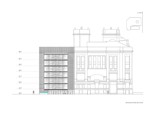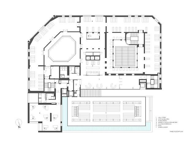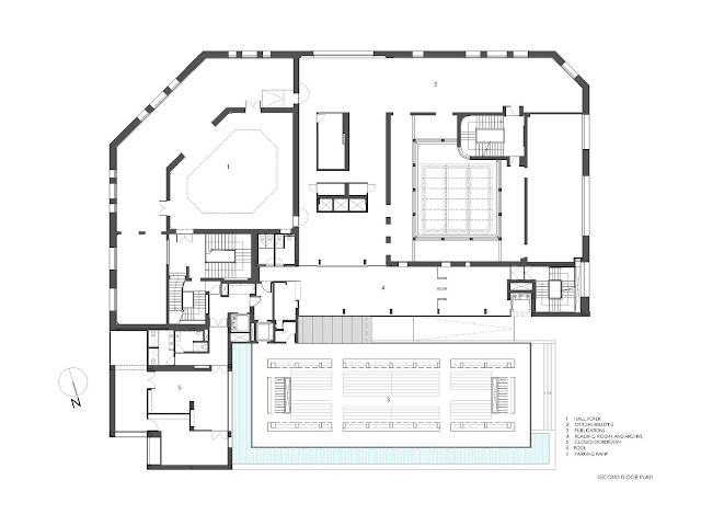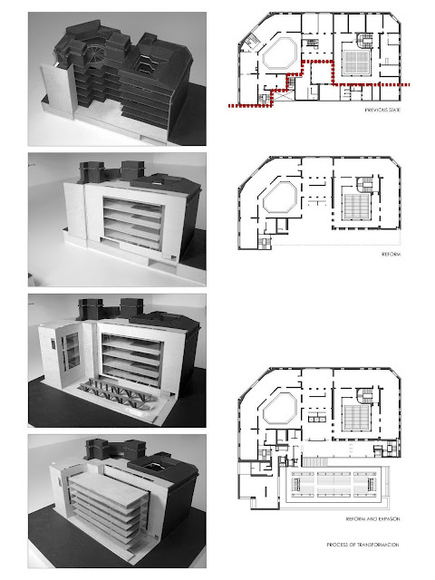 Un segundo volumen, de nueva construcción, cuya imagen exterior se basa en la textura de una piedra de gran formato, rugosa, acoge funciones administrativas y técnicas. El tercer volumen, acristalado, encierra los archivos compactos de libros y dispone de un deambulatorio perimetral, con estanterías vistas, que exhiben la textura del libro hacia la ciudad como reclamo cultural.