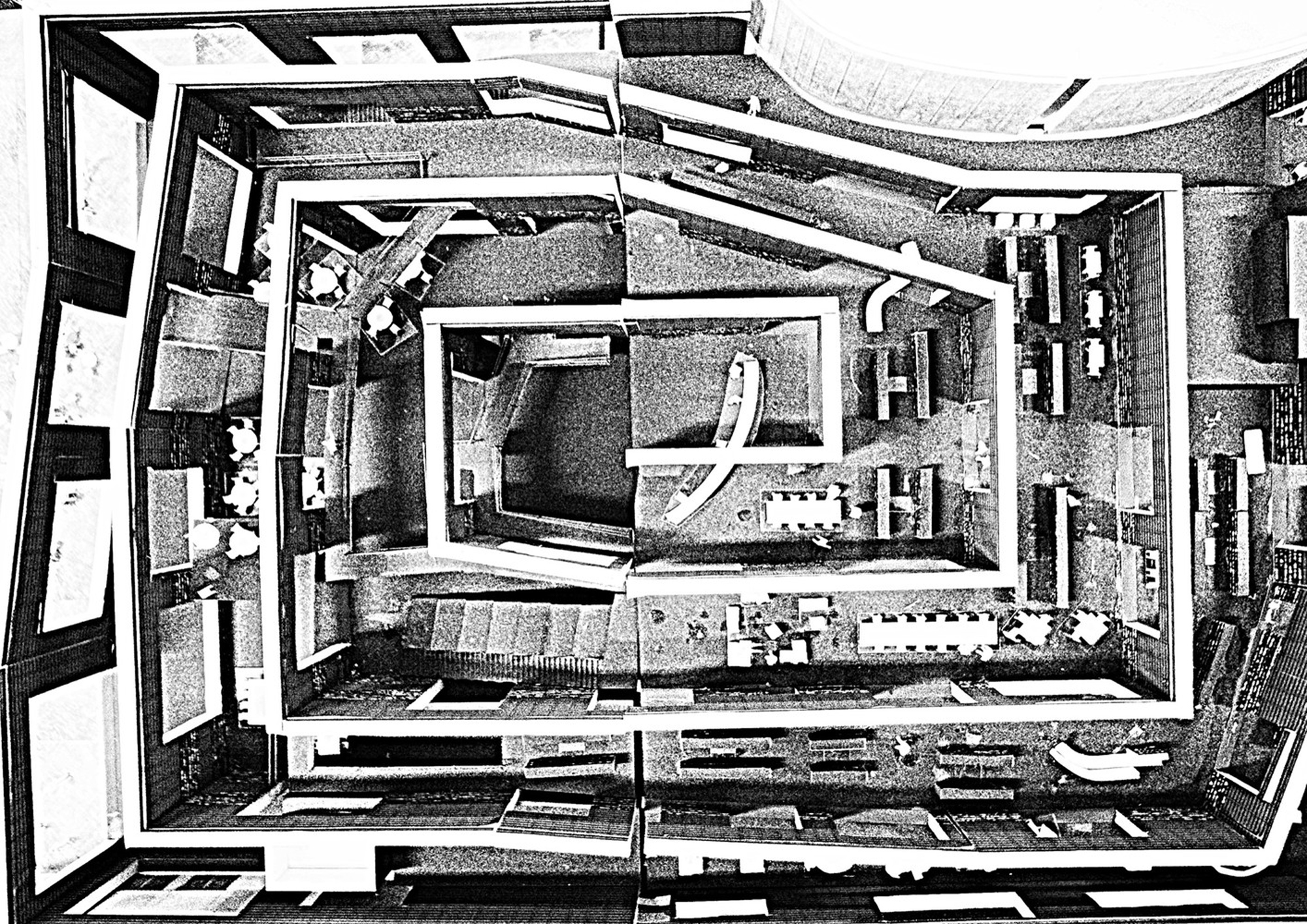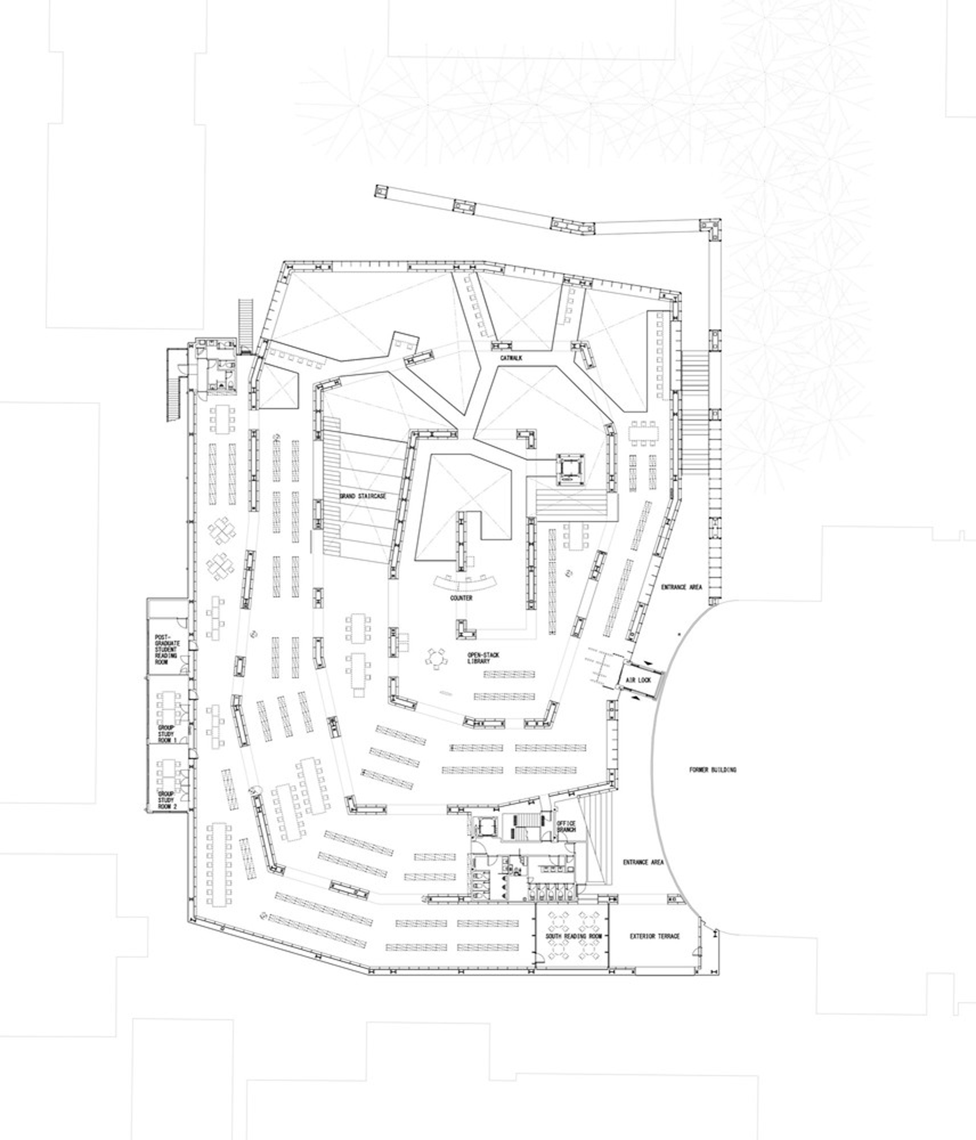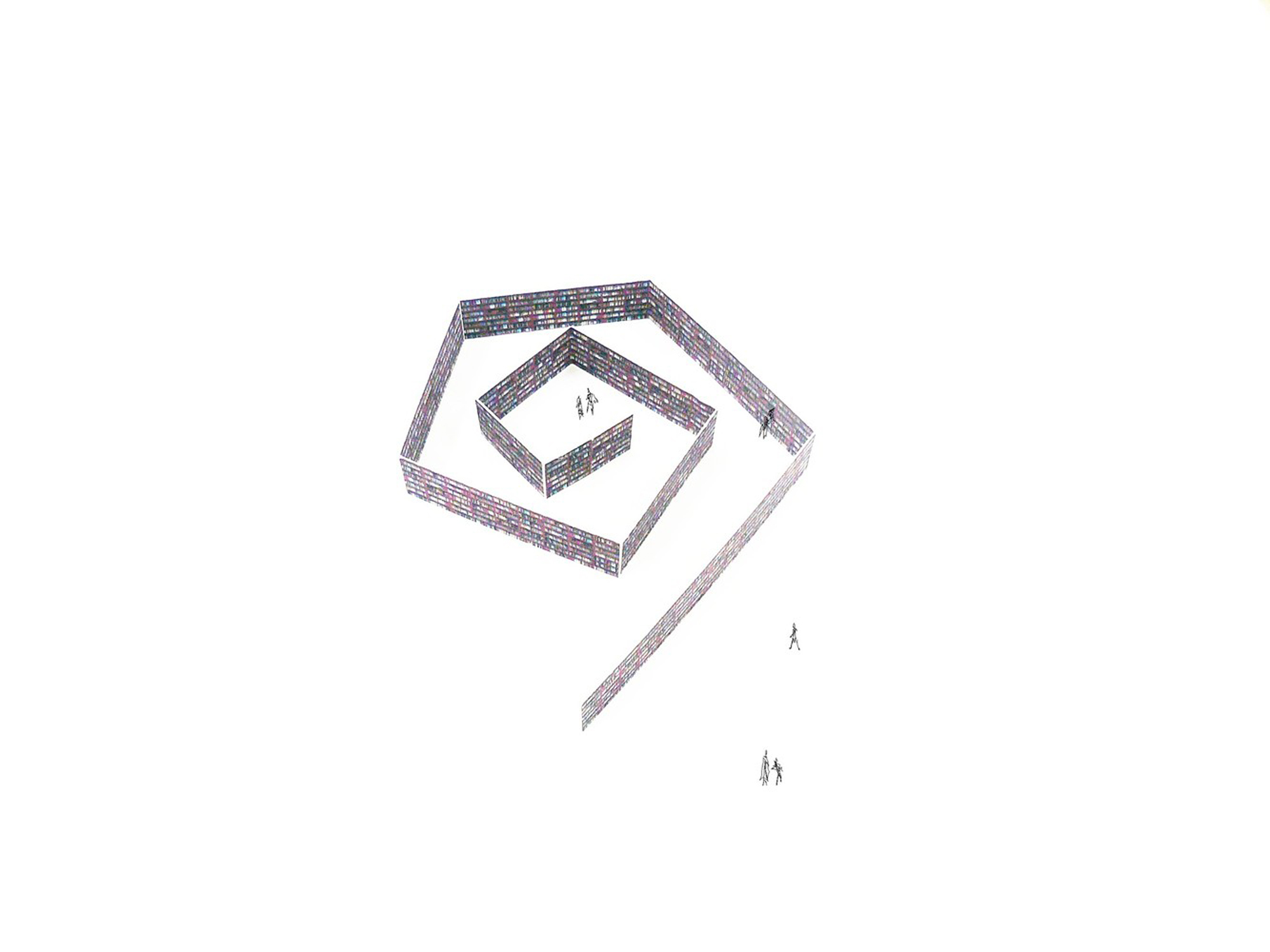 This spiral sequence of the bookshelf continues, eventually wrapping the periphery of the site as the external wall to allow the external appearance of the building to share the same elemental composition of the bookshelf as the library.