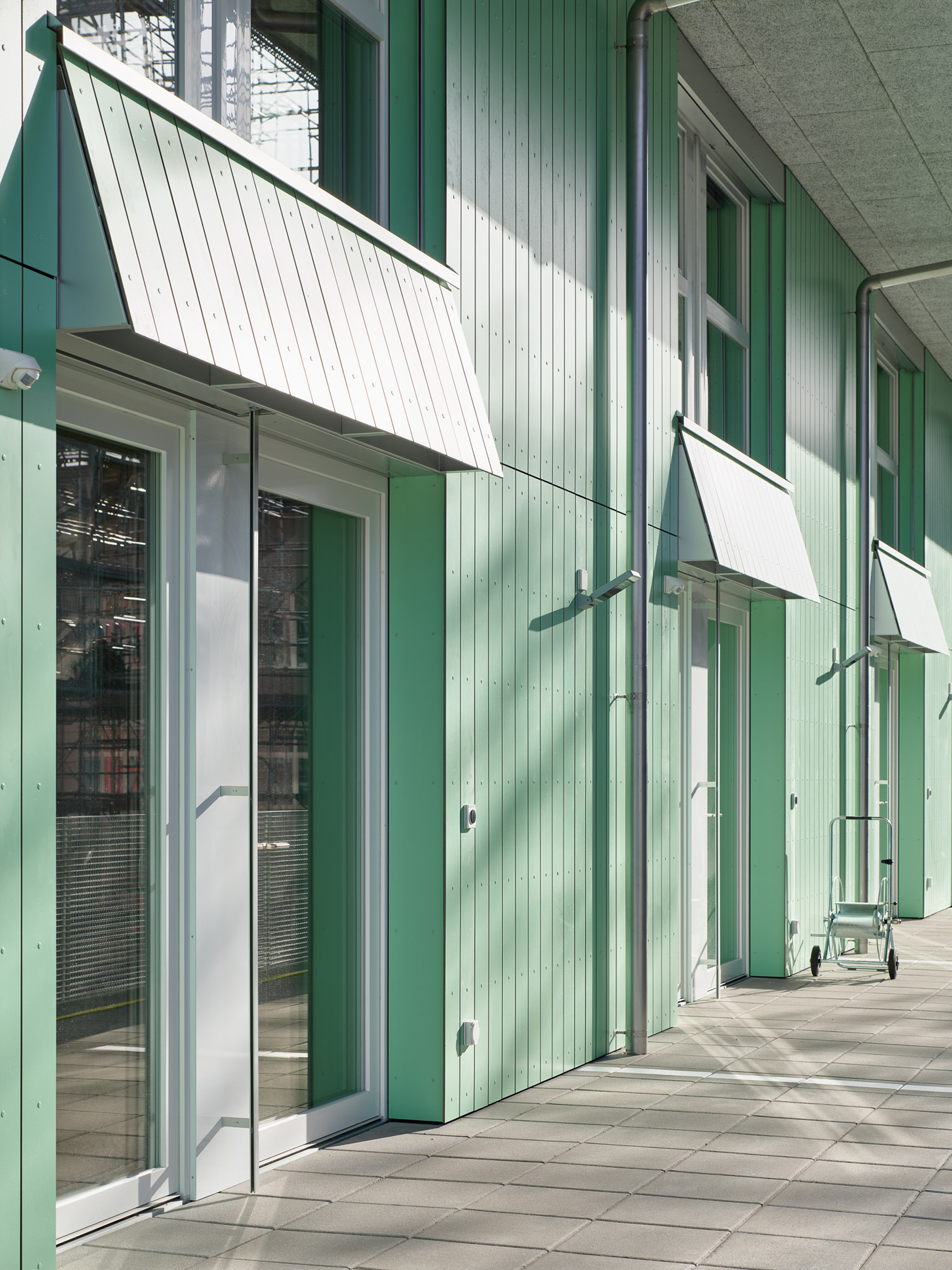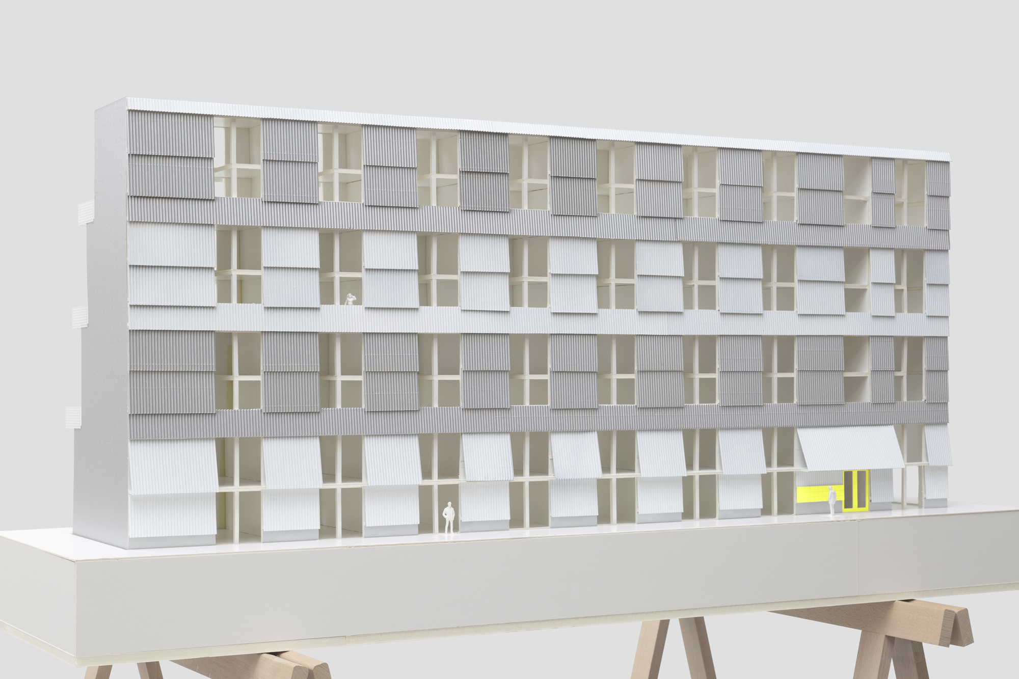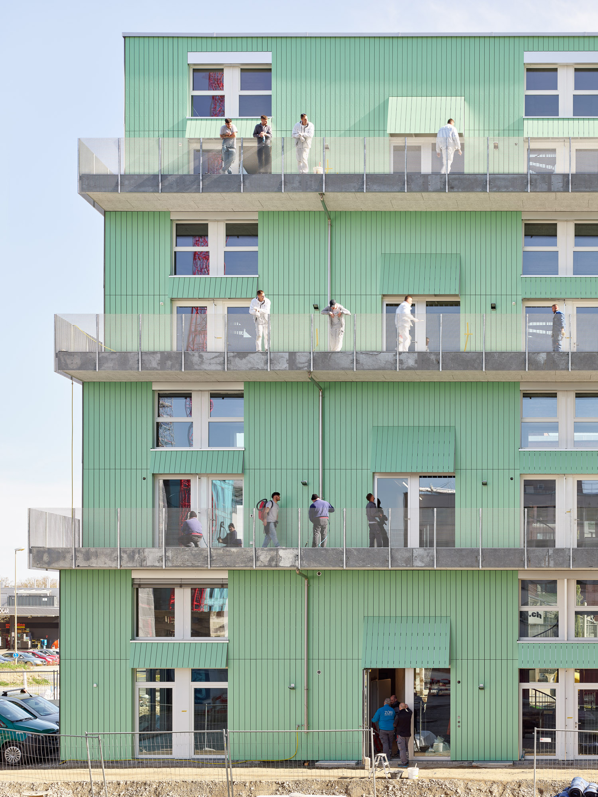 The longitudinal residential building has been designed as a pilot project on the theme of “sufficiency”. The apartment building takes the form of an urban terraced row. Its concise building shape links with the adjacent residential tower block and corner shop to form a memorable ensemble that promotes a sense of identity.