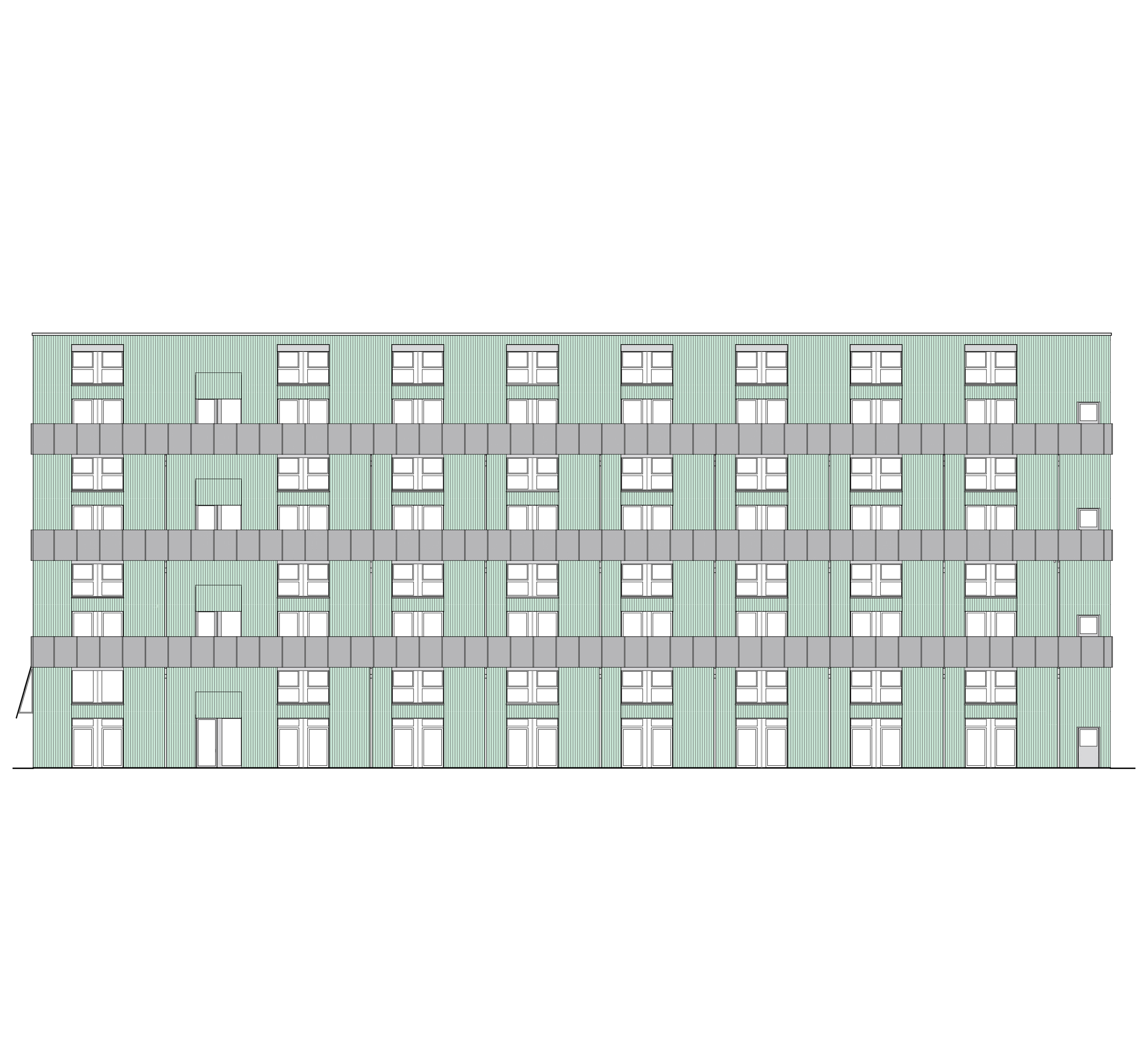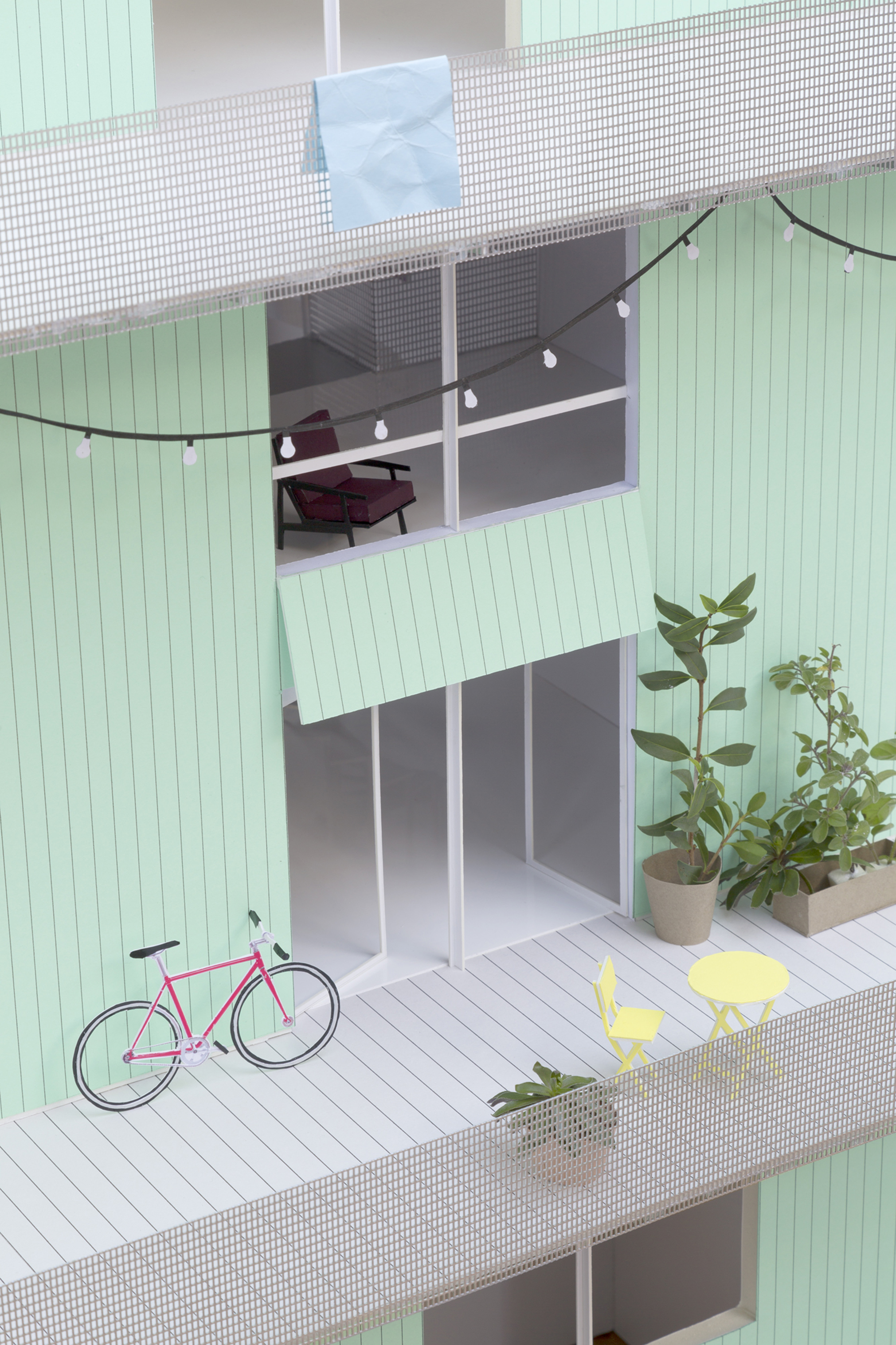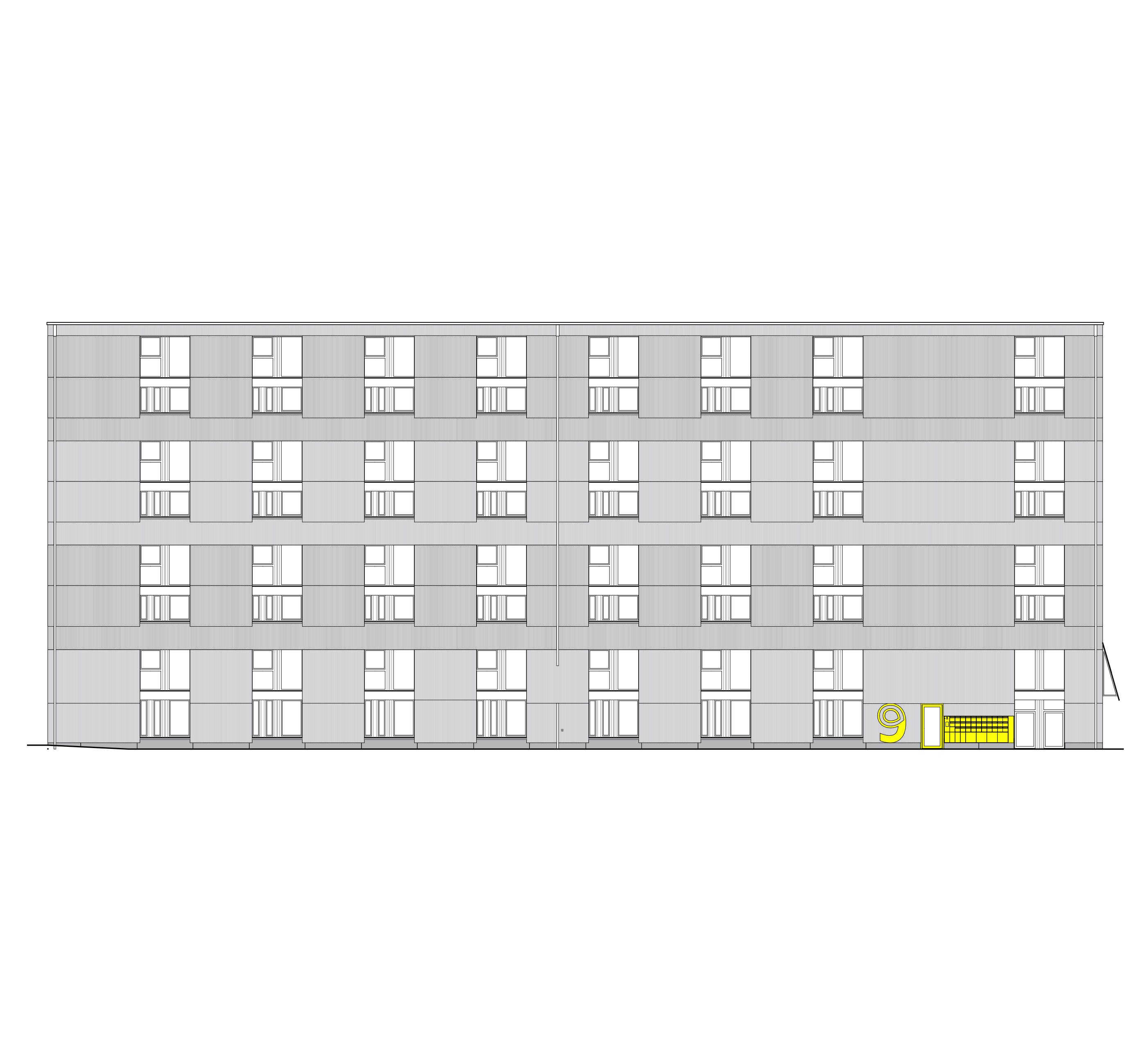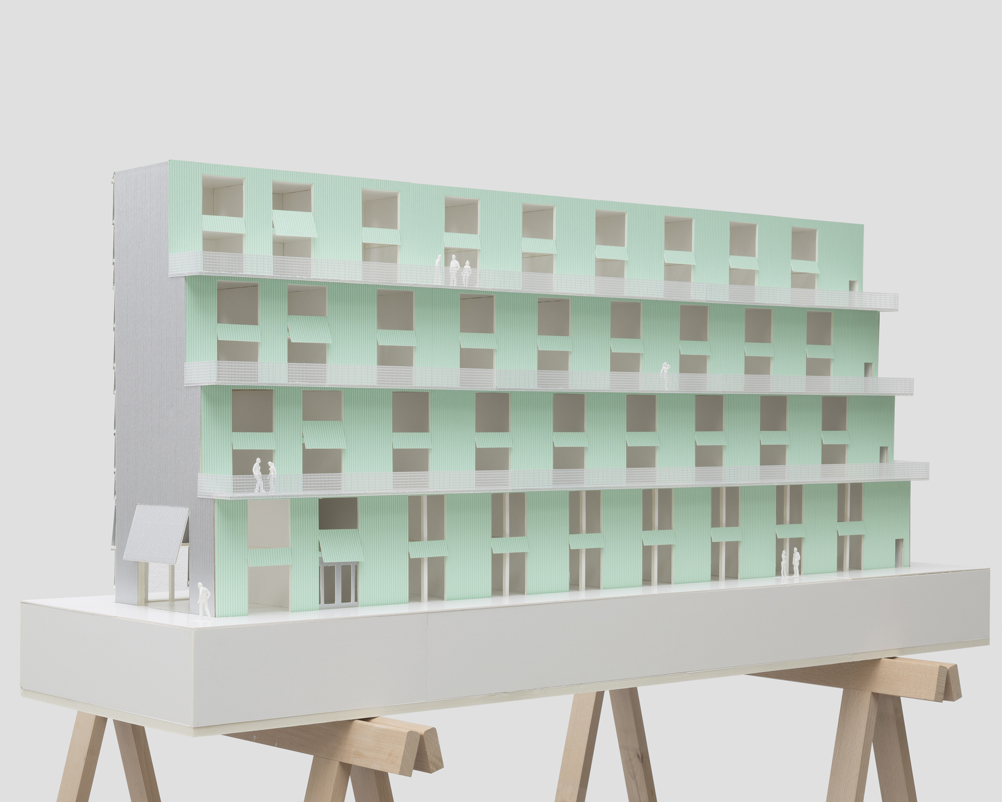 The longitudinal residential building has been designed as a pilot project on the theme of “sufficiency”. The apartment building takes the form of an urban terraced row. Its concise building shape links with the adjacent residential tower block and corner shop to form a memorable ensemble that promotes a sense of identity.
