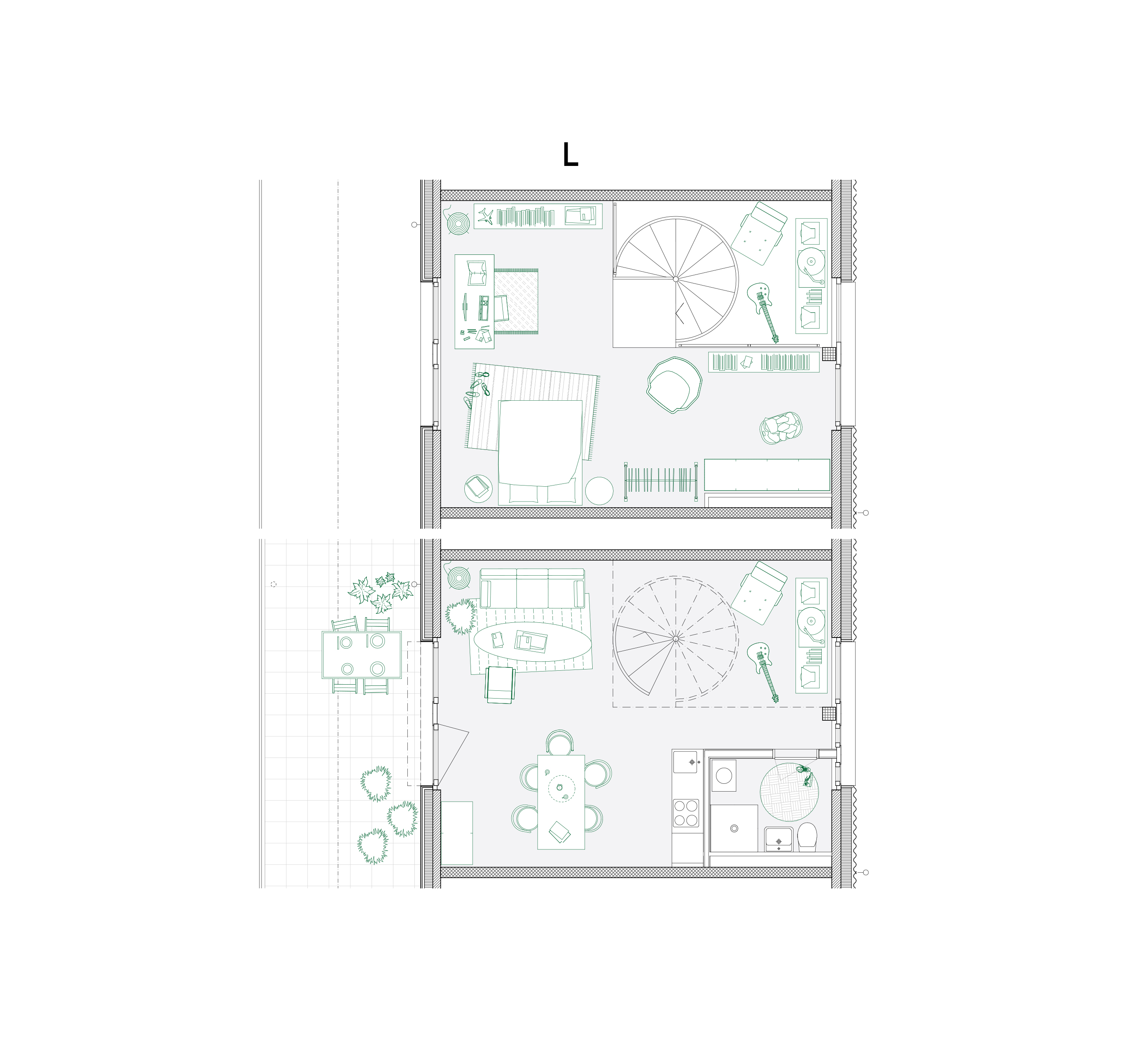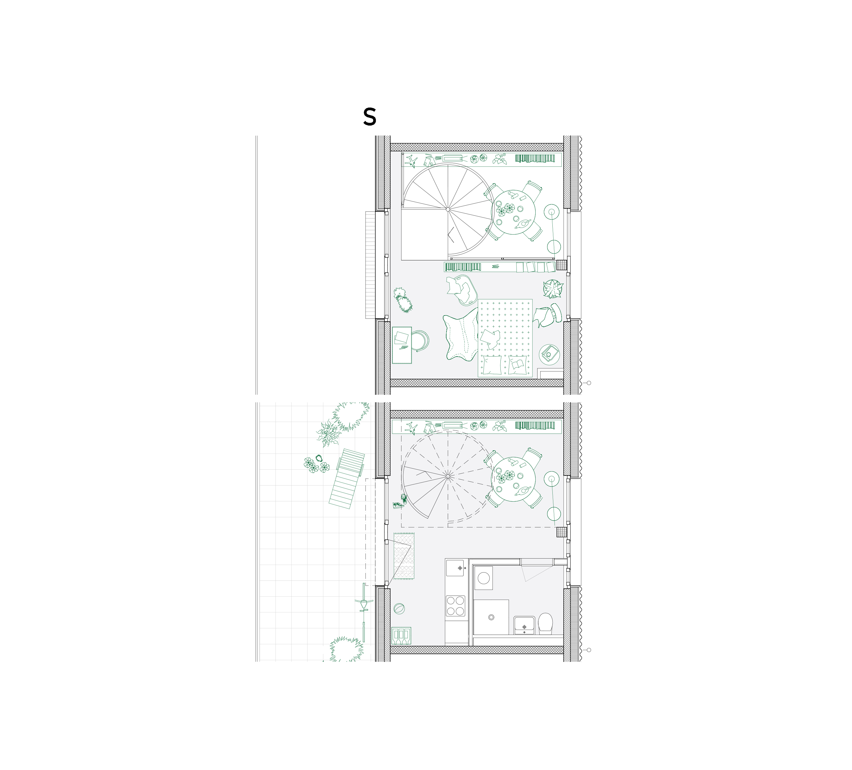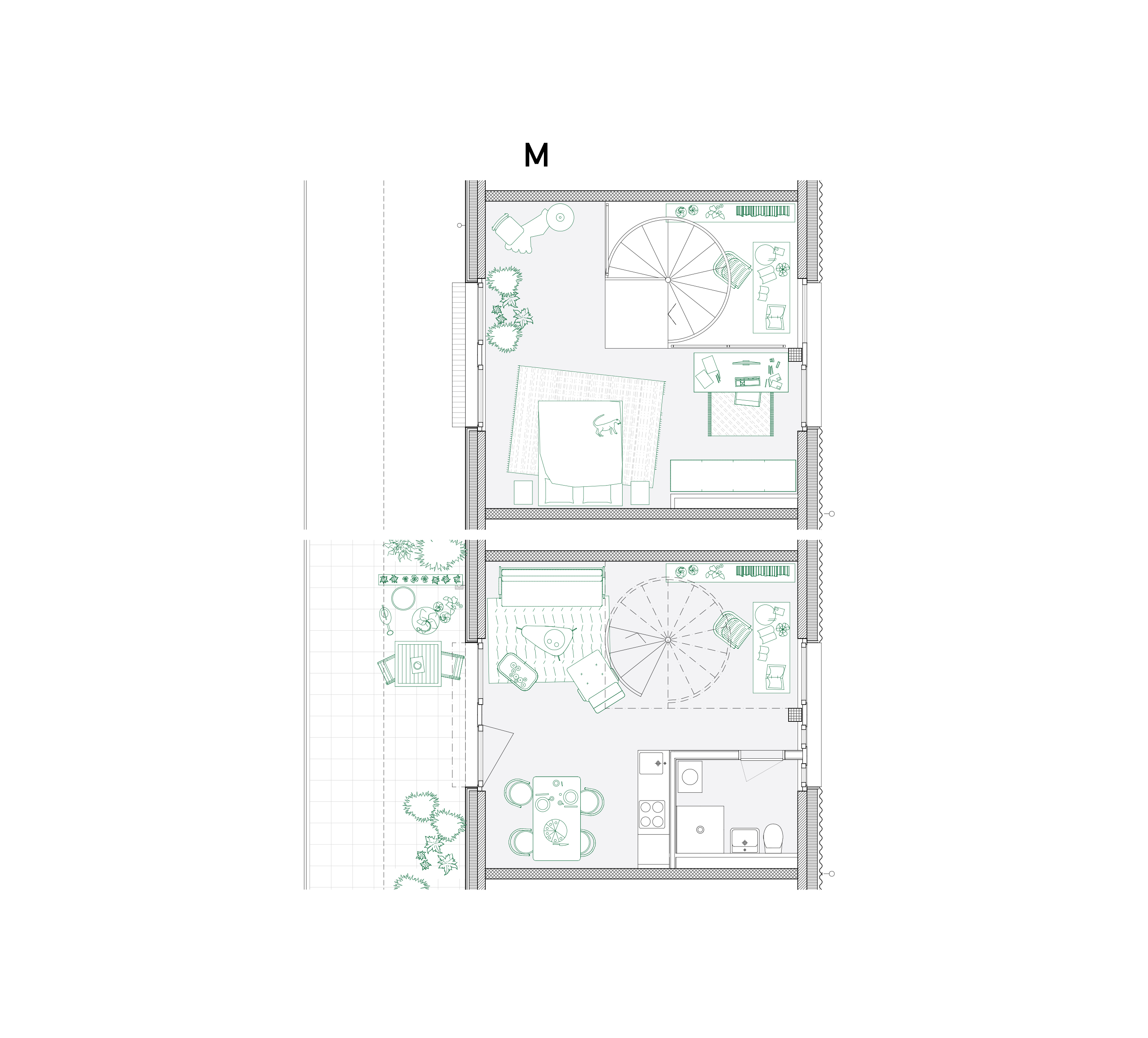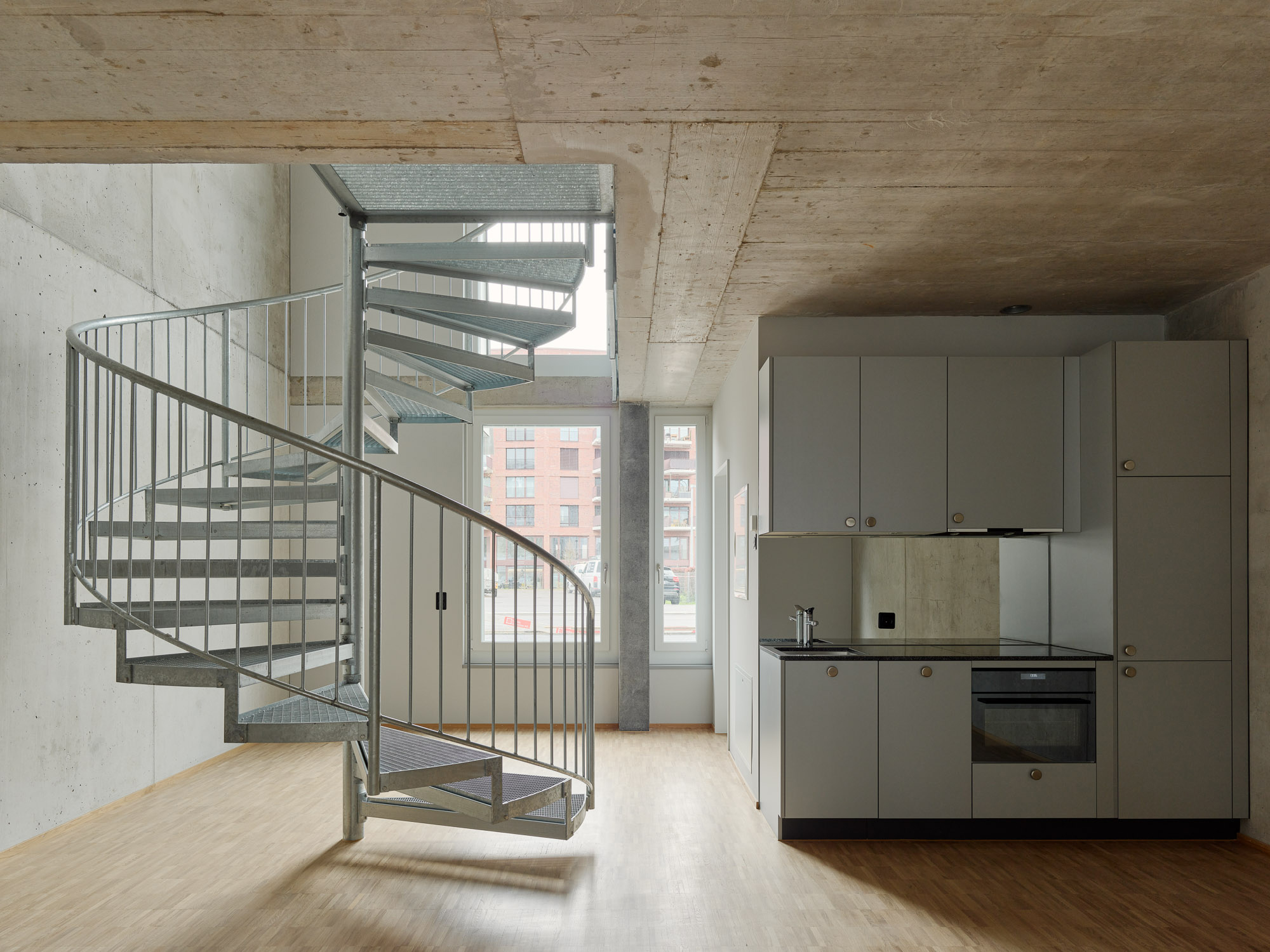 The maisonette loft consists of a two-storey spatial configuration. Defining distinct areas via partitioning walls, the maisonette loft is divided vertically into two levels that are connected by the open gallery. The fittings are limited to a necessary minimum. The basic elements in each apartment consist of a galvanized-metal spiral staircase, a bathroom and a robust, expandable kitchen.