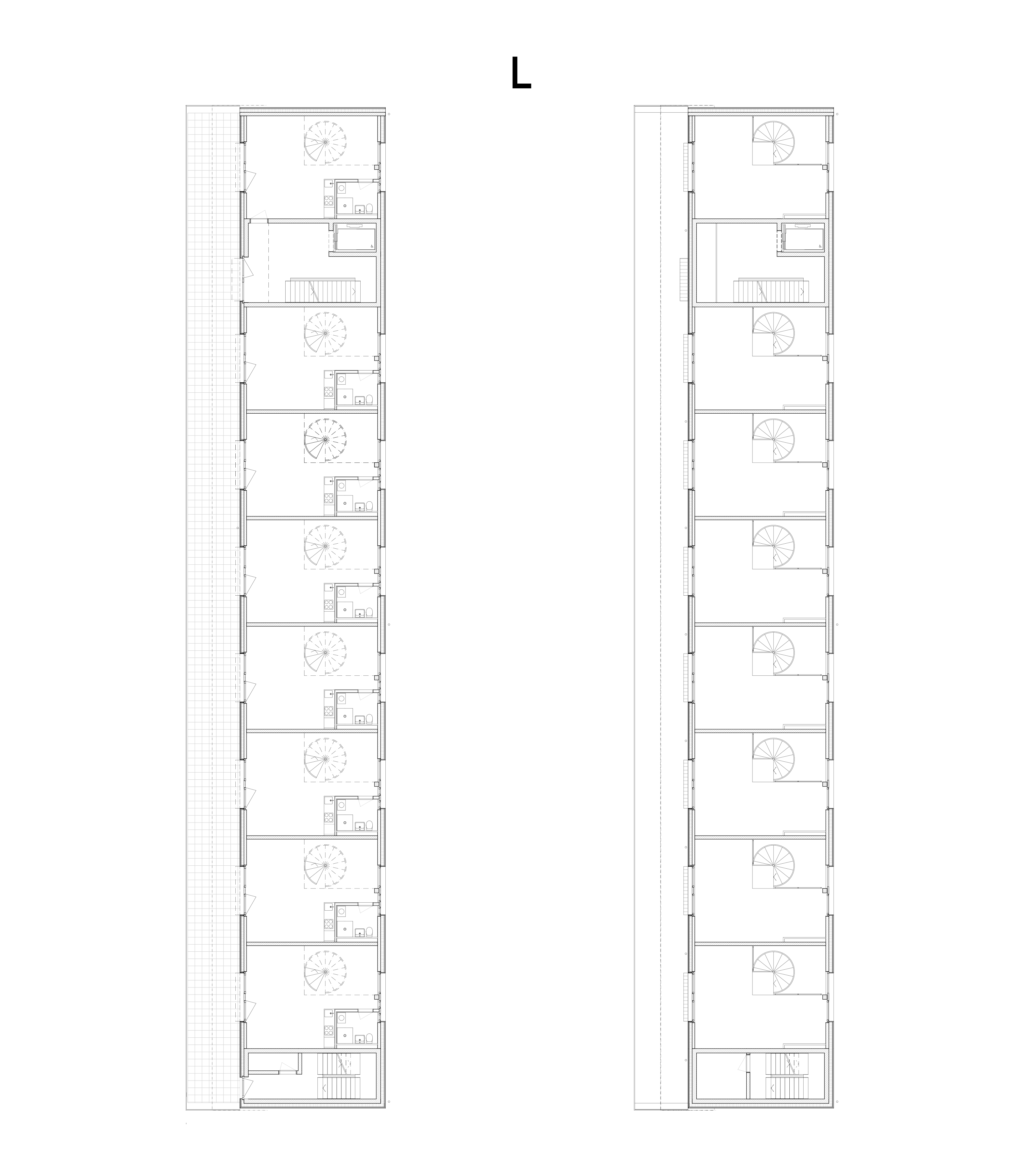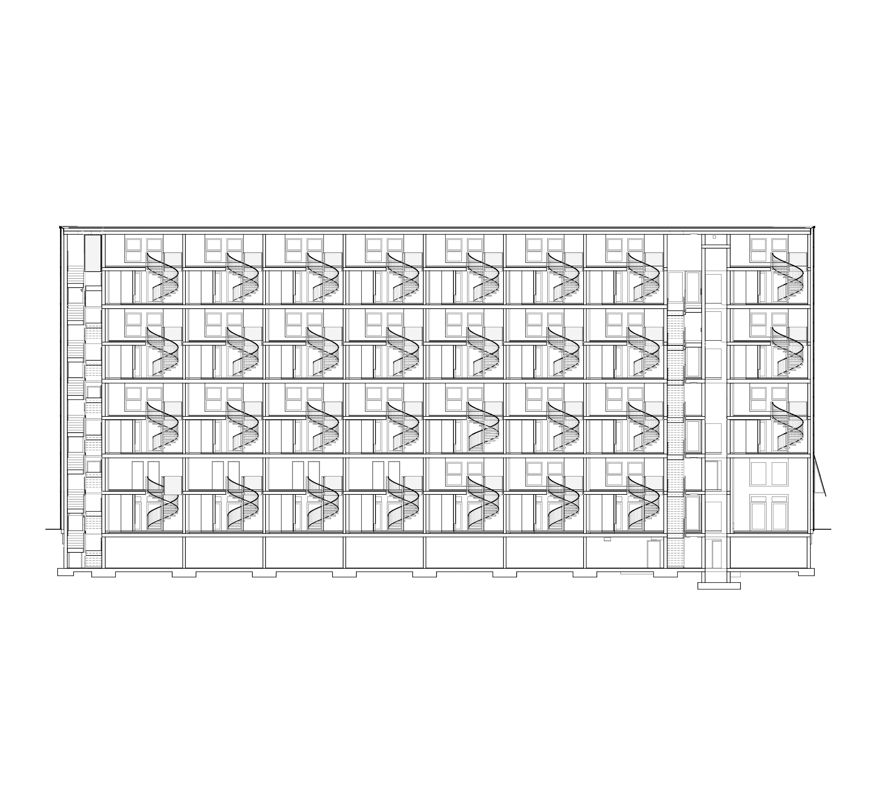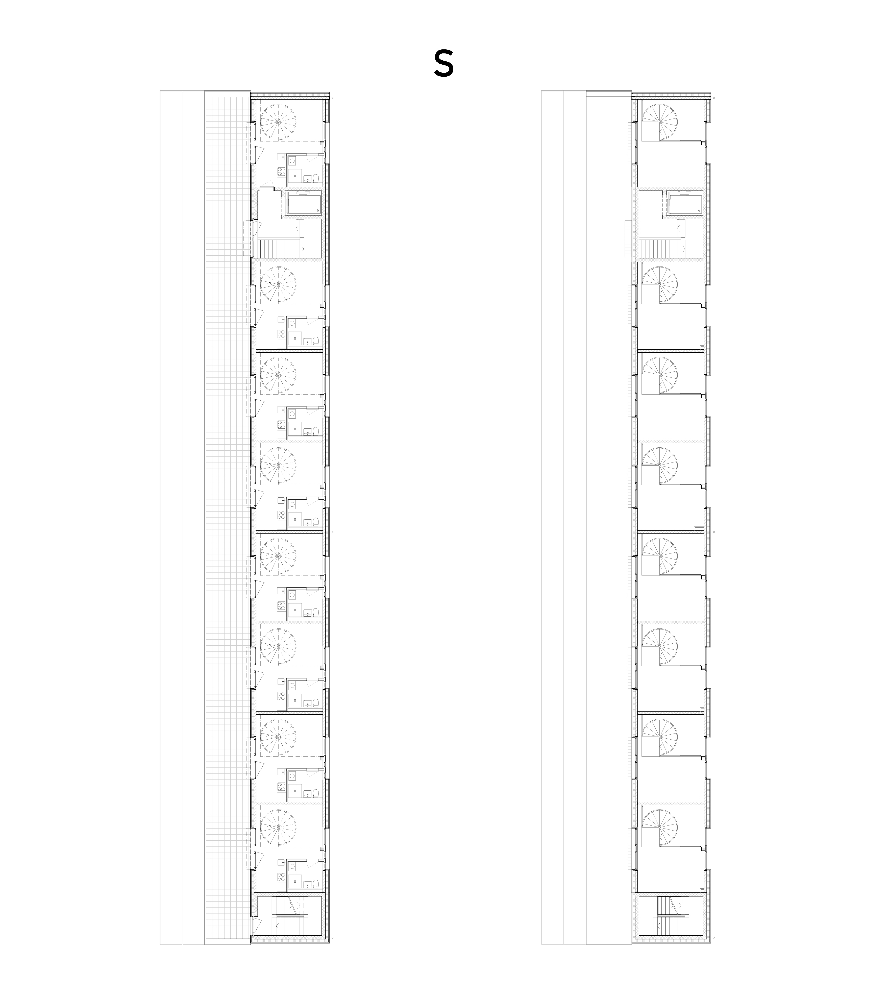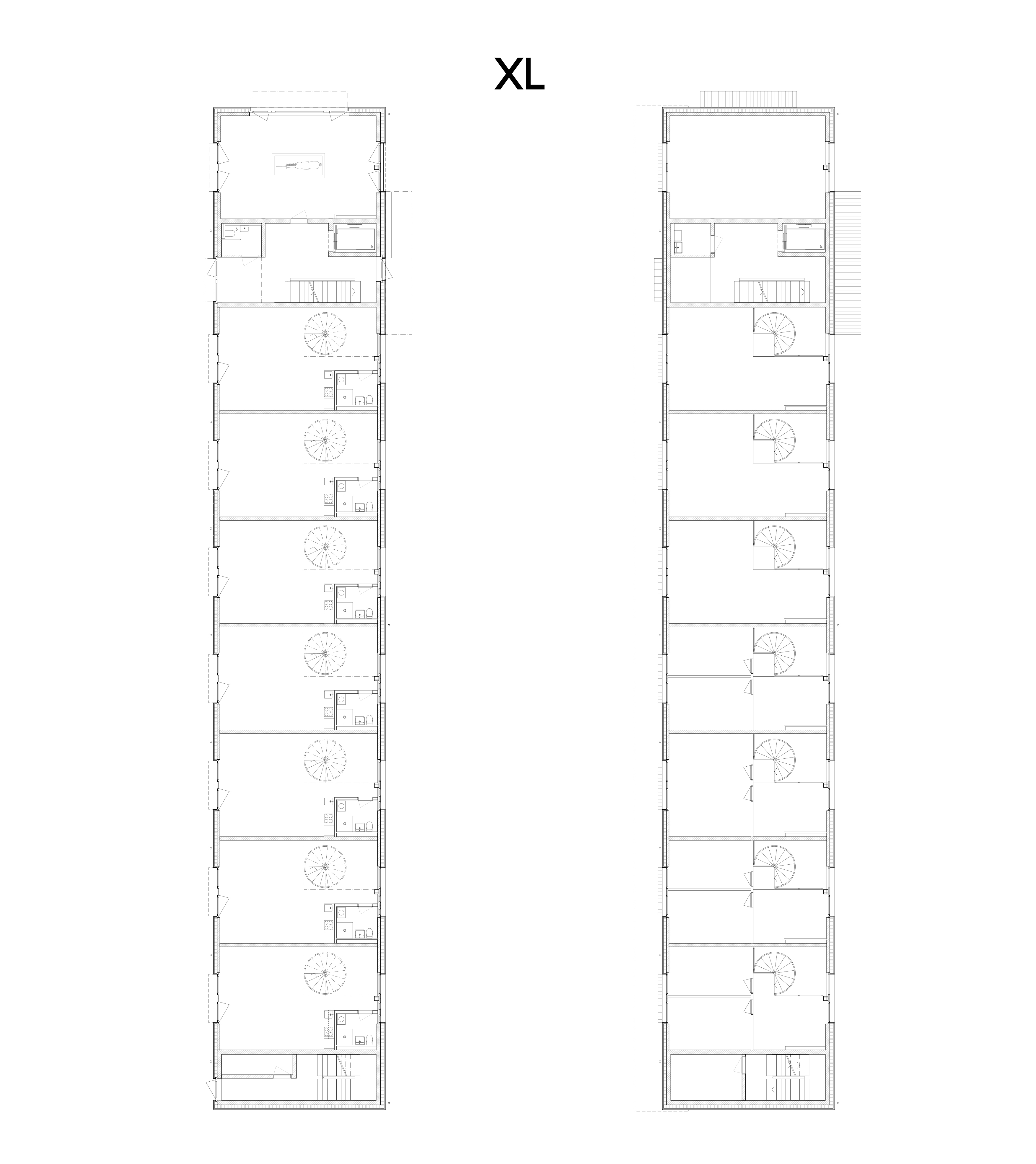 The maisonette loft consists of a two-storey spatial configuration. Defining distinct areas via partitioning walls, the maisonette loft is divided vertically into two levels that are connected by the open gallery. The fittings are limited to a necessary minimum. The basic elements in each apartment consist of a galvanized-metal spiral staircase, a bathroom and a robust, expandable kitchen.