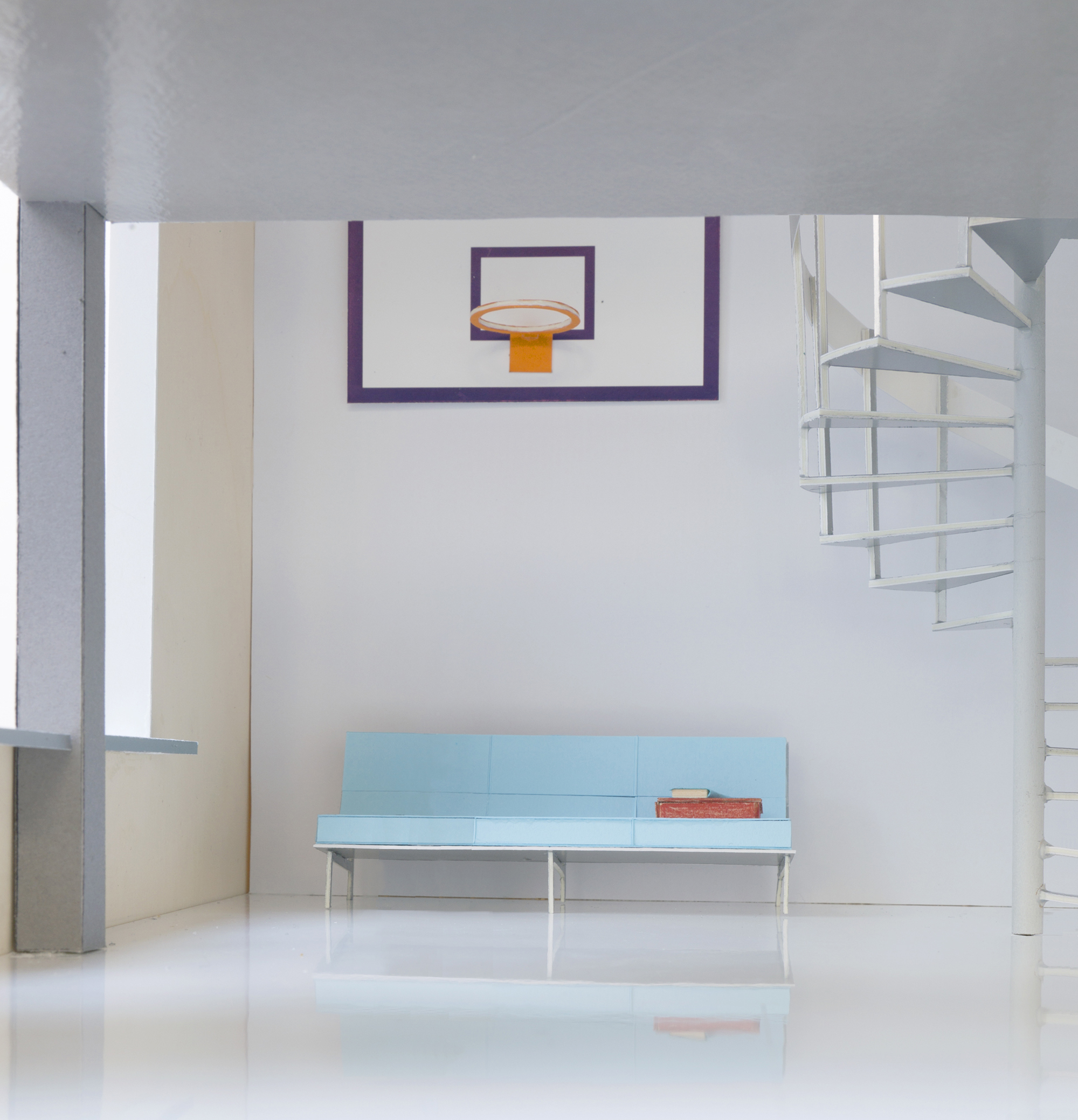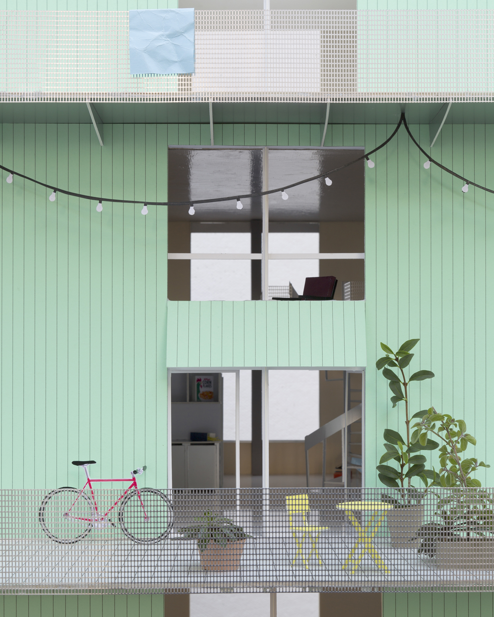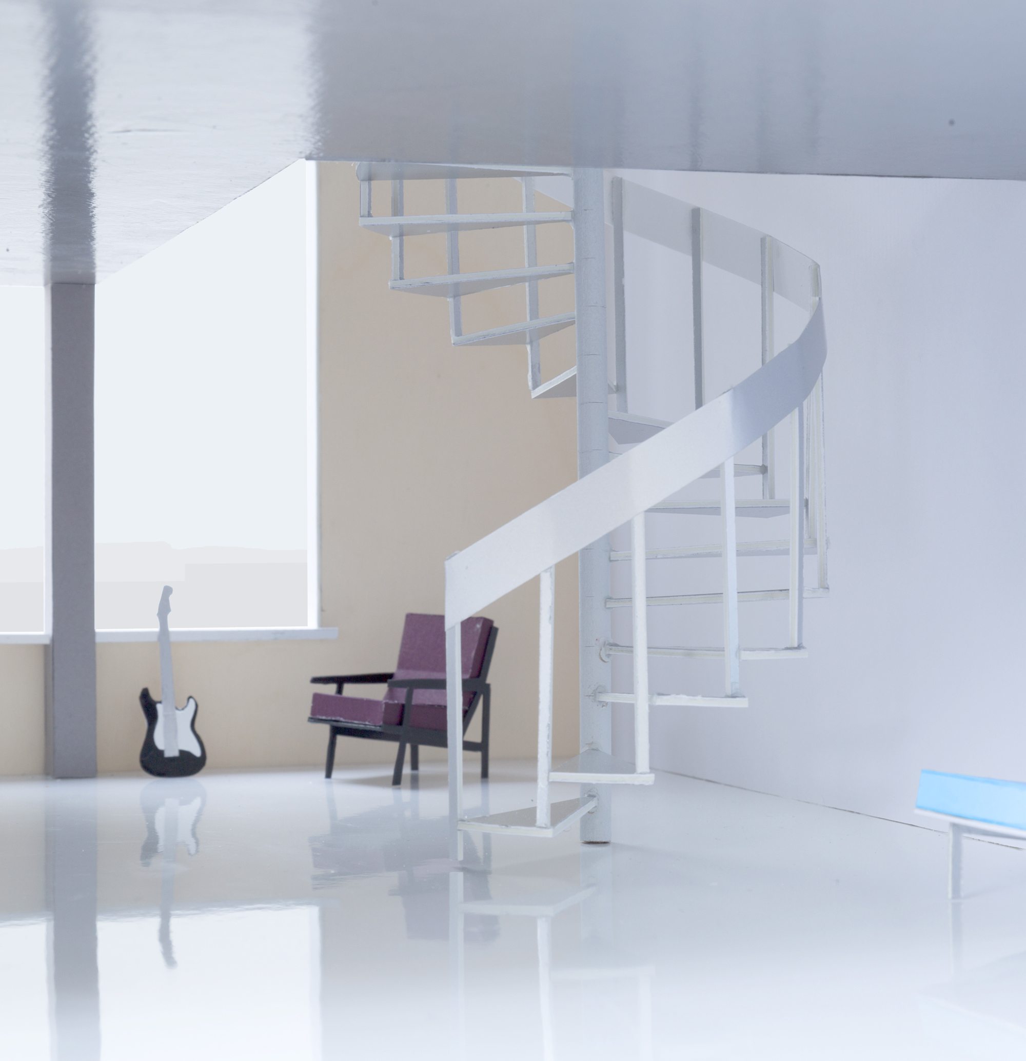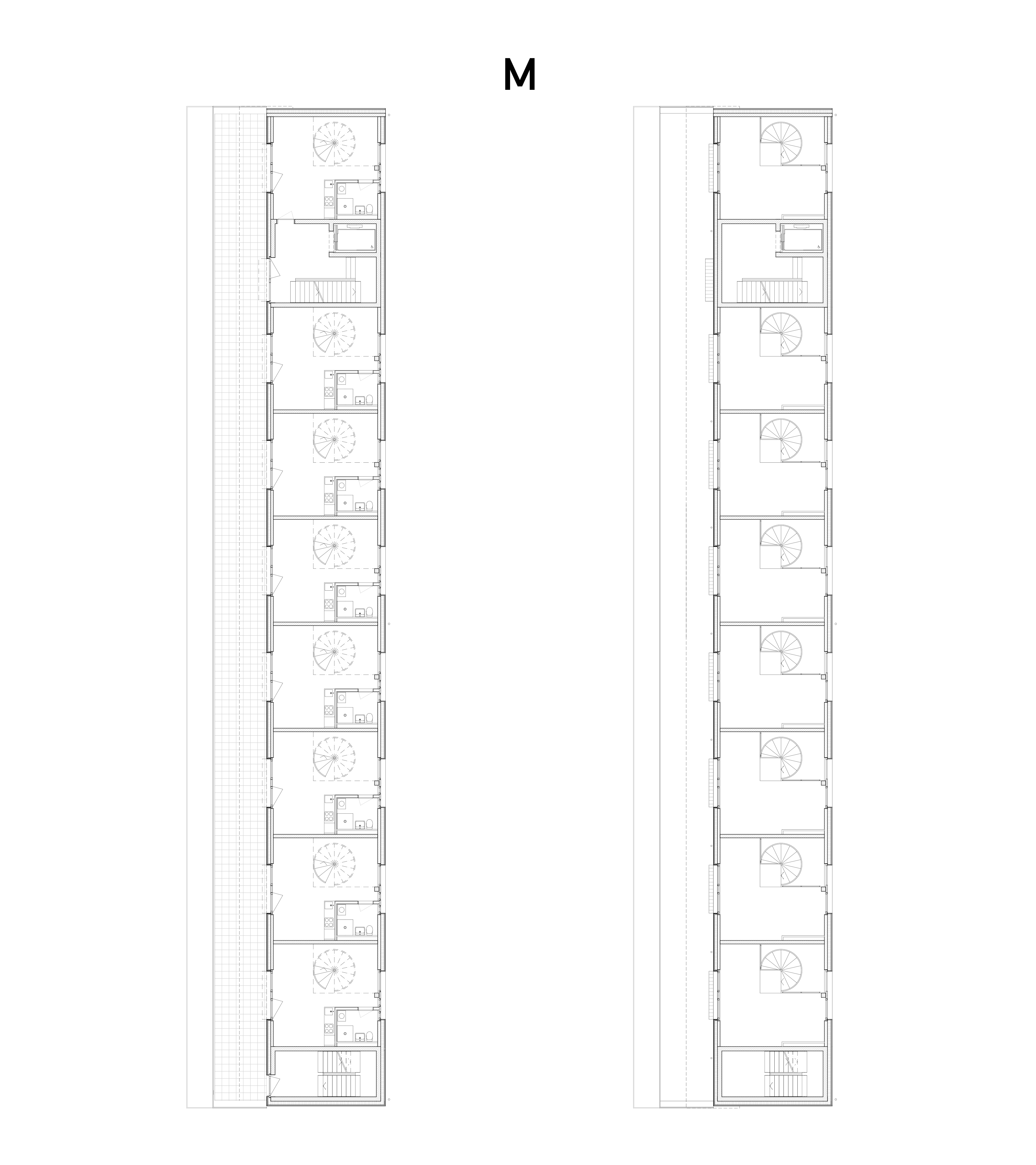 The maisonette loft consists of a two-storey spatial configuration. Defining distinct areas via partitioning walls, the maisonette loft is divided vertically into two levels that are connected by the open gallery. The fittings are limited to a necessary minimum. The basic elements in each apartment consist of a galvanized-metal spiral staircase, a bathroom and a robust, expandable kitchen.