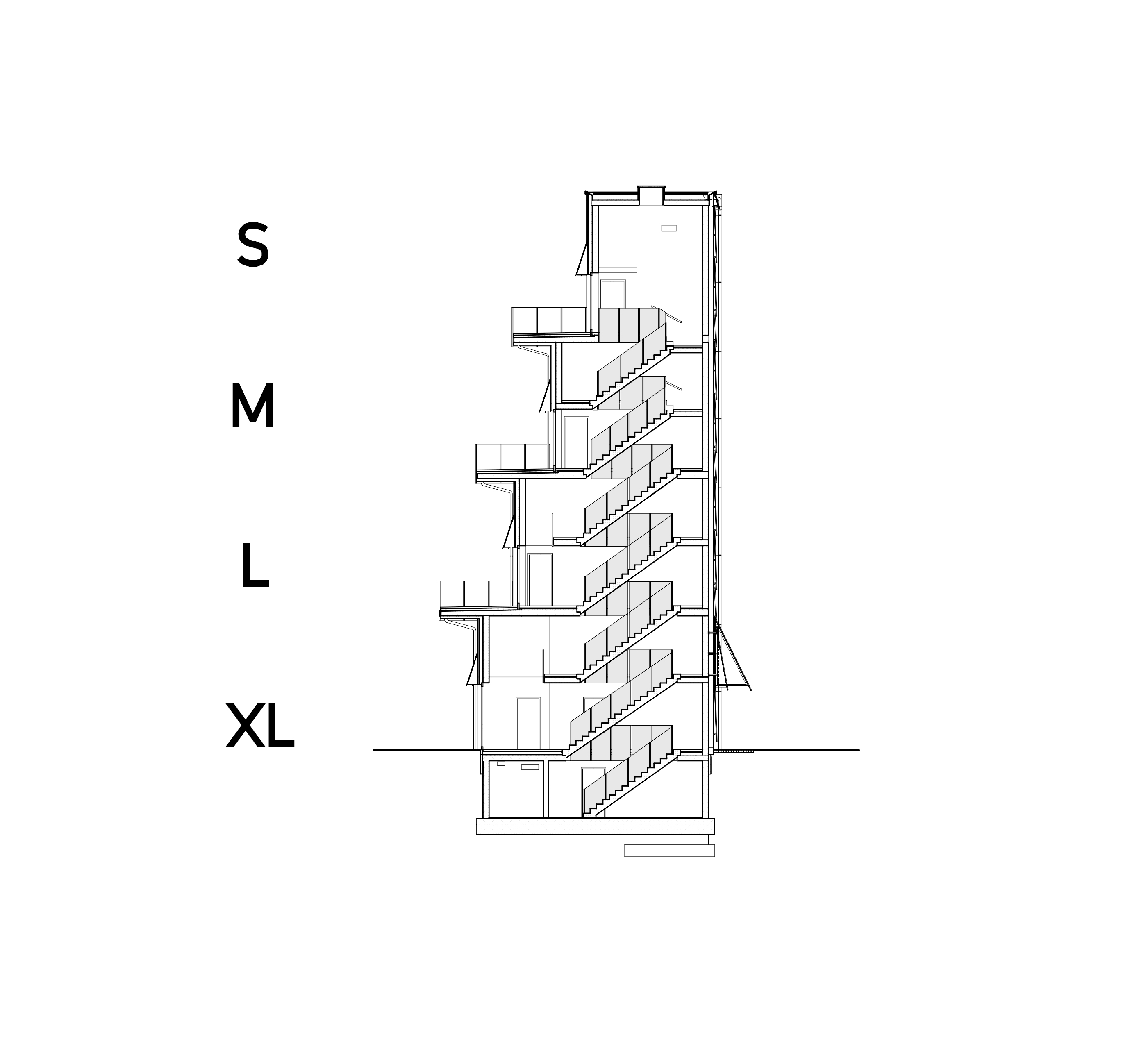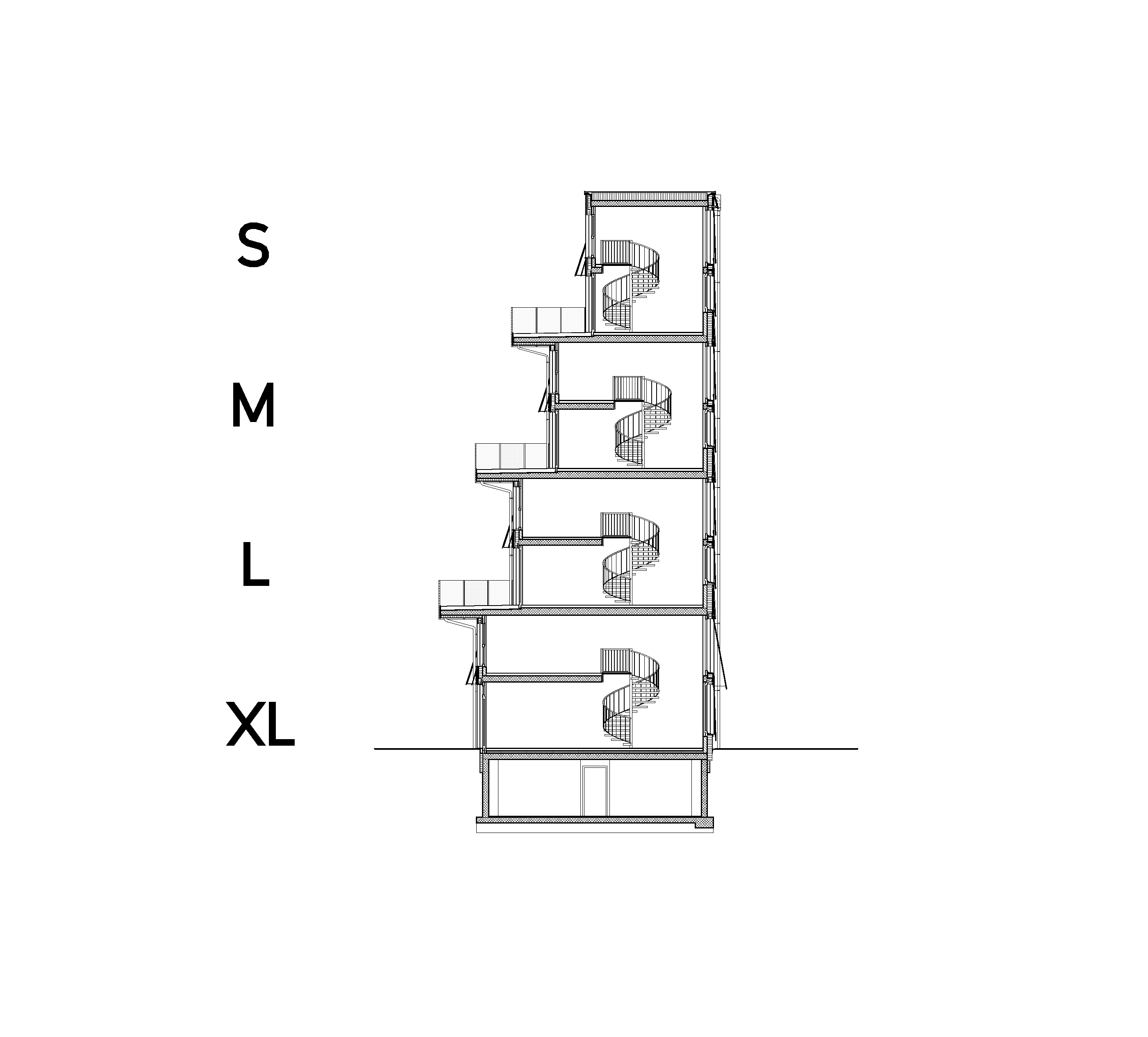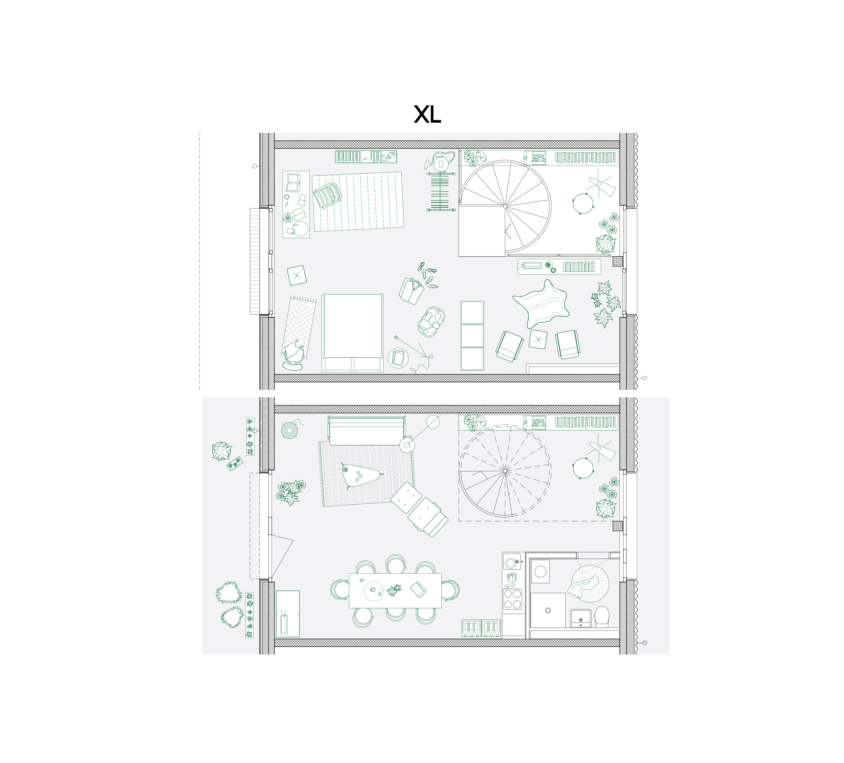 Based on the idea of sufficiency, the two-storey apartments are mainly intended for one-person or two-person households and are divided into S, M, L and XL types – not according to the number of rooms but according to their absolute size . This gives rise to a new type of apartment – the maisonette loft.