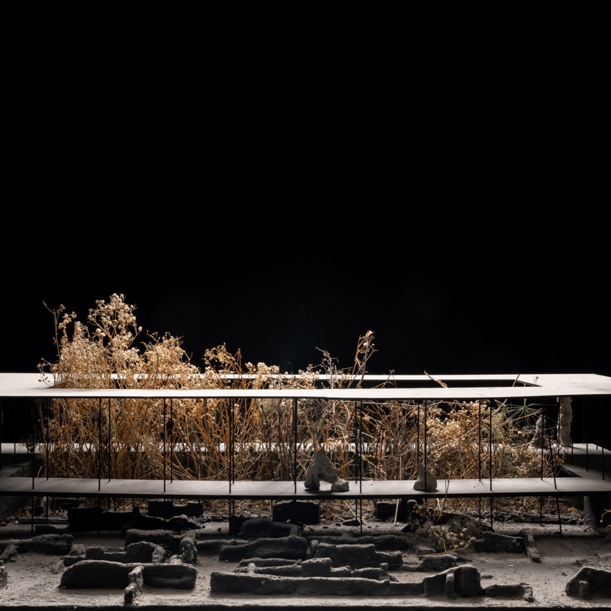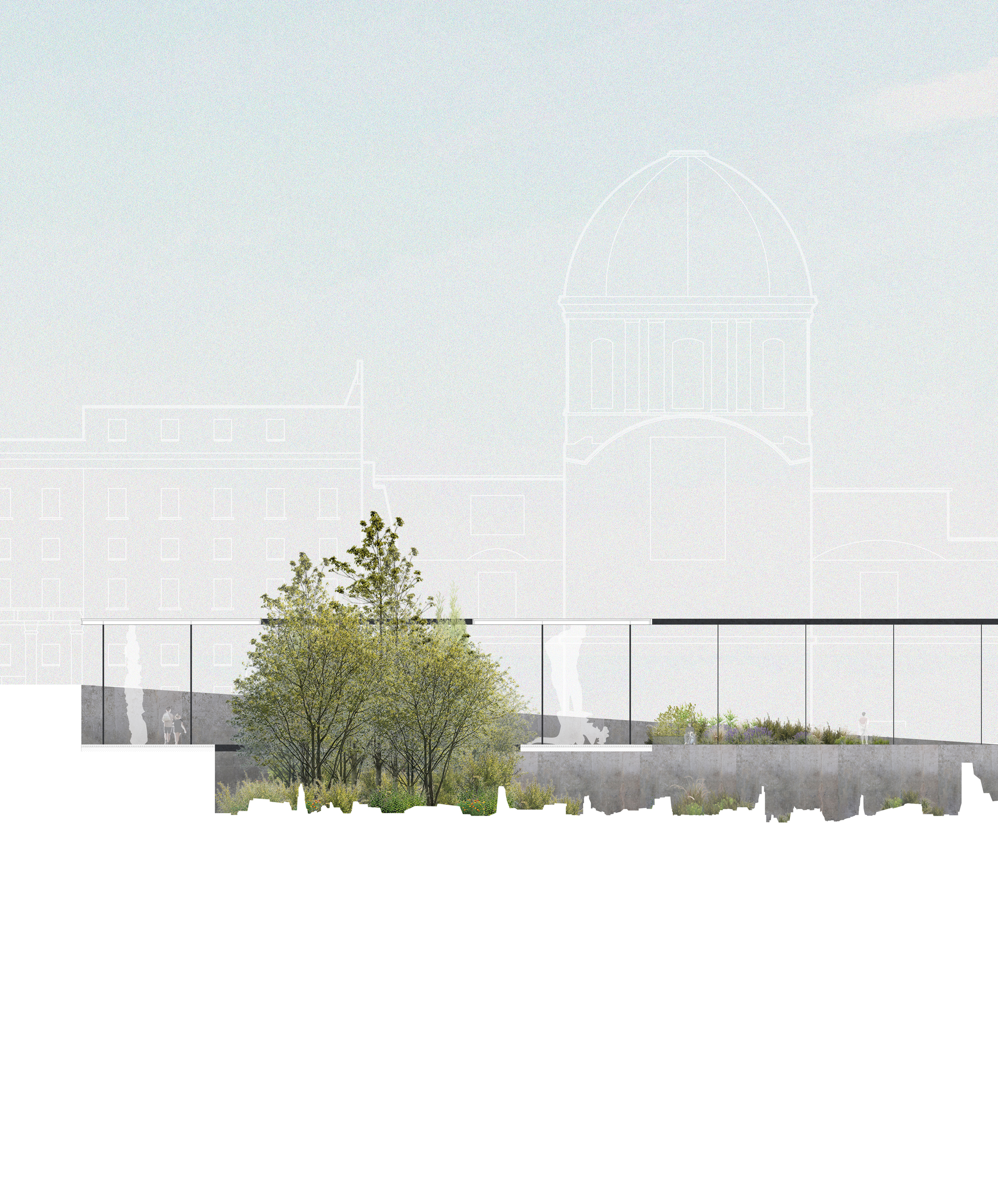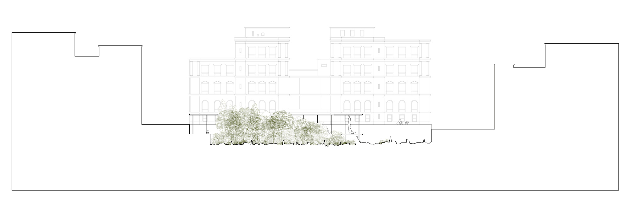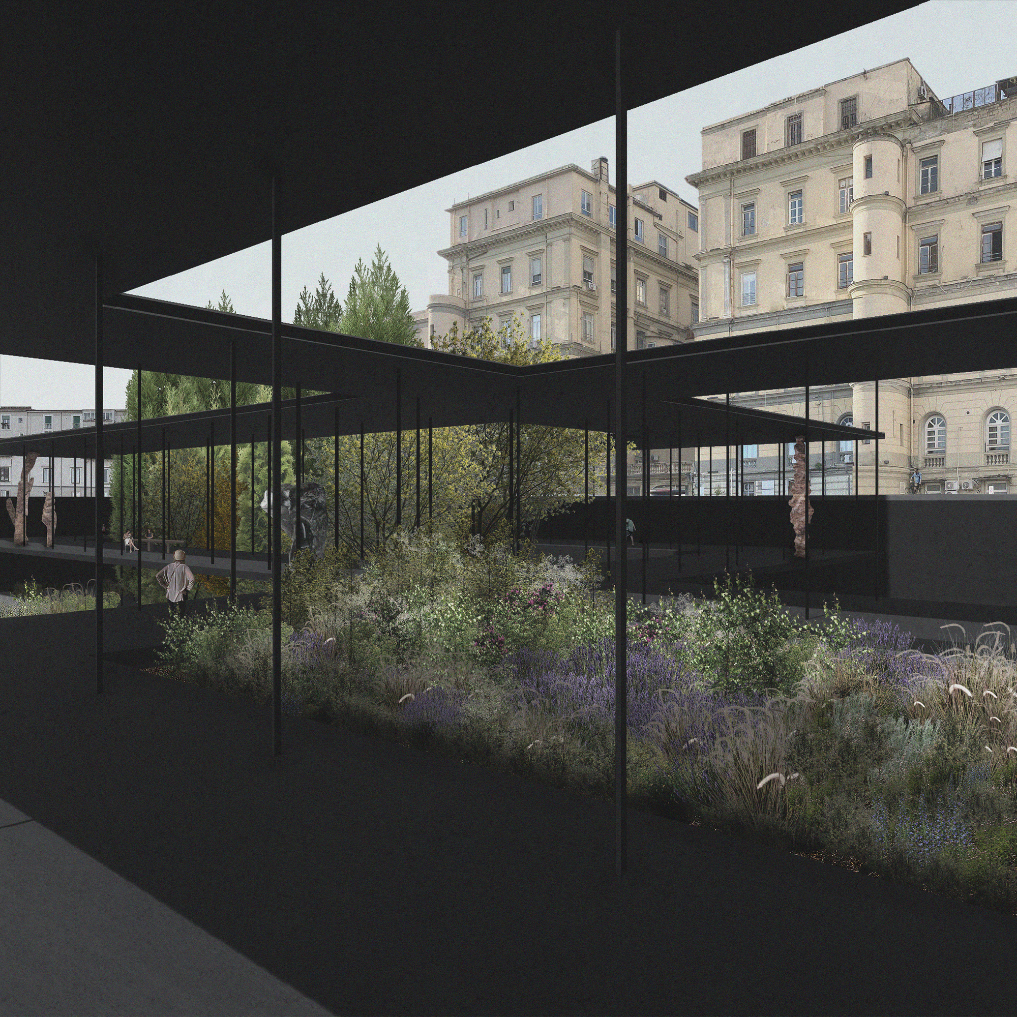 The general design strategy is a progressive diagonal from the southeast to the northwest corner. The southeast corner which is the lowest level point will be the entrance of the building. It consists four courtyards. Two of them are filled with different heights of vegetation, rising from the southeast to the northwest. The other two attached to the streets display the ruins. The depth of the eaves in the deepest courtyard is enlarged in order to provide the sense of shading. The whole building is made with dark and extremely light metal structure. The large sculptures standing in the corridor are the main structural support for the metal roof. Moving from the entrance to the deepest part, people gradually feel like walking below the ground, being hidden in the forest, and disappearing from the place. This corridor redefine the relationship between the site and its surroundings. It is an extension of the lively and the dense city; an open space that rejoins the city with a calm nature.