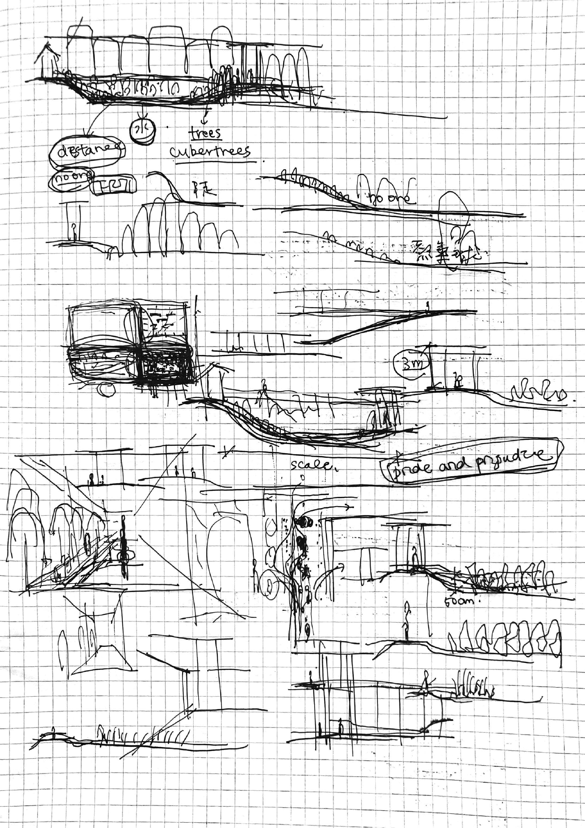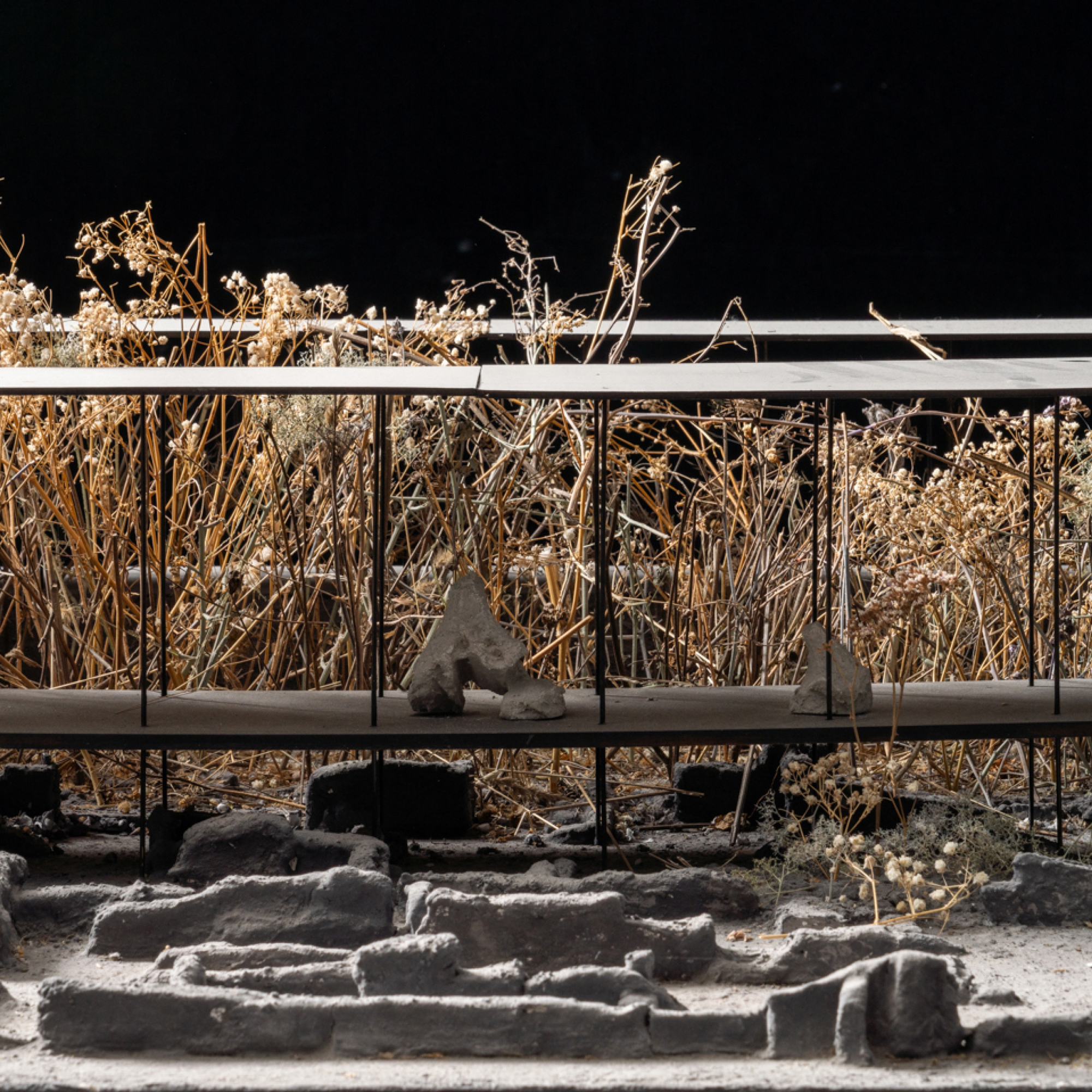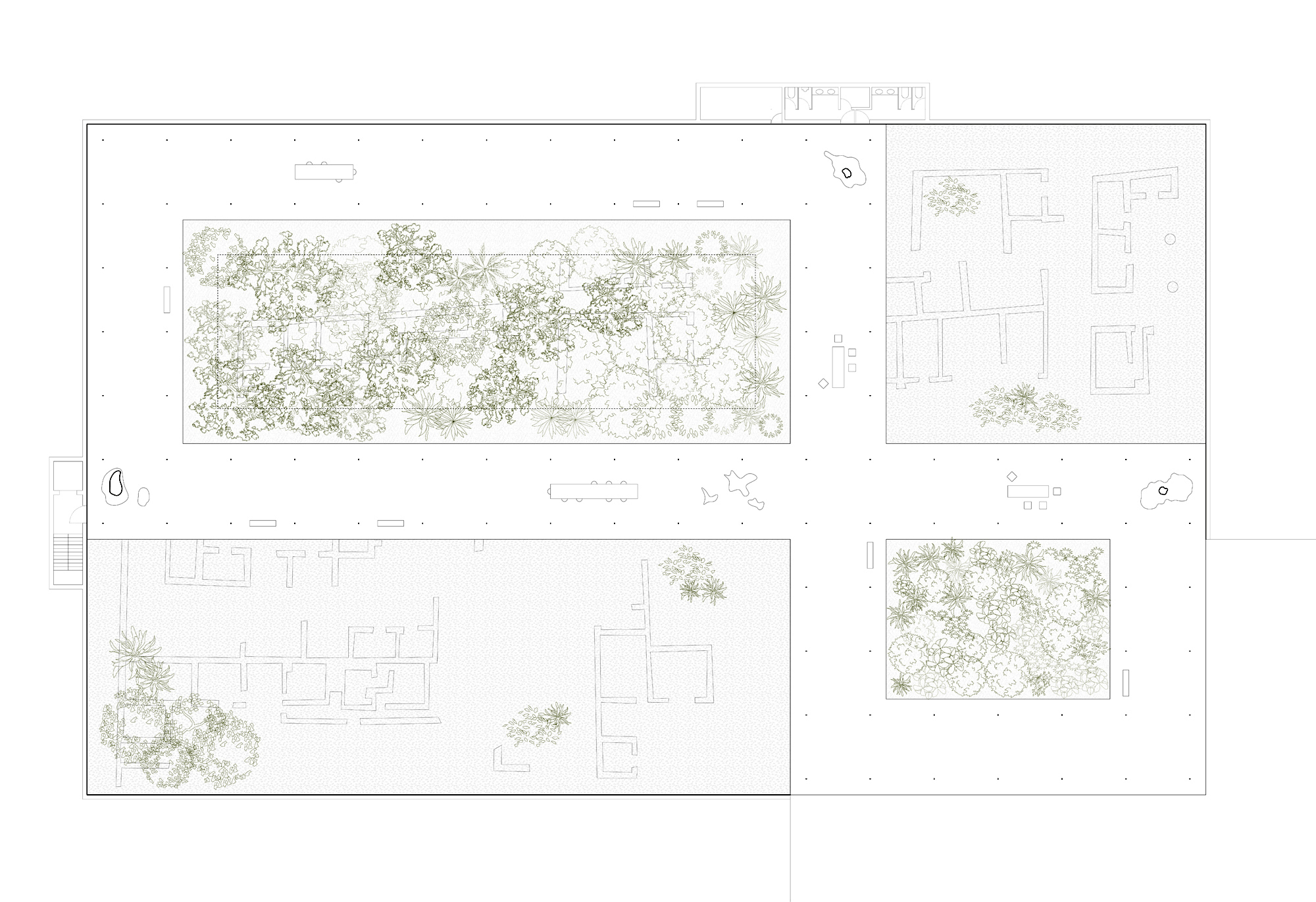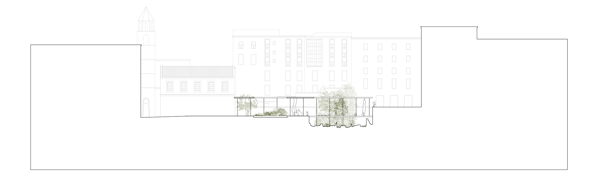 The general design strategy is a progressive diagonal from the southeast to the northwest corner. The southeast corner which is the lowest level point will be the entrance of the building. It consists four courtyards. Two of them are filled with different heights of vegetation, rising from the southeast to the northwest. The other two attached to the streets display the ruins. The depth of the eaves in the deepest courtyard is enlarged in order to provide the sense of shading. The whole building is made with dark and extremely light metal structure. The large sculptures standing in the corridor are the main structural support for the metal roof. Moving from the entrance to the deepest part, people gradually feel like walking below the ground, being hidden in the forest, and disappearing from the place. This corridor redefine the relationship between the site and its surroundings. It is an extension of the lively and the dense city; an open space that rejoins the city with a calm nature.