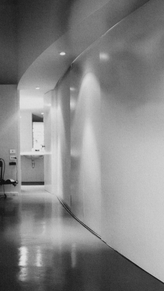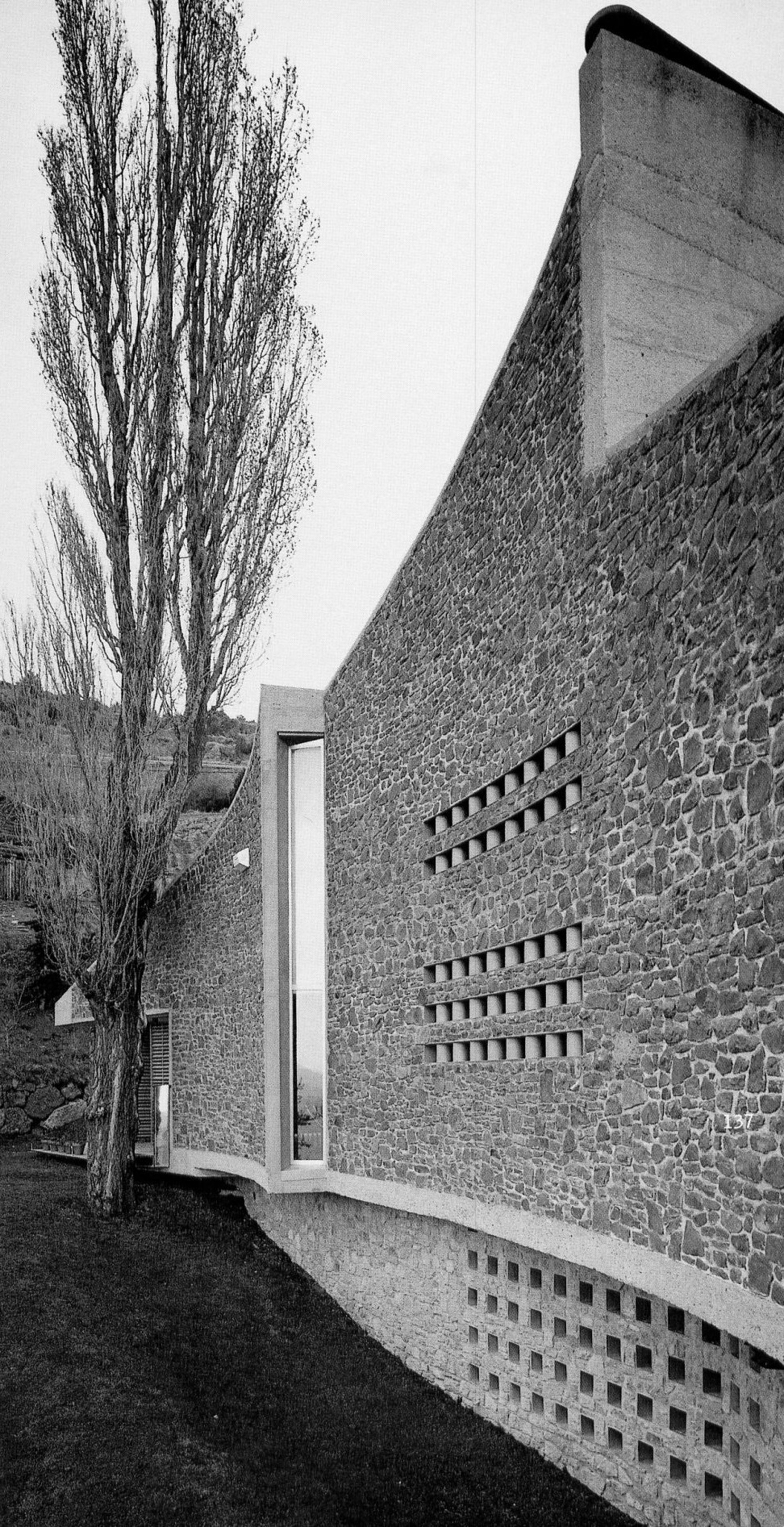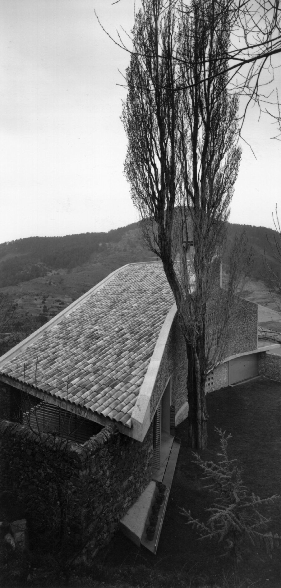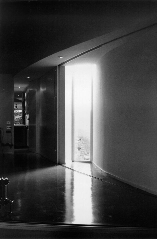 The lower level is designed to provide adequate garage space, and also room for a library. It serves, moreover, to organize the space surrounding the building by means of geometric features that reflect the site’s relief and the scenery: the result is a series of descending, interconnected terraces that are accessible from the house. This is also the reason for the irregular shape of the floor plan.
