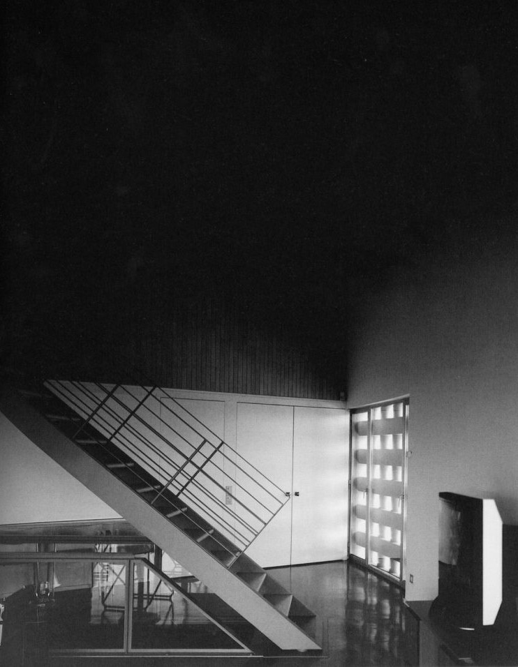 The upper or access floor makes full use of the foundation afforded by the lower level, although, without the restrictions imposed by contact with the ground, it is able to relate more openly and freely to the landscape. At the back of the house it faces directly over a patio.