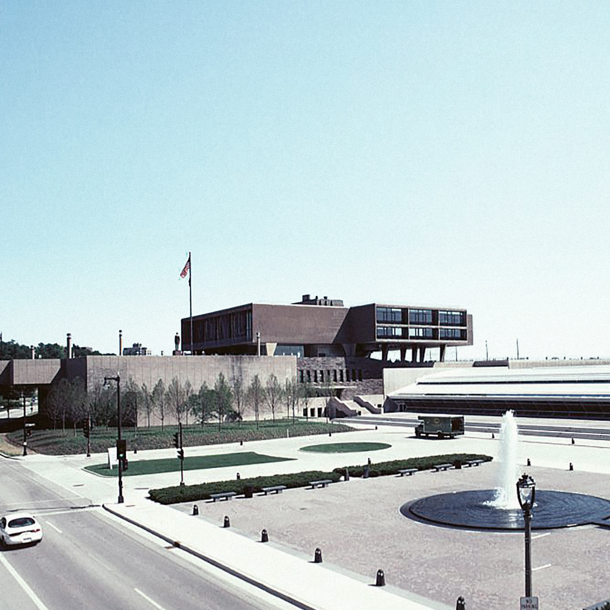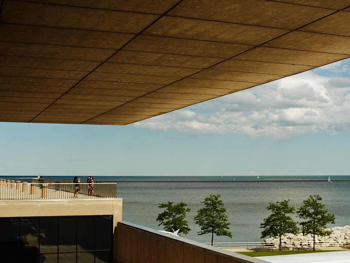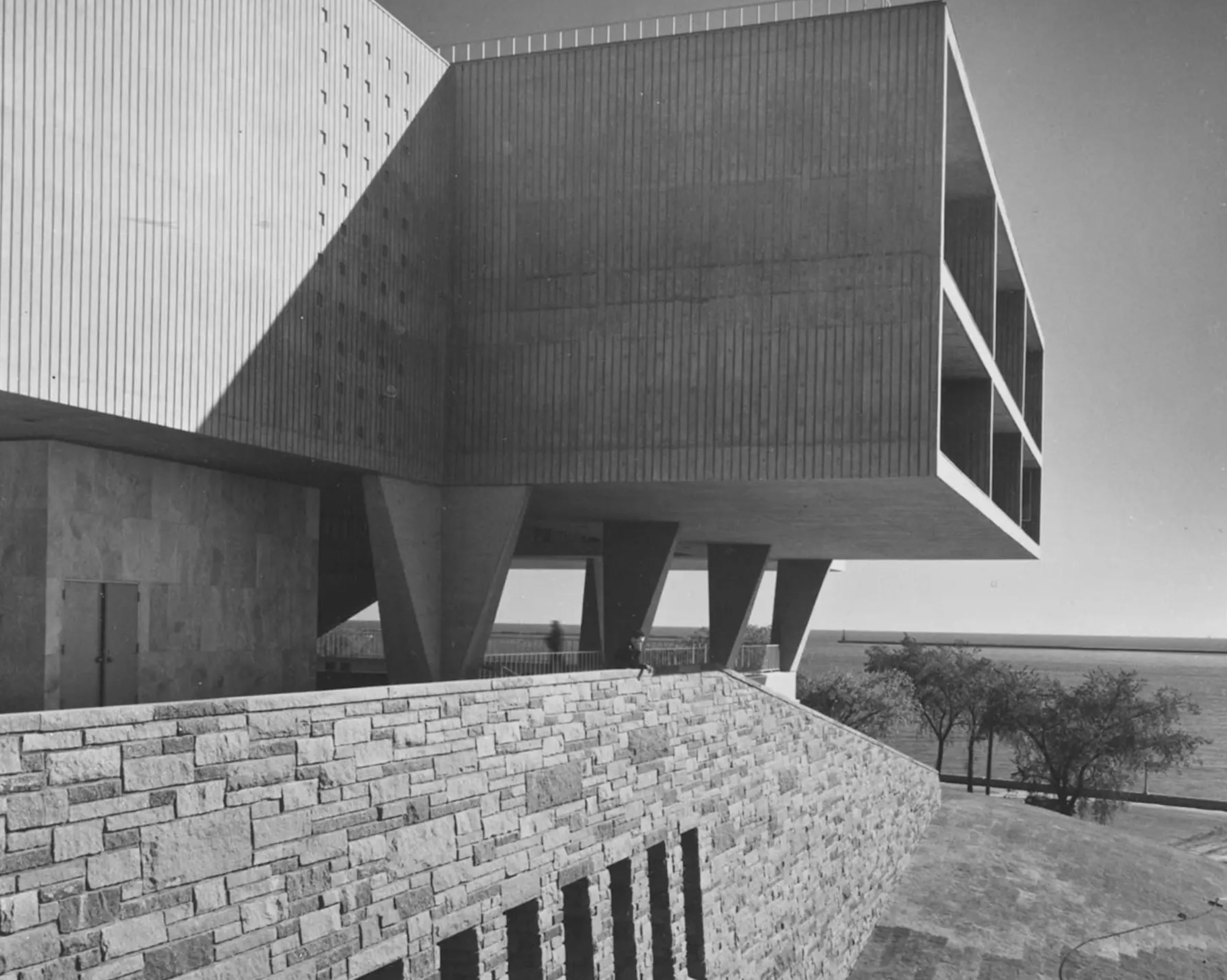 After World War II, Finnish architect Eliel Saarinen was commissioned to create an arts complex on the Lake Michigan shore, with a museum, performing arts center, and veterans’ memorial. After the architect died in 1950, his son Eero Saarinen took over the project. When fundraising proved insufficient, Saarinen reconfigured the plan without the performance space. Construction began in 1955, supervised by Milwaukee architects Maynard W. Meyer & Associates.