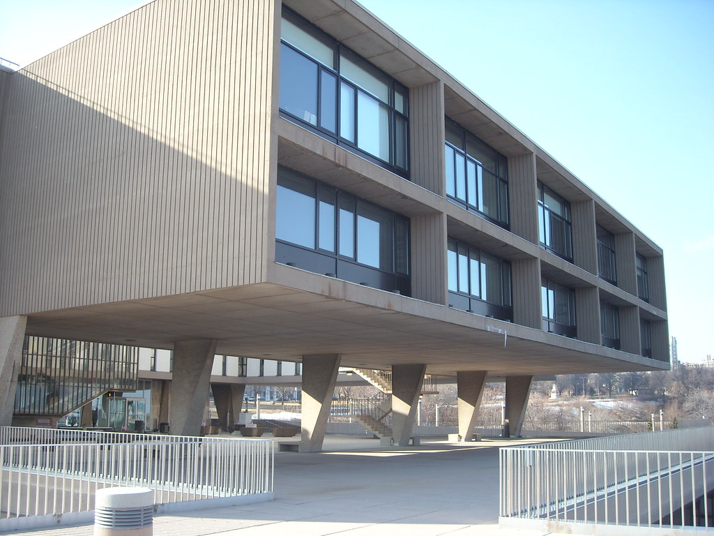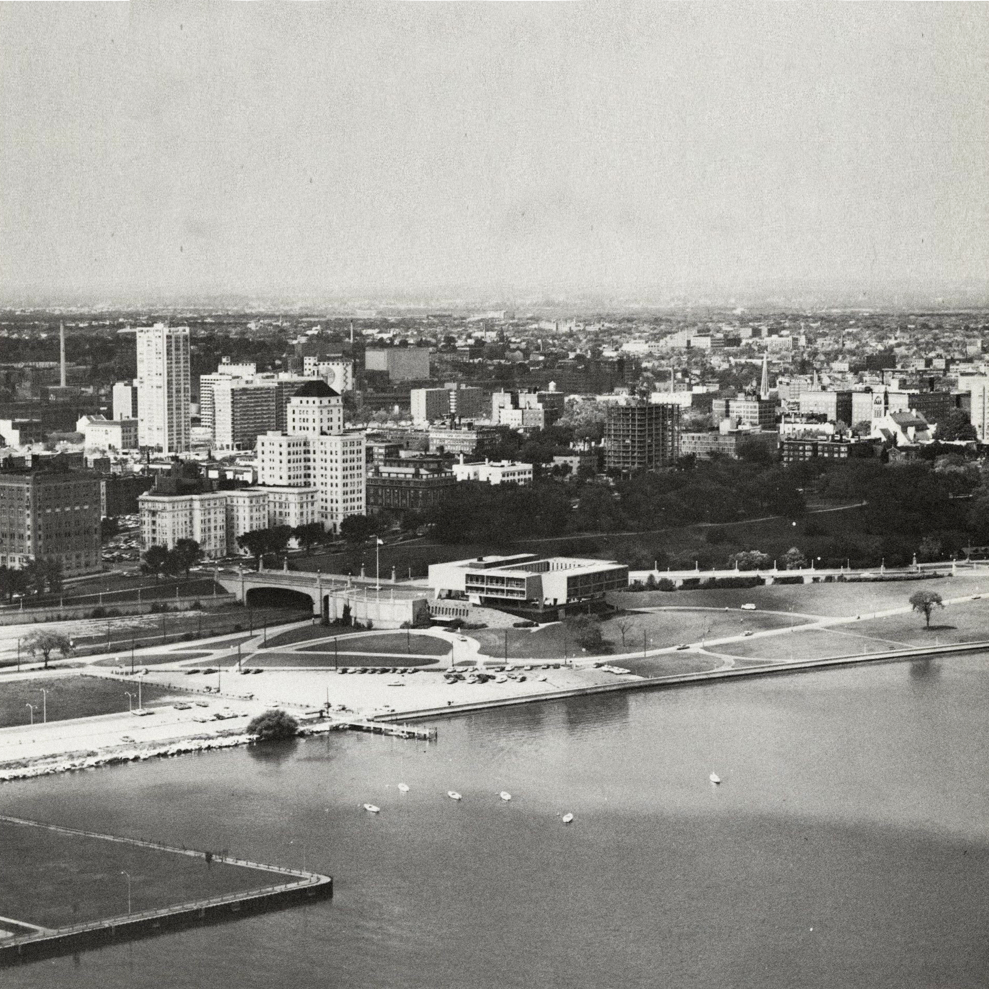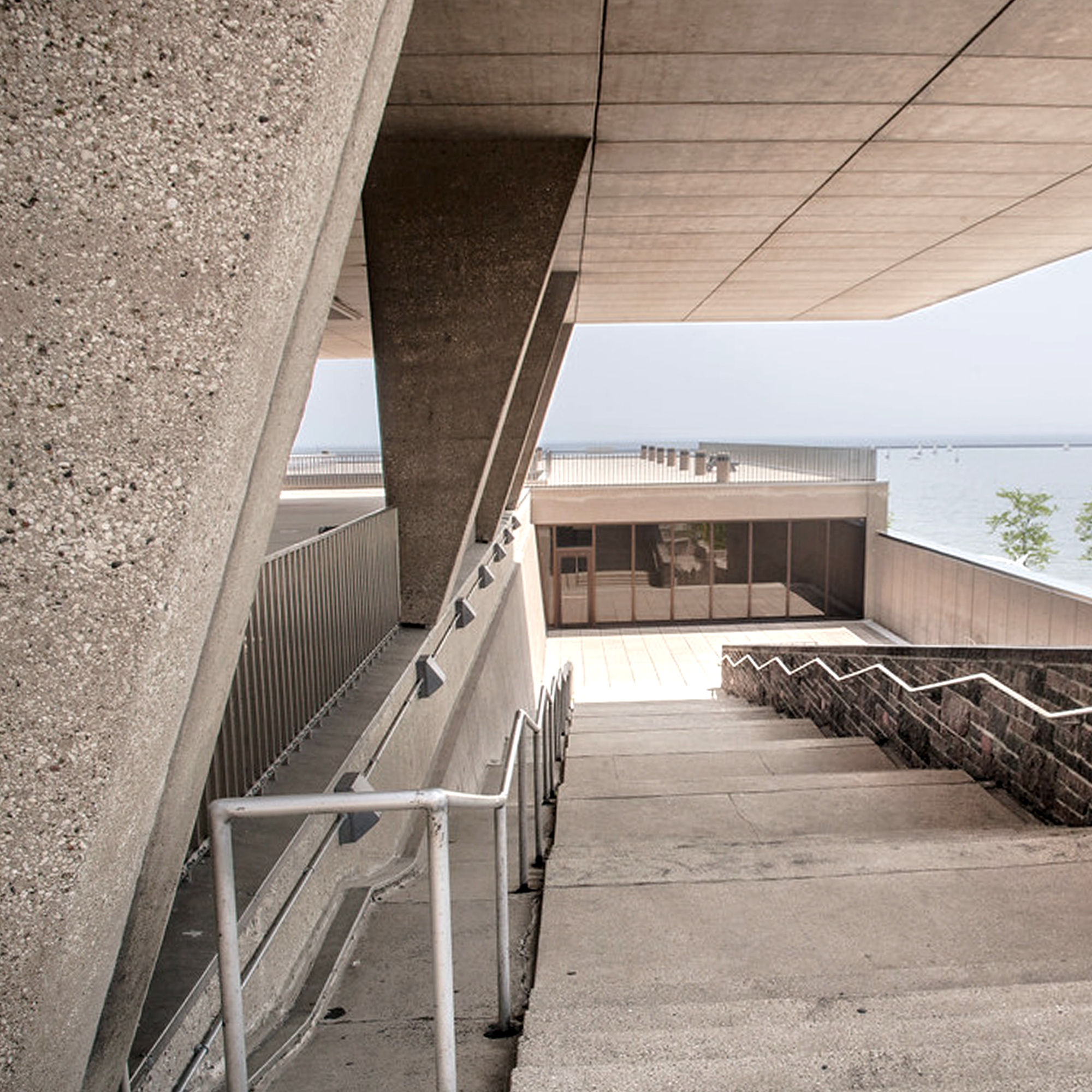After World War II, Finnish architect Eliel Saarinen was commissioned to create an arts complex on the Lake Michigan shore, with a museum, performing arts center, and veterans’ memorial. After the architect died in 1950, his son Eero Saarinen took over the project. When fundraising proved insufficient, Saarinen reconfigured the plan without the performance space. Construction began in 1955, supervised by Milwaukee architects Maynard W. Meyer & Associates.