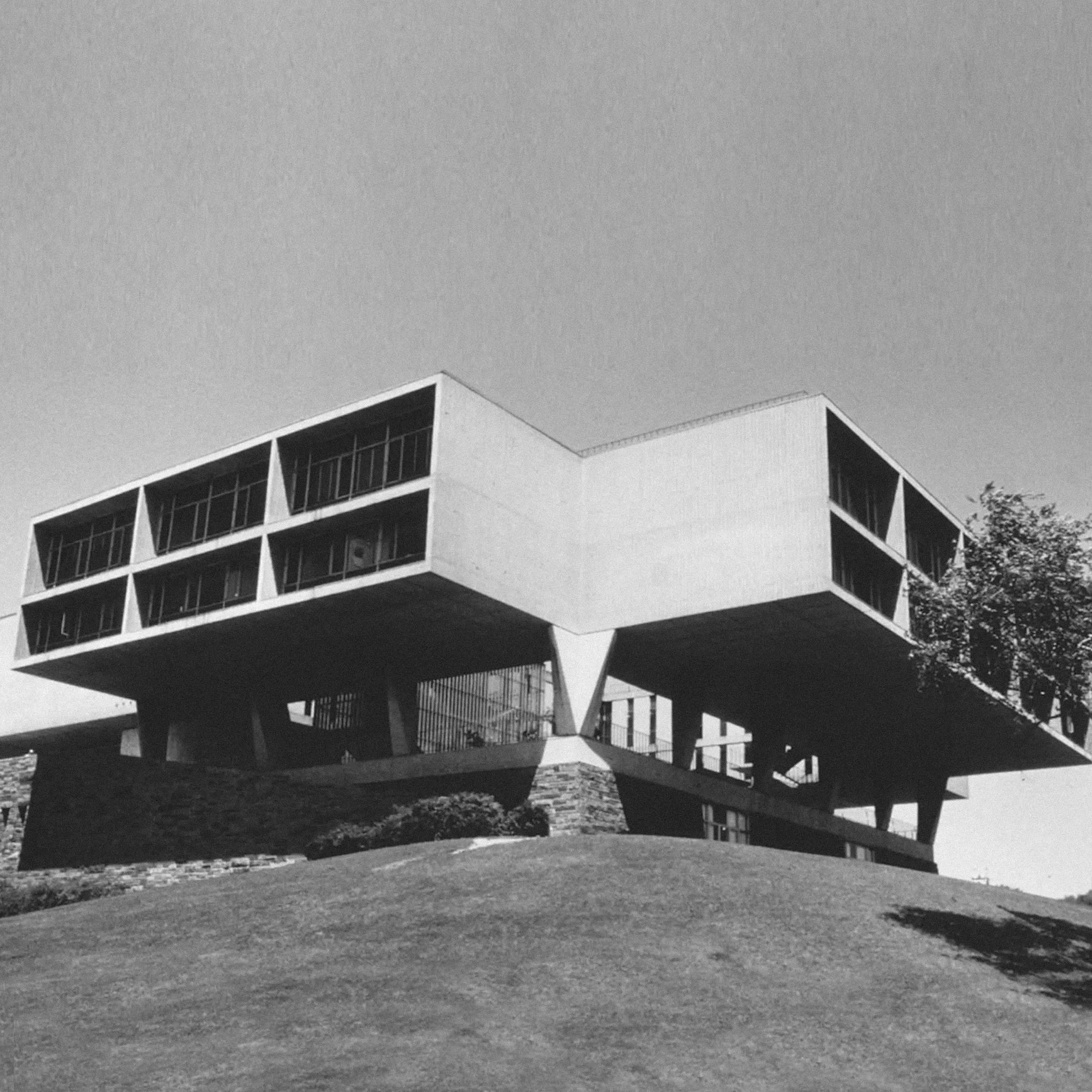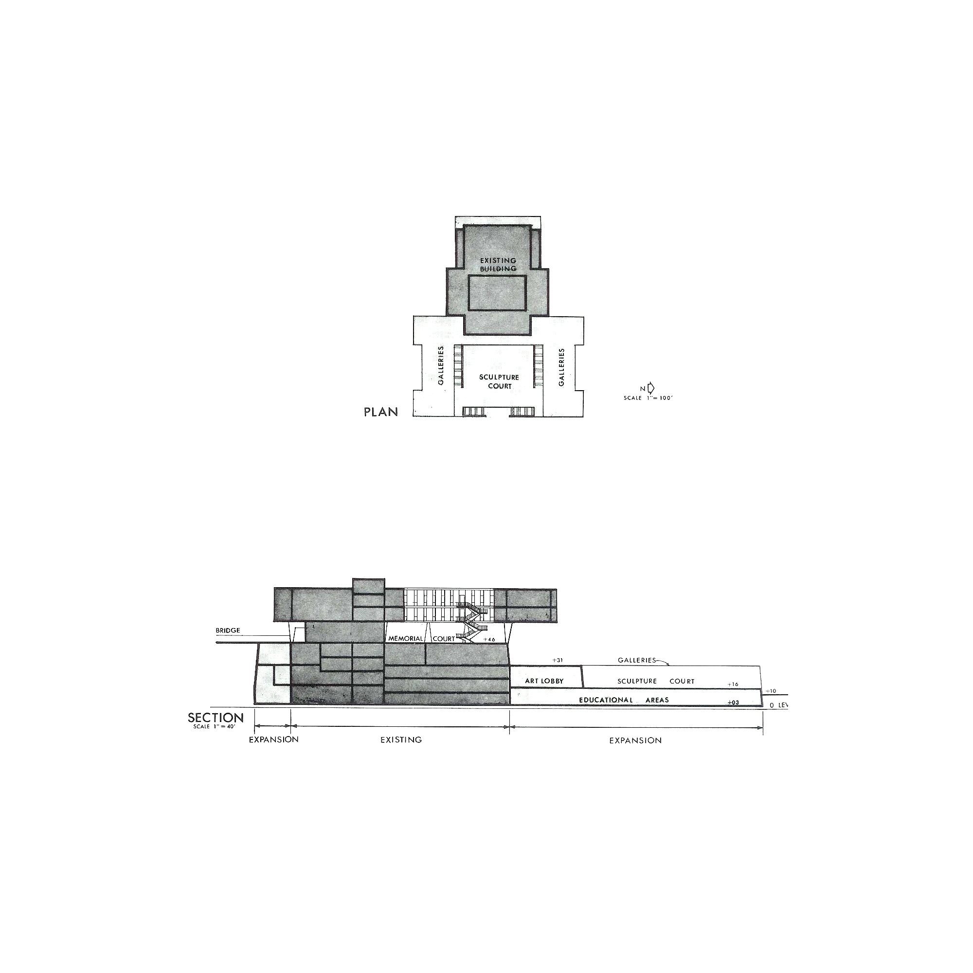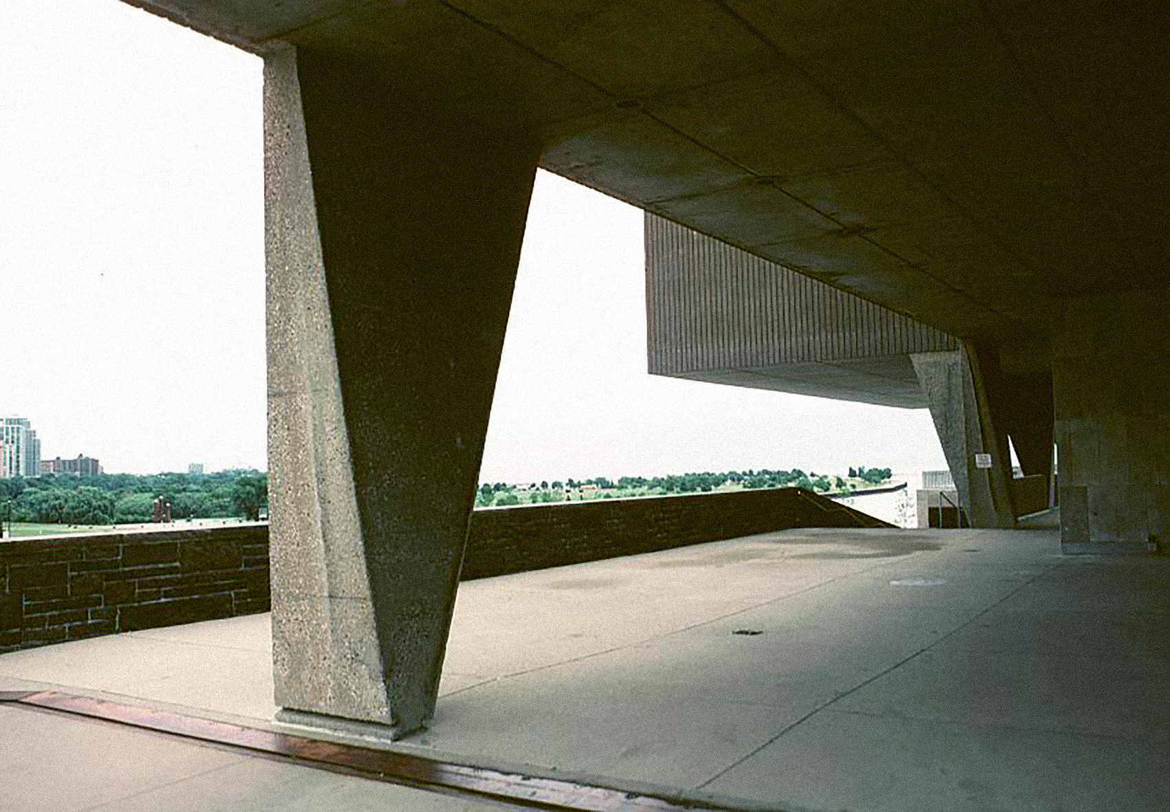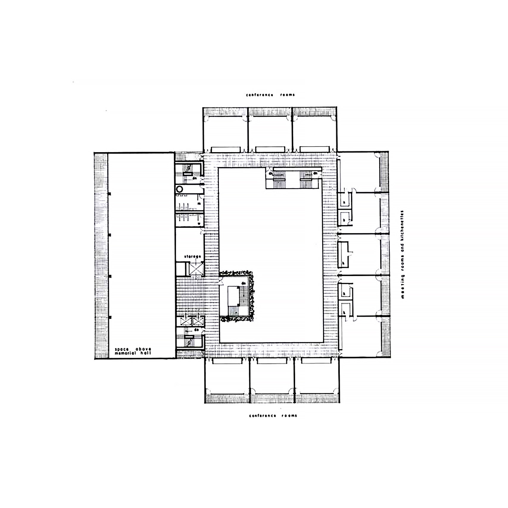 The building, a concrete, steel, and glass cruciform floating on a pedestal, included three major components, as Saarinen described: “One is the base, which builds the mass up to the city level and contains an art museum; the second, on the city level, is the memorial court with a pool. The court is surrounded by the polyhedron-shaped piers, which support the building and also make frames for the breathtaking views of the lake and sky. The third part is the superstructure, cantilevered outward thirty feet in three directions, which contains the meeting halls and offices of the veterans’ organizations.”