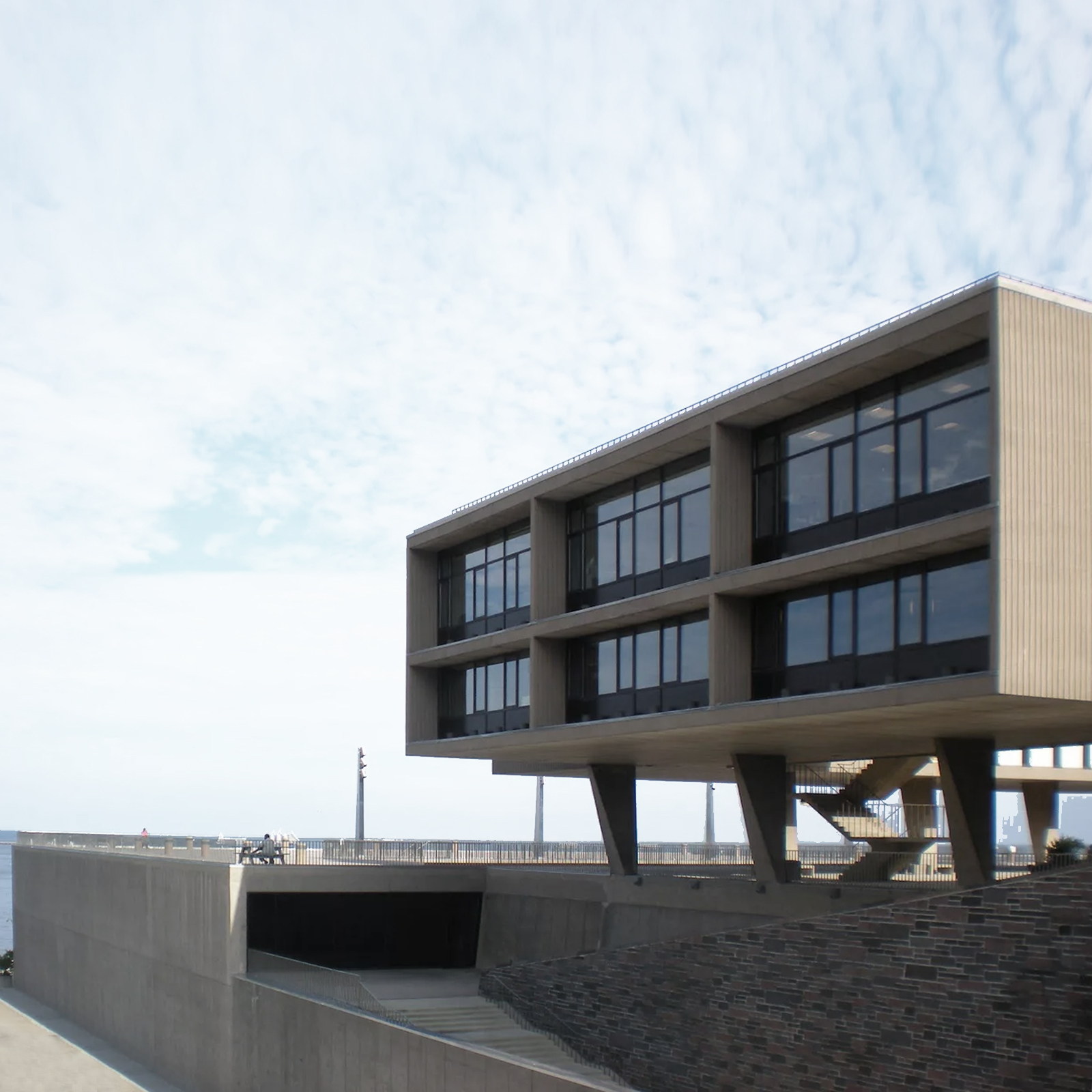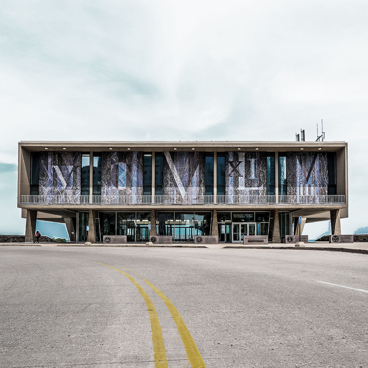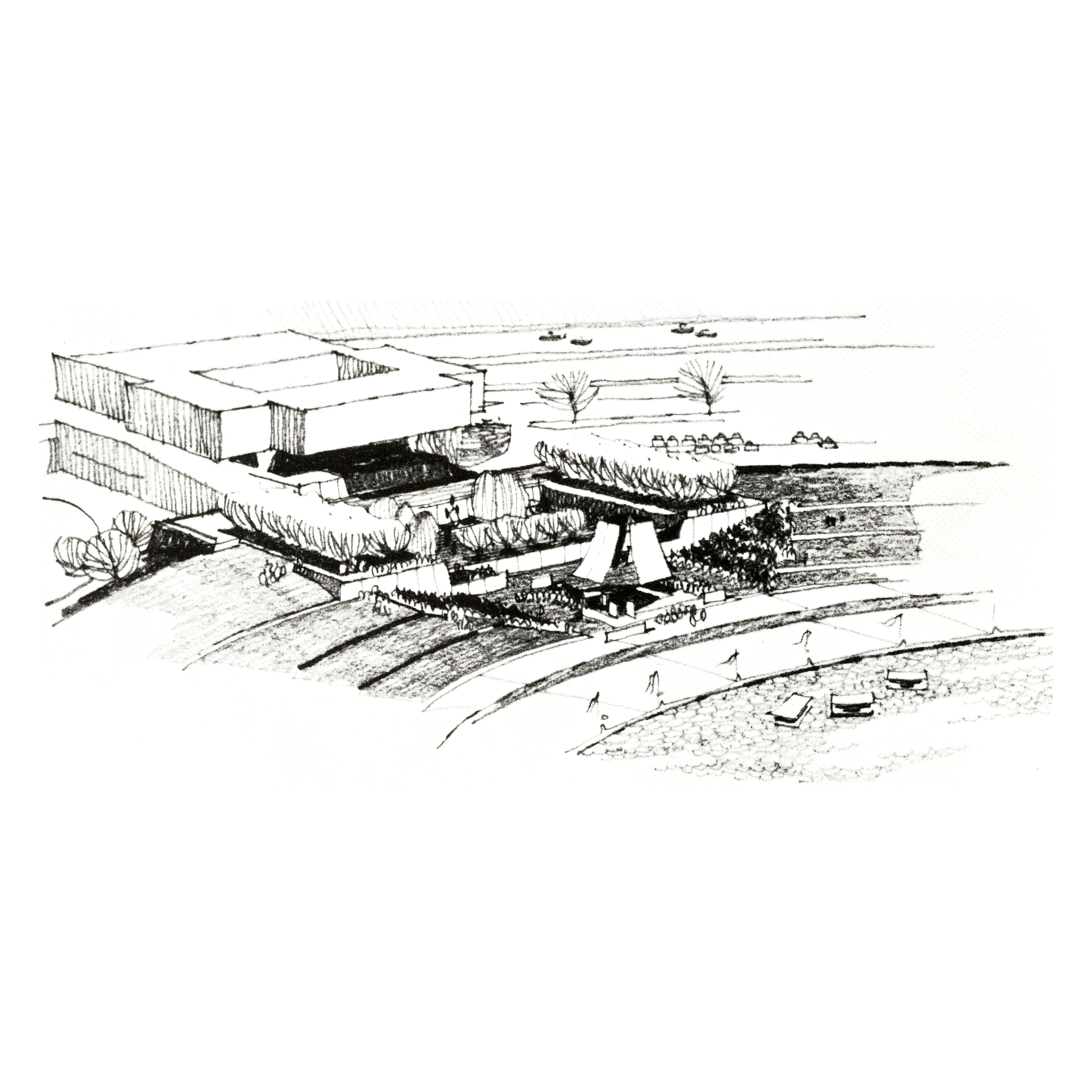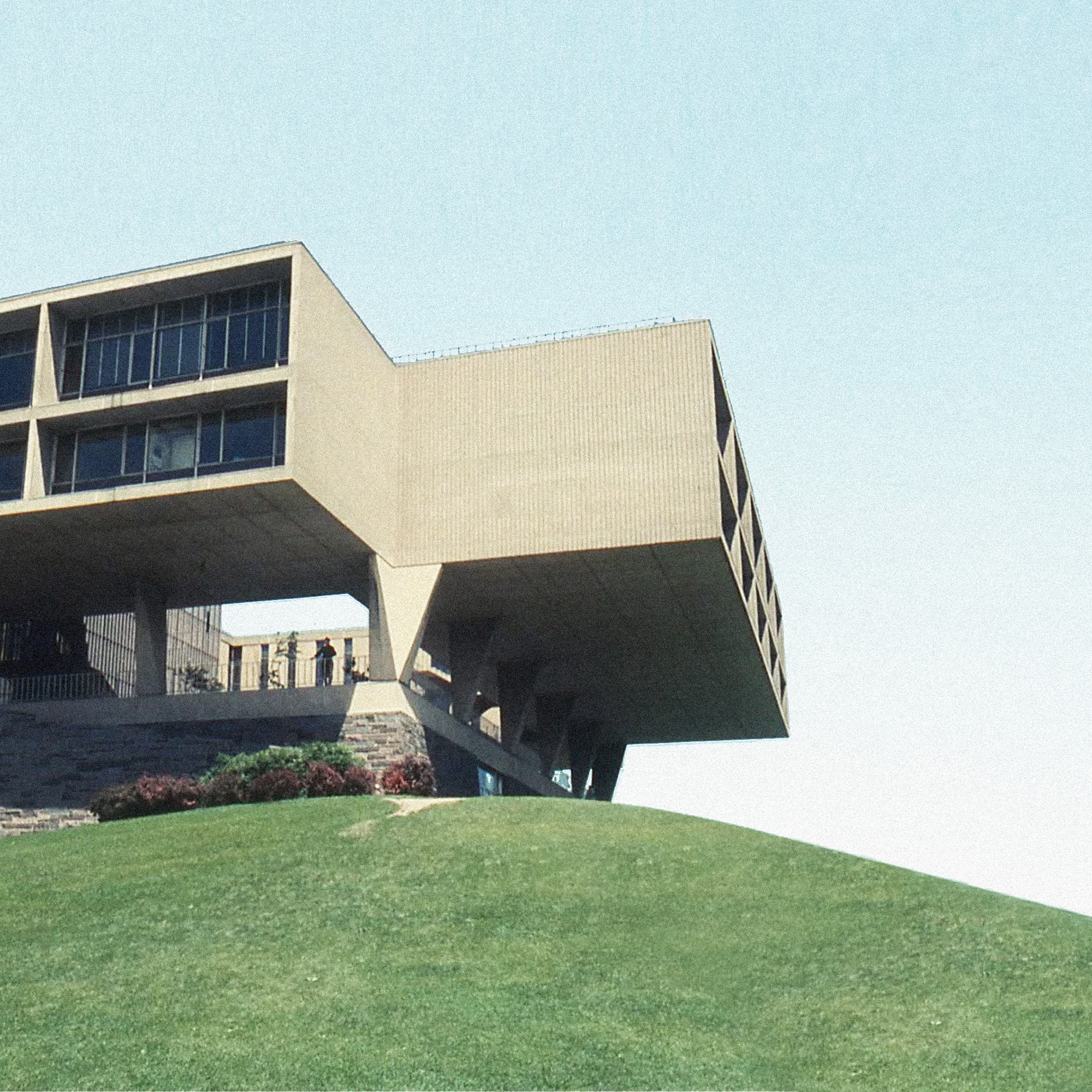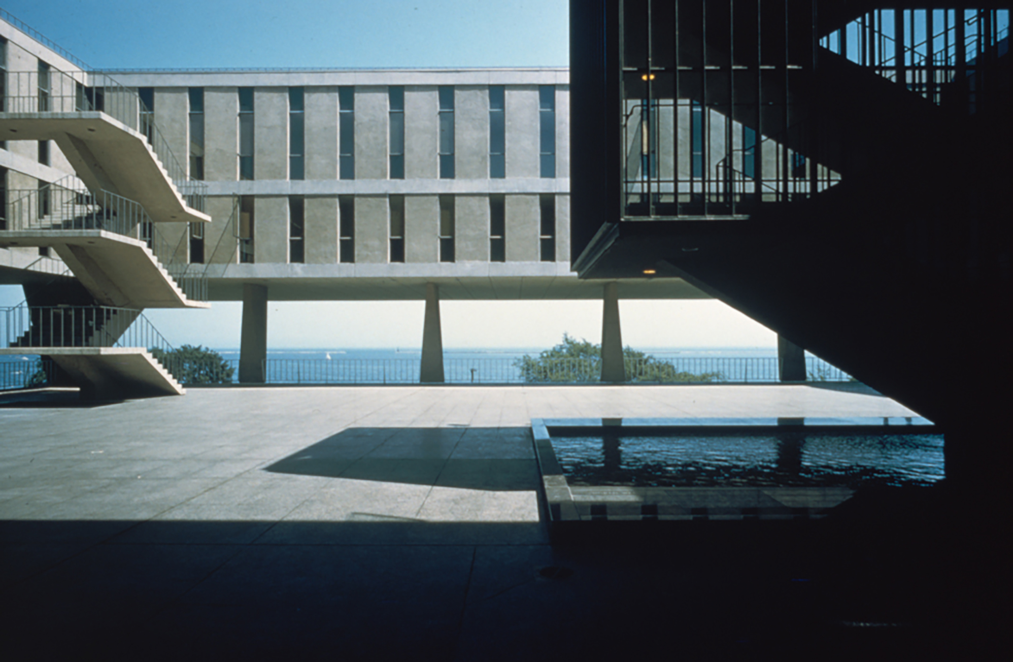The building, a concrete, steel, and glass cruciform floating on a pedestal, included three major components, as Saarinen described: “One is the base, which builds the mass up to the city level and contains an art museum; the second, on the city level, is the memorial court with a pool. The court is surrounded by the polyhedron-shaped piers, which support the building and also make frames for the breathtaking views of the lake and sky. The third part is the superstructure, cantilevered outward thirty feet in three directions, which contains the meeting halls and offices of the veterans’ organizations.”